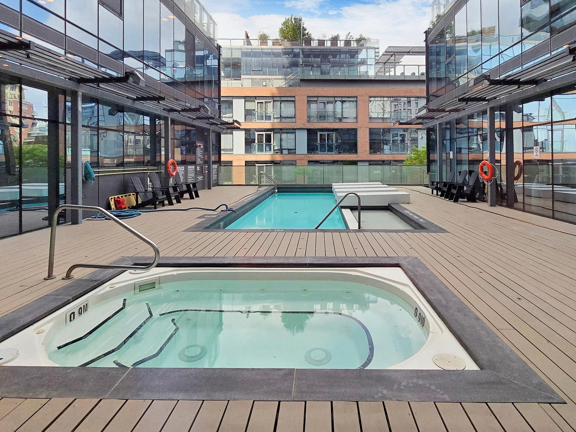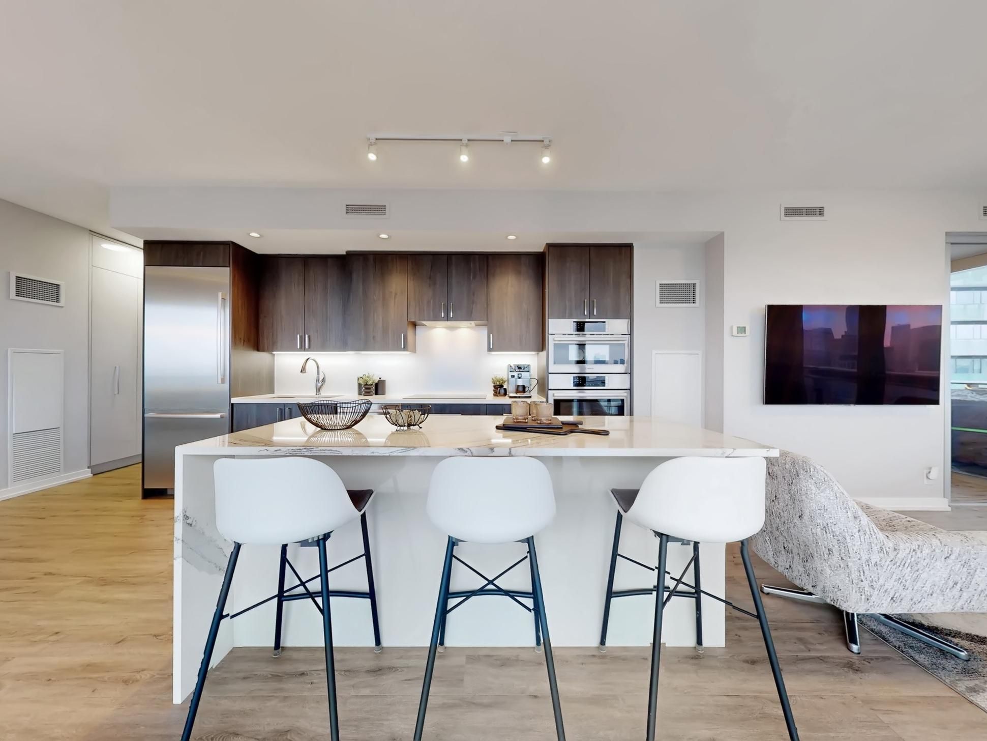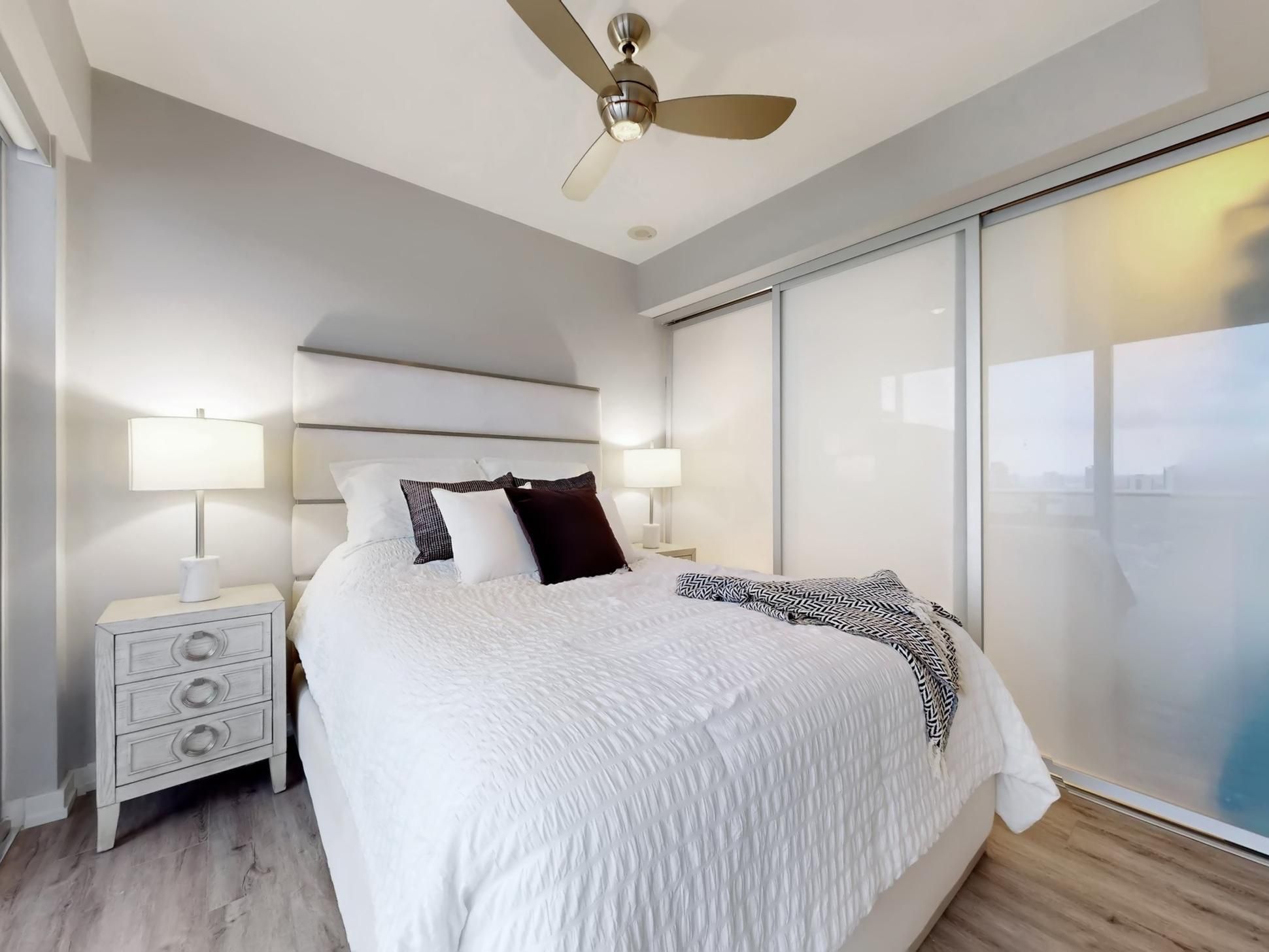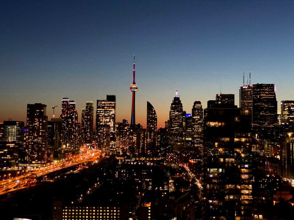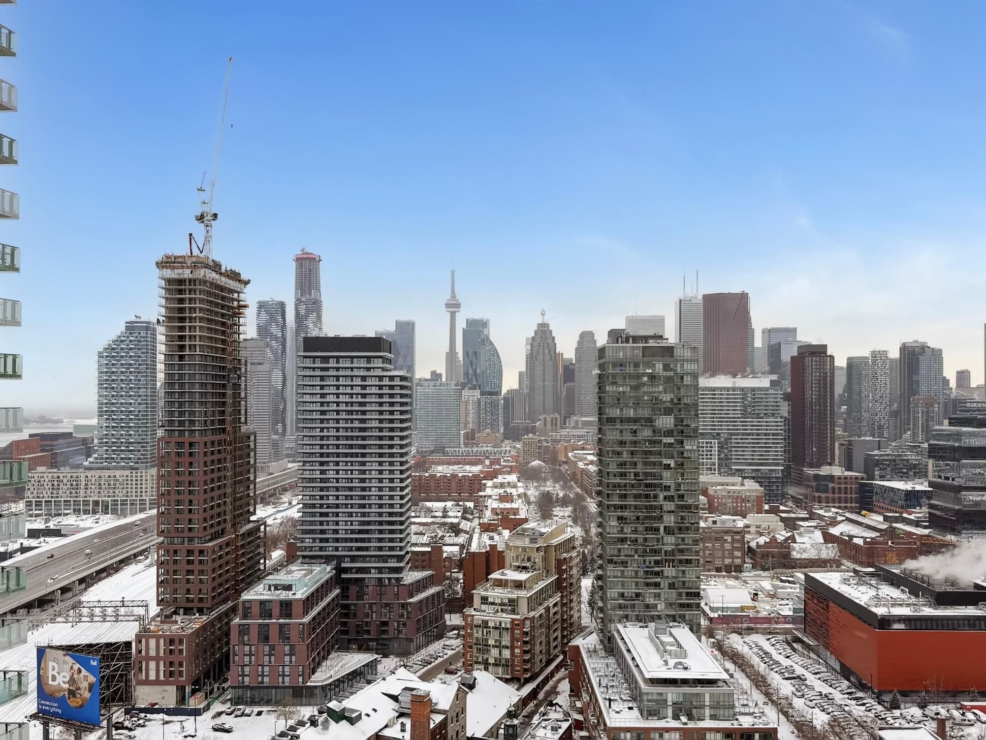 Welcome to the sought-after Gooderham Building in the heart of the Distillery District. This stunning, renovated corner suite features a spacious split 2-bedroom, 2-bathroom layout and is perched on the 29th floor, offering breathtaking north- and west-facing views of the CN Tower, city skyline, and glistening lake. The open-concept living space is filled with natural light through floor-to-ceiling windows and includes two walkouts to an expansive wrap-around balcony-perfect for entertaining or unwinding while enjoying panoramic views. The suite has been thoughtfully upgraded with a renovated kitchen featuring new appliances, lighting, and luxury vinyl plank flooring, along with custom window coverings, expansive built in storage, updated bathroom vanities, and professionally installed patio flooring. Residents enjoy exceptional amenities, including a fully equipped gym, outdoor pool, rooftop deck with BBQs, yoga room, and sauna. Located in the historic Distillery District, you are steps from boutique shops, cozy cafes, brewery pubs, and world-class dining. Convenient access to the streetcar loop, DVP, and Gardiner Expressway makes commuting effortless, while a short stroll brings you to St. Lawrence Market, the YMCA, Goodman waterfront trail, Corktown park, theatres, marketplaces, and the new Biidassige Park in the Port Lands. Live, work, and play in one of Toronto's most vibrant neighbourhoods-this is city living at its finest.