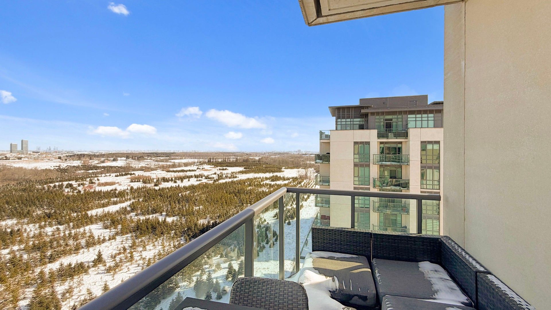 Rarely offered corner suite featuring approximately 788 sq. ft. of well-designed living space, offering 2 bedrooms, 2 full bathrooms, and 2 owned parking spaces. Meticulously maintained and lovingly cared for throughout. Enjoy a walk-out to a private balcony with unobstructed views of the Claireville Conservation Area, showcasing serene greenbelt scenery, abundant wildlife, and distant skyline views of Vaughan and Toronto. A quiet, sun-filled residence offering exceptional privacy and tranquility. Tastefully upgraded with solid wood interior doors in the Primary Bedroom and Laundry Room, quartz countertops, corner pantry, durable vinyl flooring, and carpet-free living throughout. The unit is exceptionally clean and move-in ready. Two owned parking spaces are conveniently located directly in front of the elevator lobby on Level B, along with one exclusive storage locker situated on the same level for added convenience. Ideally located close to Highway 407, Highway 427 Extension, Brampton Transit, Pearson Airport, Costco, and all essential amenities. Experience the rare opportunity to enjoy nature at your doorstep-including deer sightings-while remaining minutes from urban conveniences. A truly exceptional offering combining location, views, and functionality-perfect for end-users or investors seeking a unique condominium residence.