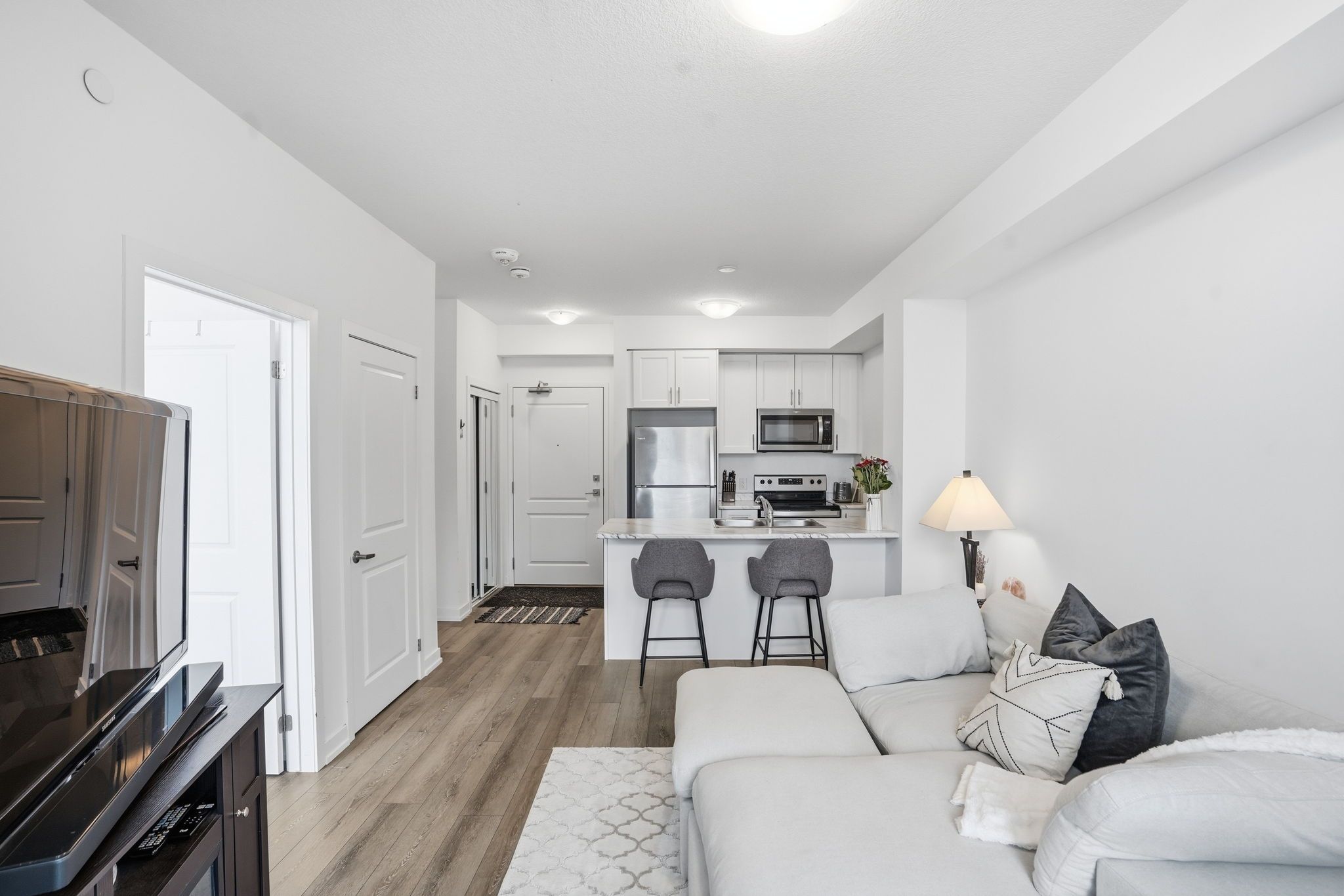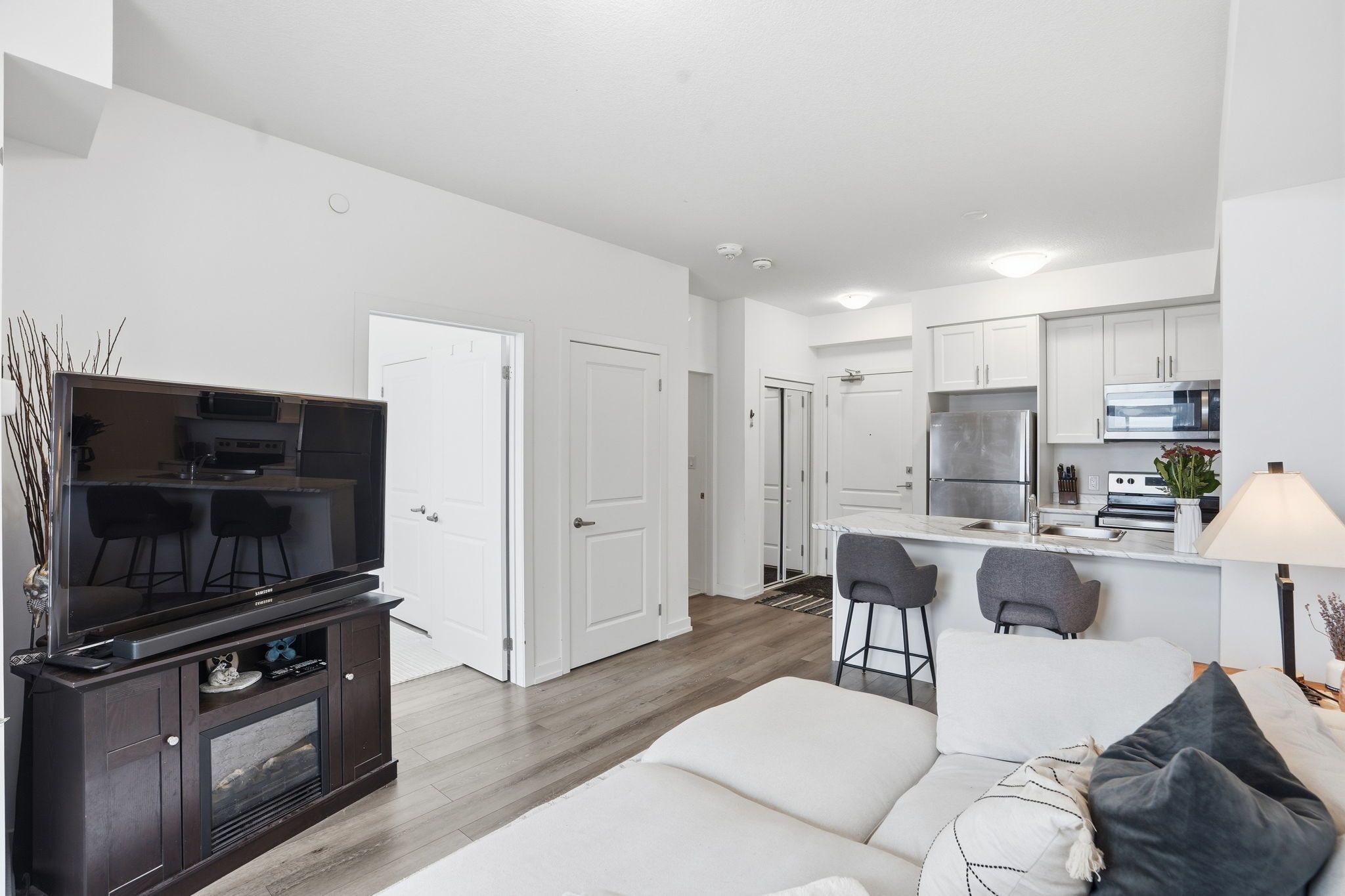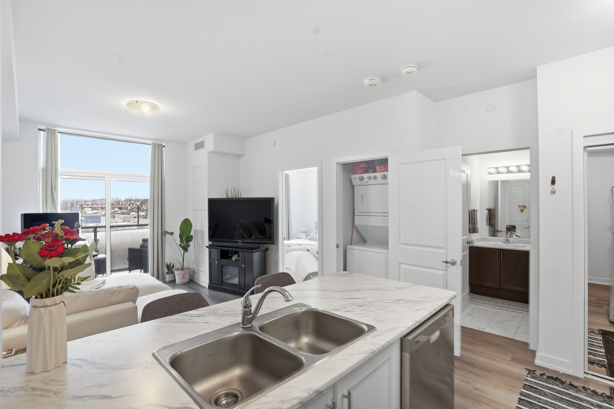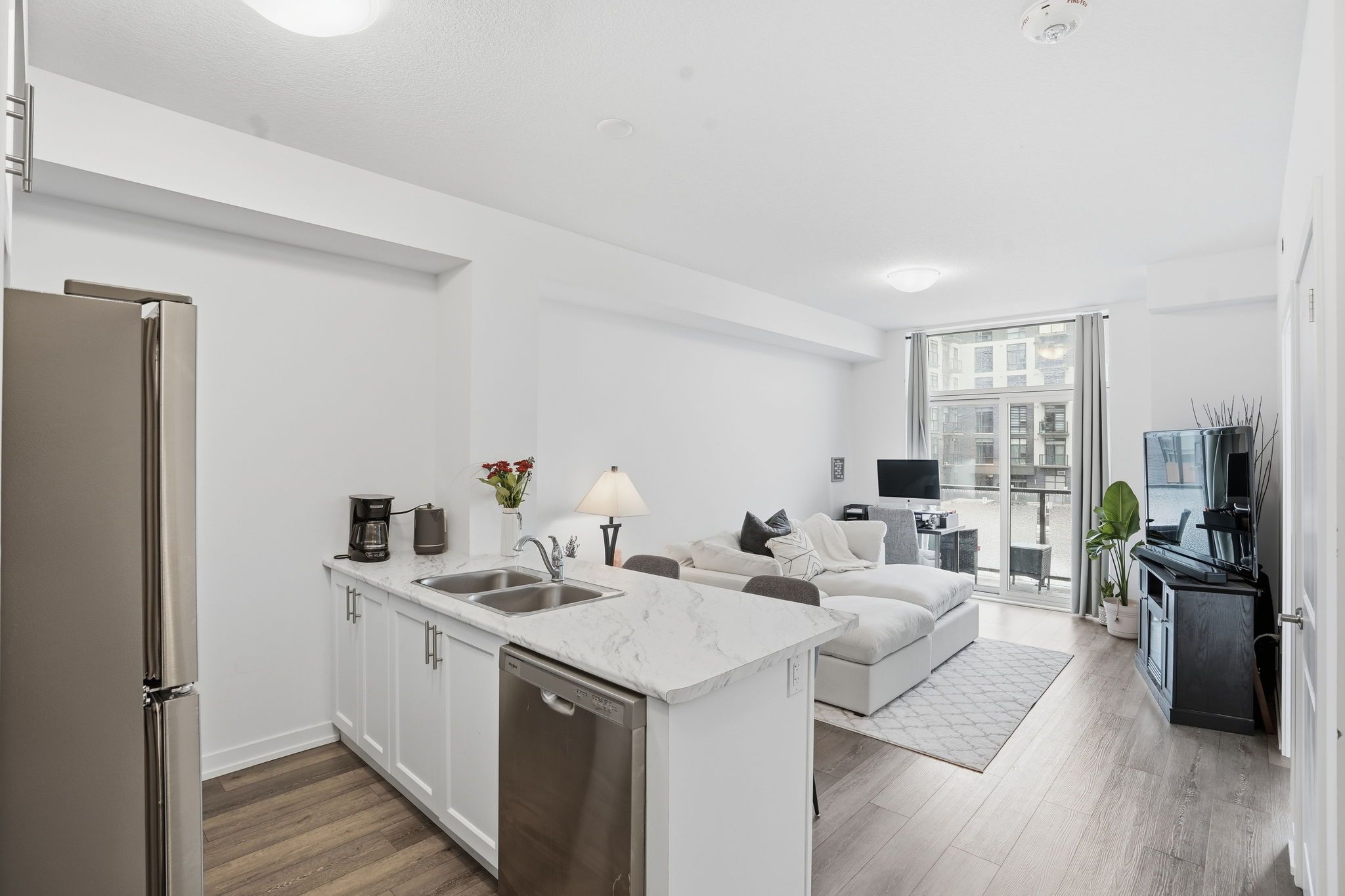 Step into modern comfort with this stylish second-floor 1-bedroom condo located in the desirable Trend community of Waterdown. This thoughtfully designed unit offers a seamless open layout, maximizing space and natural light throughout. The contemporary kitchen features sleek quartz countertops, stainless steel appliances, and an elegant breakfast bar that flows effortlessly into the living and dining area, creating the perfect setting for everyday living and entertaining. Enjoy walkout access to a private balcony, ideal for morning coffee or unwinding at the end of the day.The spacious bedroom is complemented by a well-appointed 4-piece bathroom and the convenience of in-suite laundry. One owned surface parking space and a private storage locker provide added practicality.Residents of Trend enjoy access to premium building amenities, including a fully equipped fitness centre, stylish party and social rooms, rooftop terraces, and secure bicycle storage. Located in the vibrant heart of Waterdown, you are just moments from charming shops, excellent restaurants, parks, schools, and all essential amenities, with convenient access to major routes.This property is being sold under power of sale and presents a fantastic opportunity for first-time buyers, downsizers, or investors looking to secure a home in a thriving community.