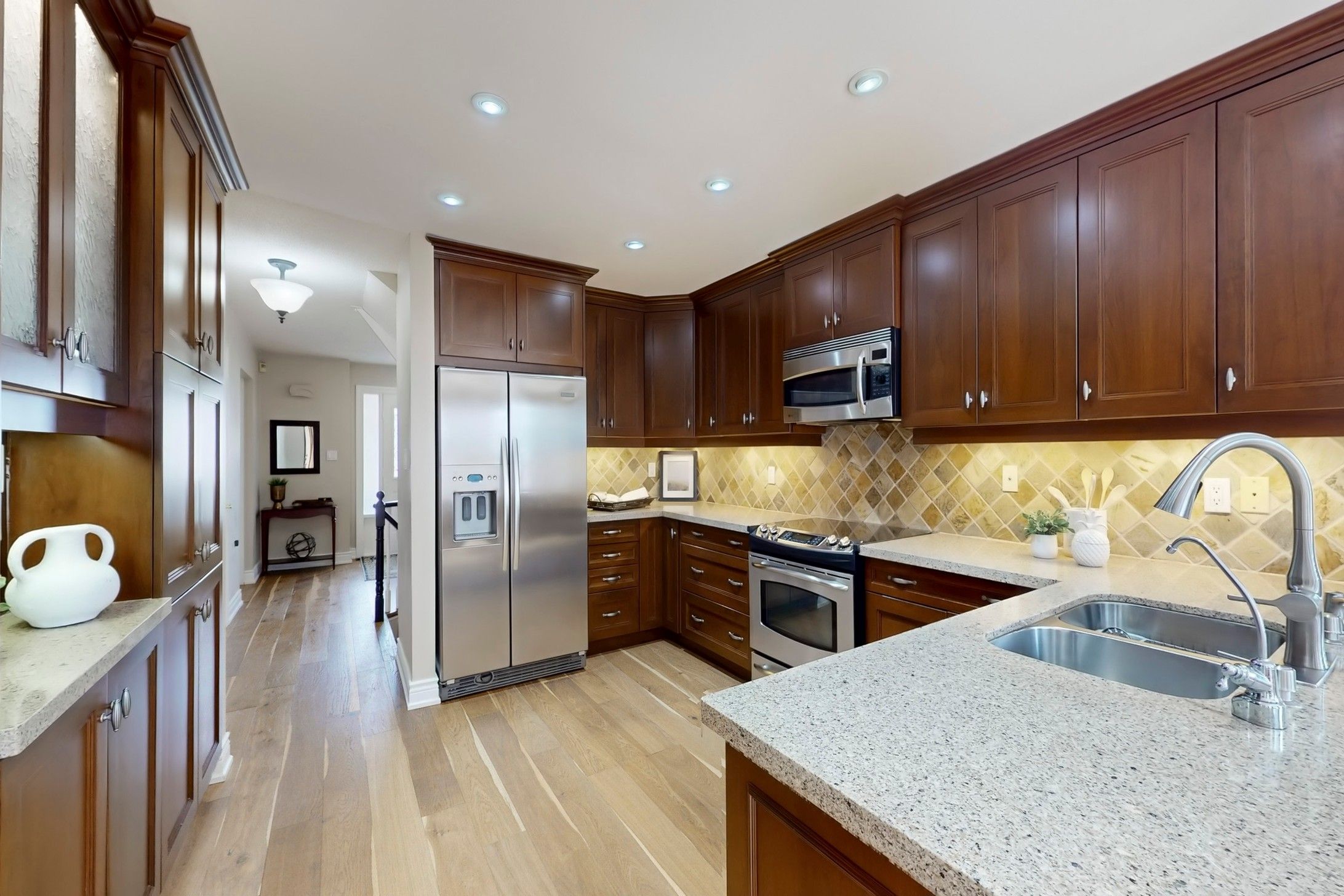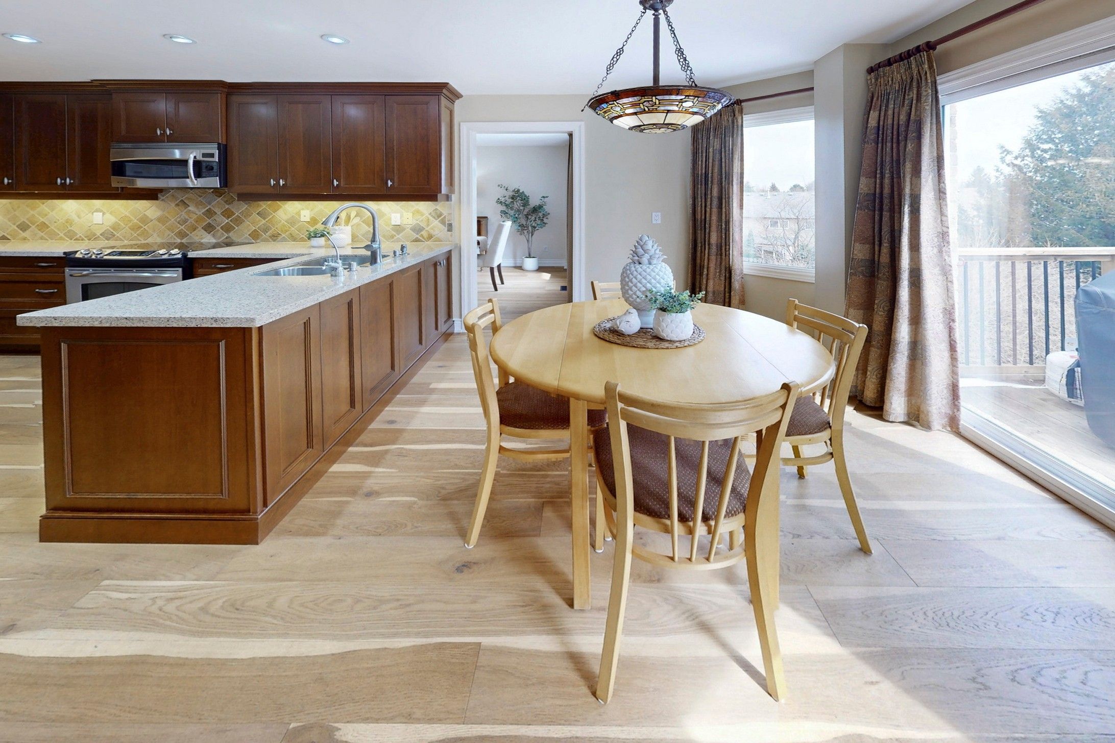 Welcome to this meticulously maintained 4+1 Bedroom Home on a rarely offered, spectacular pie-shaped Lot in the sought-after Aurora Highlands. Offering approximately 3,600 sqft of finished Living Space, this Home is nestled on a quiet and safe Crescent and features a Walk-Out Basement and a spacious wrap-around Sun Deck overlooking mature Trees in your private, fully fenced and south-east facing Backyard. The bright and light-filled Main Floor showcases updated Hardwood Flooring and a renovated Kitchen complete with Quartz Countertops, Stainless Steel Appliances, Pantry and a Reverse Osmosis Water Filtration System. Generous Principal Rooms provide the perfect setting for both Family gatherings and cozy evenings by the Fireplace in the inviting Family Room. A convenient Main Floor Laundry Room with side entrance and direct Garage Access add everyday functionality. Upstairs, you'll find four well-appointed Bedrooms, including a serene Primary retreat featuring stunning views, a Walk-In Closet and a 5-piece Ensuite. The finished Basement offers exceptional additional Living Space, including a Guest Bedroom with a 3-piece Bath, a spacious Rec Room with walk-out to the Yard and lower Deck, plus a Workshop and Den - ideal for Hobbies, Work or extended Family Living. Recent updates include newer Flooring (2019) and Roof (2021). Located just steps from the scenic Walking Trails of Case Woodlot and within close proximity to great Public and Catholic Elementary Schools, this is a very rare opportunity to own a truly special Family Home.