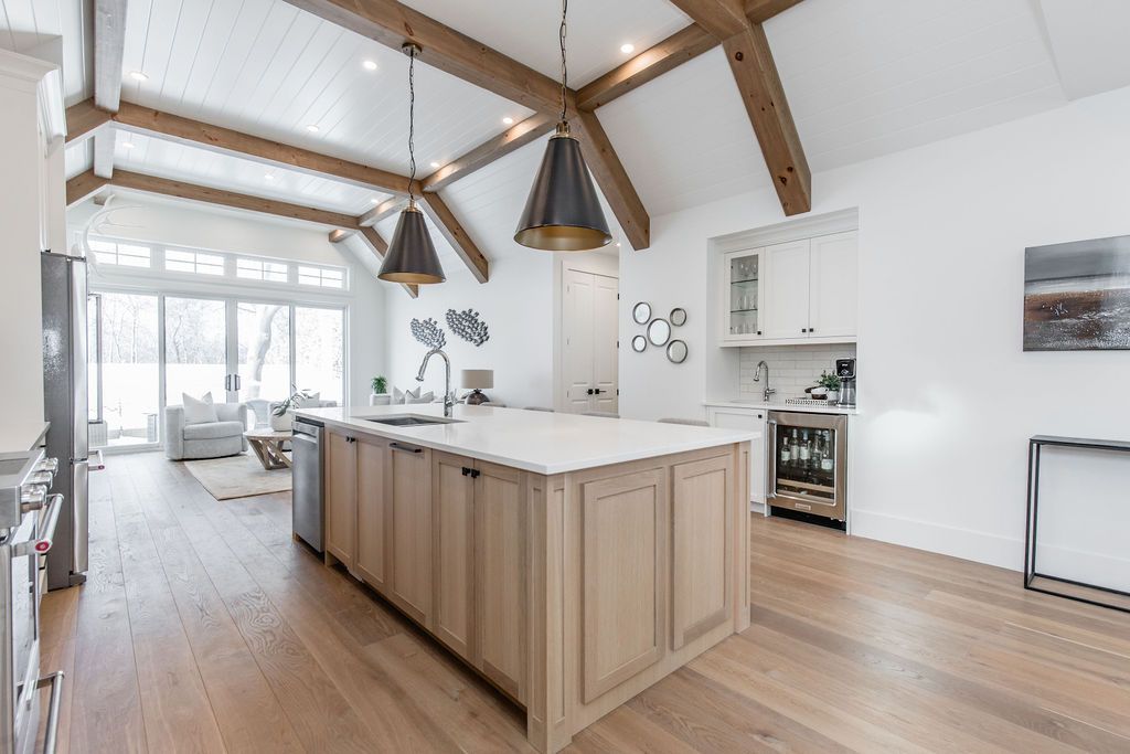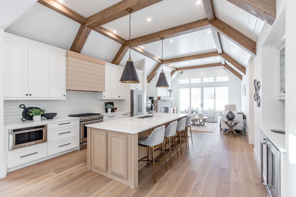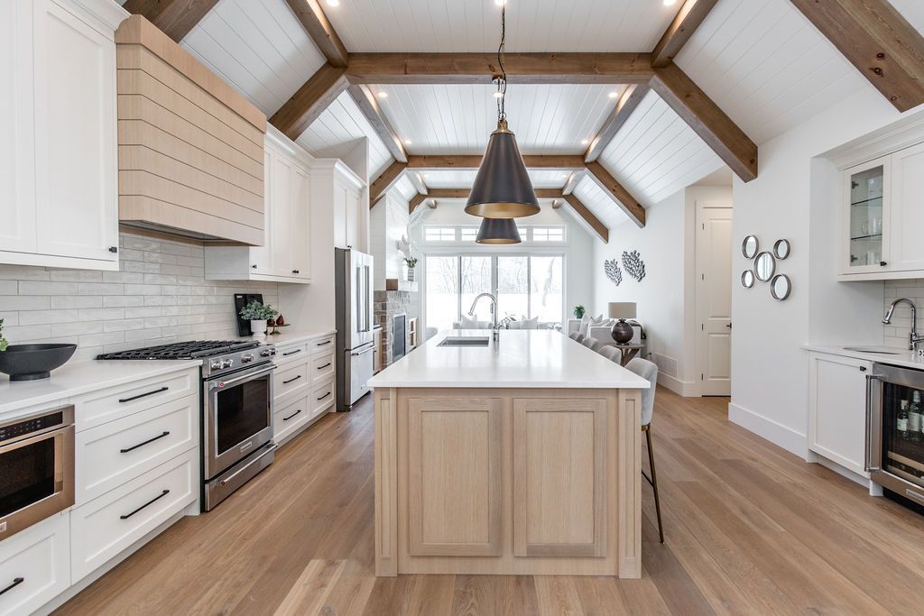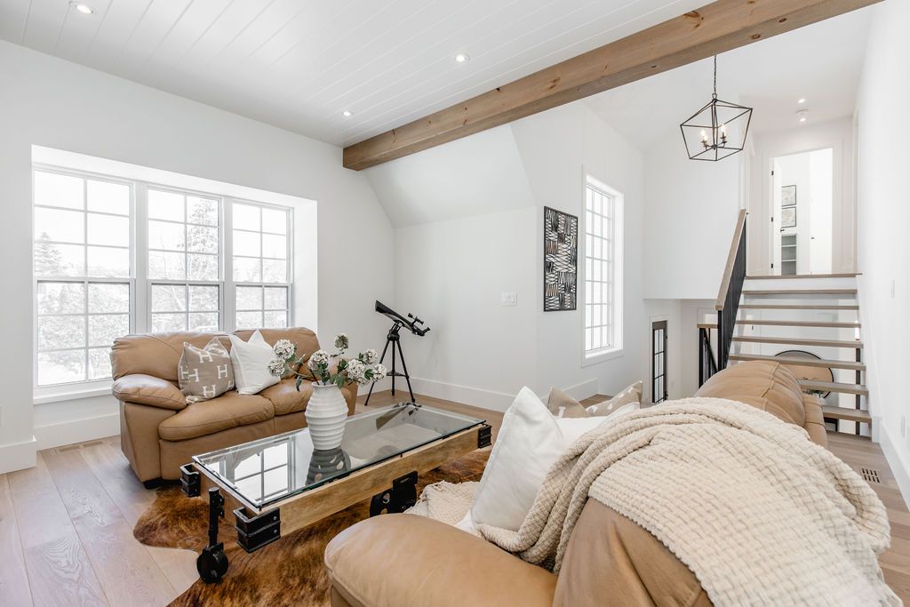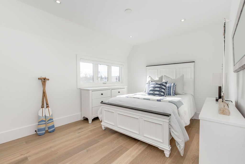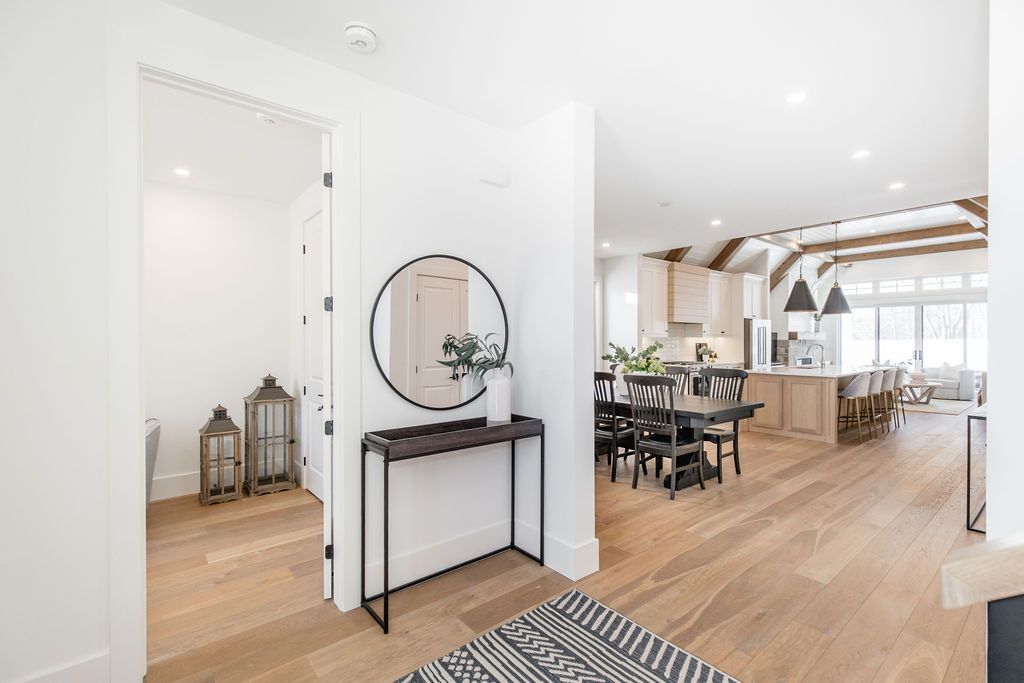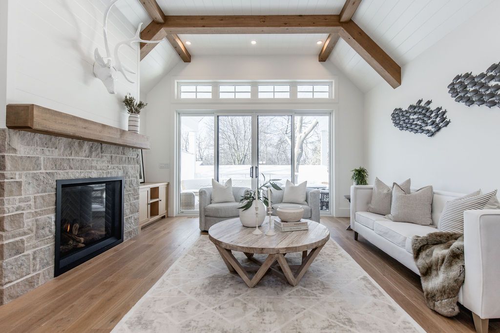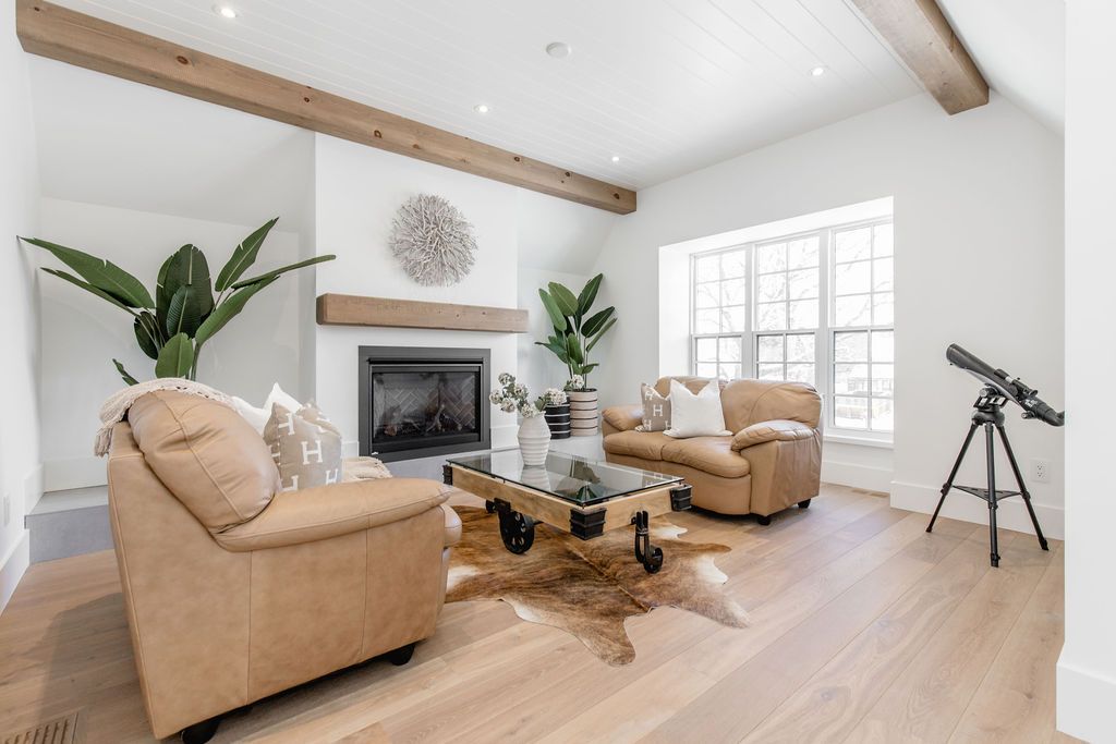 Fall in love with this spectacular custom-built Vandermeer home just steps from Georgian Bay at Sunset Point, one of the area's most sought-after waterfront neighbourhoods. Offering over 3,700 sq ft of luxury living space, this 3+2 bedroom, 4 bathroom residence blends timeless craftsmanship with elevated modern finishes.Designed with 9-ft interior doors, upgraded hardware, wide-plank white oak hardwood flooring, and soaring 12-ft beamed cathedral ceilings with shiplap and pot lights, the home delivers an airy, open-concept layout ideal for both everyday living and entertaining. The gourmet designer kitchen features a statement centre island, stainless steel appliances, and a wet bar, seamlessly flowing into the dining and family rooms.The main-floor primary suite is a true retreat with a spa-inspired 5-piece ensuite, floating soaker tub, glass shower, heated floors, double quartz vanity, and walk-in closet. A second main-floor bedroom or office adds flexibility for guests or remote work.The upper loft family room and finished lower-level recreation room, both with gas fireplaces, offer multiple living spaces for families or multigenerational living. The basement includes two additional bedrooms, a wet bar, and rough-in for heated floors, making it ideal for guests or extended family.Enjoy summer evenings on the covered back deck, a fenced yard, and direct access from the mudroom/ski locker with inside garage entry, perfect for four-season living near the bay. With three gas fireplaces, central air, central vacuum, and premium finishes throughout, this home offers luxury, comfort, and location in equal measure.