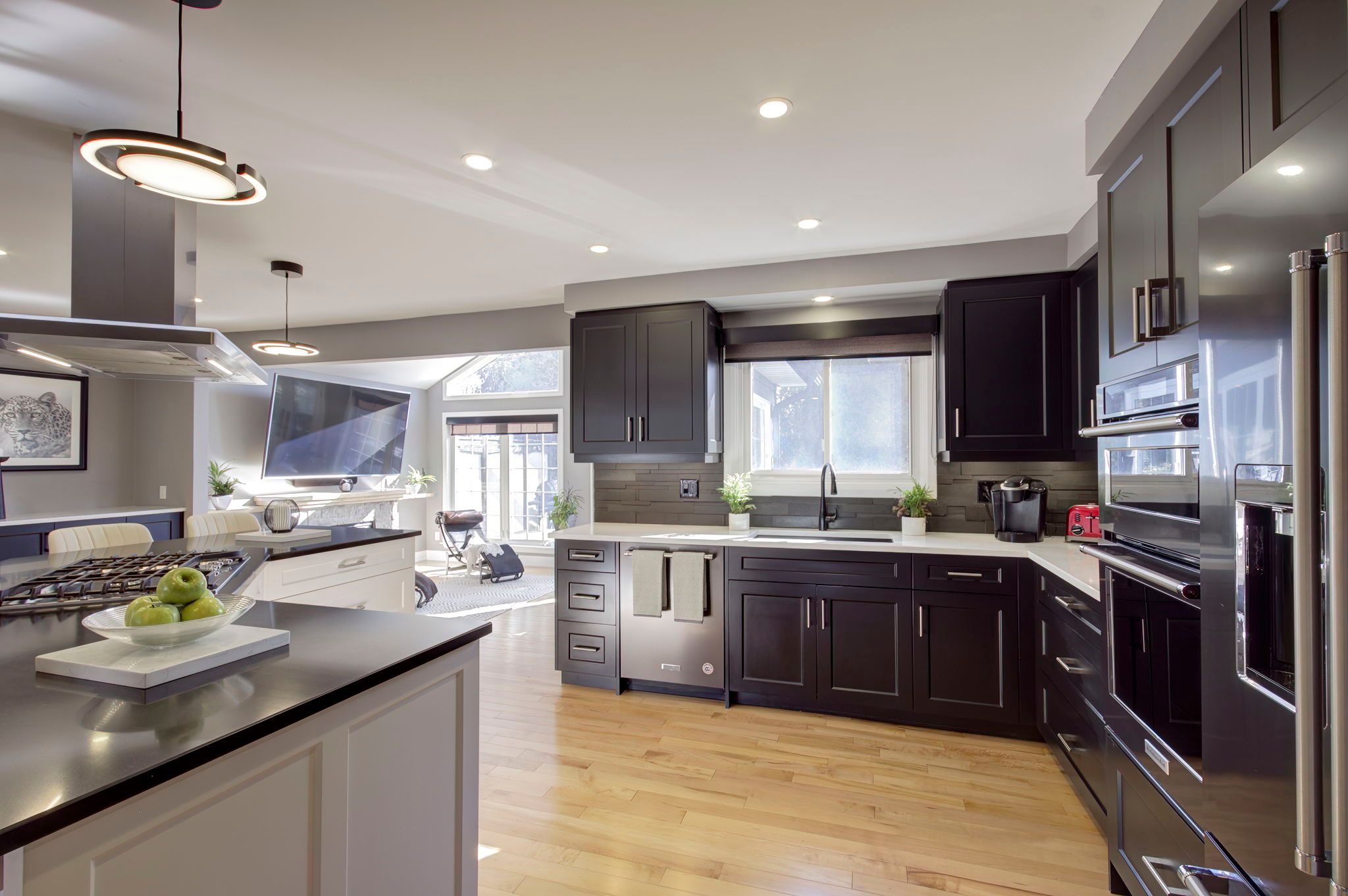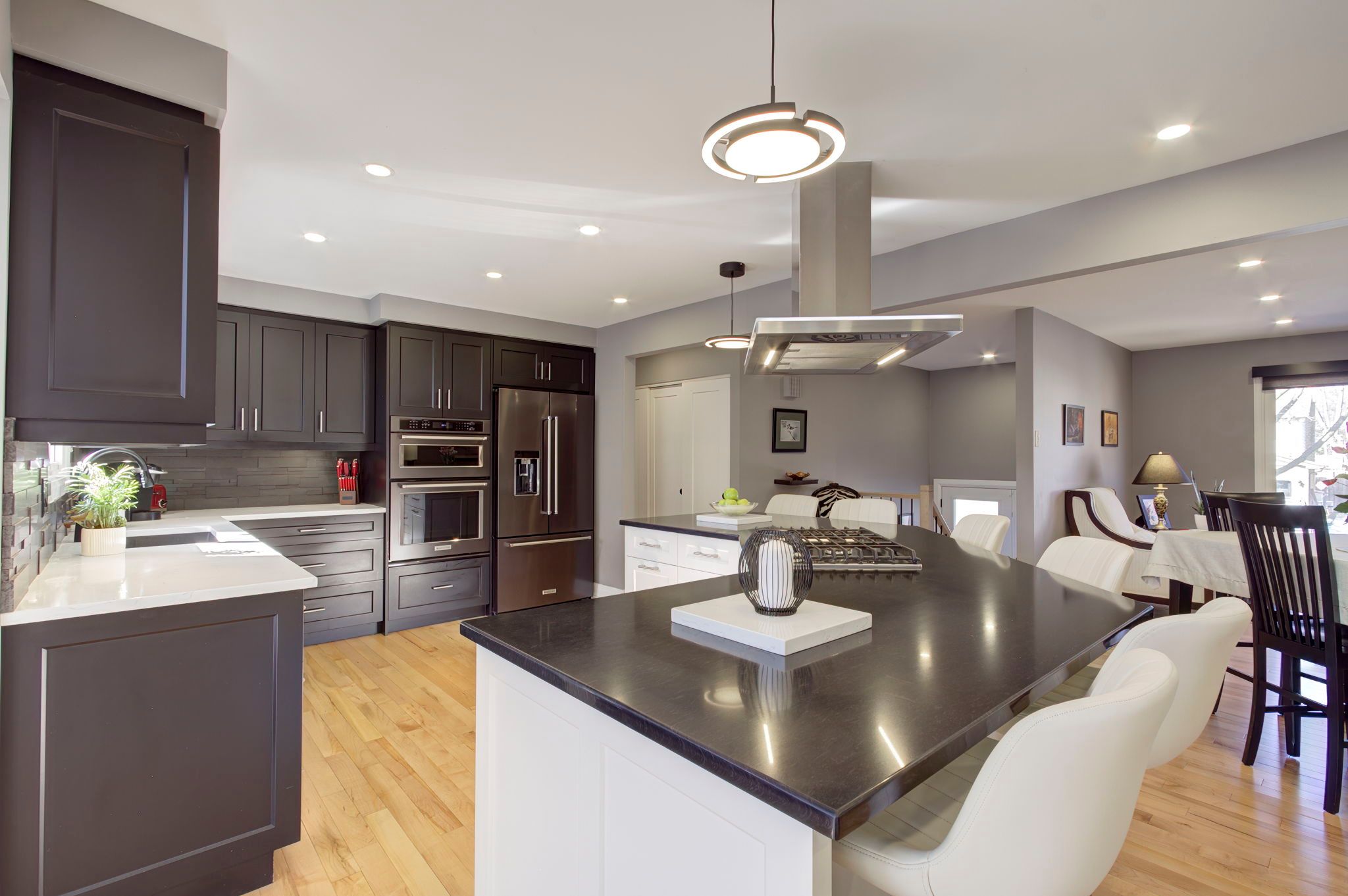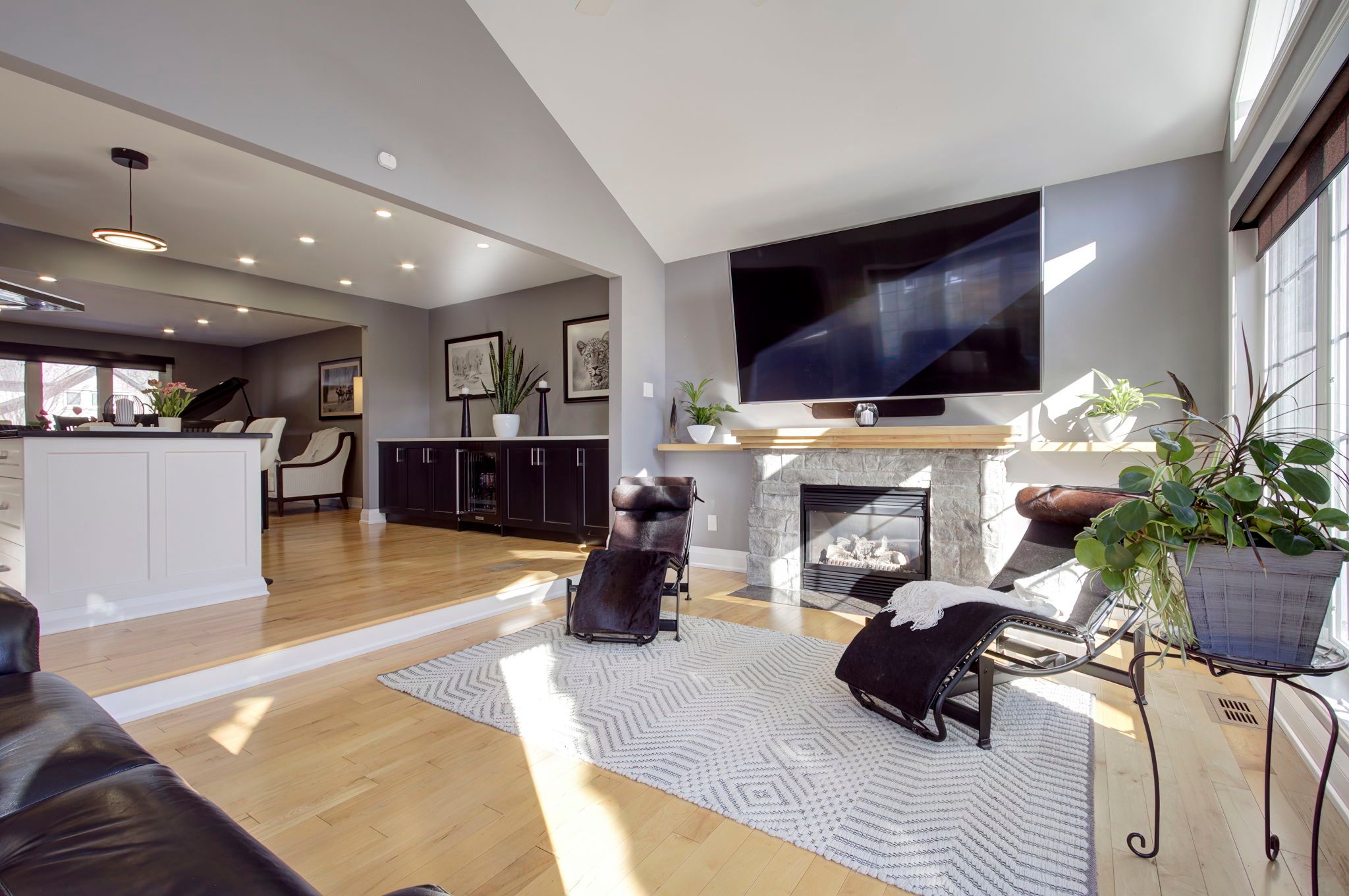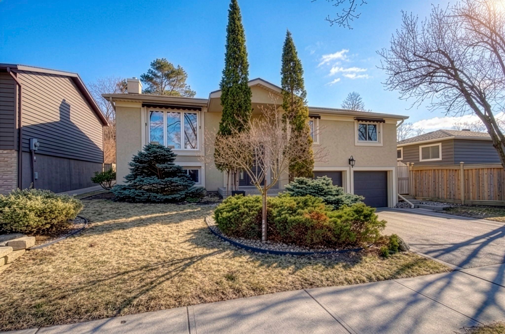 Featured on HGTV's "Top of the Block!" Prepare to be impressed by this meticulously renovated, sun-drenched raised bungalow in a prime Burlington neighbourhood. The main level (renovated 2020) features gleaming maple hardwood floors and a massive open-concept chef's kitchen boasting custom cabinetry, quartz countertops, a 6-seat island, and a built-in gas range. The formal living/dining area -complete with a grand piano included with the home- is perfect for entertaining. The true showstopper, however, is the sunken family room addition, featuring vaulted ceilings, a natural stone gas fireplace, 80 inch flat screen tv, and a walk-out to a private 2024 composite deck with a built-in hot tub. The bedroom wing of the main level is finished with equal attention to detail and offers 3 sizable rooms and an updated 4 p/c bathroom that will suit most buyers' needs. The modern finishes continue to the lower level (renovated 2025), offering a cozy recreation room with a soapstone-hearth fireplace, a den, laundry, a full 3pc bathroom, storage and a walk-out to an impressive double car garage. Hobbyists will love the epoxy flooring and separate heated workshop space! Recent Upgrades Include: AC (2023), Deck (2024), Furnace/HWT/Main Level Reno (2020), Lower Level Reno (2025), Washer/Dryer (2024) 200-amp breaker panel, front porch aggregate (2024). Outside the home you will find a sprawling yard with manicured gardens and plenty of evergreen trees, offering privacy year round! Walk to schools, parks, shops and restaurants, including a neighbourhood favourite Nostalia Games Cafe! This home has it all!