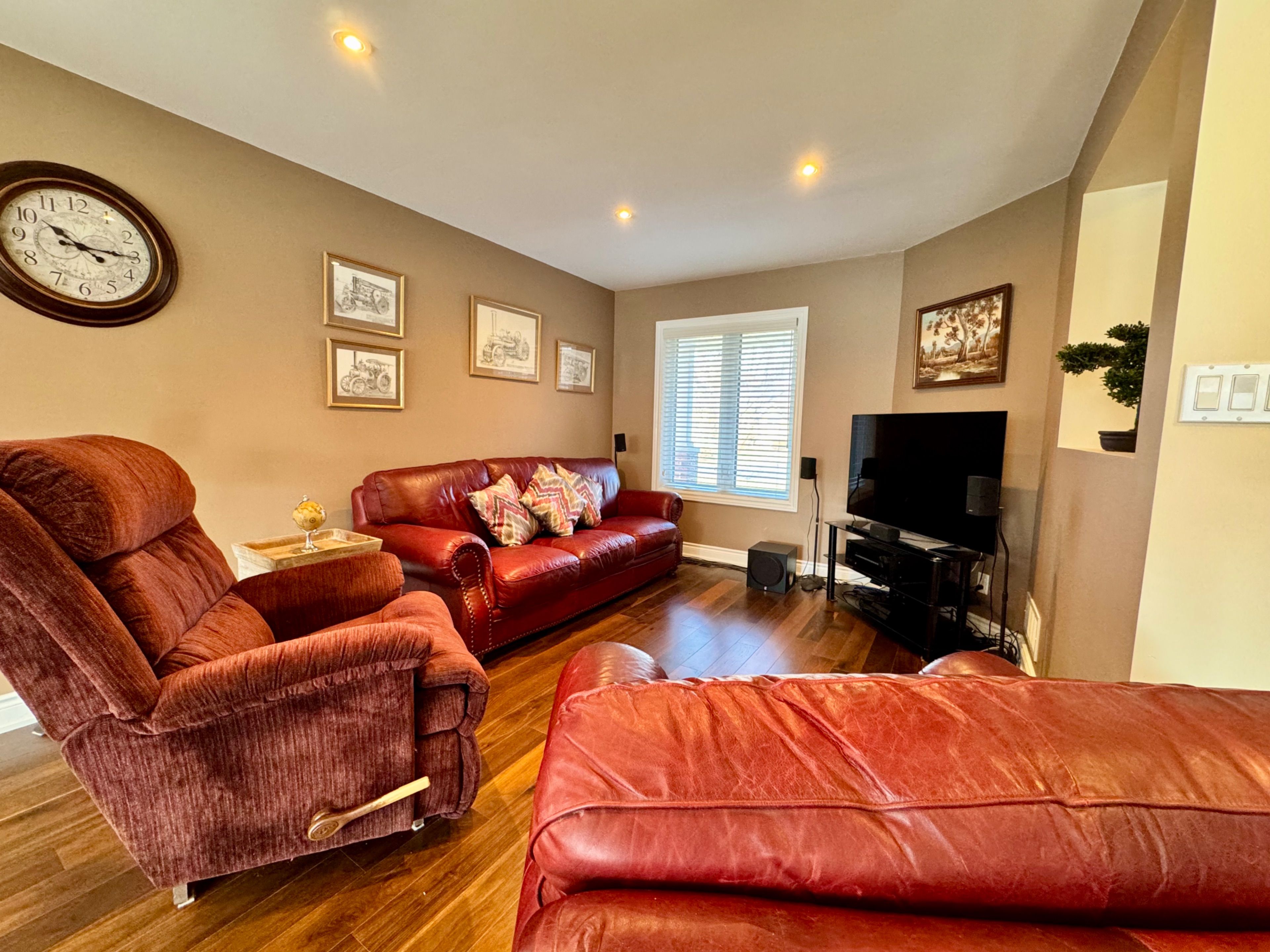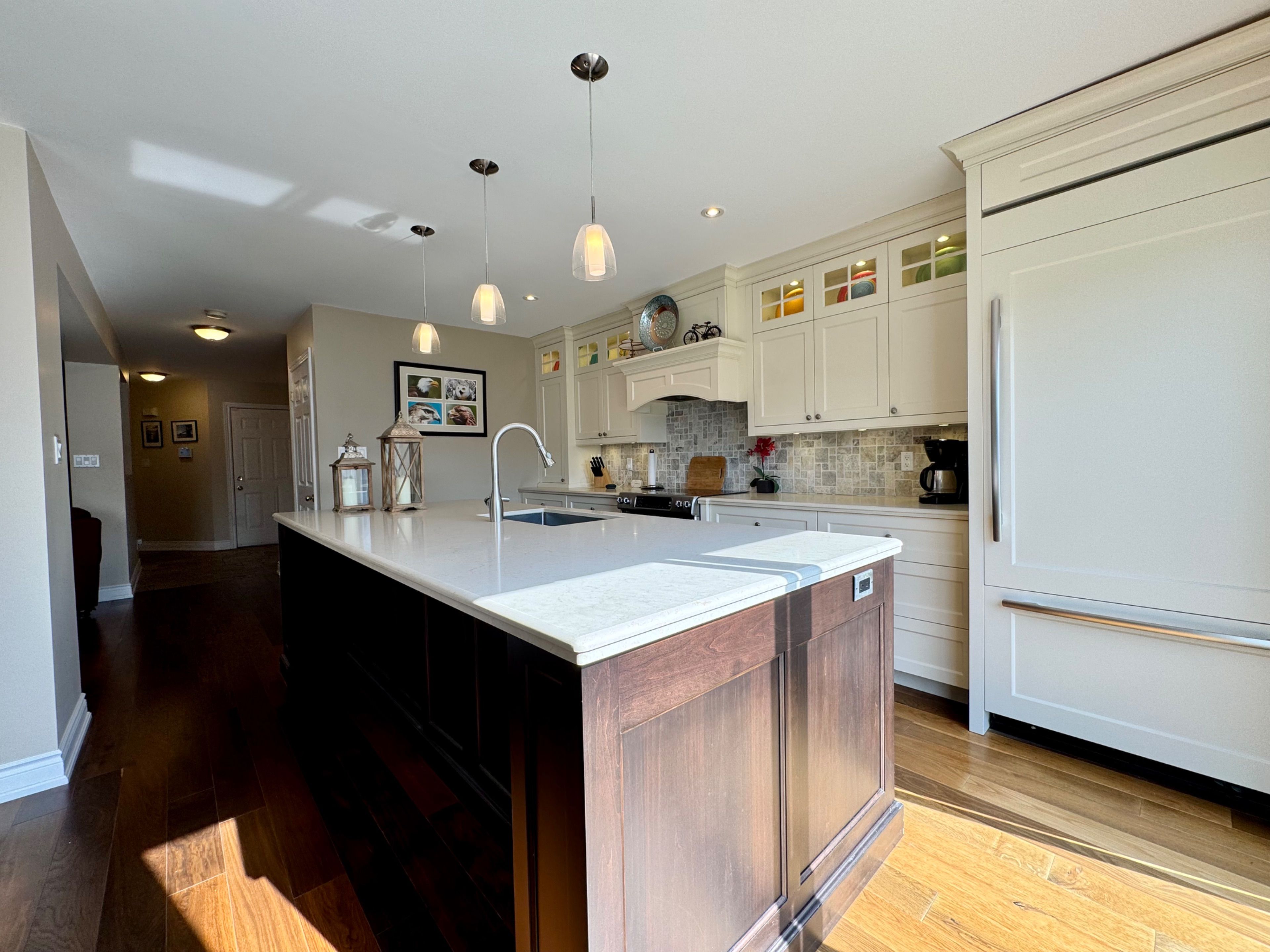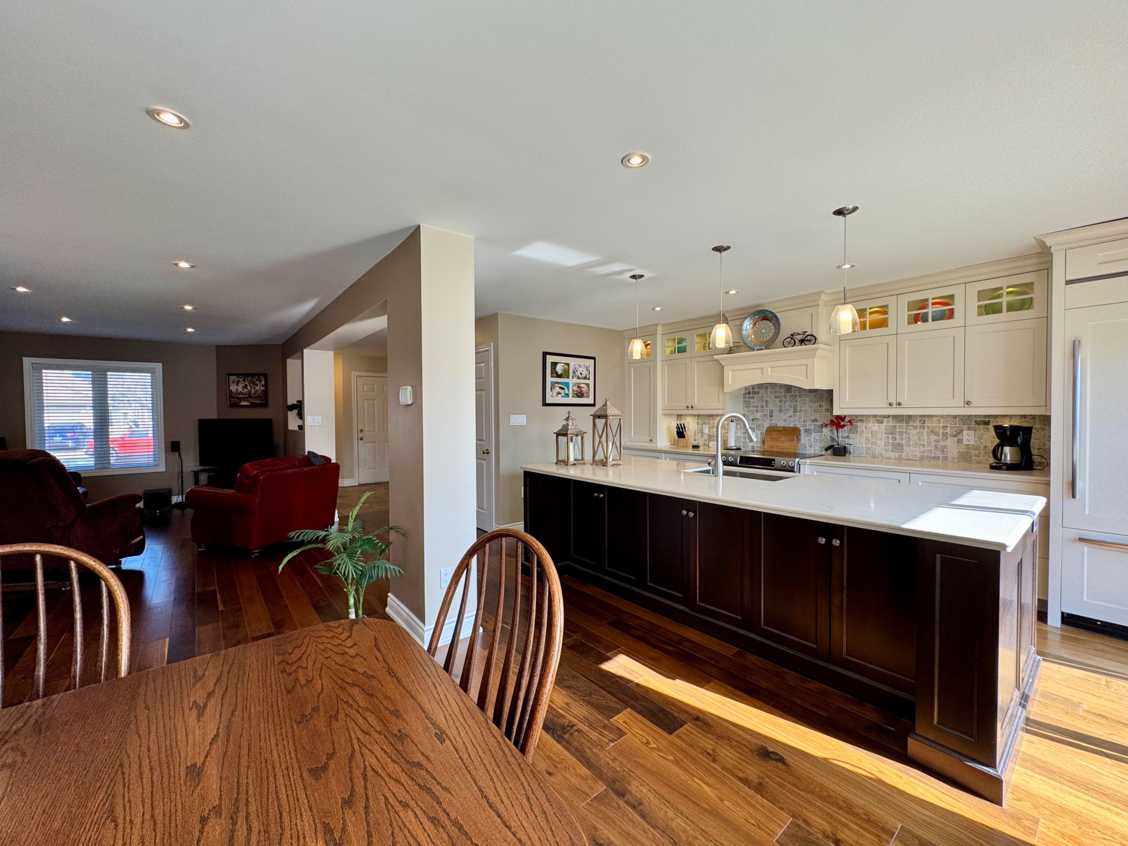 This charming brick exterior home showcases great curb appeal with a covered front porch and convenient single-car garage. Inside, a thoughtfully renovated main floor (2013) features a bright open-concept layout ideal for modern living. The stunning gourmet kitchen includes a large centre island, built-in Jenn-Air fridge, beautiful cabinetry, stylish backsplash, and pendant lighting, seamlessly connecting to the spacious living and dining areas. Upgraded hardwood flooring, smooth ceilings, and pot lights run throughout. A powder room with laundry, inside access to the garage, and a tiled front entry add everyday convenience. Upstairs (renovated in 2016), the spacious primary bedroom includes a walk-in closet and a full 4-piece ensuite bathroom. Two additional bedrooms and a spa-inspired 3-piece bathroom with tiled floors, oversized glass shower, and upgraded vanity complete the level. Hardwood flooring extends throughout the upper floor. The unfinished lower level includes a cold room and plenty of storage space, ready for future customization. The fully fenced, pool sized, backyard is a blank canvas for your outdoor vision. Additional updates include furnace, A/C, and windows throughout, with the roof reshingled approximately 2011. Exceptional location close to schools, parks, trails, shopping, public transit, and easy highway access - an ideal place to call home.