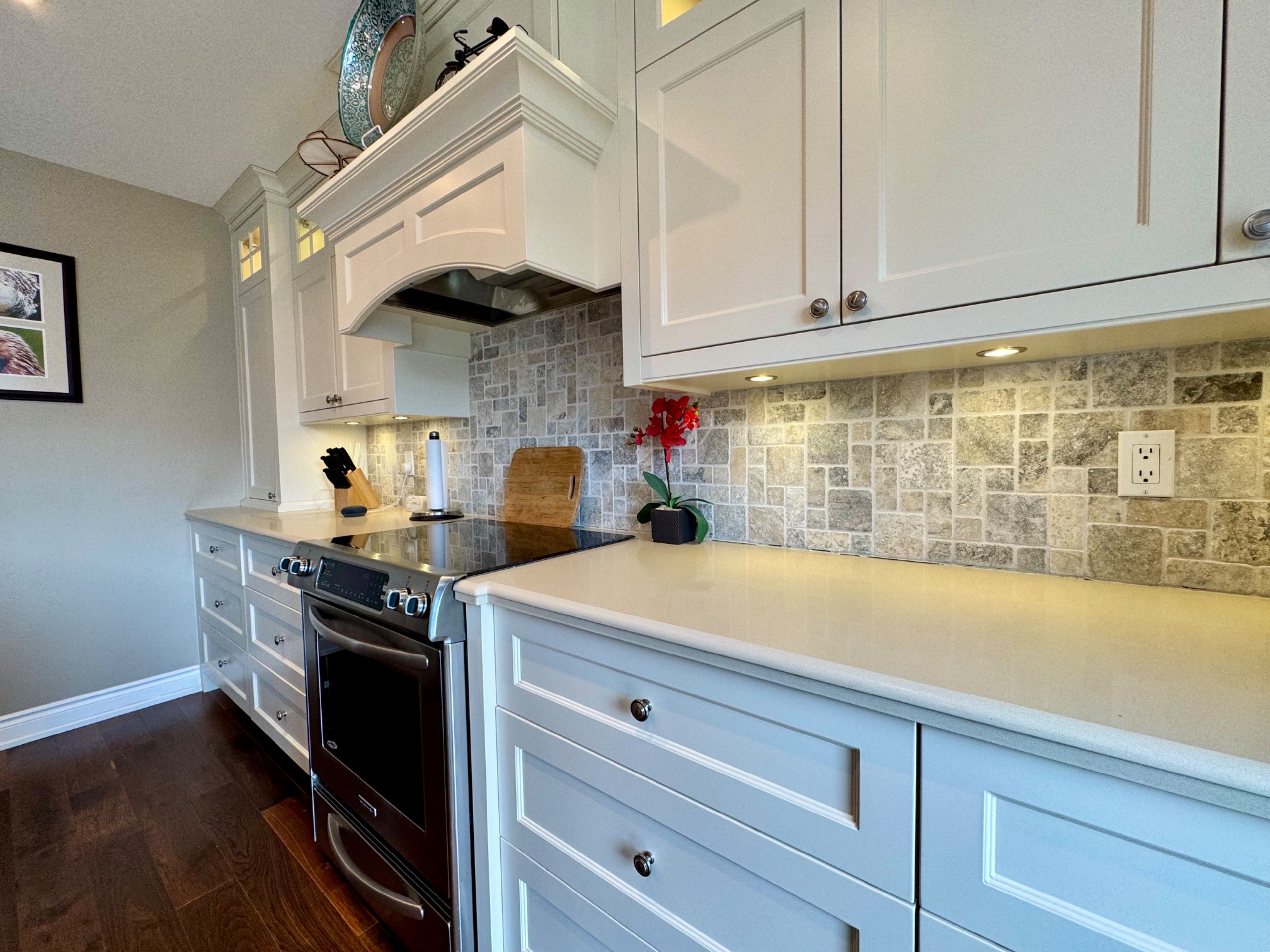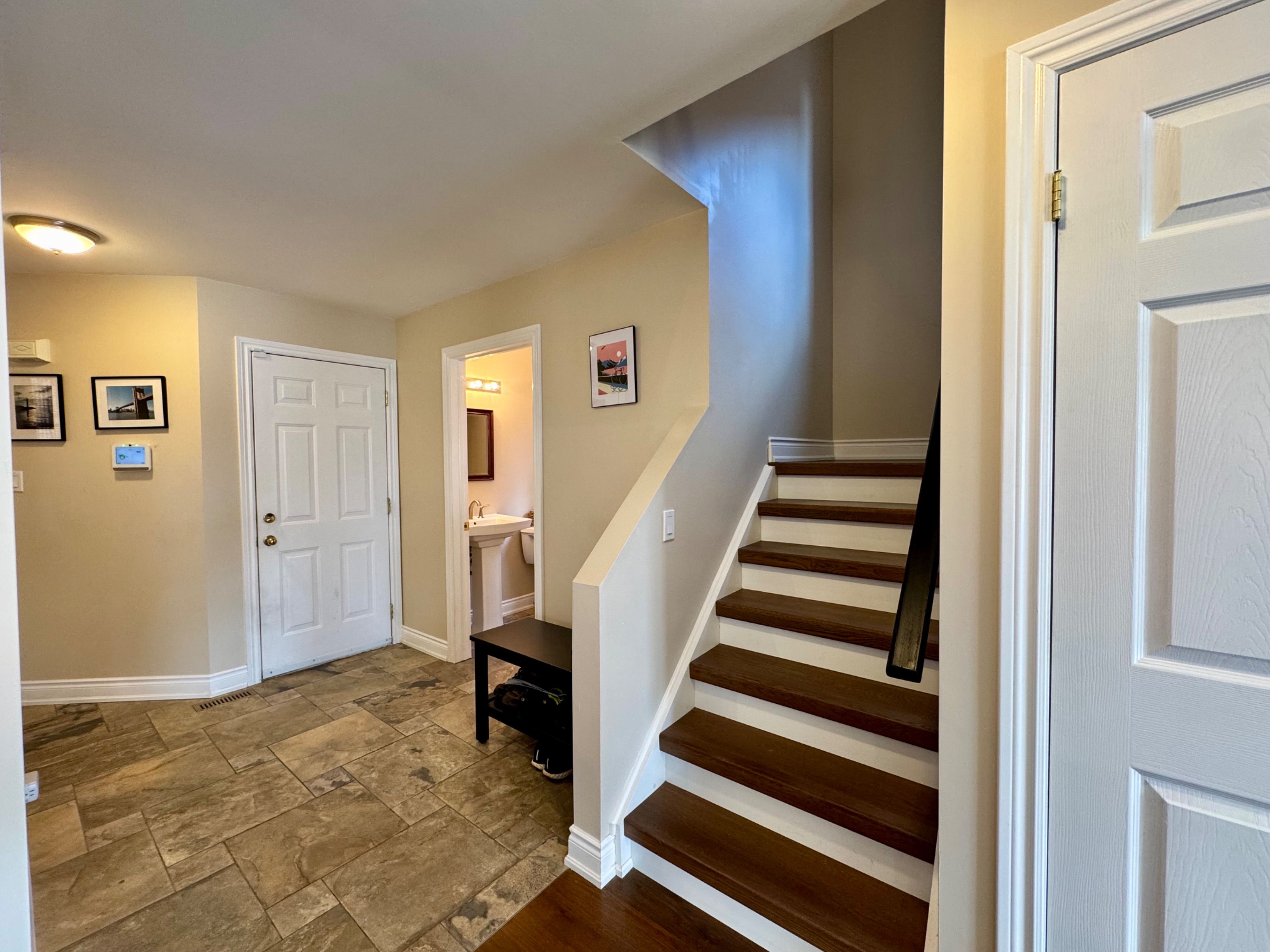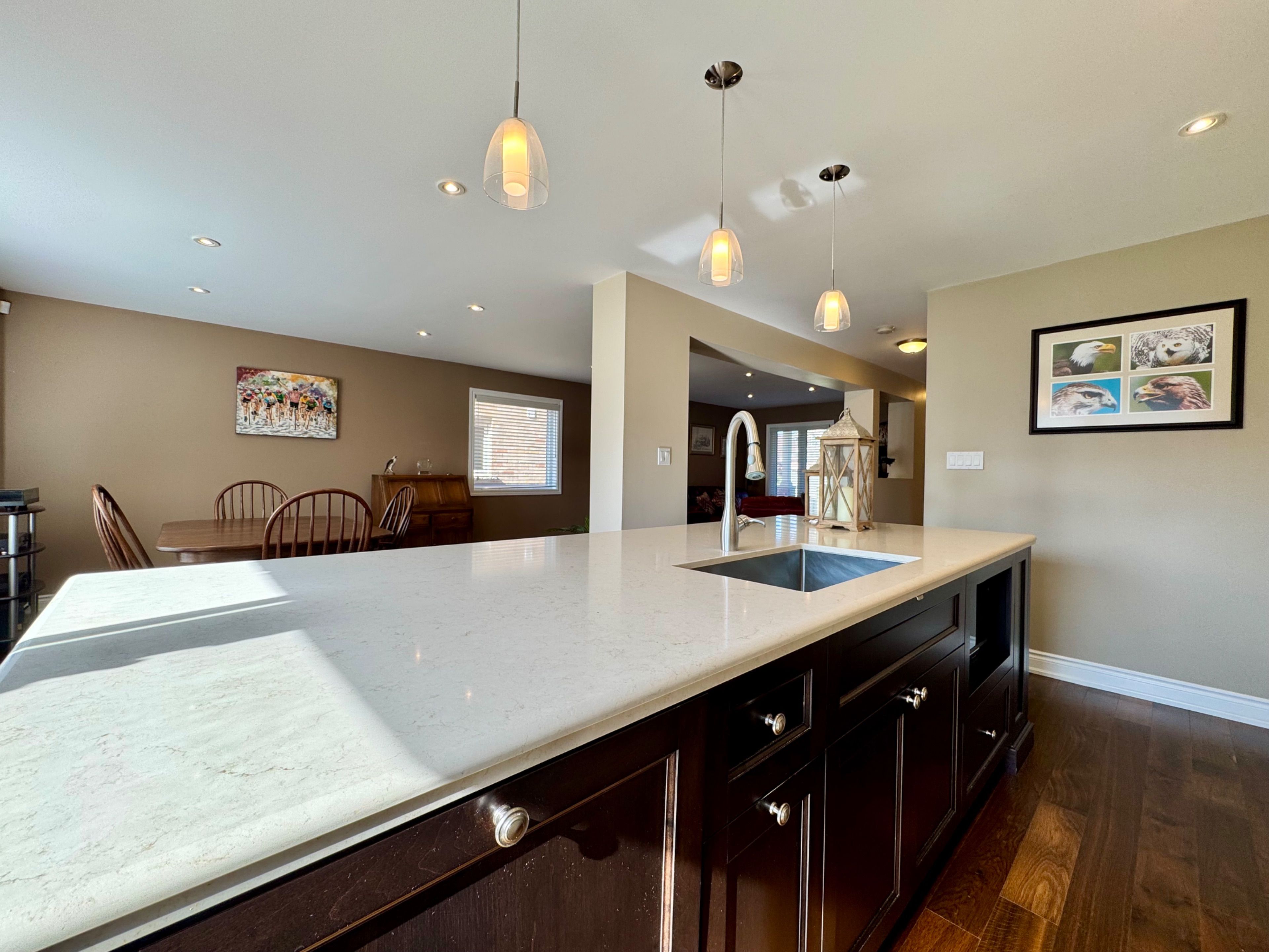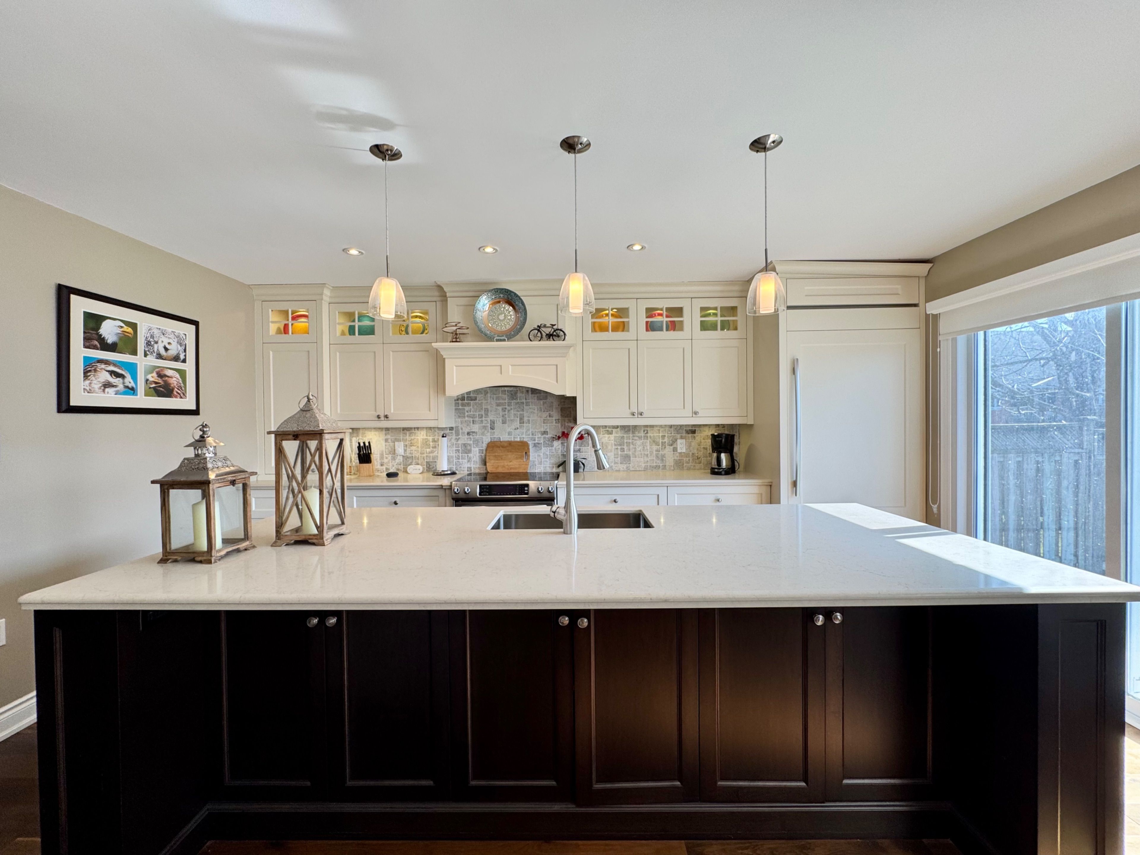 This charming brick exterior home showcases great curb appeal with a covered front porch and convenient single-car garage. Inside, a thoughtfully renovated main floor (2013) features a bright open-concept layout ideal for modern living. The stunning gourmet kitchen includes a large centre island, built-in Jenn-Air fridge, beautiful cabinetry, stylish backsplash, and pendant lighting, seamlessly connecting to the spacious living and dining areas. Upgraded hardwood flooring, smooth ceilings, and pot lights run throughout. A powder room with laundry, inside access to the garage, and a tiled front entry add everyday convenience. Upstairs (renovated in 2016), the spacious primary bedroom includes a walk-in closet and a full 4-piece ensuite bathroom. Two additional bedrooms and a spa-inspired 3-piece bathroom with tiled floors, oversized glass shower, and upgraded vanity complete the level. Hardwood flooring extends throughout the upper floor. The unfinished lower level includes a cold room and plenty of storage space, ready for future customization. The fully fenced, pool sized, backyard is a blank canvas for your outdoor vision. Additional updates include furnace, A/C, and windows throughout, with the roof reshingled approximately 2011. Exceptional location close to schools, parks, trails, shopping, public transit, and easy highway access - an ideal place to call home.