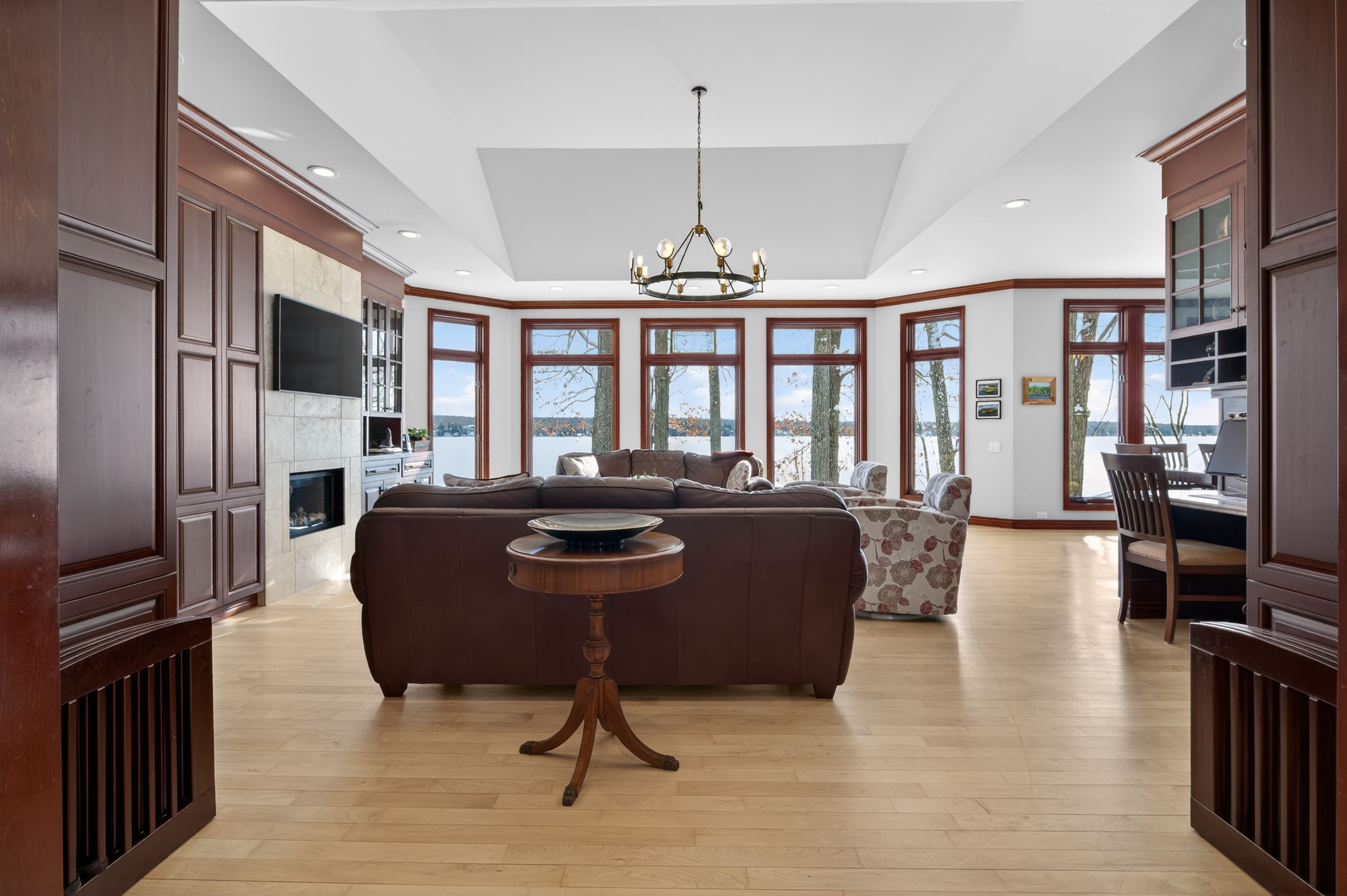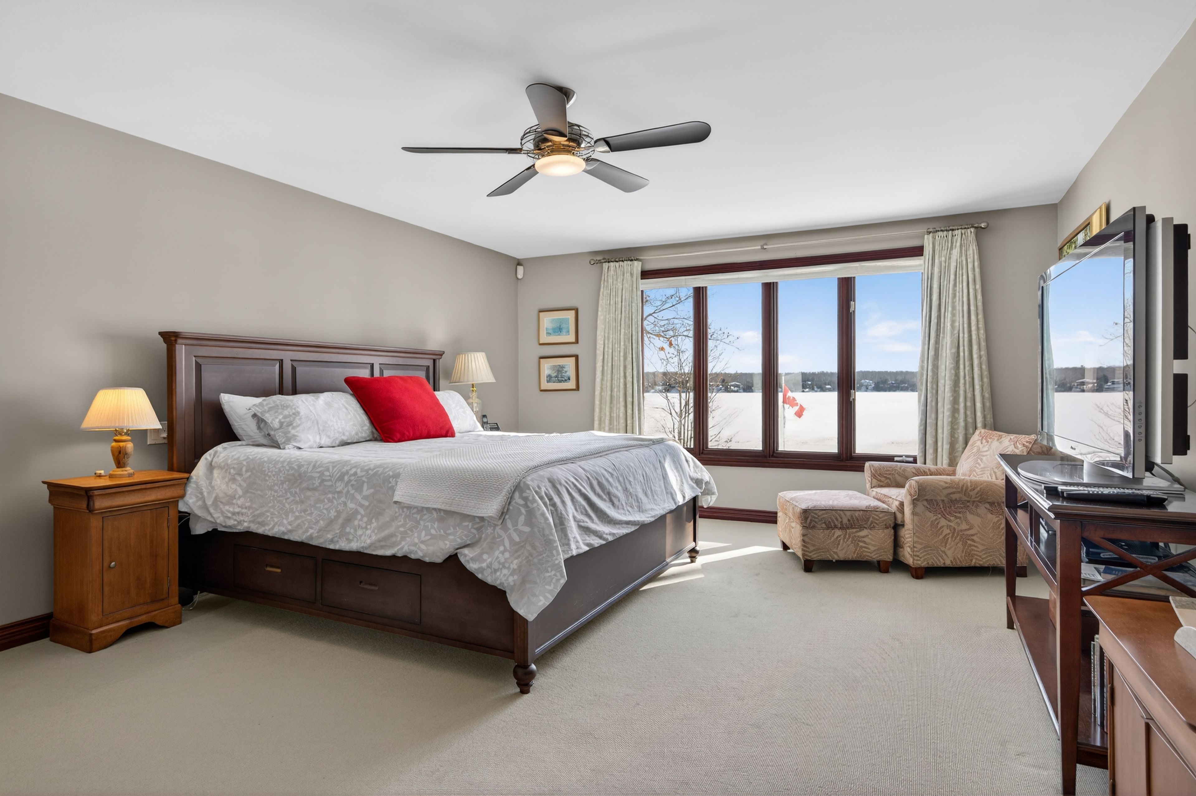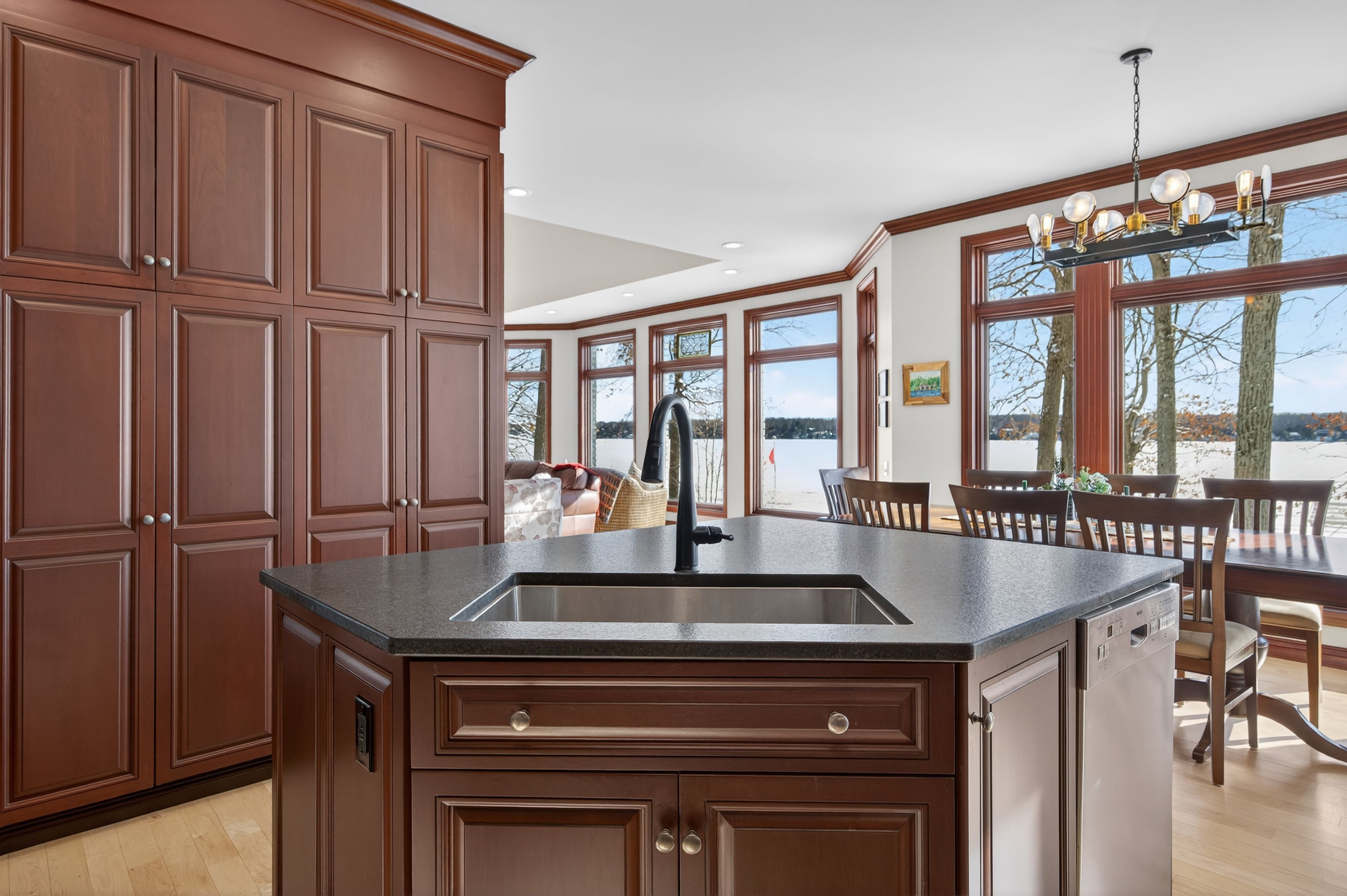 Set on the pristine shores of Clear Lake, this executive 6 bedroom, 5 bathroom waterfront home offers a rare blend of luxury, privacy and iconic Kawartha living. This exceptional brick and pine bungalow has approximately 5,400 sq ft of finished living space, combining quality craftsmanship and thoughtful design-set on a private lot with easy access off the main road. A spacious front entryway leads into an impressive open-concept living, dining, and kitchen area, highlighted by vaulted ceilings and wall-to-ceiling windows showcasing spectacular lakeviews. Maple flooring, recessed pot lighting, and a propane fireplace create a warm yet refined atmosphere. The living and kitchen areas feature custom cherry cabinetry, while the kitchen is beautifully appointed with high-end appliances, an extra-large refrigerator, and granite countertops and backsplash-perfect for entertaining. A large deck off the kitchen provides seamless access to the garden and waterfront. The main level also includes a large front office, main-floor laundry, and a primary suite with walk-in closet and spa-like ensuite. The walk-out lower level features a generous recreation room with wood-burning fireplace, floor-to-ceiling windows, and space for family gatherings. Also with its own private entrance is a self-contained 2-bedroom, 1-bath in-law suite, ideal for guests or extended family. Outside, enjoy 107 ft of flat, private waterfront, canilevered aluminum T-docks, and a double dry boathouse with recreational space above, offering excellent storage for boats and watertoys. Two additional back lots provide extra storage and future potential. Additional features include an attached double garage, 24' x 25' workshop, paved driveway, underground watering system, armoured retaining wall, and quality construction throughout. An outstanding Clear Lake executive waterfront offering, gorgeous from entrance to exit.