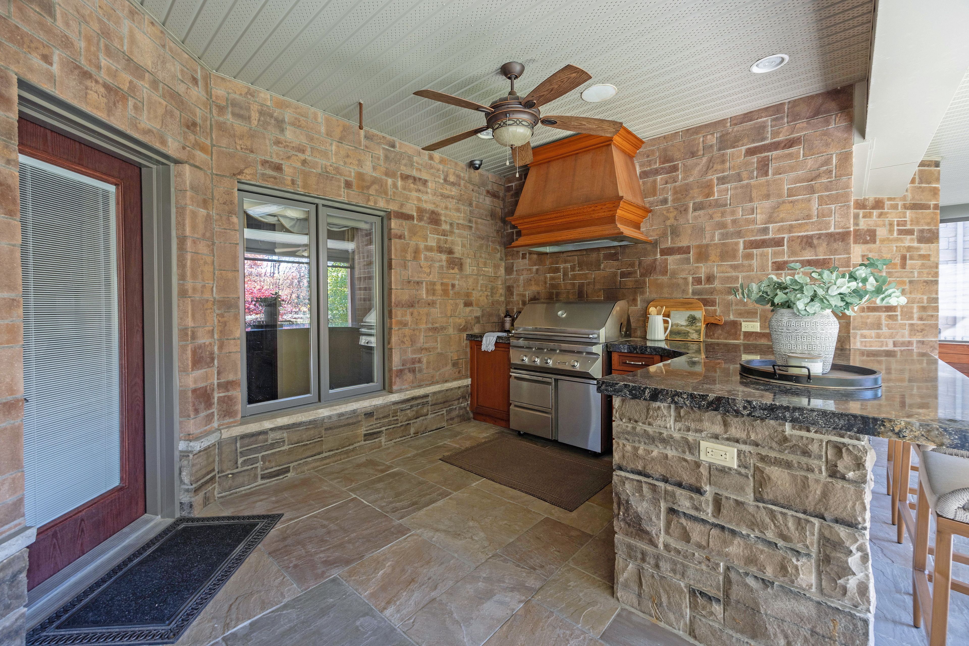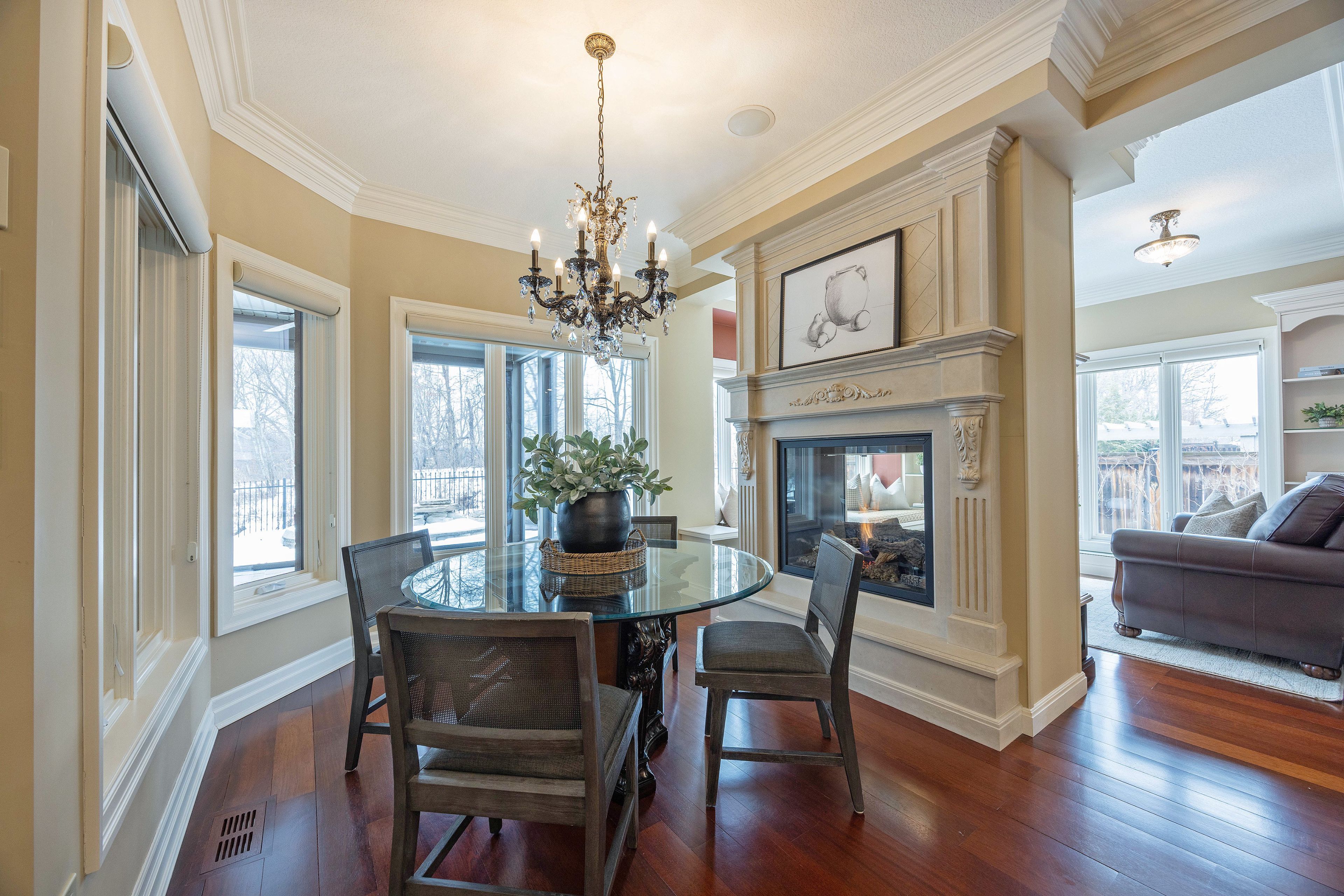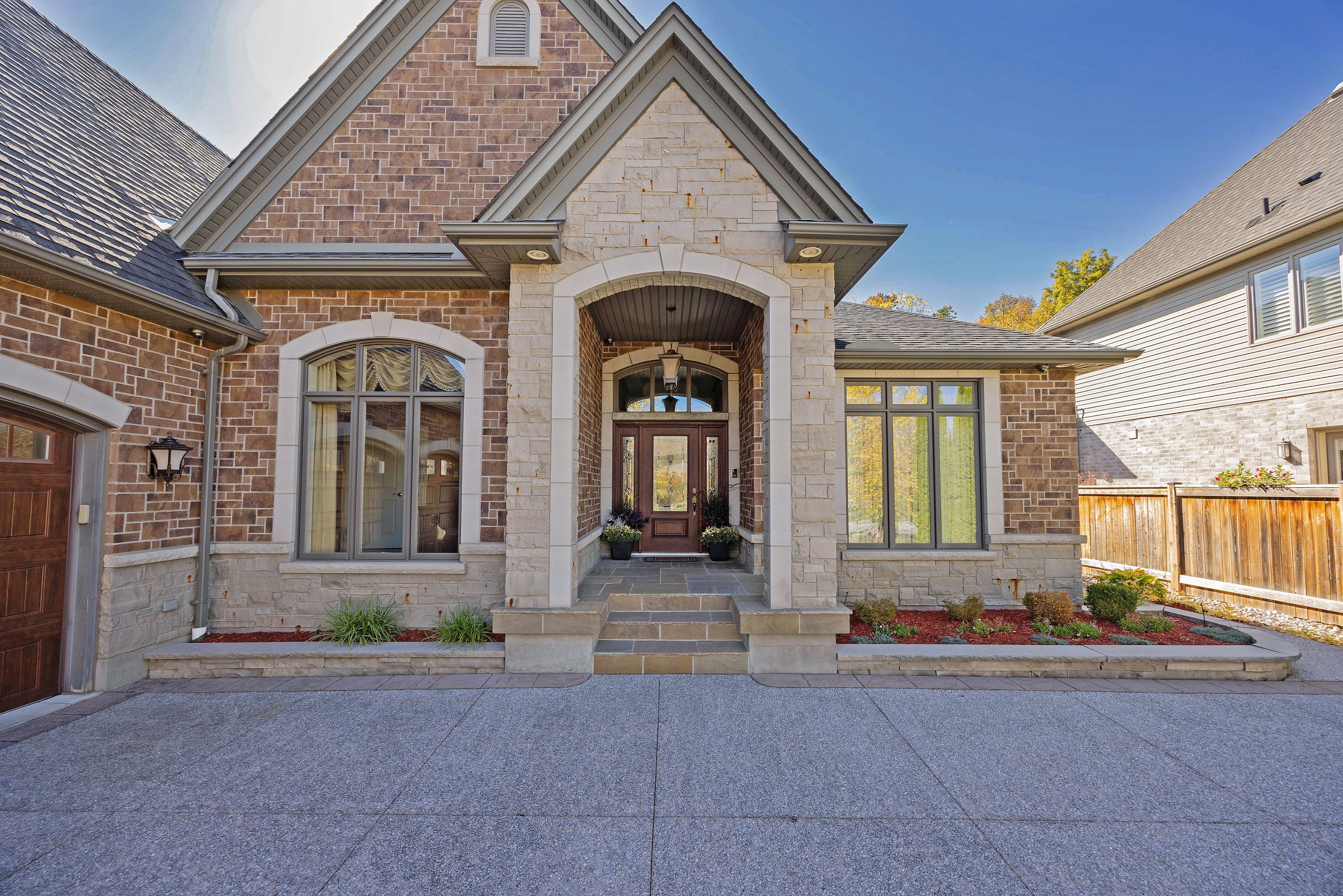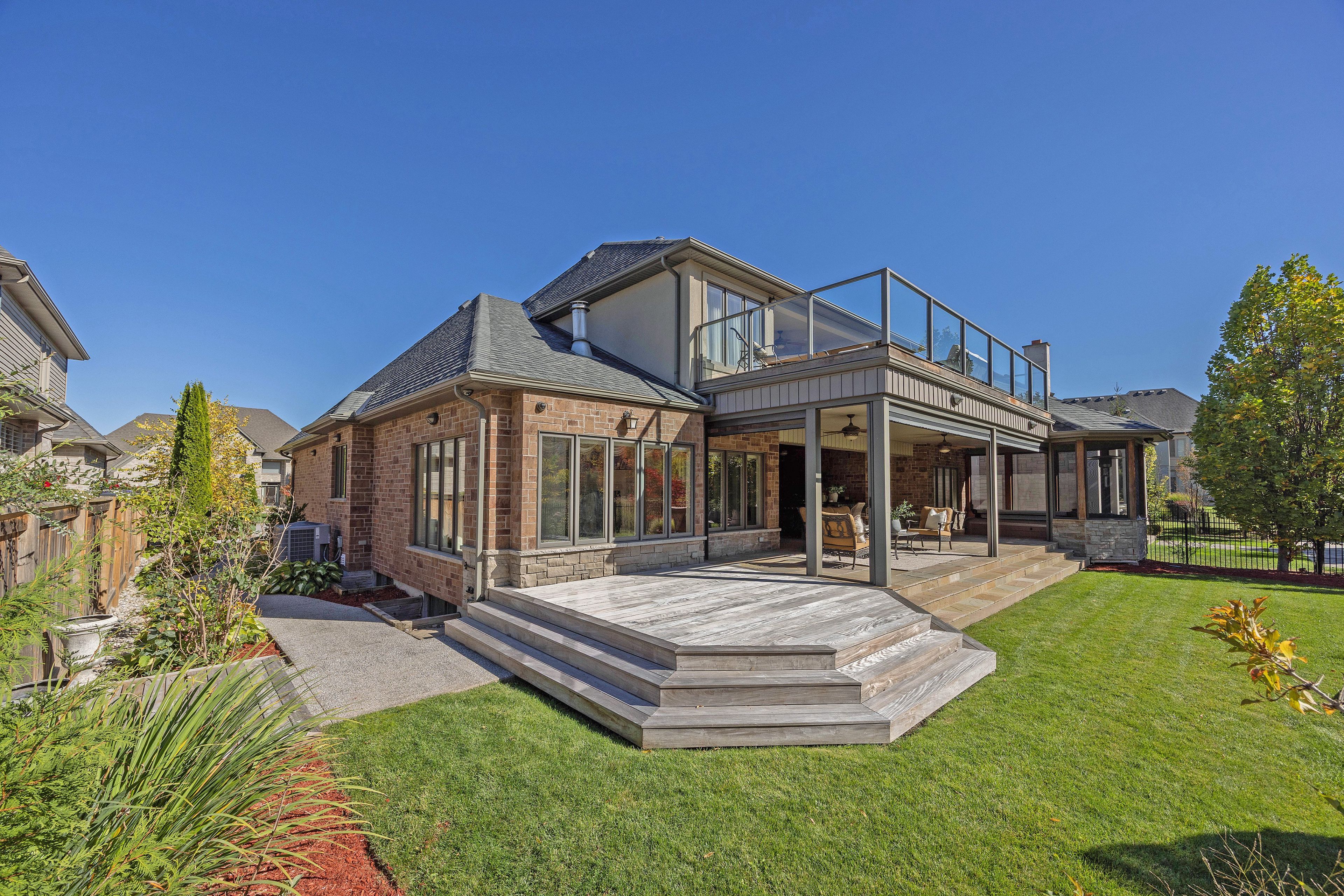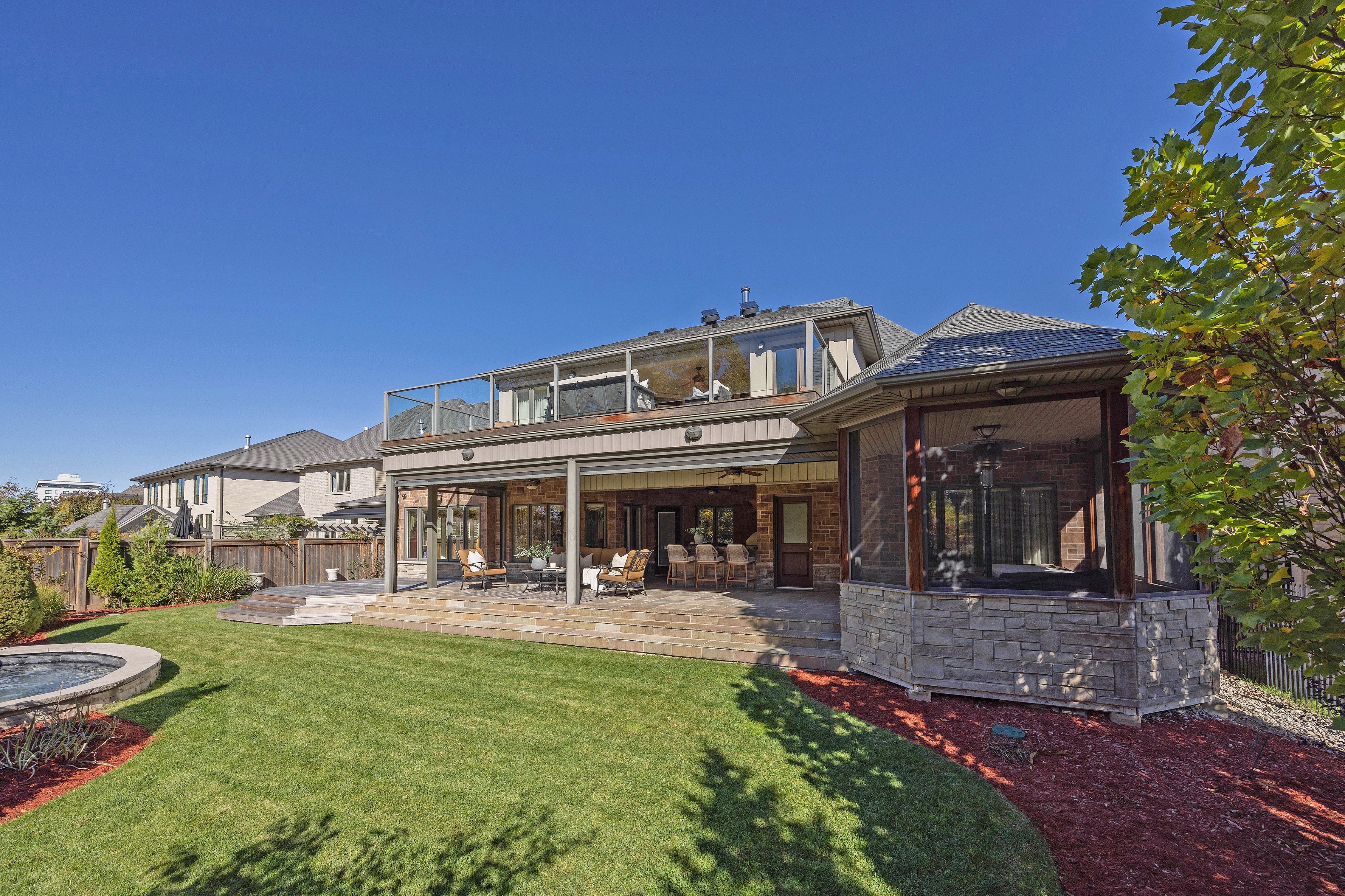 This stone residence, backing onto serene woods, offers privacy and an extraordinary outdoor living space. The incredible screened room, overlooking the gardens and woods, is a true showpiece-complete with built-in BBQ, granite counters, hot tub, and a 3-piece bath. Custom interior features include built-in cabinetry, integrated sound system, Swarovski chandeliers, plaster mouldings, a wood-burning fireplace and striking double-sided gas fireplace. Heated floors in the bathrooms and laundry room. The main-floor primary suite features an ensuite, custom walk-through closet, and convenient access to the laundry room with built-in ironing board and exceptional storage. Kitchen features a granite island, induction cooktop, wine fridge, and butler's pantry connecting to the dining room. A main-floor office-easily a third bedroom-offers a built-in desk, generous closet, and cheater ensuite. Second main floor bedroom features walk-in closet and ensuite. Upstairs, a custom-designed loft provides remarkable flexibility for a home gym, media lounge, or hobby space, complete with a 3-piece bath and access to a large covered upper deck with exterior storage. The lower level is designed with versatility in mind, offering the potential for a private suite with bedroom, 4pc bath, kitchen, family room, movie area, roughed-in laundry, and separate entrance to the garage. A rare offering that seamlessly blends luxury, functionality, and one-of-a-kind design backing onto spectacular woods.