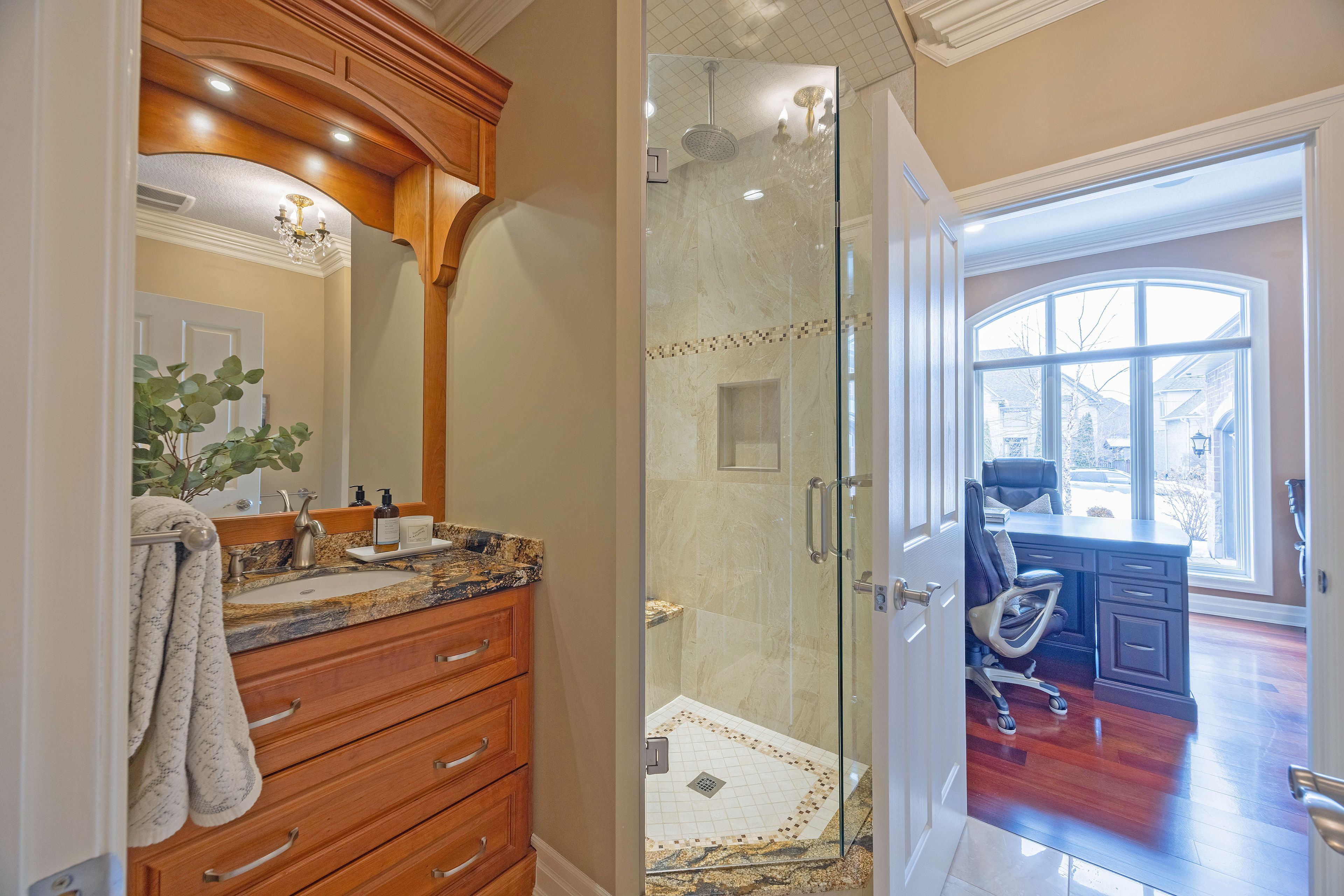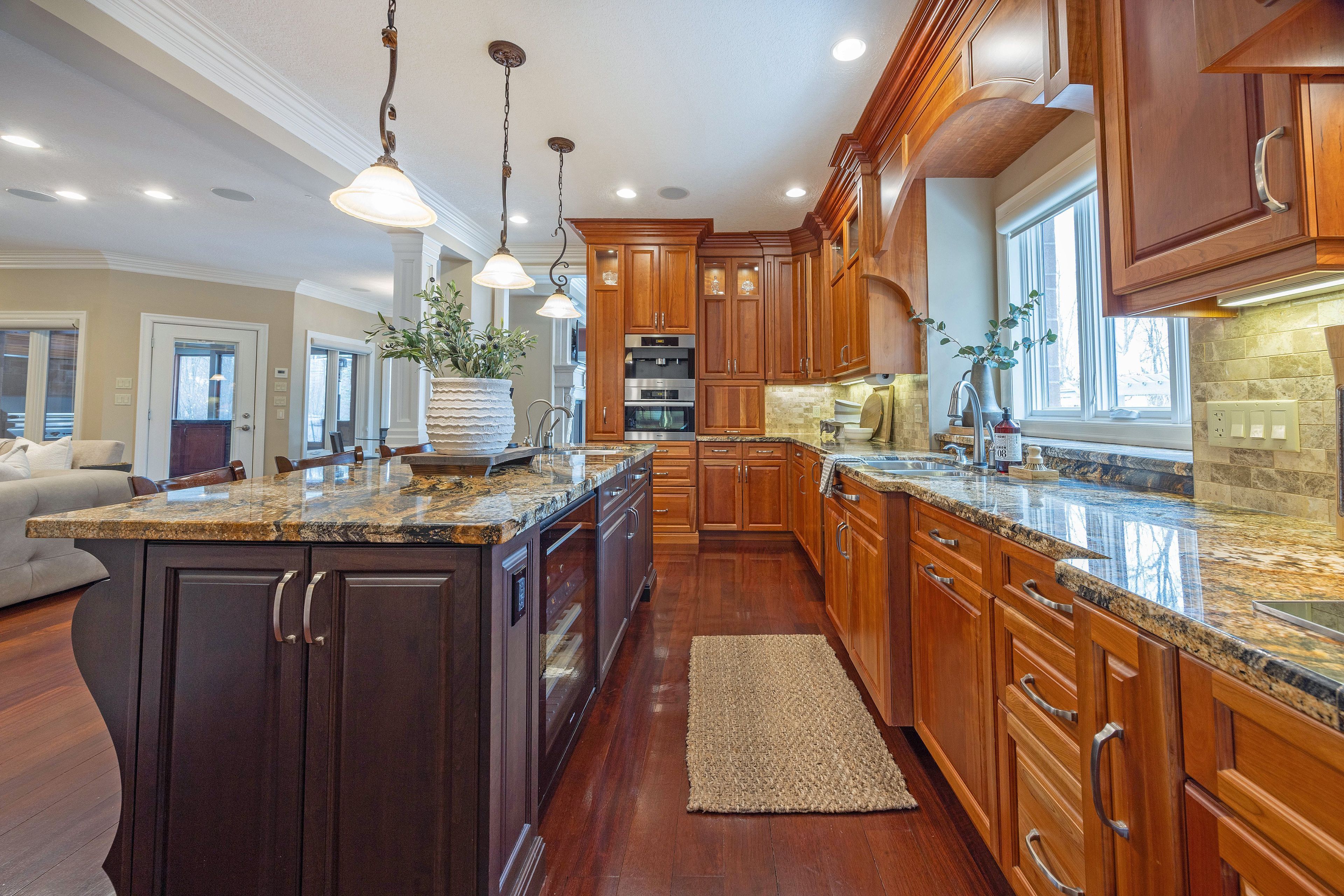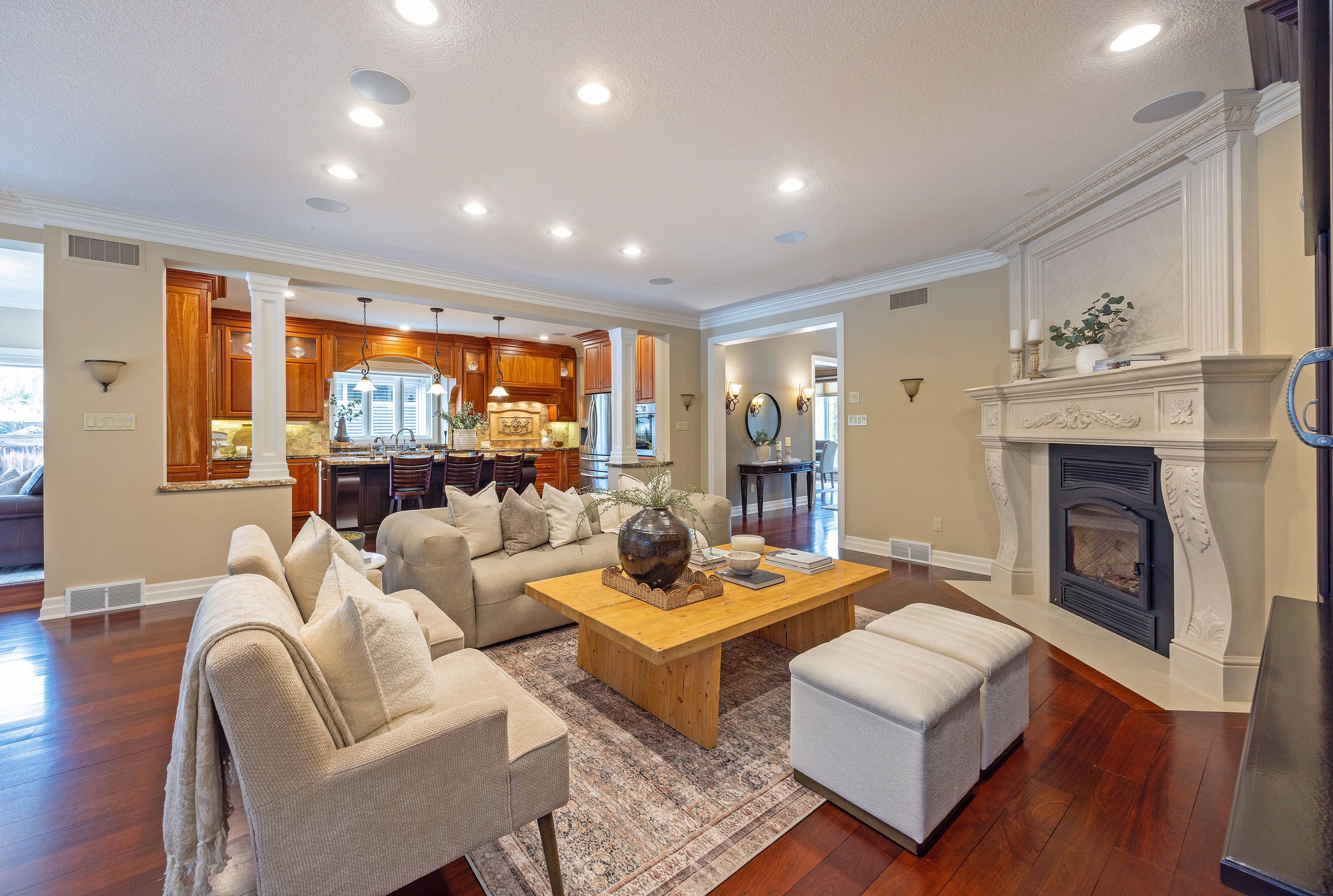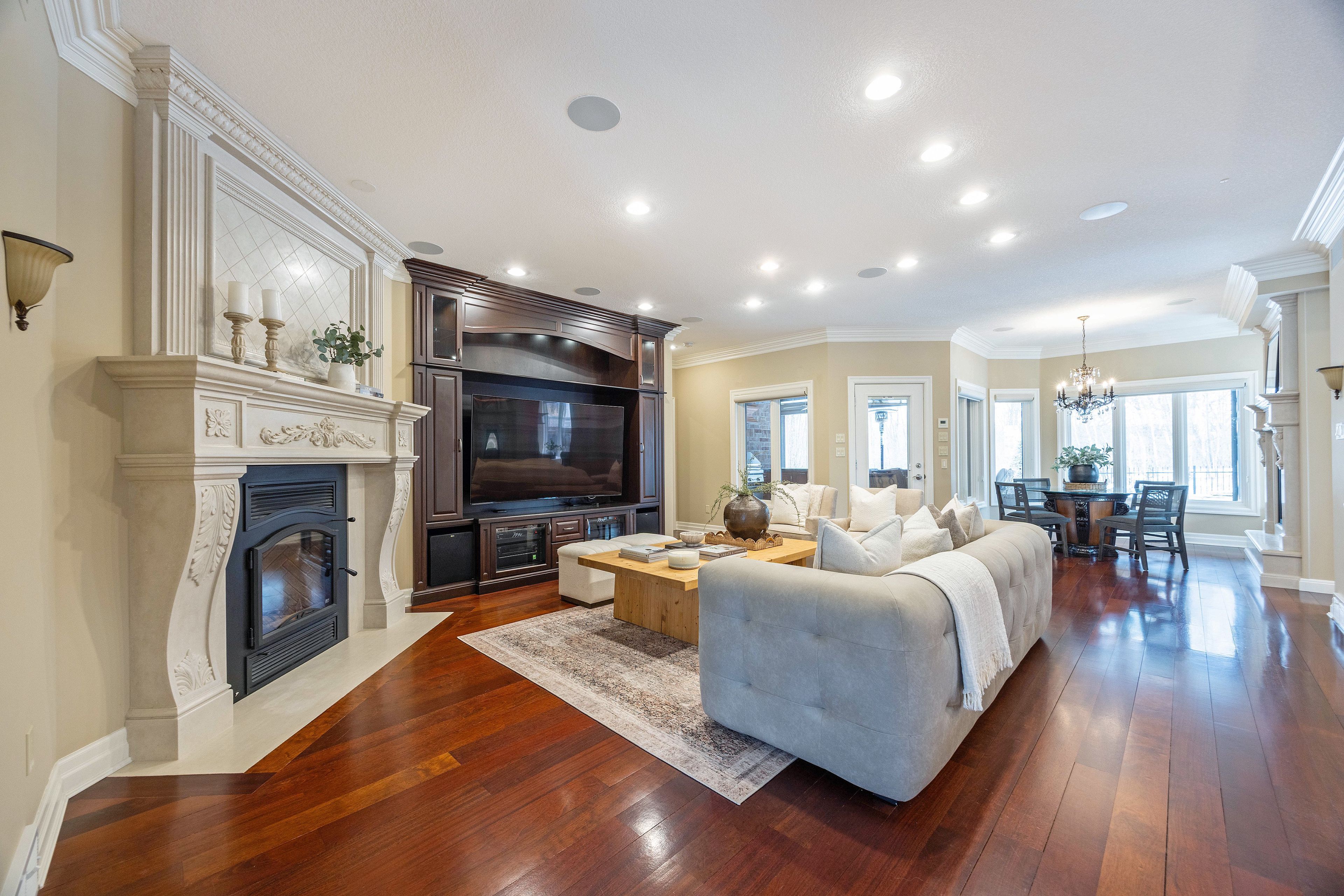 This stone residence, backing onto serene woods, offers privacy and an extraordinary outdoor living space. The incredible screened room, overlooking the gardens and woods, is a true showpiece-complete with built-in BBQ, granite counters, hot tub, and a 3-piece bath. Custom interior features include built-in cabinetry, integrated sound system, Swarovski chandeliers, plaster mouldings, a wood-burning fireplace and striking double-sided gas fireplace. Heated floors in the bathrooms and laundry room. The main-floor primary suite features an ensuite, custom walk-through closet, and convenient access to the laundry room with built-in ironing board and exceptional storage. Kitchen features a granite island, induction cooktop, wine fridge, and butler's pantry connecting to the dining room. A main-floor office-easily a third bedroom-offers a built-in desk, generous closet, and cheater ensuite. Second main floor bedroom features walk-in closet and ensuite. Upstairs, a custom-designed loft provides remarkable flexibility for a home gym, media lounge, or hobby space, complete with a 3-piece bath and access to a large covered upper deck with exterior storage. The lower level is designed with versatility in mind, offering the potential for a private suite with bedroom, 4pc bath, kitchen, family room, movie area, roughed-in laundry, and separate entrance to the garage. A rare offering that seamlessly blends luxury, functionality, and one-of-a-kind design backing onto spectacular woods.