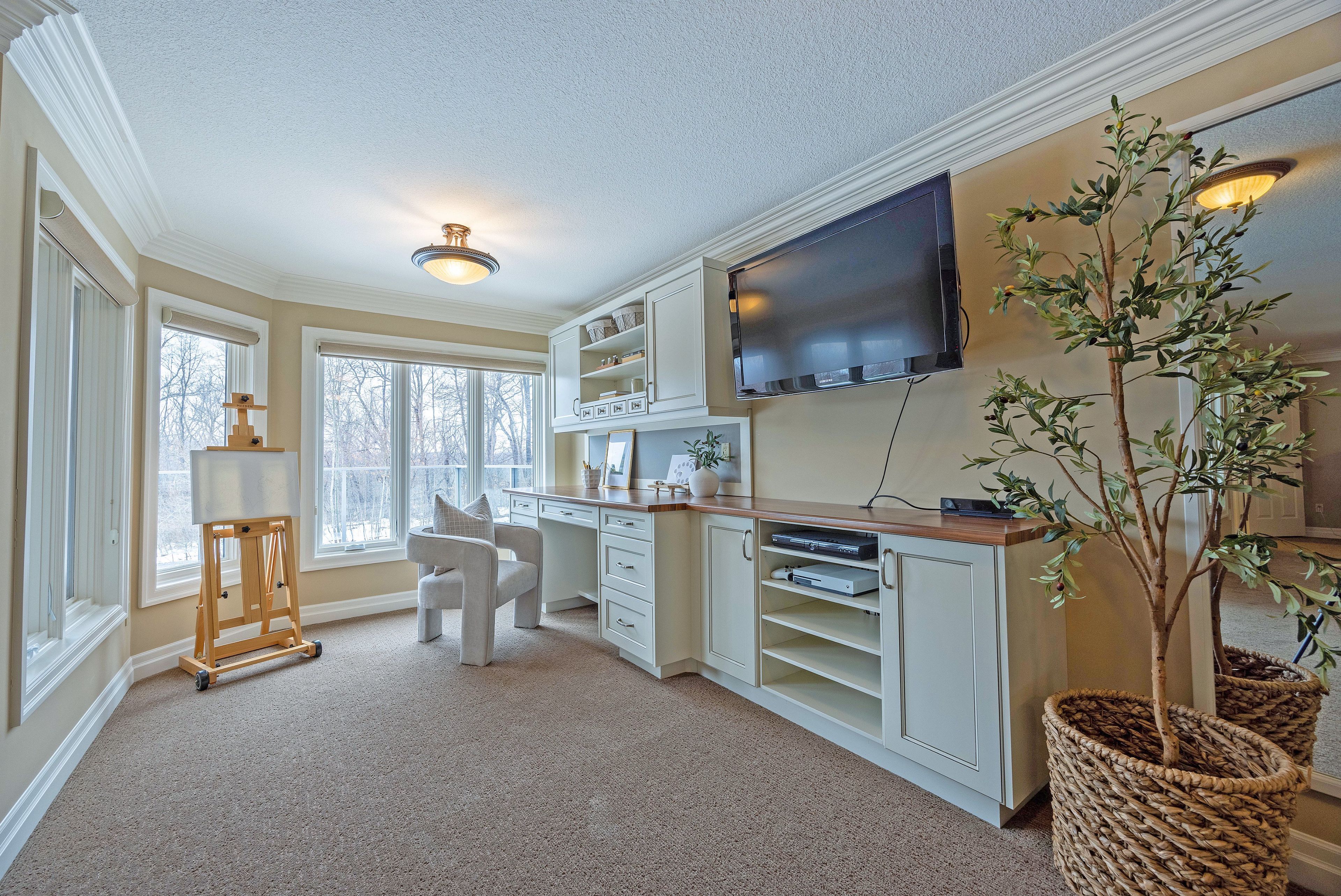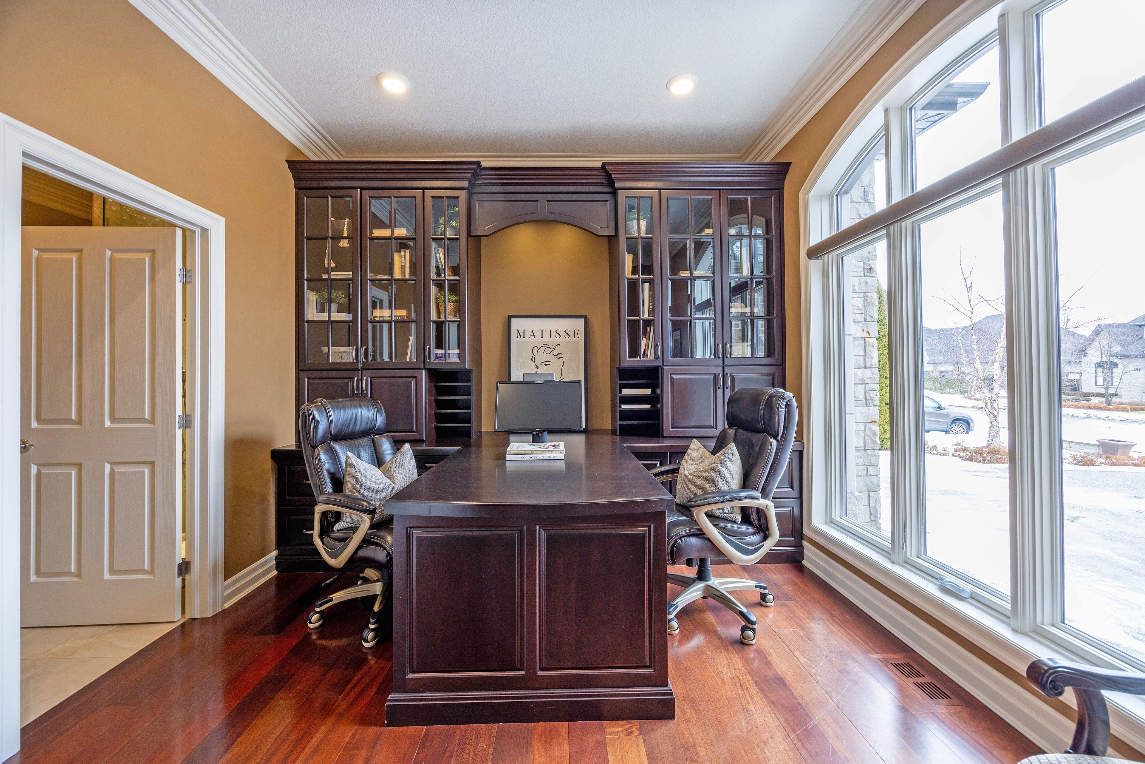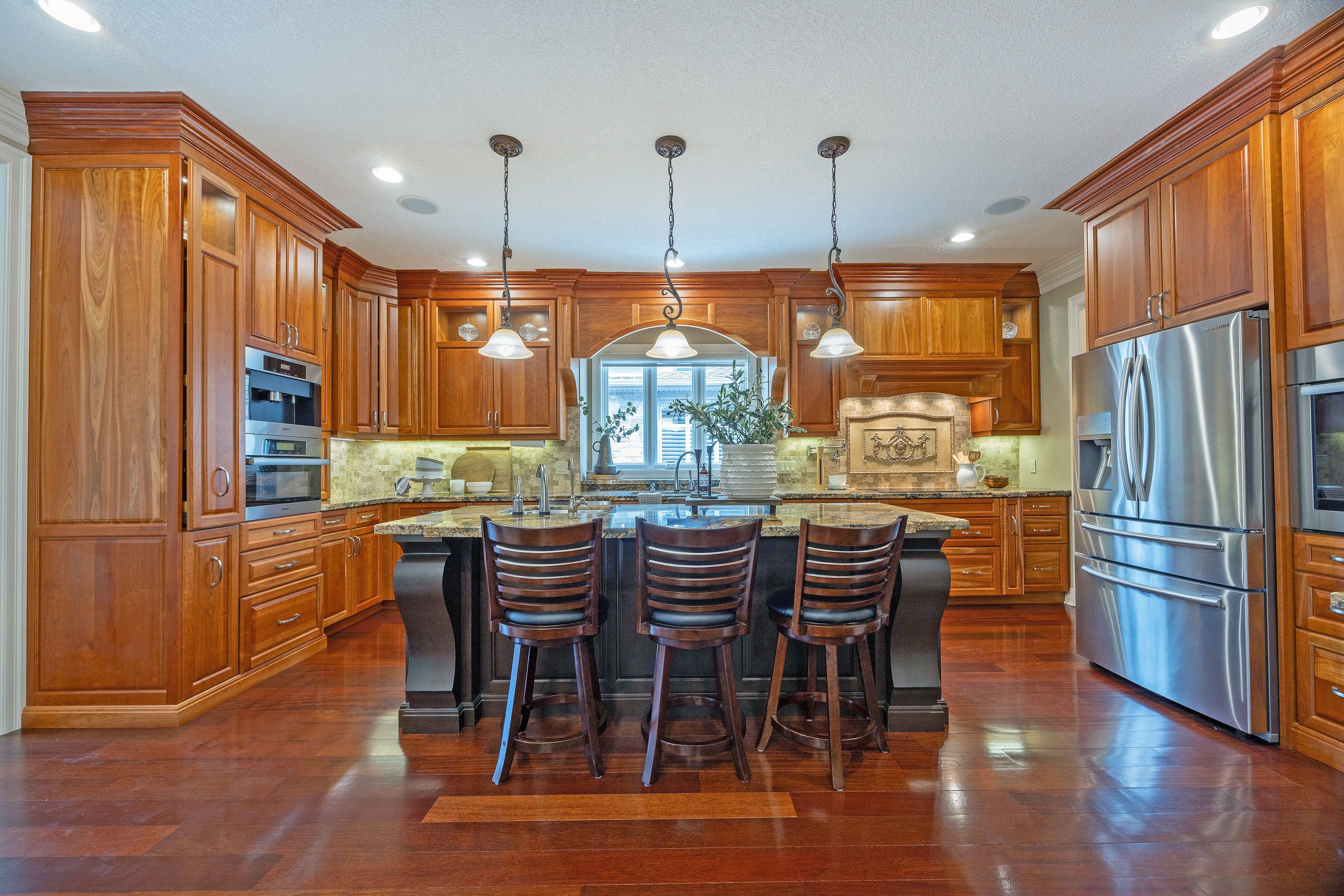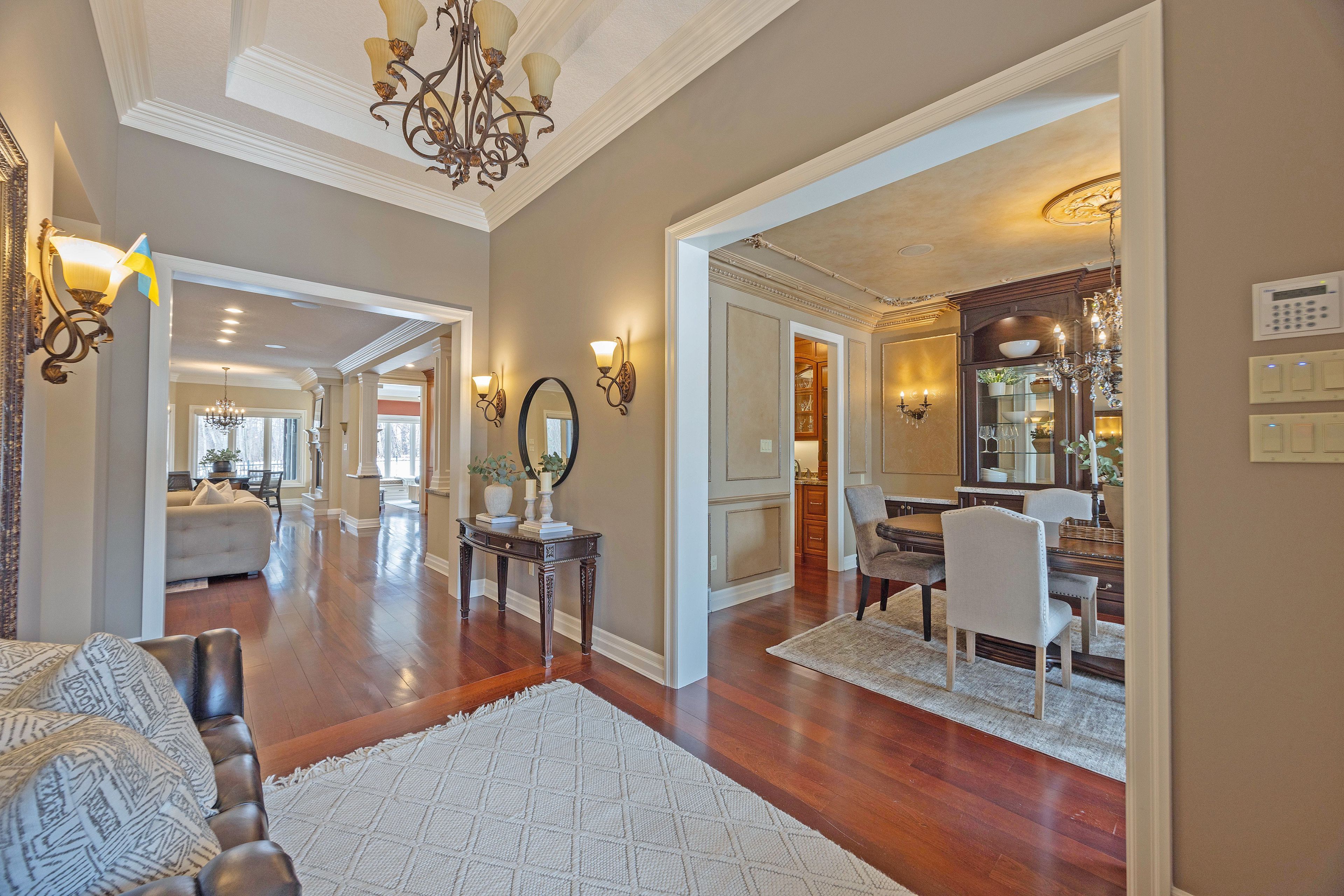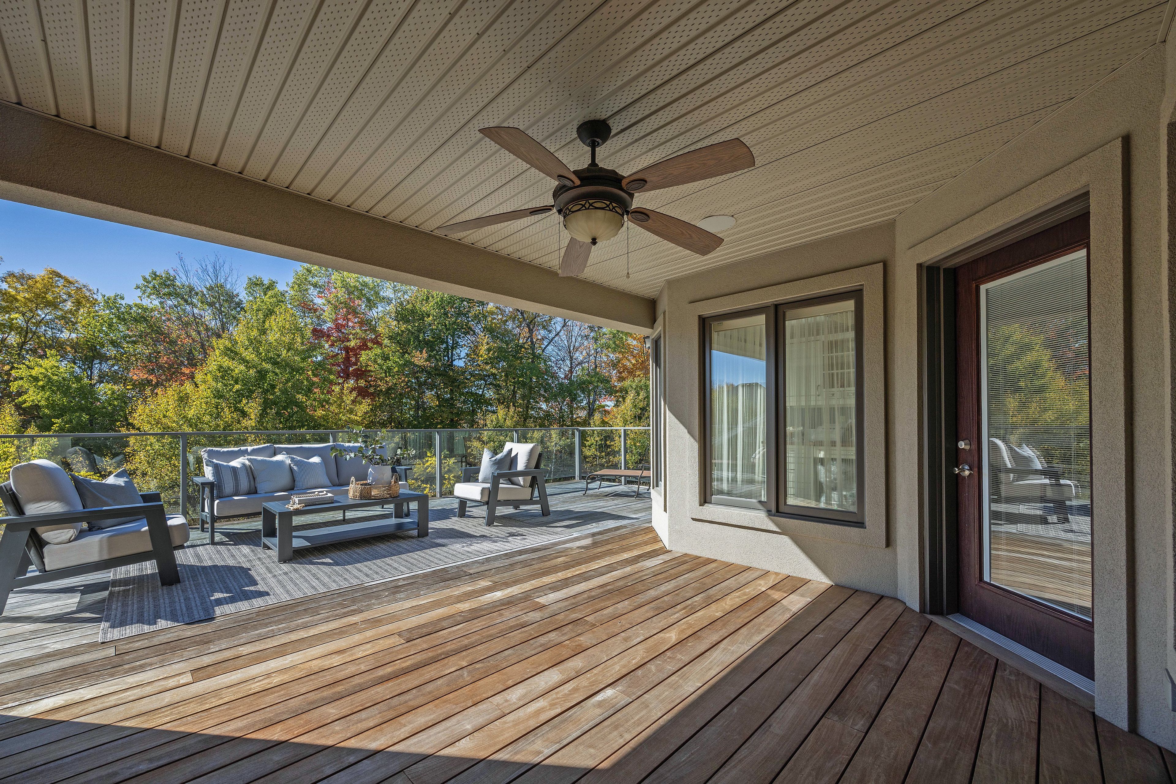 This stone residence, backing onto serene woods, offers privacy and an extraordinary outdoor living space. The incredible screened room, overlooking the gardens and woods, is a true showpiece-complete with built-in BBQ, granite counters, hot tub, and a 3-piece bath. Custom interior features include built-in cabinetry, integrated sound system, Swarovski chandeliers, plaster mouldings, a wood-burning fireplace and striking double-sided gas fireplace. Heated floors in the bathrooms and laundry room. The main-floor primary suite features an ensuite, custom walk-through closet, and convenient access to the laundry room with built-in ironing board and exceptional storage. Kitchen features a granite island, induction cooktop, wine fridge, and butler's pantry connecting to the dining room. A main-floor office-easily a third bedroom-offers a built-in desk, generous closet, and cheater ensuite. Second main floor bedroom features walk-in closet and ensuite. Upstairs, a custom-designed loft provides remarkable flexibility for a home gym, media lounge, or hobby space, complete with a 3-piece bath and access to a large covered upper deck with exterior storage. The lower level is designed with versatility in mind, offering the potential for a private suite with bedroom, 4pc bath, kitchen, family room, movie area, roughed-in laundry, and separate entrance to the garage. A rare offering that seamlessly blends luxury, functionality, and one-of-a-kind design backing onto spectacular woods.