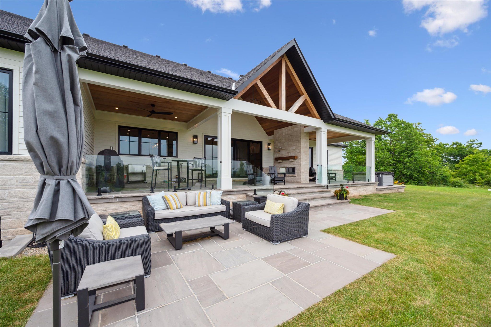 - 外部特点: Backs On Green Belt, Built-In-BBQ, Hot Tub, Landscape Lighting, Landscaped, Lighting, Patio, Privacy, Porch