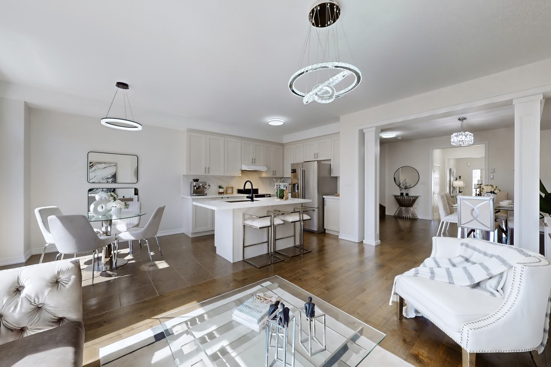 Located in one of Jefferson's most desirable neighborhoods and surrounded by protected greenbelt and golf course lands, this area benefits from minimal through-traffic and enduring privacy. Sun-filled 3-bed freehold townhouse in coveted Jefferson Forest. Bright south-facing living & breakfast areas, open-concept main floor with hardwood throughout. Primary bedroom with walk-in closet & 4-pc ensuite. Convenient 2nd-floor laundry. Upgraded hardwood staircase with runner & iron pickets. Direct garage access. Look-out basement (above-grade windows) for future rec room. Deck & private fenced backyard siding onto ravine/greenspace-enhanced privacy and nature at your door. 2-car driveway. Steps to Yonge/YRT/Viva, parks & shopping; quick access to Hwy 404. Within Richmond Hill High School area.