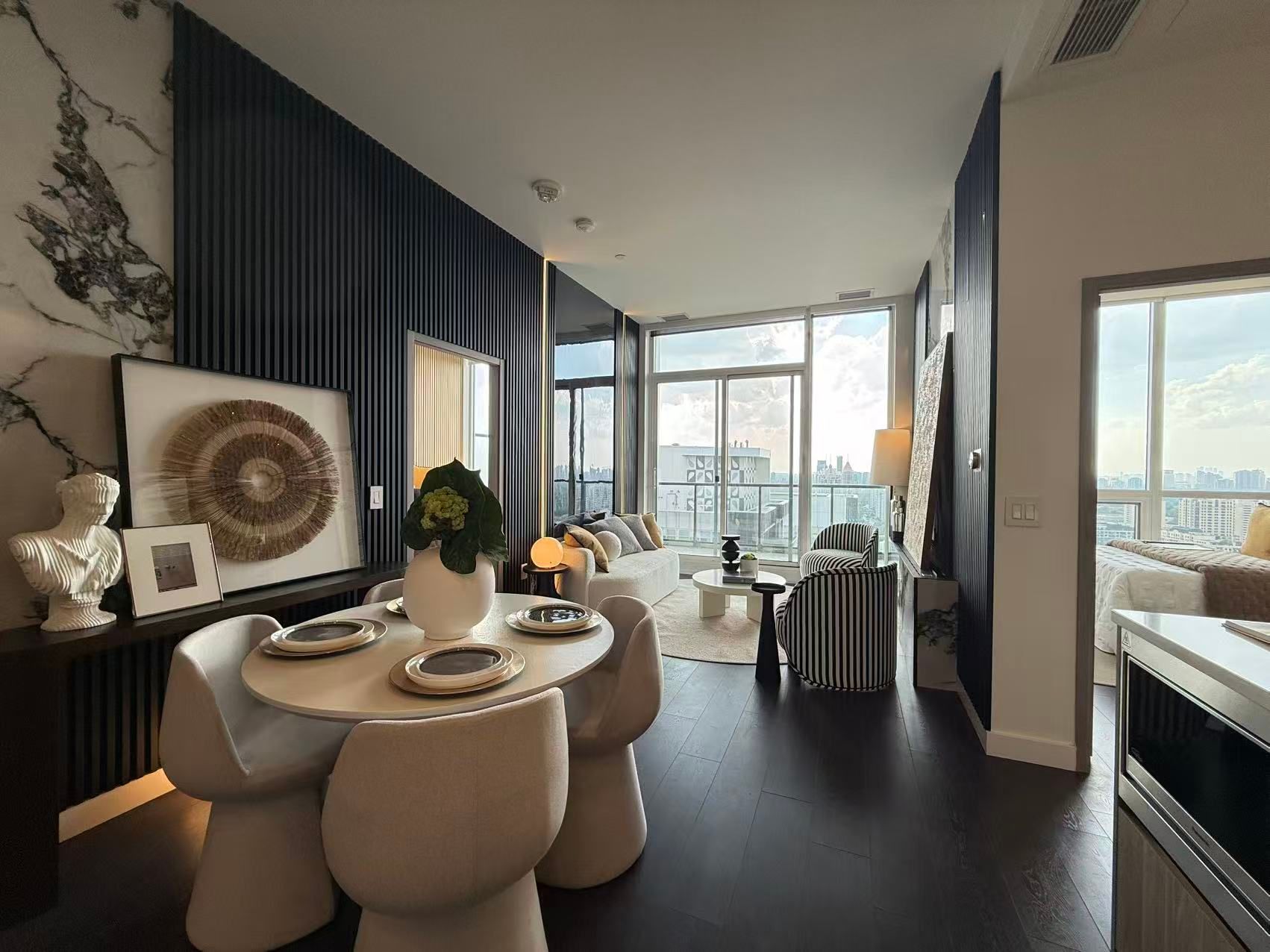 Experience refined luxury living at Seasons Condos by Concord in North York. This exquisite penthouse west-facing suite offers 850 sq ft of thoughtfully designed interior space, paired with an expansive 138 sq ft balcony. Flooded with natural light, it features soaring 9 ft ceilings and impressive floor-to-ceiling windows. The contemporary open-concept kitchen showcases quartz countertops and premium Miele appliances, perfect for both everyday living and entertaining. The spa-inspired bathroom is appointed with custom cabinetry, quartz finishes, and an elegant undermount sink. The sophisticated bedroom includes built-in custom closets and chic roller blinds for added privacy and style. Situated just steps from Bessarion TTC subway station, this exceptional location offers unbeatable convenience with immediate access to an 8-acre park, shopping destinations, and a variety of dining experiences. Enjoy the ultimate in style and comfort in one of North Yorks most prestigious penthouse addresses.