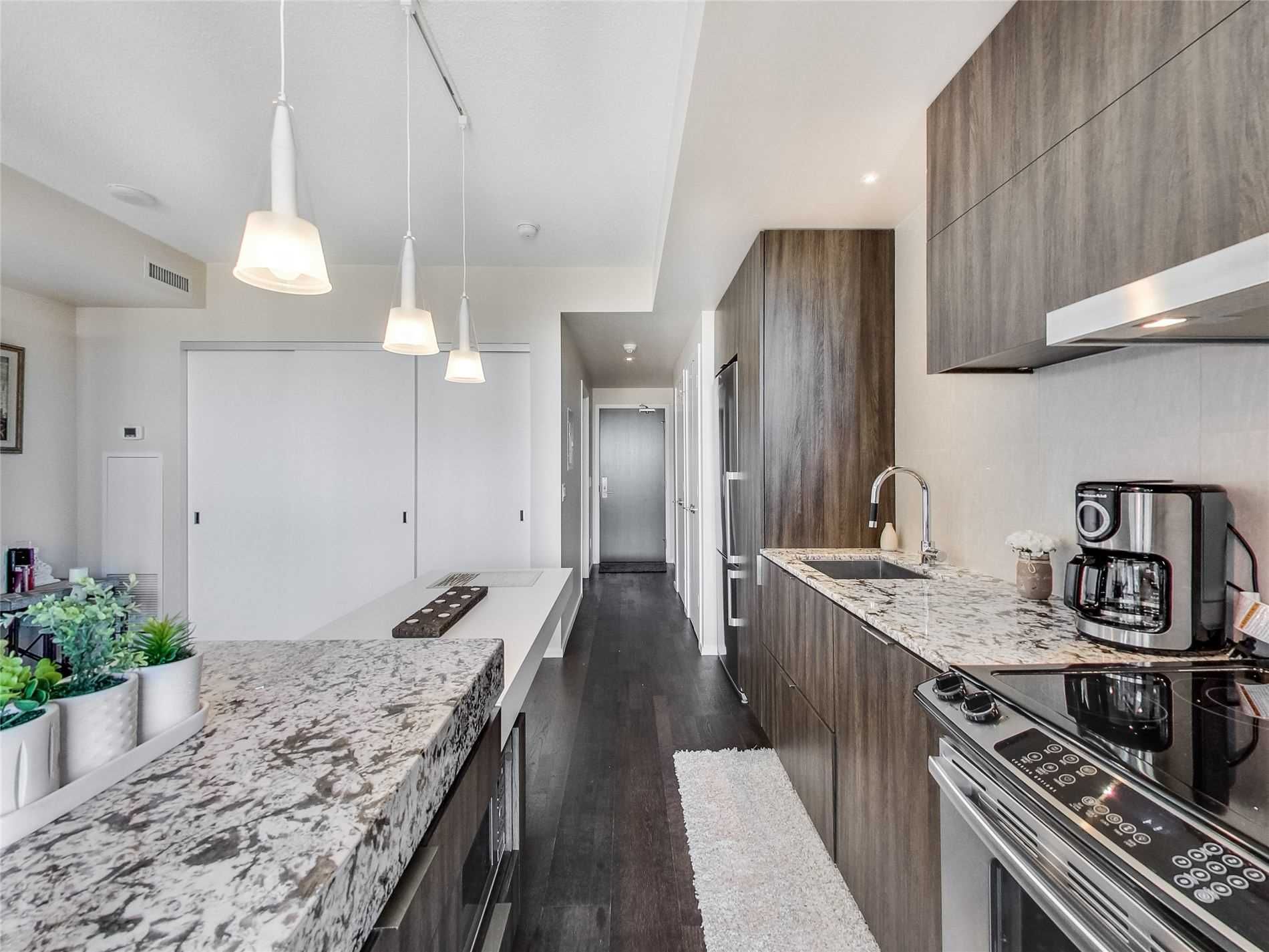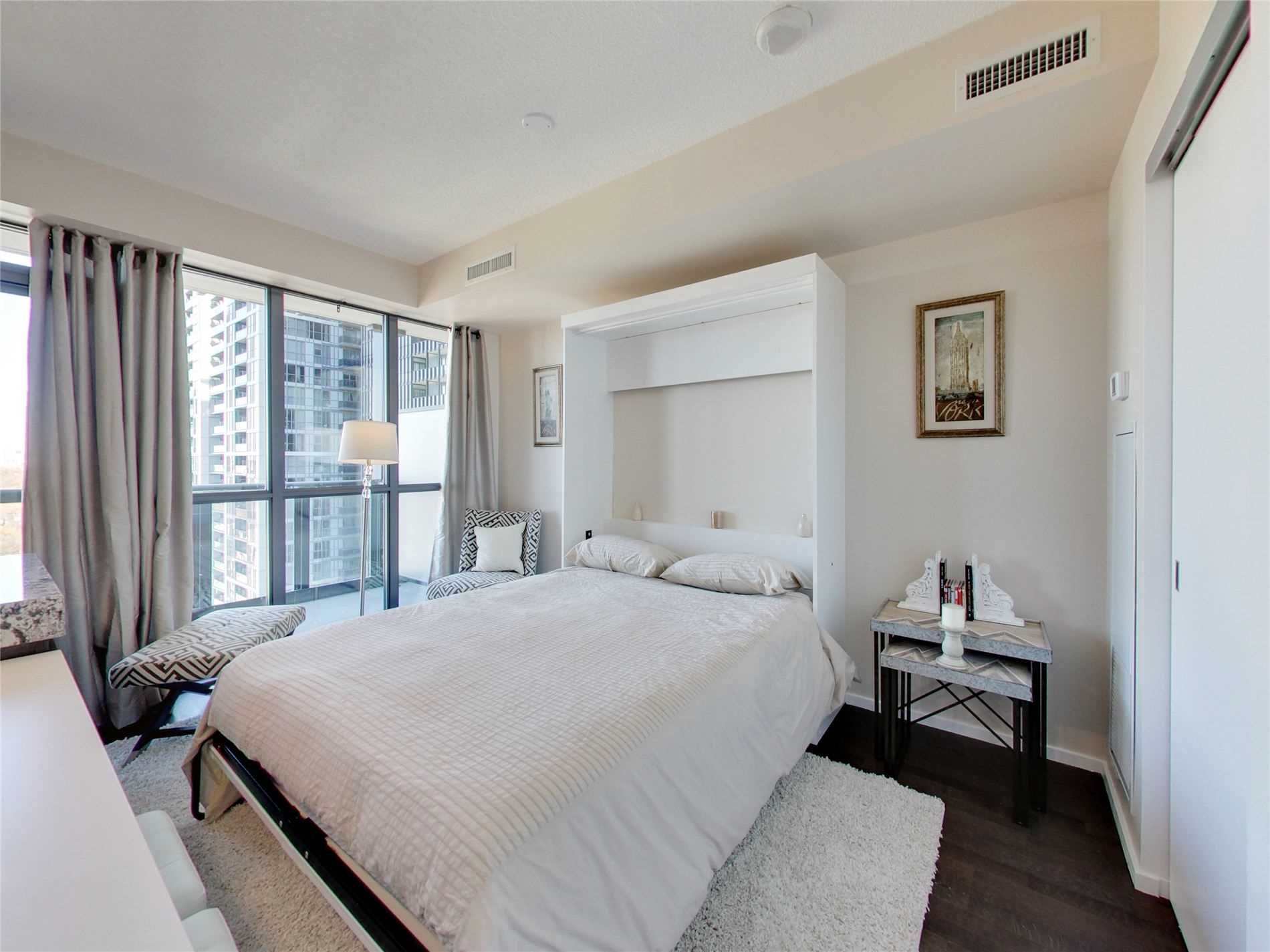 Beautiful Furnished Studio In A Super Well-Managed Building, Luxury, Spacious and functional layout. Enjoy The Amazing Views From An Oversized Balcony. Total 3 Closets, including a Very Large One in Living Room. The Kitchen Is Fully Loaded with A Big Island. A Queen Murphy bed and one locker is also included. 3 Minute Walk To The Subway, Restaurants, Shopping, Etc.