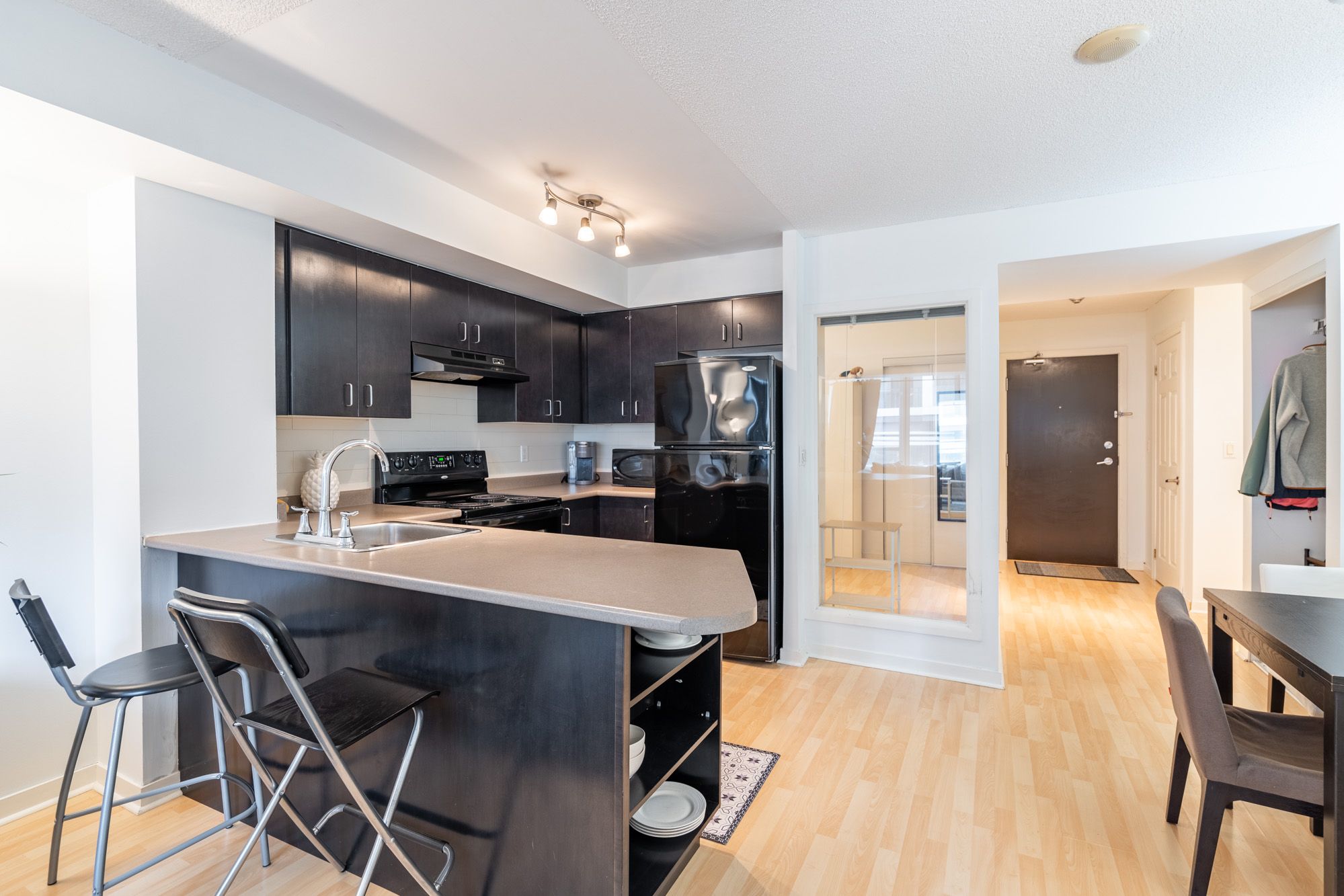 208-76 Shuter delivers what most downtown condos promise but rarely pull off: space, light and a layout that actually works. South-facing exposure. Split two bedrooms plus a proper den (yes, a real one). And 798 square feet of living space that feels intentional, not inflated with dead space. The primary bedroom is big and south-facing with ensuite-privilege access. The second bedroom is a good size and has the bonus of great closet space. The open-concept kitchen and living space is flooded with natural light, while a separate dining area gives you flexibility most condos skip altogether. Behind the scenes, peace of mind comes standard. Freshly painted. Parking and locker included. And your condo fees cover hydro, heat and water, leaving no guesswork with your monthly expenses. Steps to transit, restaurants, TMU, the Eaton Centre and, quite frankly, everything that makes downtown living worth it. Whether you're buying to live in it or rent it out, this one makes sense. RSA.
