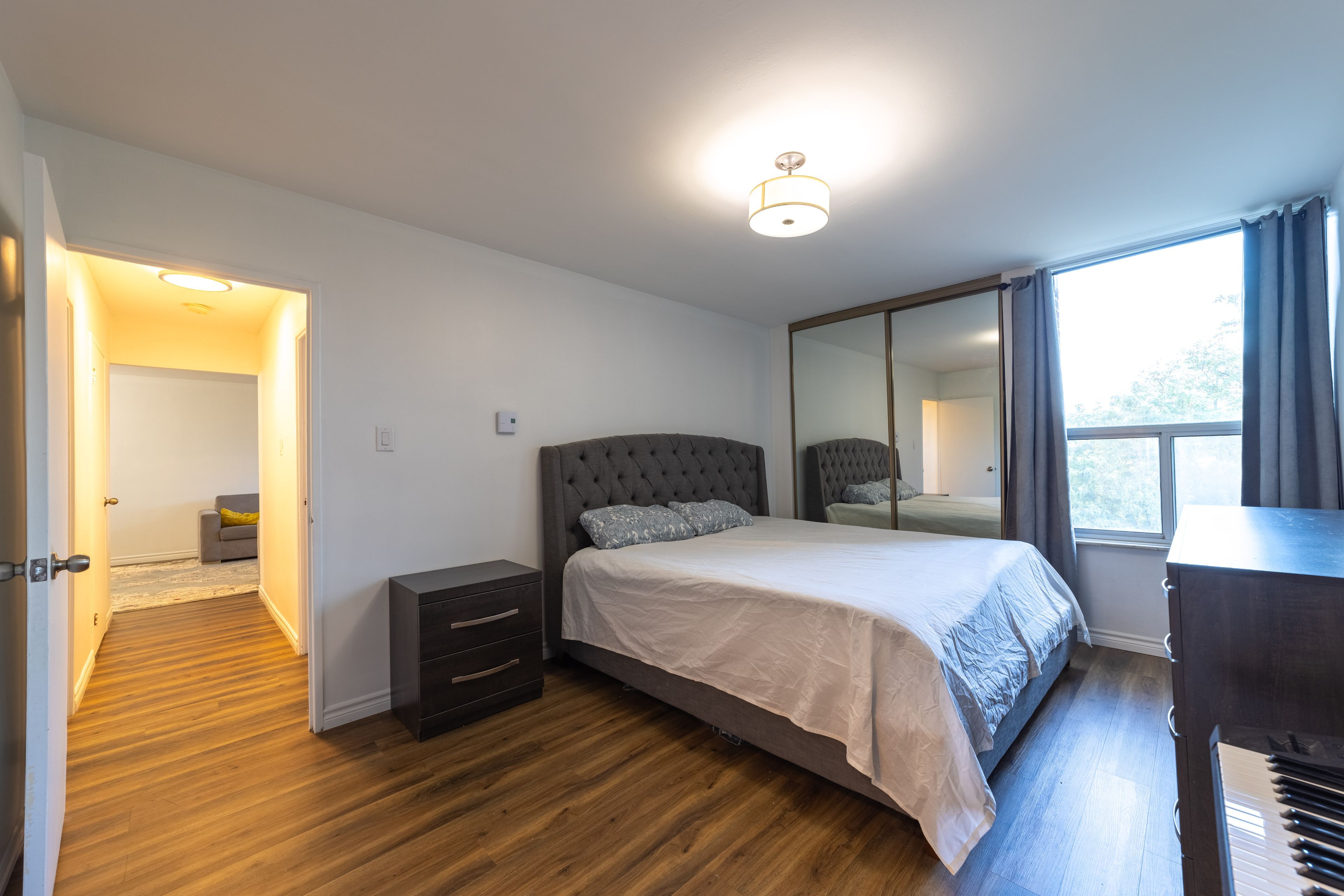 Rare Opportunity Renovated 2-Bedroom, 2-Bathroom, step into elegance with this professionally renovated suite offering a spacious, segmented layout and contemporary finishes throughout. The modern kitchen features sleek cabinetry, quartz countertops, and stainless-steel appliances. A bright and inviting living/dining area flows seamlessly to a private balcony with breathtaking views. Both bedrooms are generously sized with custom closets, 2-piece ensuite for your comfort. The in-suite laundry room provides ample storage and comes equipped with a washer and dryer. Wide plank flooring, upgraded trim, custom doors, and radiant heating with A/C (Hot & Cold) ensure year-round comfort and style. The community surrounding this residence offers the perfect blend of urban convenience and natural retreat. Located just minutes from the subway, Sobeys, Loblaws, and the vibrant shops and restaurants of the Danforth, you will also enjoy easy access to Don River walking and biking trails, schools, and parks everything you need within steps of your door. This well-managed, pet-friendly condominium is known for its welcoming atmosphere and resort-style amenities. Residents enjoy 24-hour concierge service, an indoor pool. Change Rooms with Showers and sauna, fully equipped gym, and a spacious party room and patio, fully new renovated library, game rom ping pong table. Outdoor enthusiasts will love the park-like backyard with BBQs, picnic areas, and direct access to trails, while additional conveniences include EV charging stations, bike storage, and social activities that foster a strong sense of community. one parking & One locker Suites of this caliber rarely become available don't miss your chance to call this exceptional home.