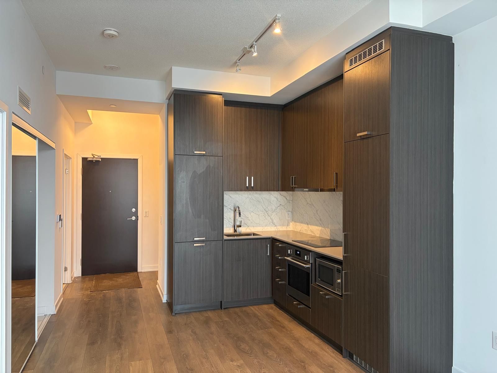 Modern 1-bedroom plus den condo in the Mobilio South Tower, offering a bright and functional open-concept layout with 10-foot ceilings, laminate flooring throughout, and large windows for plenty of natural light. The versatile den is ideal for a home office or extra living space. The sleek kitchen features built-in stainless steel appliances, quartz countertops, and plenty of cabinet space. Enjoy east-facing unobstructed views from the open balcony. Residents have access to premium amenities including a fitness centre, theatre, party room, guest suites, lounge, and BBQ terrace. Located steps from the Vaughan Metropolitan Centre subway and transit hub, offering excellent convenience for professionals and York University students, with quick access to major highways, shopping, and dining.