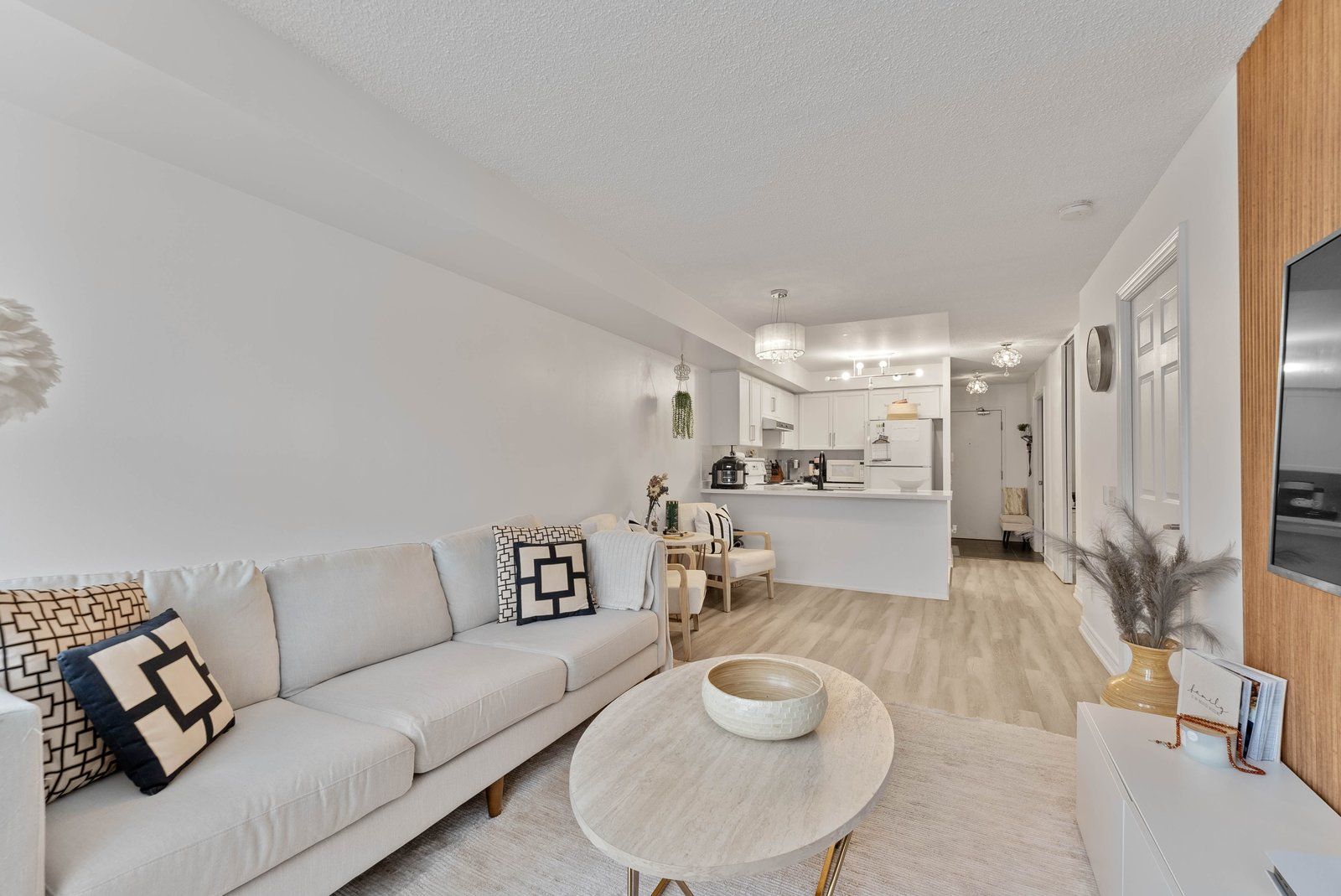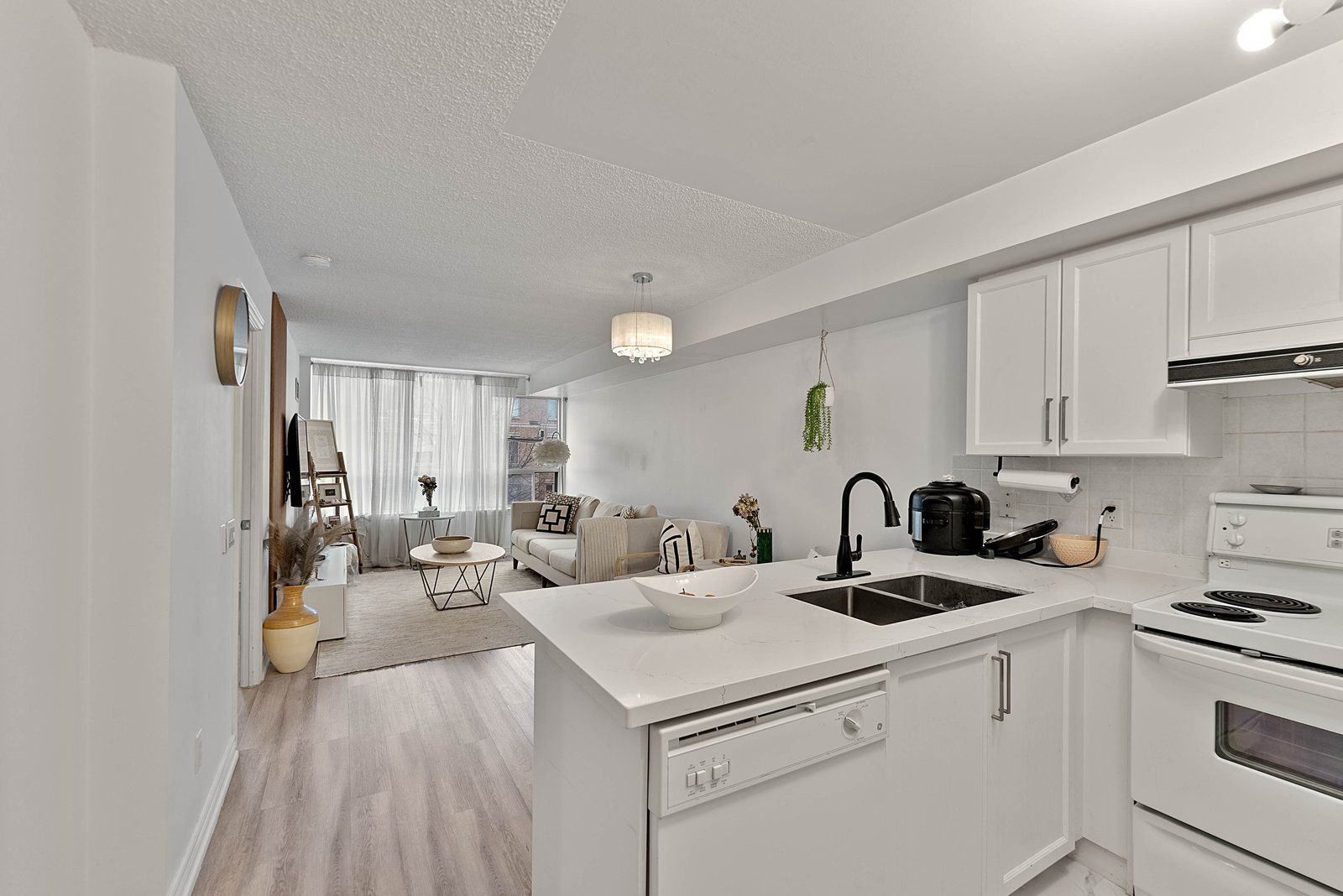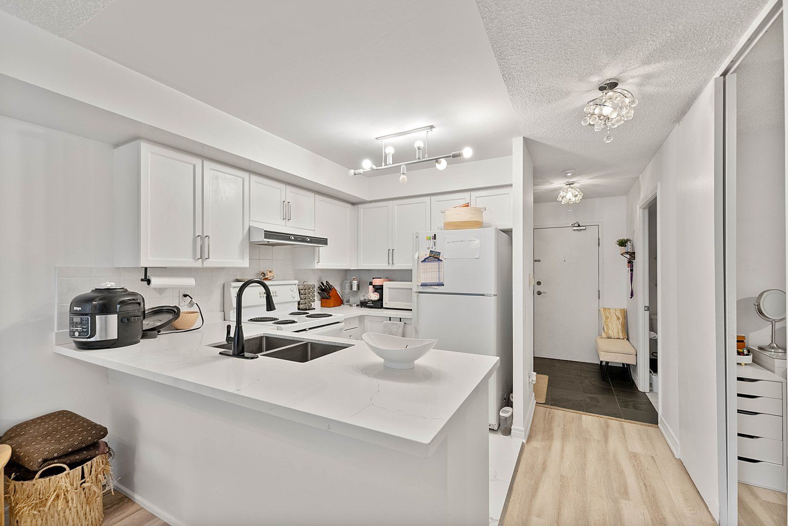 Bright & spacious 1 Bed + Den, offering approximately 740 sq ft of functional living space. This well-designed layout features two full washrooms and a separate den with ventilation, ideal for a home office, guest room, or potential second sleeping area. Enjoy a quiet treetop view that provides natural light, added privacy and plenty of visitor parking for your guests. Maintenance fee that includes all utilities - heat, hydro, water, offering excellent value and predictable monthly expenses. Conveniently situated steps to shops, restaurants, parks, transit, and everyday amenities, with easy access to major highways and surrounding areas. Ideal for first-time buyers, downsizers, or investors seeking space, convenience, and exceptional value in a prime location.