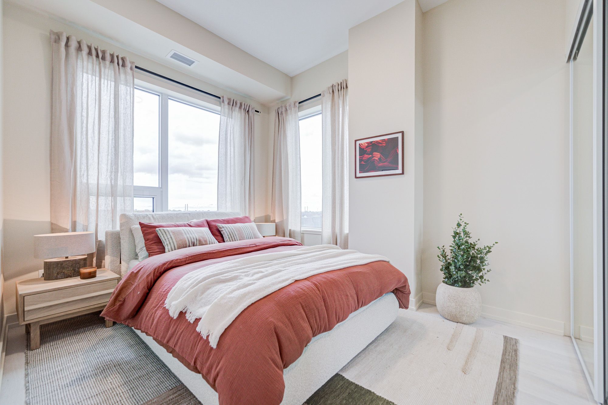 Experience contemporary luxury in this spacious 3-bedroom corner suite (1,016 sq. ft.) at The Saw Whet Condos, a boutique six-storey mid-rise community by Caivan Communities, ideally located in Oakville's prestigious Glen Abbey neighbourhood. With 9-ft ceilings, expansive windows, and a sun-filled open-concept layout, this corner suite offers both style and comfort in equal measure. The gourmet kitchen features quartz countertops, stainless-steel appliances, and smart-home technology, including keyless entry. Three generously sized bedrooms provide flexibility for families, professionals, or those seeking a dedicated home office. Enjoy your morning coffee or unwind in the evening on the private balcony, surrounded by the tranquility of Glen Abbey's natural setting. Residents enjoy exceptional amenities including a fitness and yoga studio, co-working lounge, pet spa, rooftop terrace with BBQ area, electric car-share, and elegant party room. Ideally located minutes from Bronte Village, Glen Abbey Golf Course, Oakville Trafalgar Hospital, top-rated schools, parks, and shopping, with easy access to QEW, 403, 407, and Bronte GO Station. Professionally designed and furnished by ACDO interior design. Furniture included in purchase price.