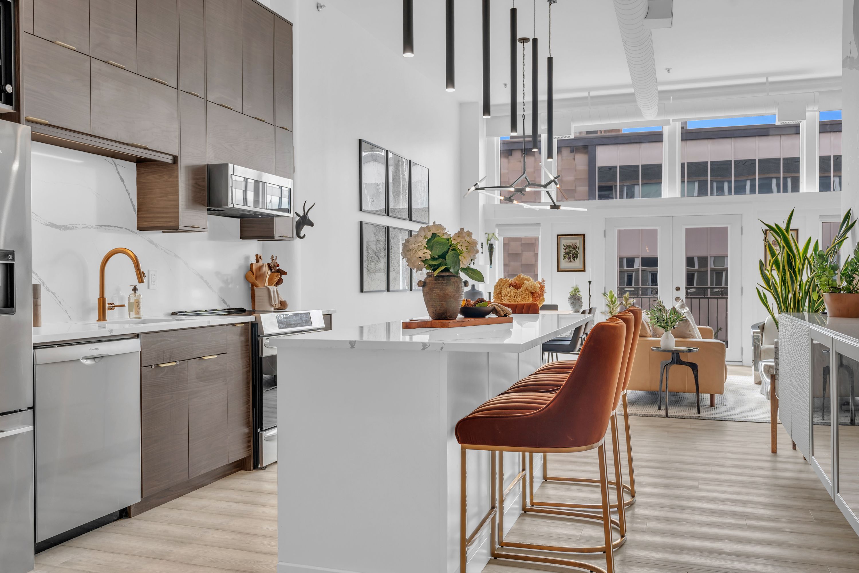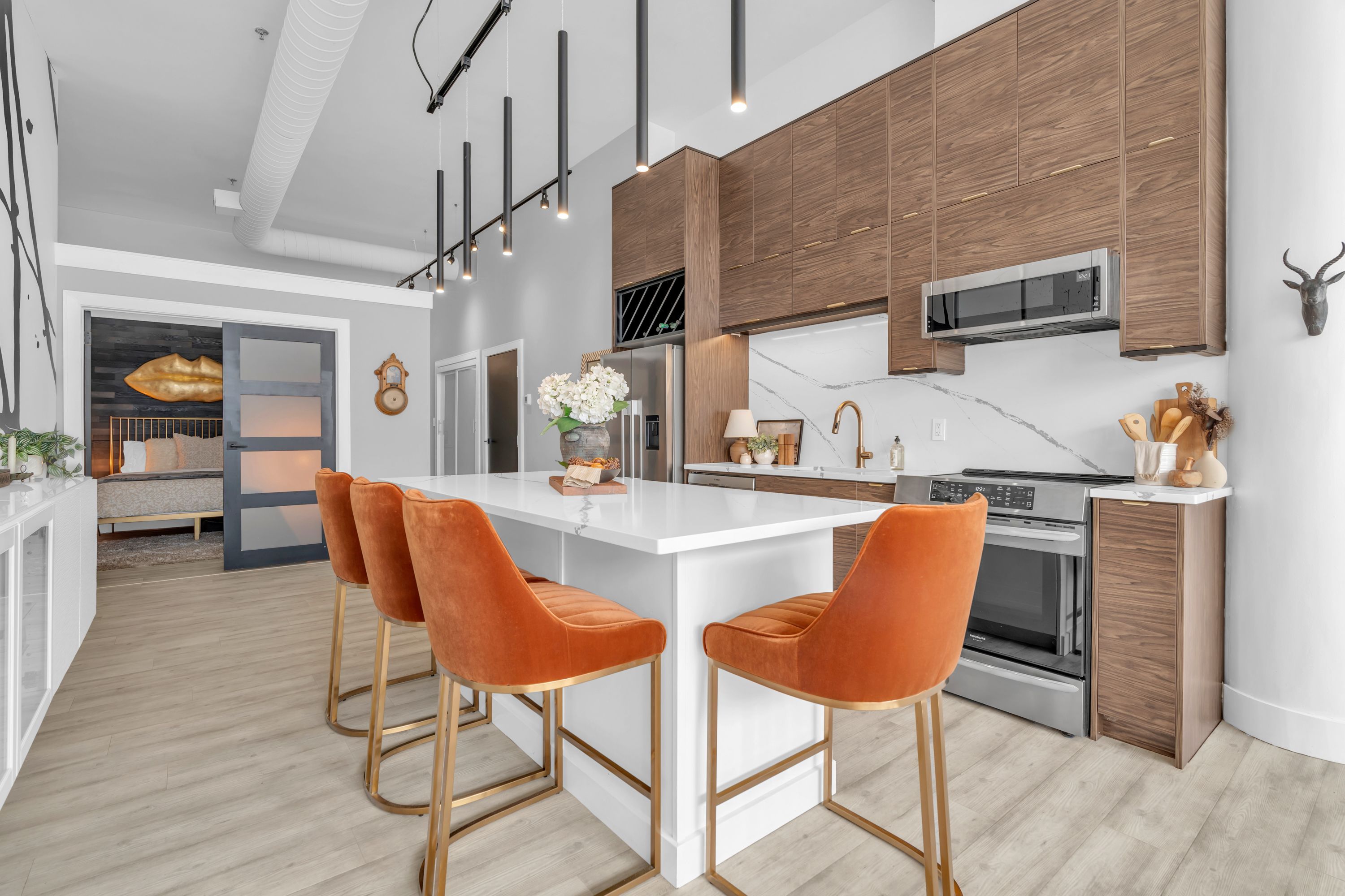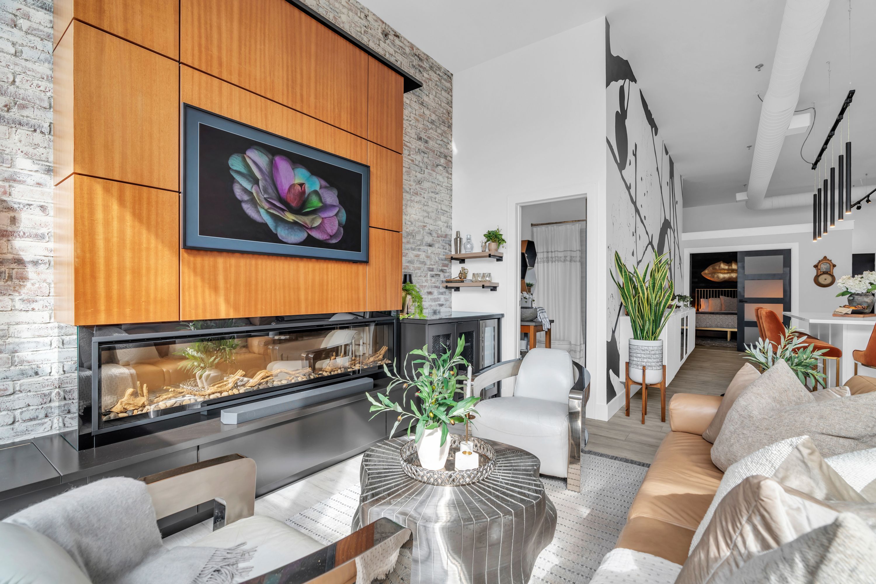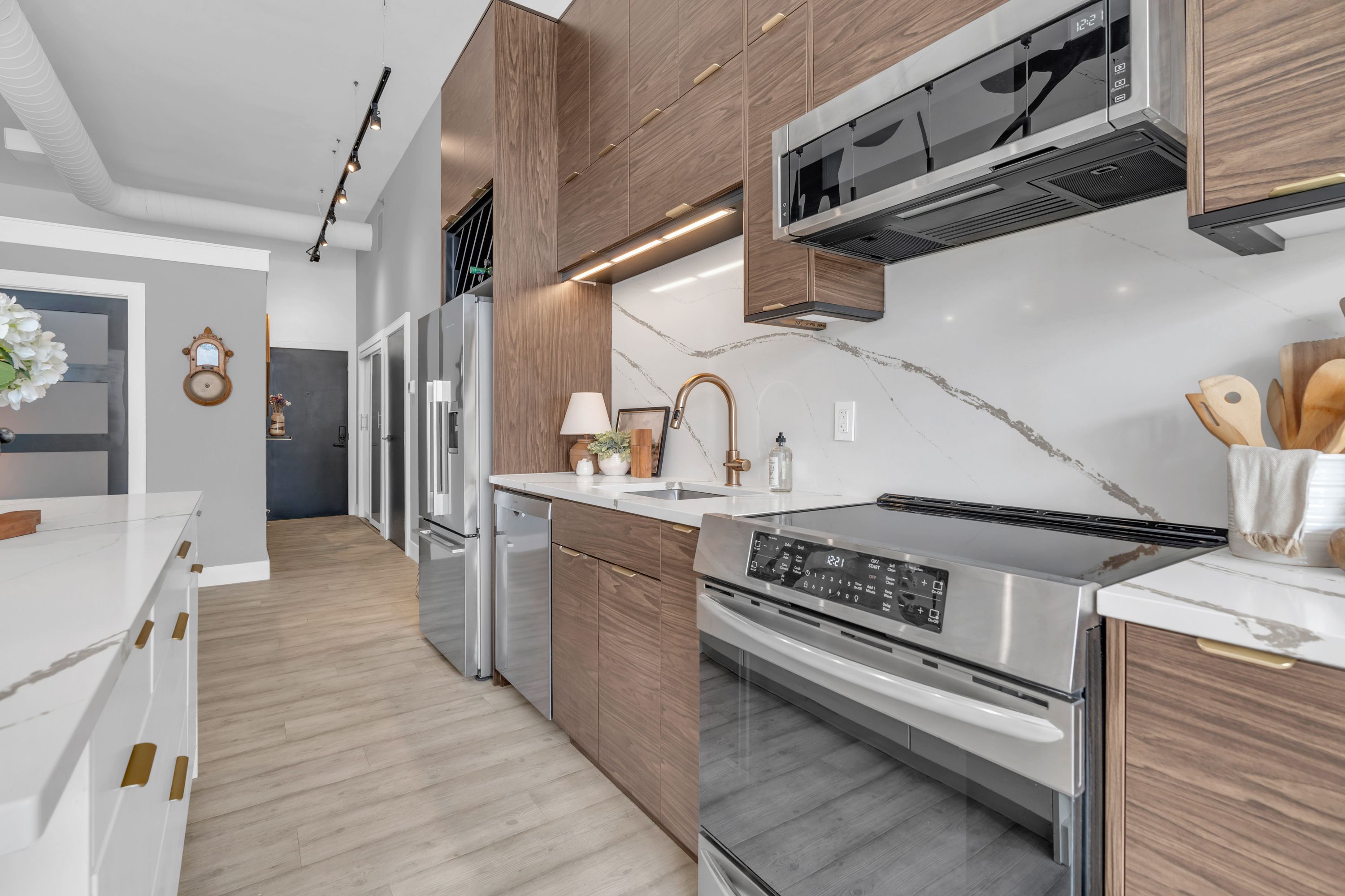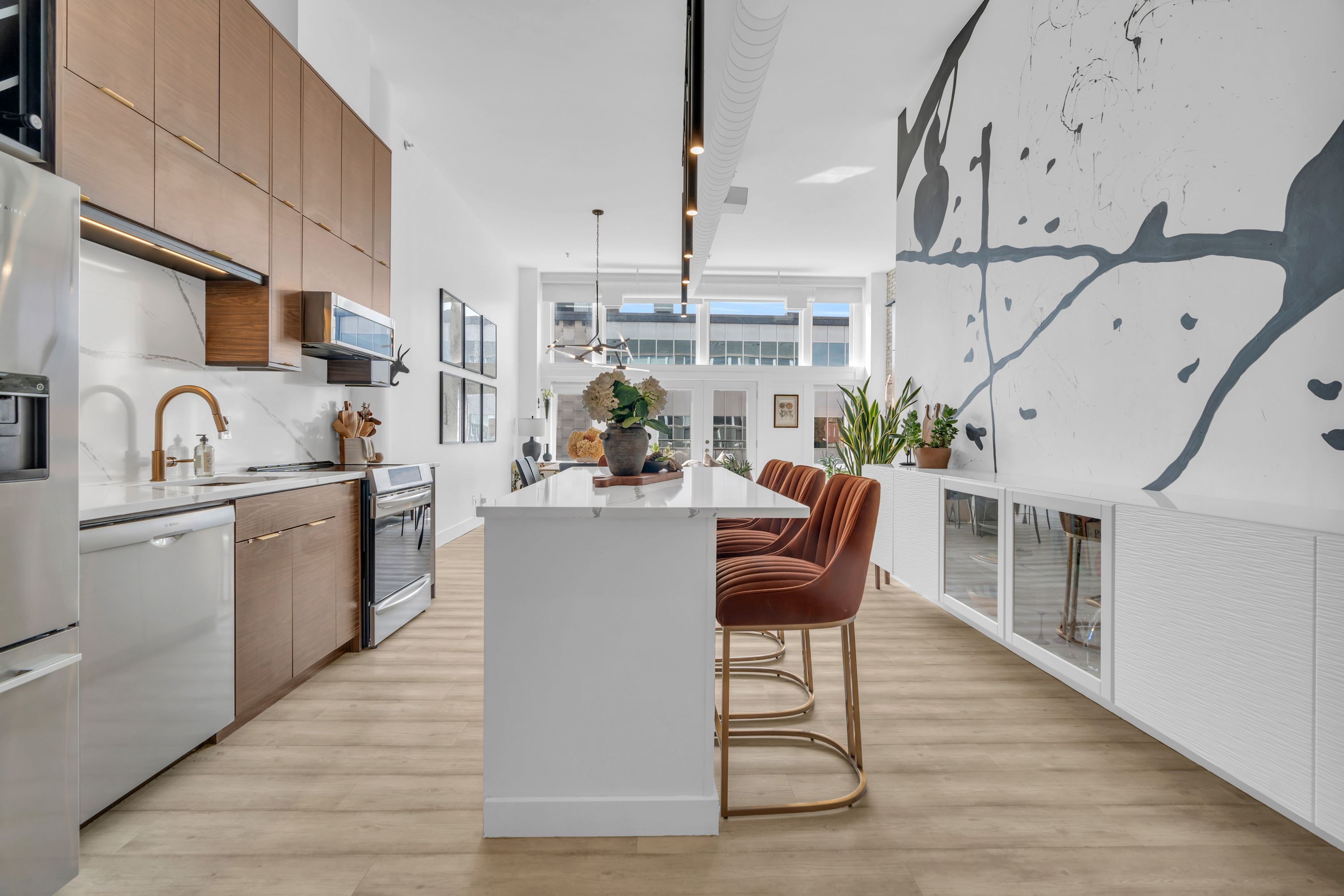 One-of-a-Kind Loft in the Heart of Downtown Kitchener. Welcome to Unit 205 at The Lofts at 276, a stunning, modern, 1-bedroom, 2-bathroom suite that seamlessly blends industrial charm with luxurious finishes. This exceptional, one-of-a-kind space, offers soaring 12-foot ceilings, floor-to-ceiling windows, and garden doors that flood the open-concept living and dining area with natural light. Every detail has been thoughtfully curated, from the wide plank vinyl flooring to the custom design elements throughout. The gourmet kitchen is a chefs dream, featuring rich dark wood cabinetry, veined quartz countertops and backsplash, an oversized island with breakfast bar, custom wine rack, statement lighting and an eye-catching feature wall with built-in buffet. The expansive living area is perfect for both entertaining and relaxing, anchored by a custom fireplace surround with integrated dry bar, wine fridge, and complemented by a warm brick accent wall that adds character and texture. Elegant garden doors open to a Juliette balcony, adding a touch of European charm. The dining space comfortably accommodates family gatherings, offering the perfect setting for special occasions.The main bathroom offers a stylish vanity with a stone vessel sink and a tub with textured tile surround. Additional features include in-suite laundry, underground parking, and an oversized storage locker located just steps from your vehicle. Retreat to the primary suite through double doors to find a wood accent wall, sliding closet barn doors, a custom closet organizer, and a private ensuite. The spa-inspired bathroom includes a walk-in shower with striking black-framed glass doors, wood-look tile, and a generous niche with accent details. Set in a beautifully converted loft building with modern lobby, this home places you in the heart of vibrant Downtown Kitchener just steps from cafés, restaurants, transit, schools, entertainment, and Victoria Park. Urban luxury and everyday convenience await.