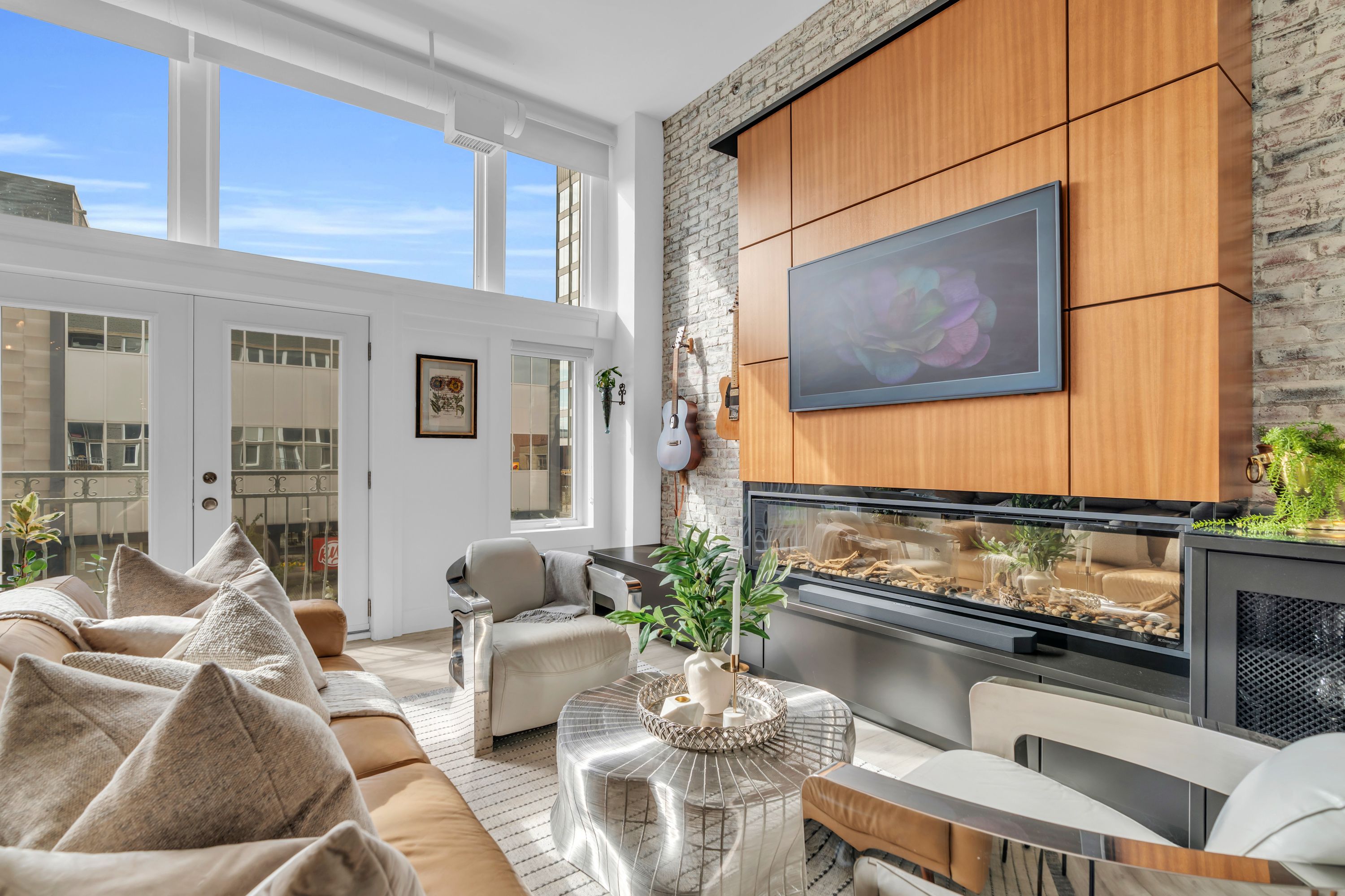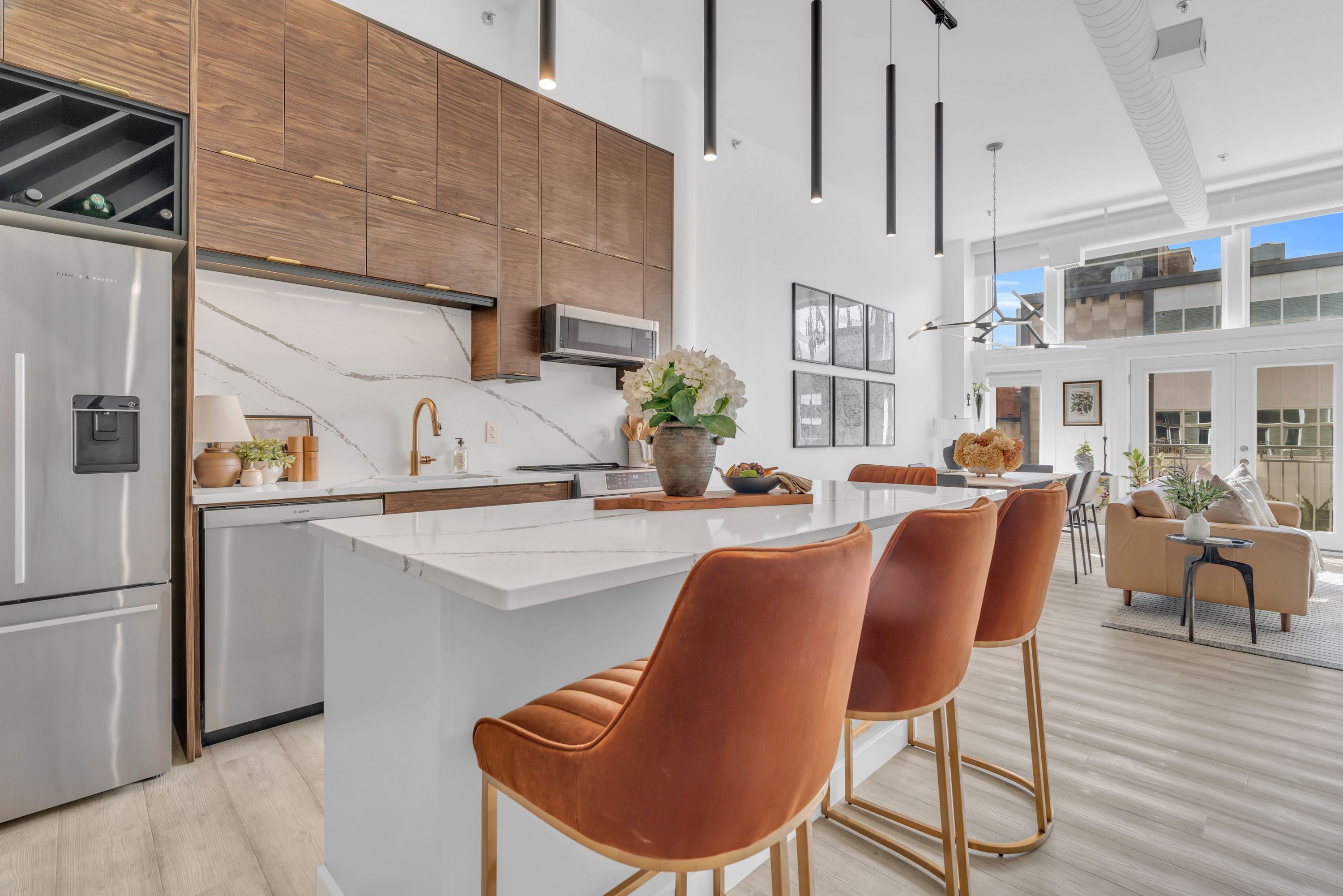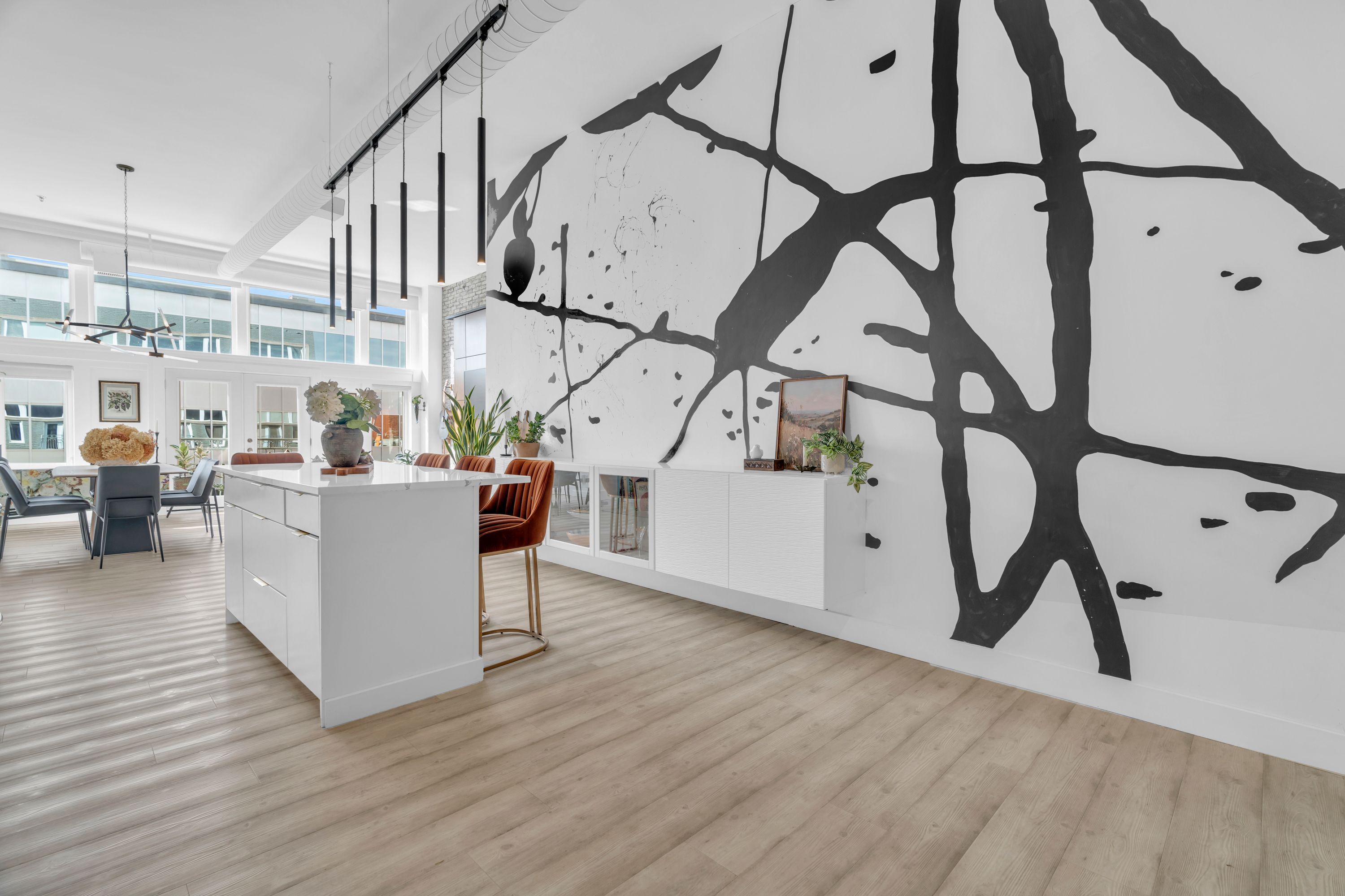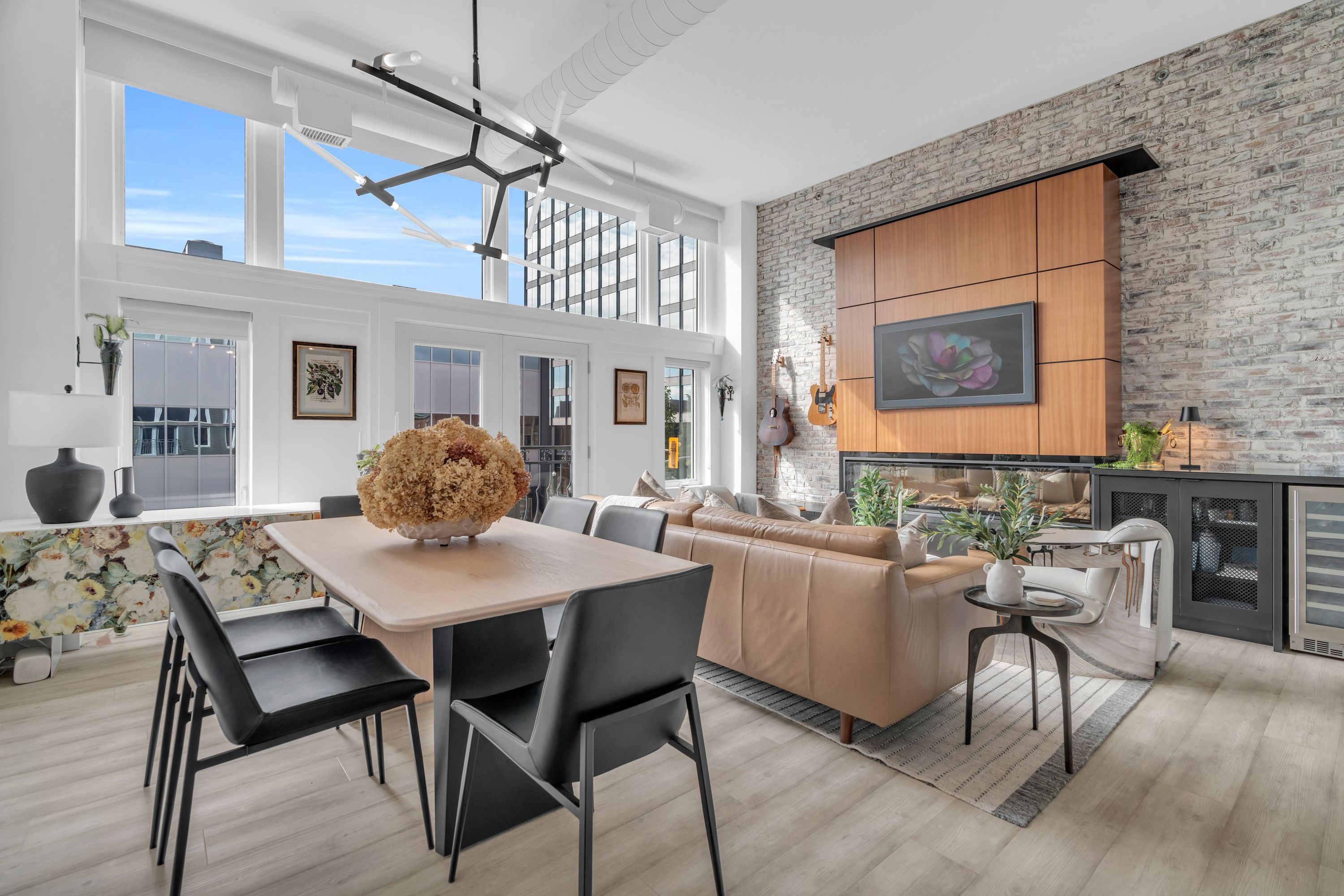 One-of-a-Kind Loft in the Heart of Downtown Kitchener. Welcome to Unit 205 at The Lofts at 276, a stunning, modern, 1-bedroom, 2-bathroom suite that seamlessly blends industrial charm with luxurious finishes. This exceptional, one-of-a-kind space, offers soaring 12-foot ceilings, floor-to-ceiling windows, and garden doors that flood the open-concept living and dining area with natural light. Every detail has been thoughtfully curated, from the wide plank vinyl flooring to the custom design elements throughout. The gourmet kitchen is a chefs dream, featuring rich dark wood cabinetry, veined quartz countertops and backsplash, an oversized island with breakfast bar, custom wine rack, statement lighting and an eye-catching feature wall with built-in buffet. The expansive living area is perfect for both entertaining and relaxing, anchored by a custom fireplace surround with integrated dry bar, wine fridge, and complemented by a warm brick accent wall that adds character and texture. Elegant garden doors open to a Juliette balcony, adding a touch of European charm. The dining space comfortably accommodates family gatherings, offering the perfect setting for special occasions.The main bathroom offers a stylish vanity with a stone vessel sink and a tub with textured tile surround. Additional features include in-suite laundry, underground parking, and an oversized storage locker located just steps from your vehicle. Retreat to the primary suite through double doors to find a wood accent wall, sliding closet barn doors, a custom closet organizer, and a private ensuite. The spa-inspired bathroom includes a walk-in shower with striking black-framed glass doors, wood-look tile, and a generous niche with accent details. Set in a beautifully converted loft building with modern lobby, this home places you in the heart of vibrant Downtown Kitchener just steps from cafés, restaurants, transit, schools, entertainment, and Victoria Park. Urban luxury and everyday convenience await.