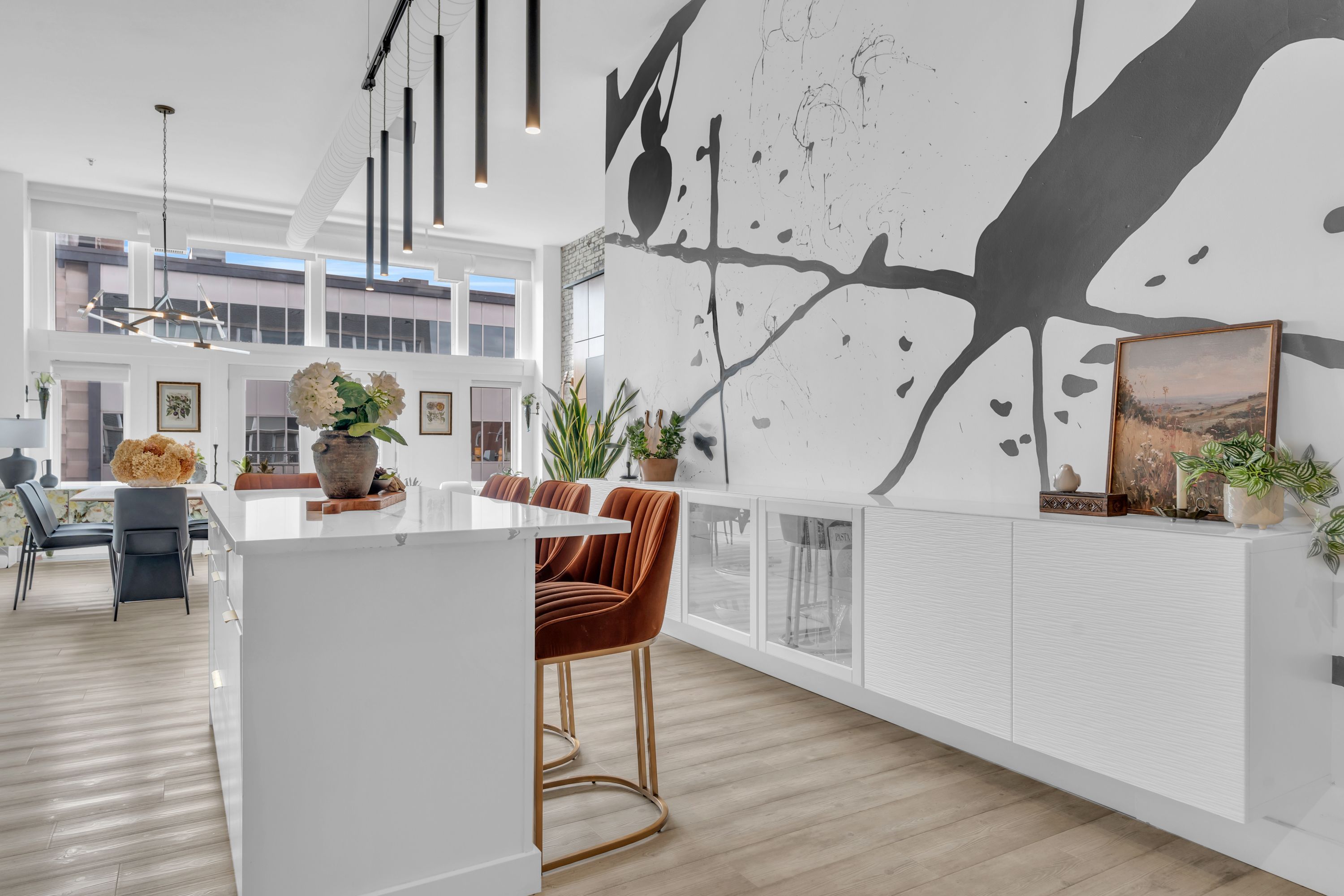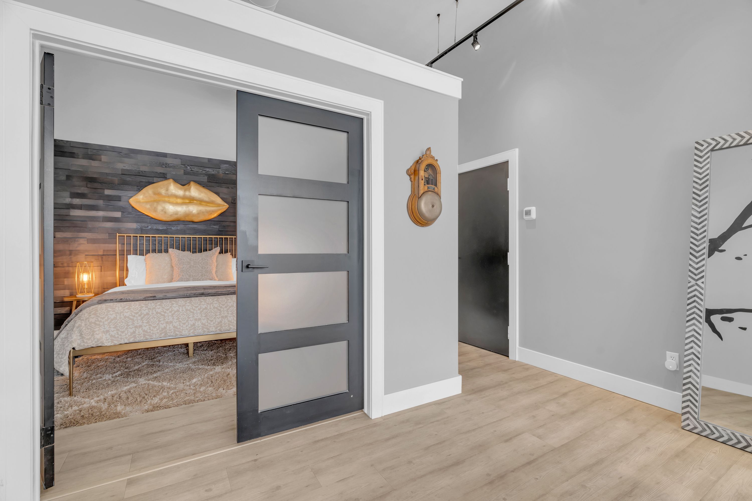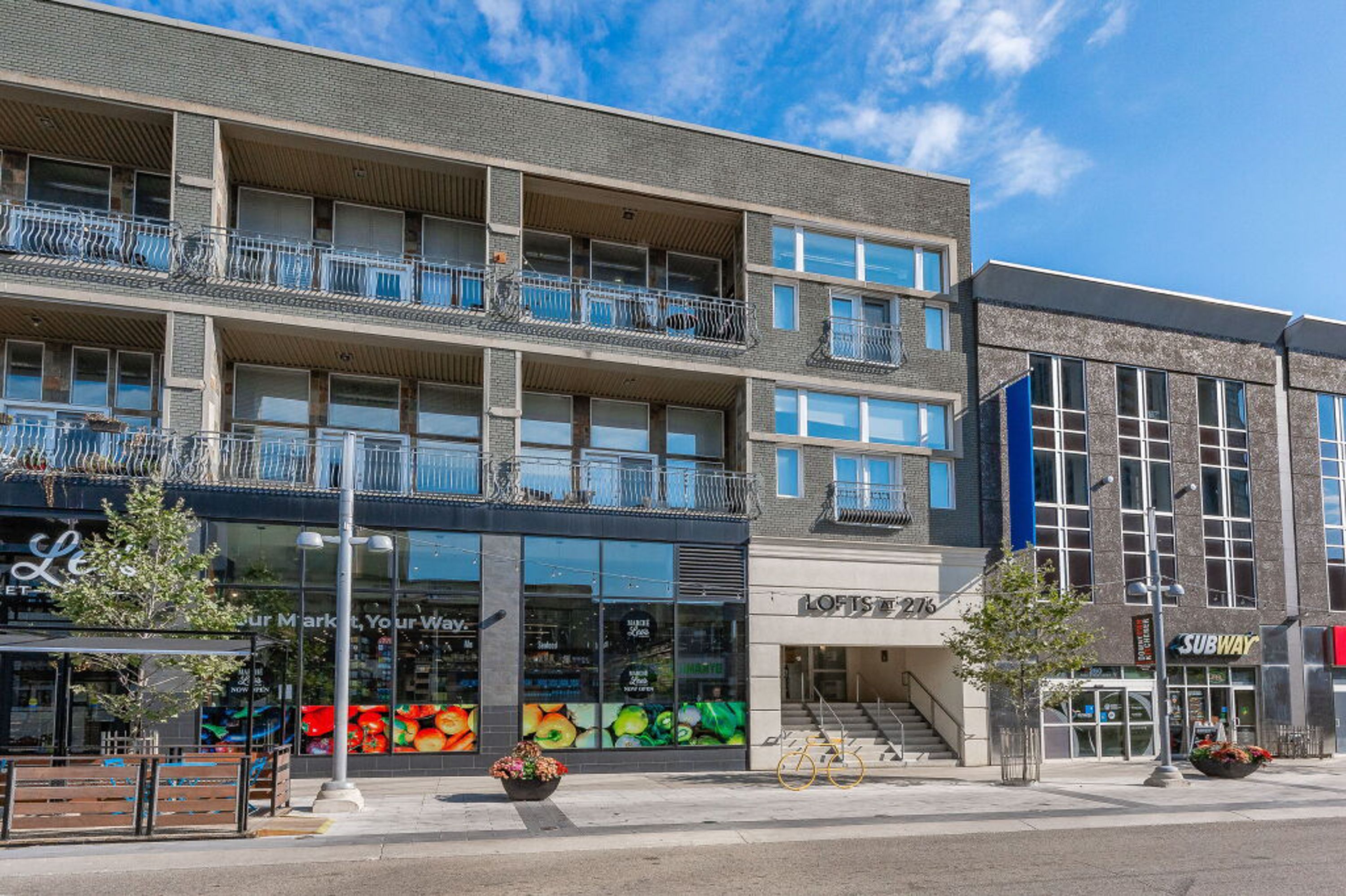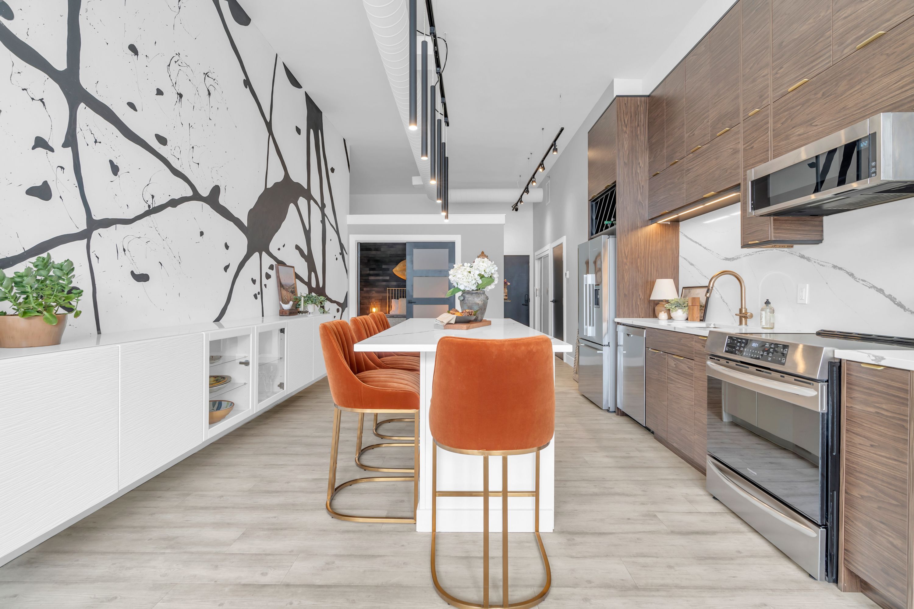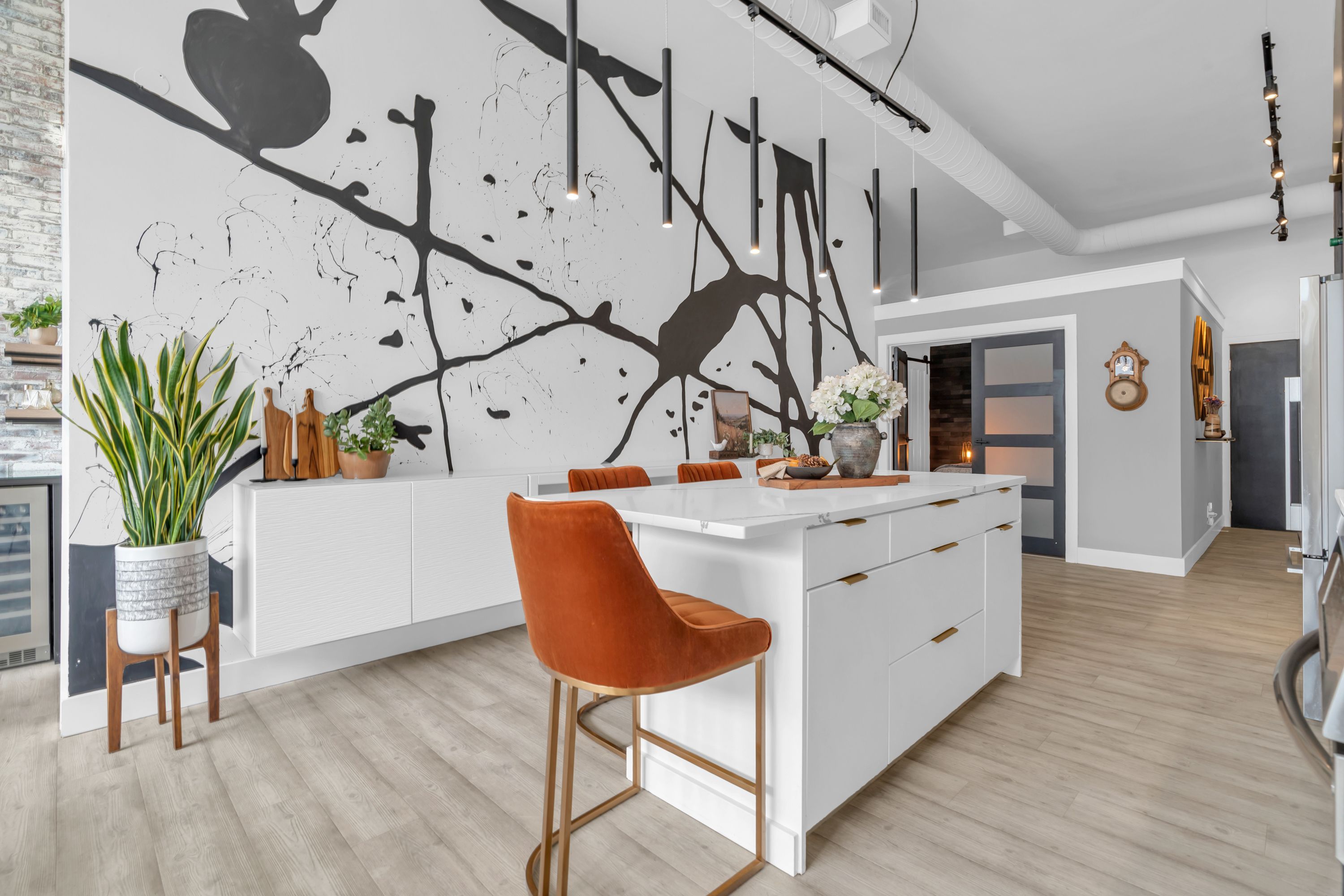One-of-a-Kind Loft in the Heart of Downtown Kitchener. Welcome to Unit 205 at The Lofts at 276, a stunning, modern, 1-bedroom, 2-bathroom suite that seamlessly blends industrial charm with luxurious finishes. This exceptional, one-of-a-kind space, offers soaring 12-foot ceilings, floor-to-ceiling windows, and garden doors that flood the open-concept living and dining area with natural light. Every detail has been thoughtfully curated, from the wide plank vinyl flooring to the custom design elements throughout. The gourmet kitchen is a chefs dream, featuring rich dark wood cabinetry, veined quartz countertops and backsplash, an oversized island with breakfast bar, custom wine rack, statement lighting and an eye-catching feature wall with built-in buffet. The expansive living area is perfect for both entertaining and relaxing, anchored by a custom fireplace surround with integrated dry bar, wine fridge, and complemented by a warm brick accent wall that adds character and texture. Elegant garden doors open to a Juliette balcony, adding a touch of European charm. The dining space comfortably accommodates family gatherings, offering the perfect setting for special occasions.The main bathroom offers a stylish vanity with a stone vessel sink and a tub with textured tile surround. Additional features include in-suite laundry, underground parking, and an oversized storage locker located just steps from your vehicle. Retreat to the primary suite through double doors to find a wood accent wall, sliding closet barn doors, a custom closet organizer, and a private ensuite. The spa-inspired bathroom includes a walk-in shower with striking black-framed glass doors, wood-look tile, and a generous niche with accent details. Set in a beautifully converted loft building with modern lobby, this home places you in the heart of vibrant Downtown Kitchener just steps from cafés, restaurants, transit, schools, entertainment, and Victoria Park. Urban luxury and everyday convenience await.