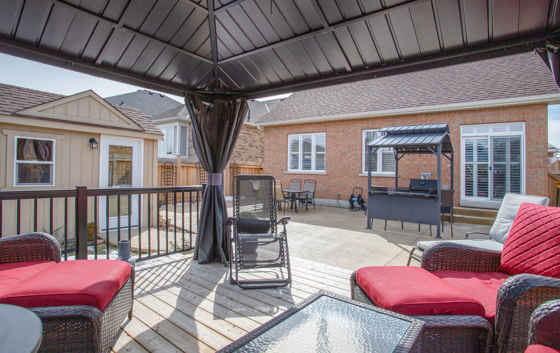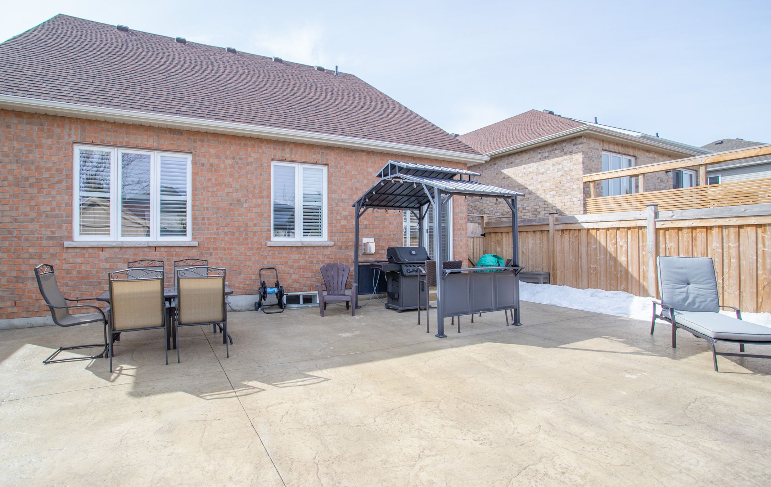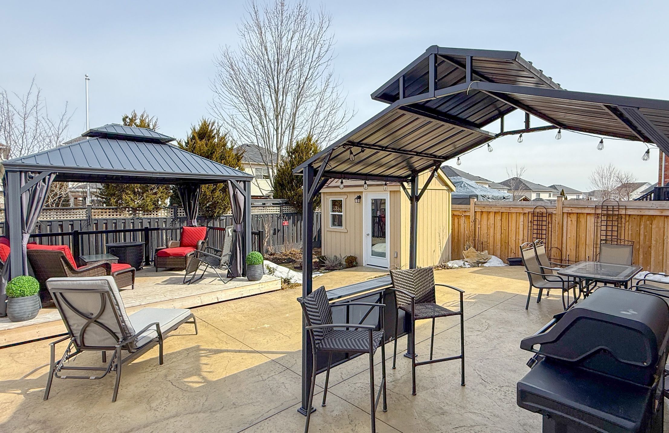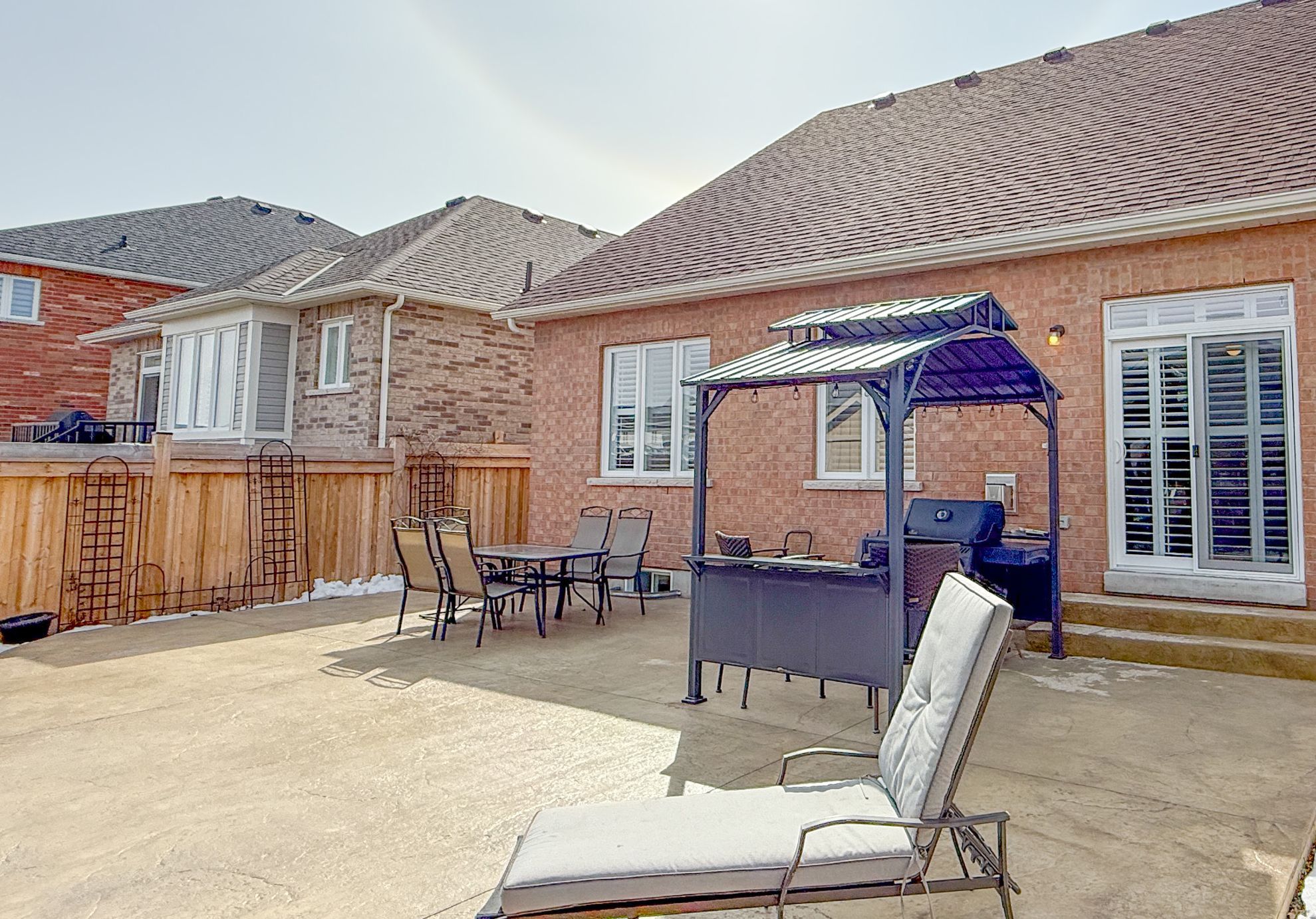Beautiful 3 bedroom Bungaloft in Ashgrove Meadows Chatham Module 1649 sq ft featuring an exceptional main floor primary bedroom with vaulted ceiling, walk in closet, 4 piece bath with sunken spa tub and separate glass shower. Many upgrades were added to this home. Loft area features 2 bedrooms with a separate 4 piece bathroom. Custom shutters thru-out. Main floor features 9ft ceilings with pot lights in the main areas. Kitchen has breakfast bar area with ceramic backsplash, overlooking dining or formal eating area. Gas fireplace in living room or great room with walk out to custom stamped concrete patio complete with deck, gazebo as well as BBQ gazebo and natural gas hook up for BBQ. The 8X10 garden shed has stamped concrete floor, complete with electricity and green house door. Property has Gemstone blue tooth lighting at the front, poured concrete walk way and 2 gates for easy access to landscaped backyard. Mature trees at back of property for privacy. Basement is partially finished with built in bar area, suspended ceilings for easy access to exterior water tap, and pipes. Office could be separated by a door to make 2 finished rooms. Large unfinished area in basement creates excellent storage. Large 404 sq ft 2 car garage has access from garage to Main floor Laundry with built in cabinets, and ceramic flooring. This home is within walking distance to parks, schools, and downtown Port Perry. Go transit and Durham transit easily accessible. Golf course in the area and excellent biking paths.