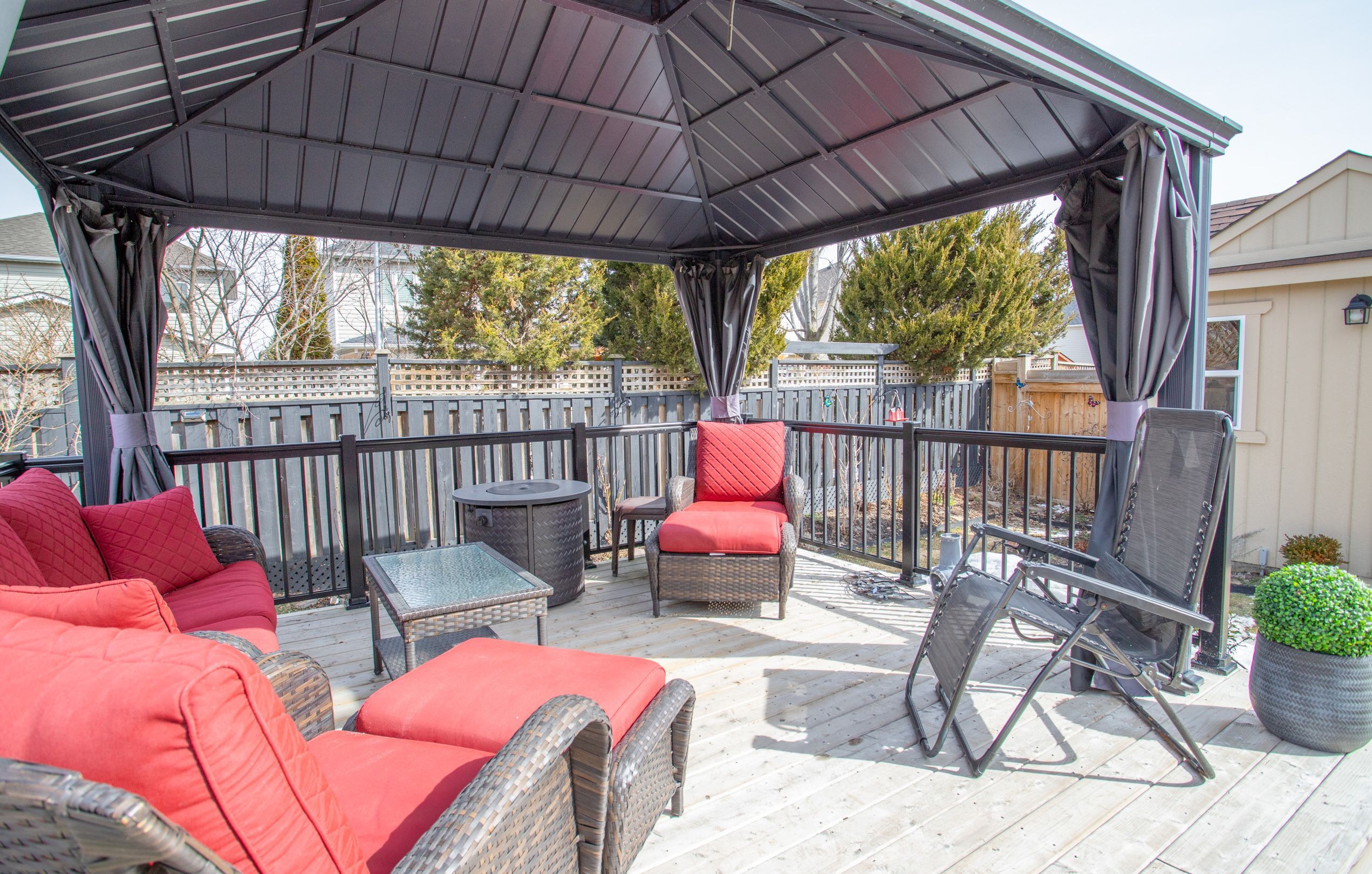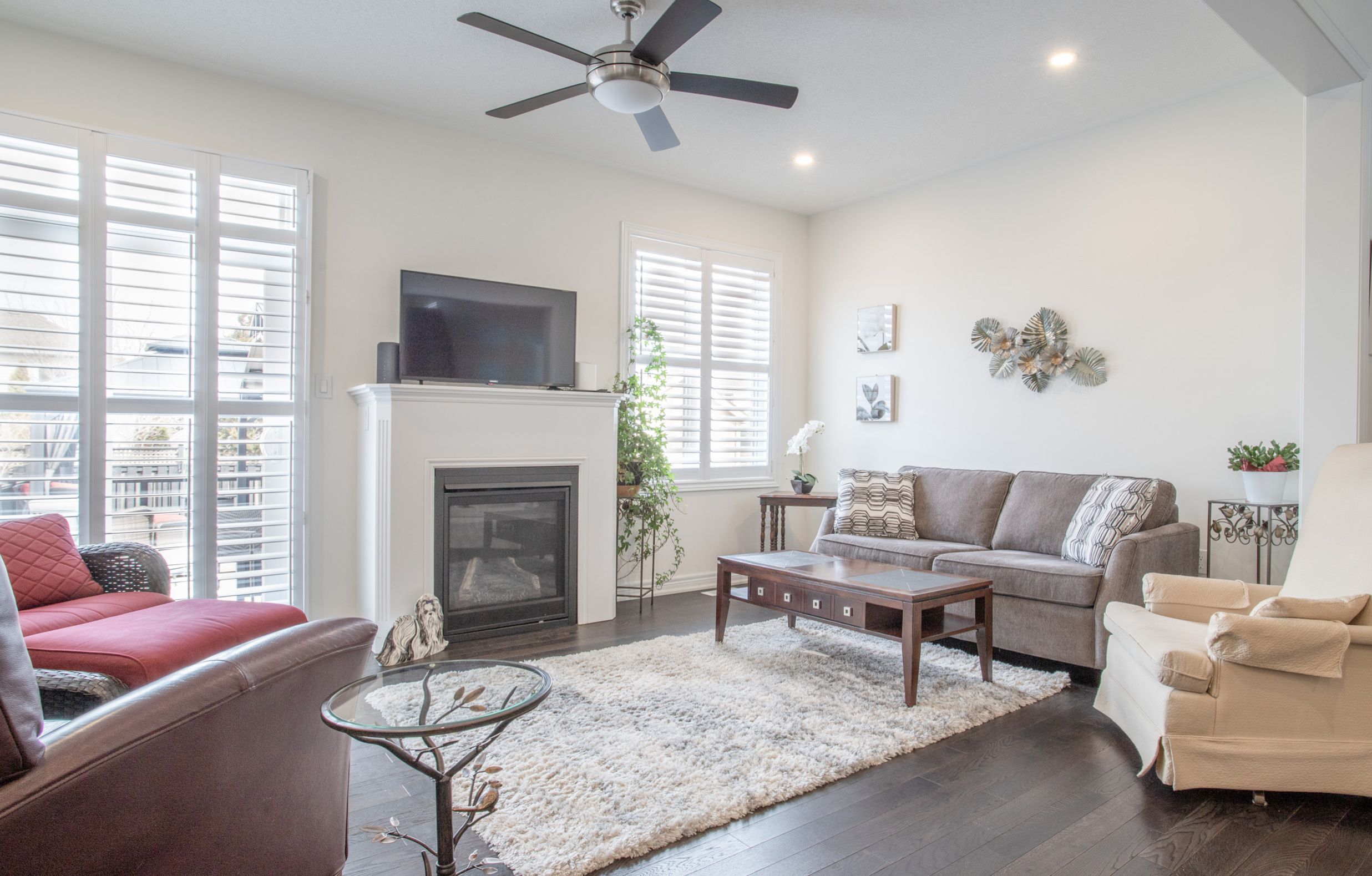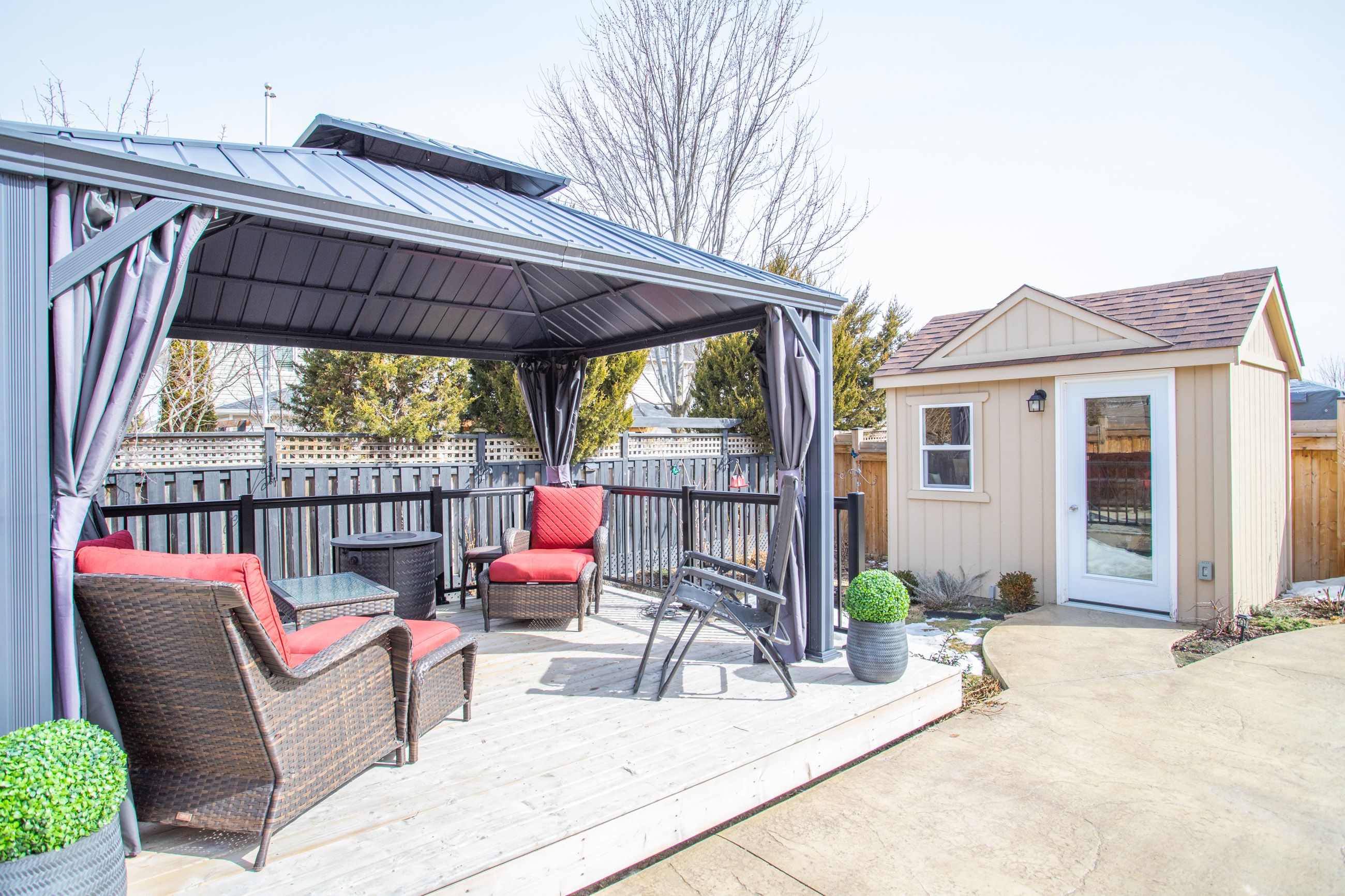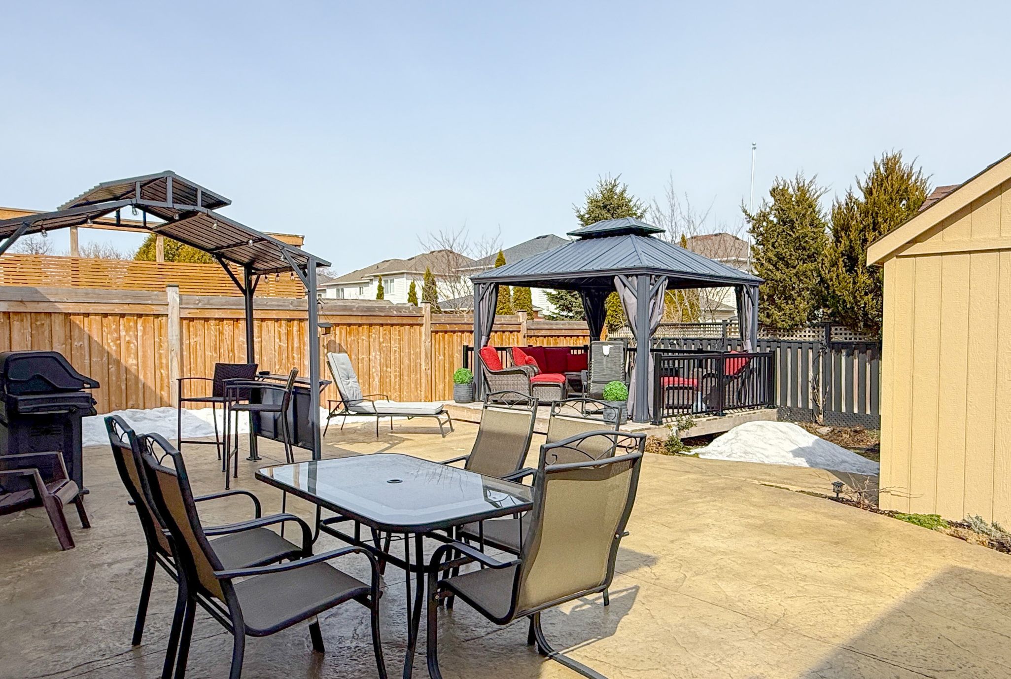 Beautiful 3 bedroom Bungaloft in Ashgrove Meadows Chatham Module 1649 sq ft featuring an exceptional main floor primary bedroom with vaulted ceiling, walk in closet, 4 piece bath with sunken spa tub and separate glass shower. Many upgrades were added to this home. Loft area features 2 bedrooms with a separate 4 piece bathroom. Custom shutters thru-out. Main floor features 9ft ceilings with pot lights in the main areas. Kitchen has breakfast bar area with ceramic backsplash, overlooking dining or formal eating area. Gas fireplace in living room or great room with walk out to custom stamped concrete patio complete with deck, gazebo as well as BBQ gazebo and natural gas hook up for BBQ. The 8X10 garden shed has stamped concrete floor, complete with electricity and green house door. Property has Gemstone blue tooth lighting at the front, poured concrete walk way and 2 gates for easy access to landscaped backyard. Mature trees at back of property for privacy. Basement is partially finished with built in bar area, suspended ceilings for easy access to exterior water tap, and pipes. Office could be separated by a door to make 2 finished rooms. Large unfinished area in basement creates excellent storage. Large 404 sq ft 2 car garage has access from garage to Main floor Laundry with built in cabinets, and ceramic flooring. This home is within walking distance to parks, schools, and downtown Port Perry. Go transit and Durham transit easily accessible. Golf course in the area and excellent biking paths.