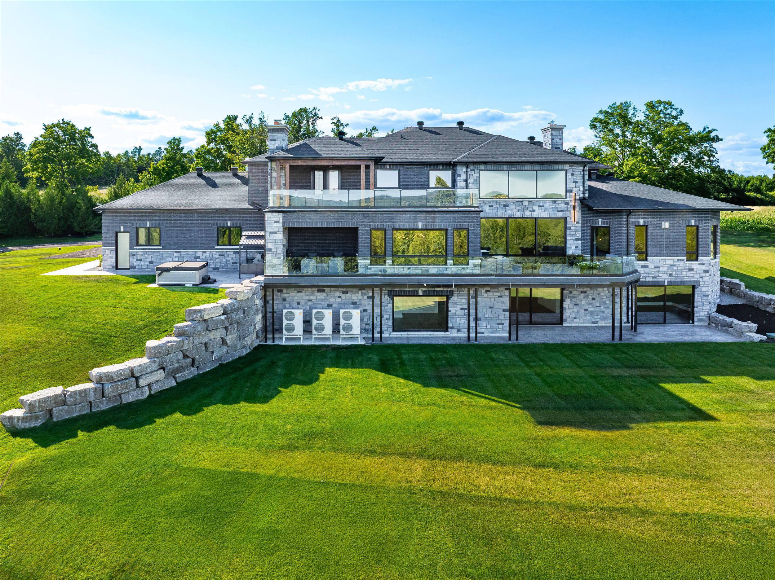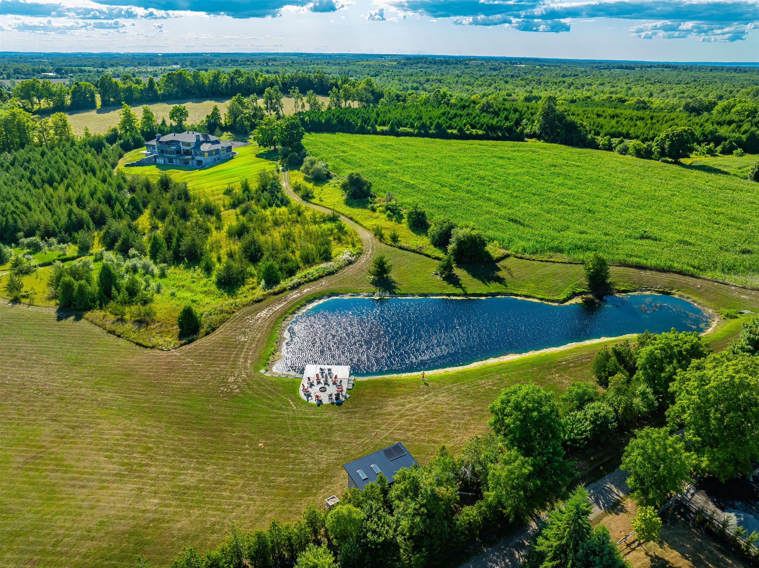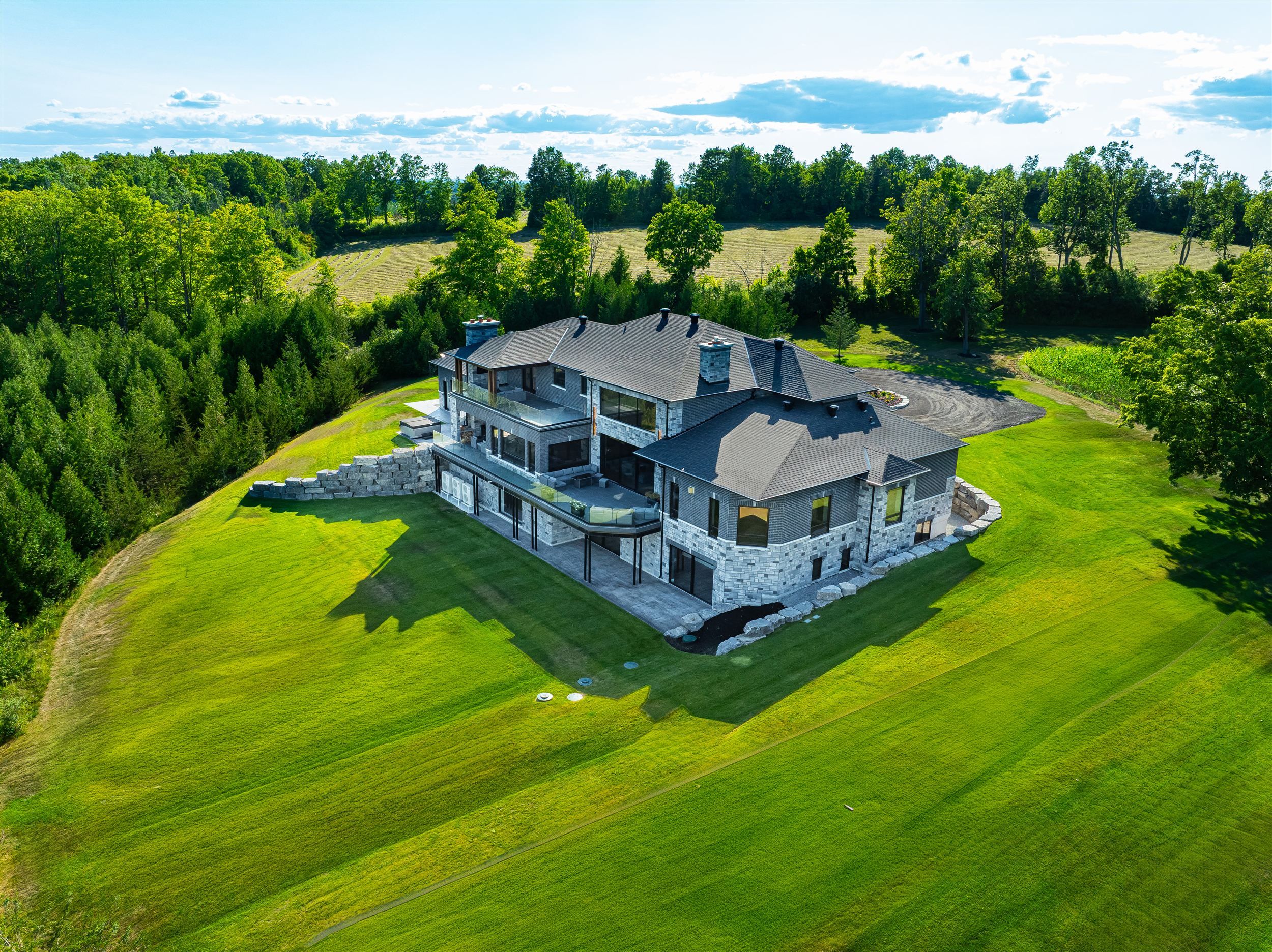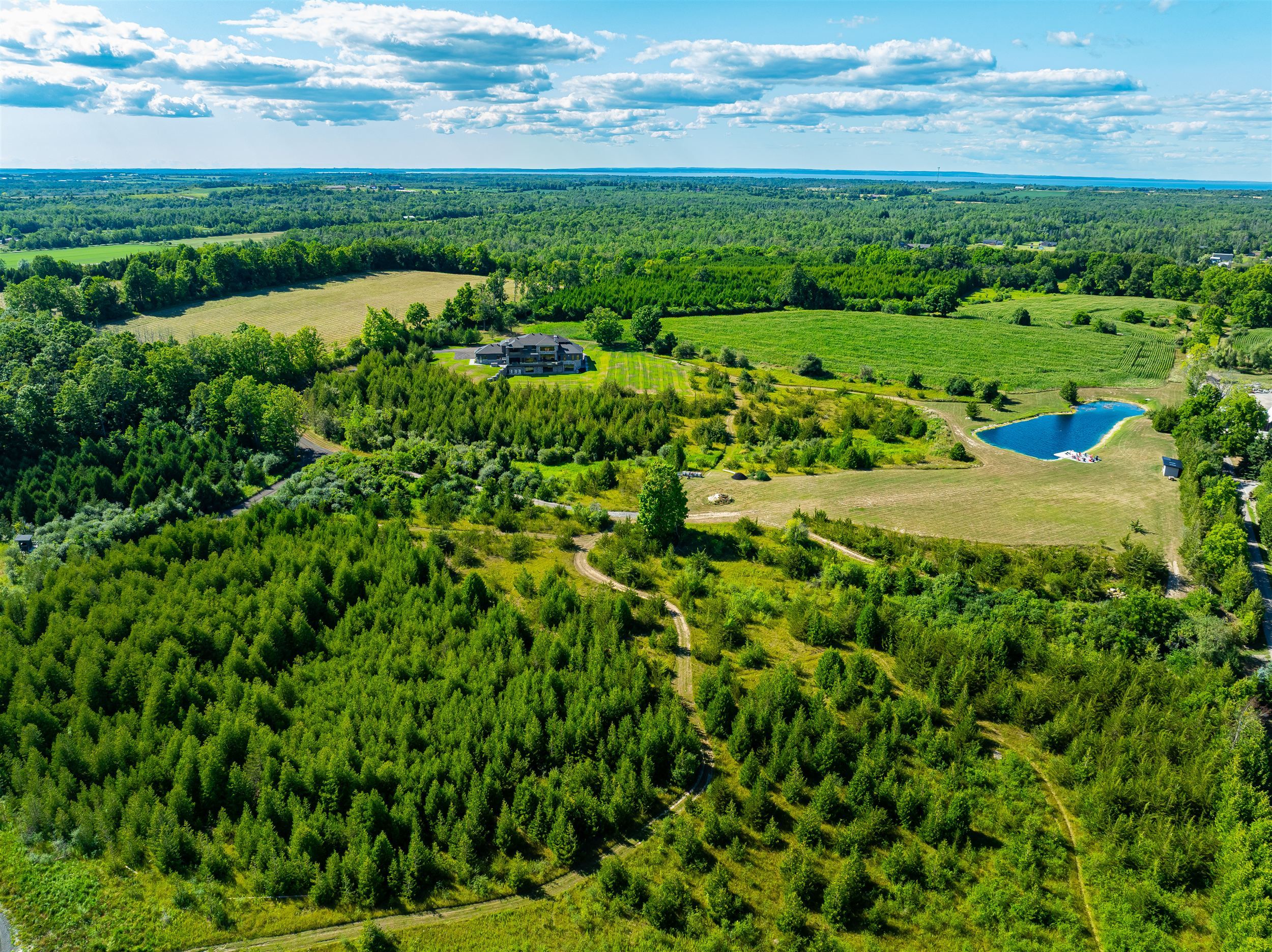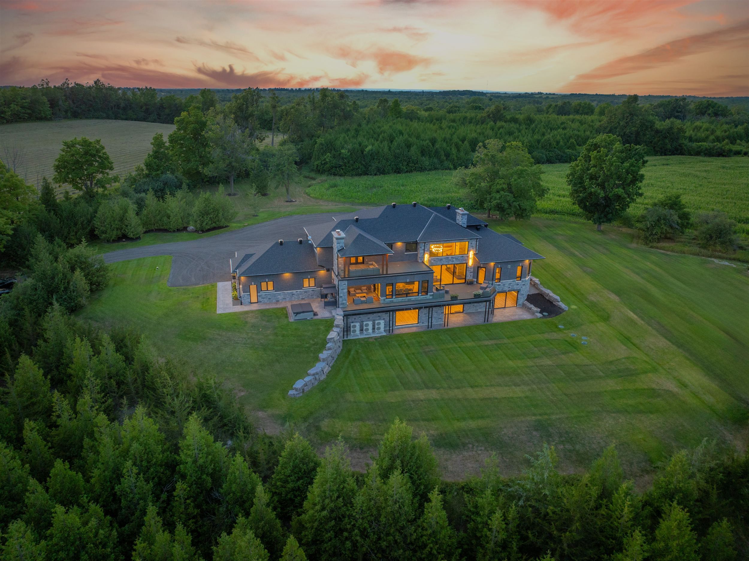 Welcome to this extraordinary custom-built luxury estate, a private hilltop retreat set on 36 acres of rolling countryside with breathtaking panoramic vistas. Offering 12,500 sq. ft. of exceptional living space, the home impresses from the moment you step inside. The great room boasts 20 ft soaring ceilings, a dramatic wood-burning fireplace, and a custom stone chimney. The gourmet chefs kitchen is a showpiece, featuring built-in Thermador appliances, an expansive gas range, beam ceilings, two oversized islands, and a seamless flow into the open-concept dining room, which walks out to a patio with an outdoor wood-burning fireplace. This rare property offers 8 spacious bedrooms, 8 bathrooms, including a main-floor primary suite with an indulgent 7-pc ensuite, heated floors, soaker tub, double rain shower, and a couples walk-through closet. Built with quality ICF construction, it showcases custom millwork and stonework throughout. Additional highlights include a 5-bay, 2500 sq. ft. attached garage w basement access, elevator, rough-in for a spa, large soundproof theatre room, and a rec room with walkout to the rear patio. The grounds blend natural beauty with functionality: mature trees, farmable acreage, landscaped gardens, and a private pond with dock, firepit, and a charming outbuilding. Completing the property is a fully operational 5,000 sq. ft. workshop with office space, and including a 4,000 sq. ft. in-law suite ideal for multigenerational living, a home-based business, or the passionate hobbyist. This is luxury living without compromise. Property Tax have not been assessed.