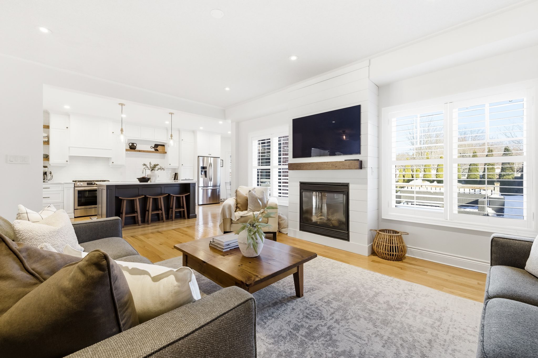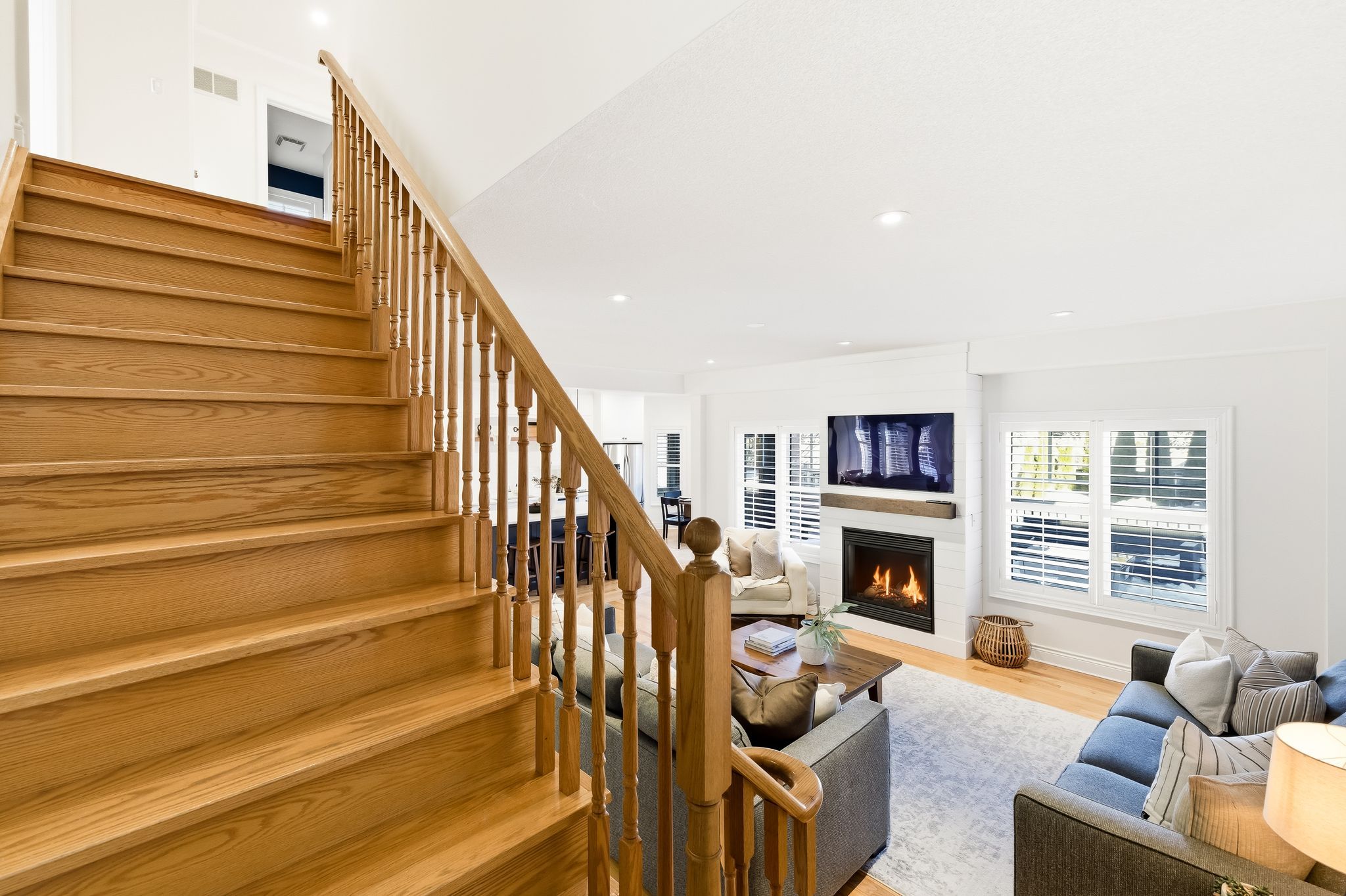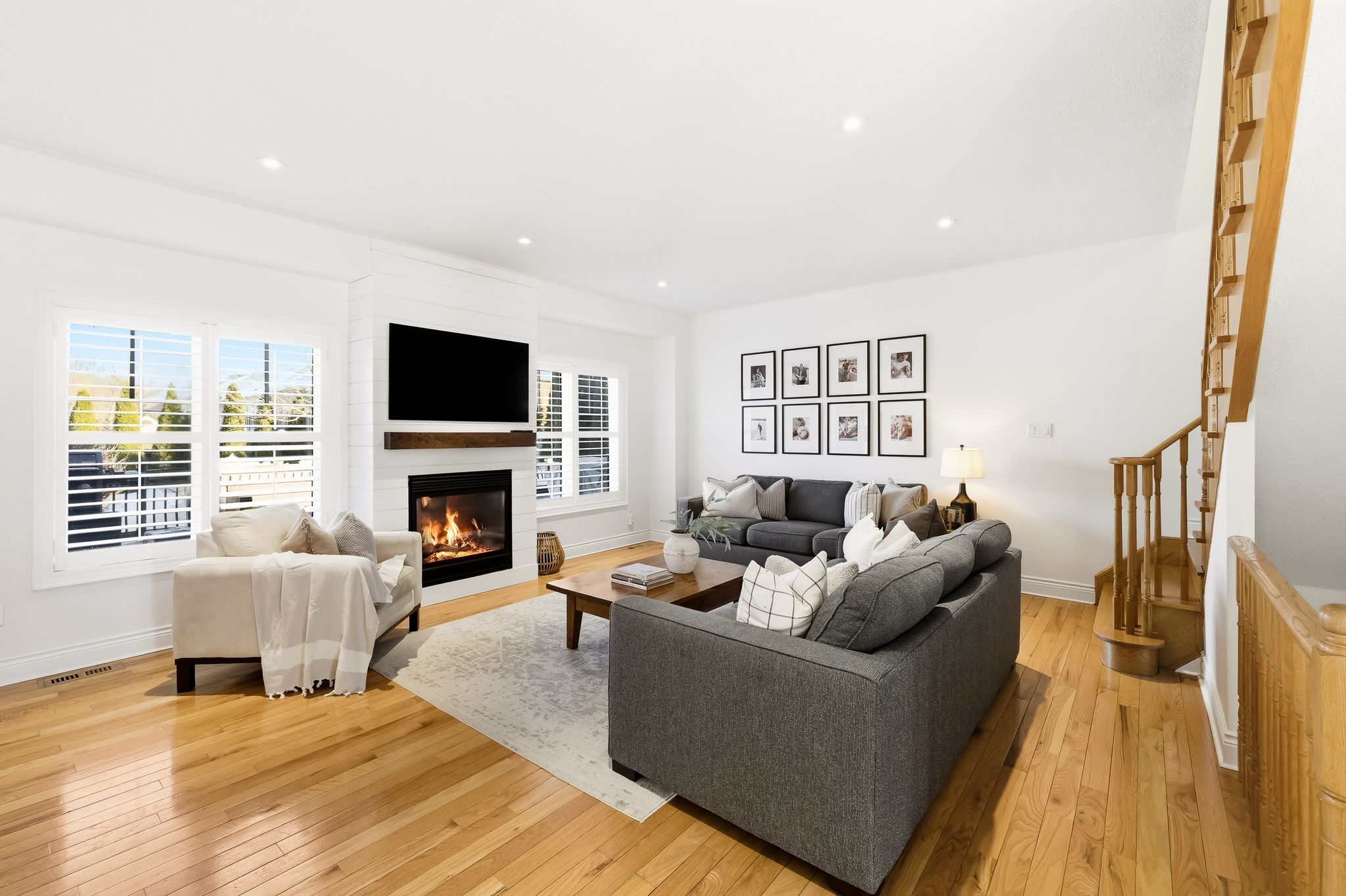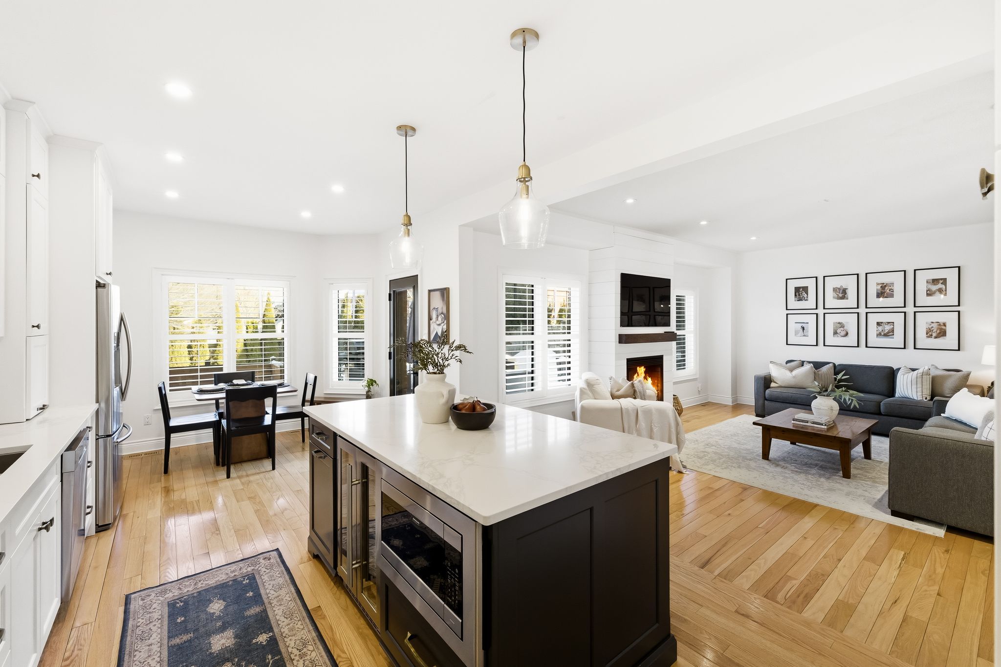Extentensively upgraded with high-end custom finishes throughout, this 2,285 sq ft home offers beautiful natural light with generous flow across all three levels, and is set on a private 50x119 ft lot. The main floor features 9-ft ceilings and a stunning open-concept kitchen with S/S appliances, quartz countertops, custom cabinetry, large centre island, beverage fridge, and eat-in area, seamlessly connected to a spacious living room. A shiplap feature wall with gas fireplace and built-in extendable TV creates a striking focal point, while new windows with California shutters flood the space with light. Main floor and basement lighting are upgraded with Lutron dimmers. A professionally upgraded 2-car garage, fully brick veneered and finished with reclaimed beams, T&G ceilings, pot lights, heater, and new high-lift garage doors, is a true standout. Every bathroom has been fully updated with elevated finishes. The upstairs main bath features herringbone floor tile, while the primary suite includes a shiplap feature wall with fireplace and TV, his/hers closets, and a renovated ensuite with penny tile flooring and glass walk-in shower. Second-floor laundry adds everyday convenience. The fully finished basement extends the living space with a dedicated lounge/TV area and a wet bar featuring quartz countertops with dishwasher and fridge. A fourth bathroom adds convenience for guests or gatherings. Fully fenced backyard positioned for privacy, with no direct rear-facing neighbours. Significant exterior investments include a new roof (21), all new windows and doors (20), automated landscape sprinklers, and three raised garden boxes. The front landscaping is professionally finished with substantial armour stone steps and strong curb appeal - reflecting the same level of care and upgrade seen throughout the interior. Curated, refined, and finished to the highest standard - with an unmatched garage and a private lot. Turnkey perfection!