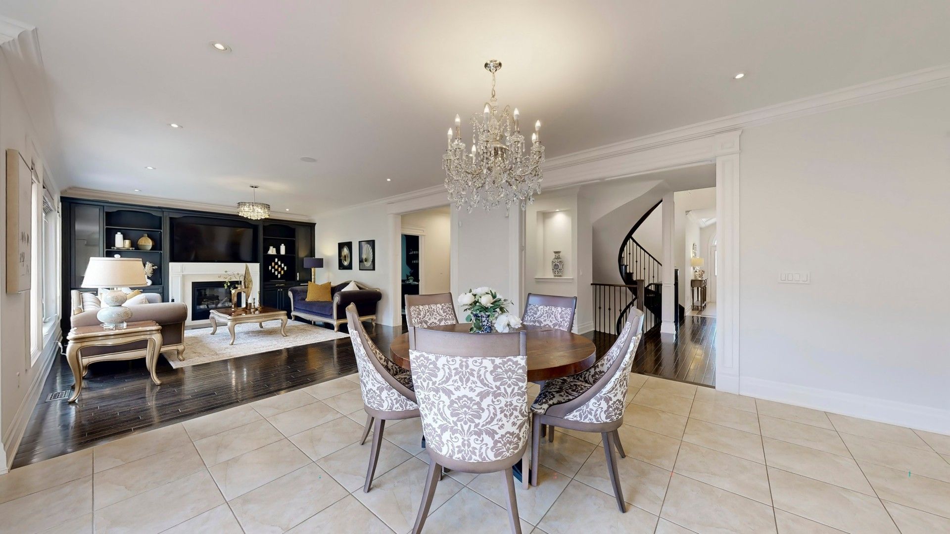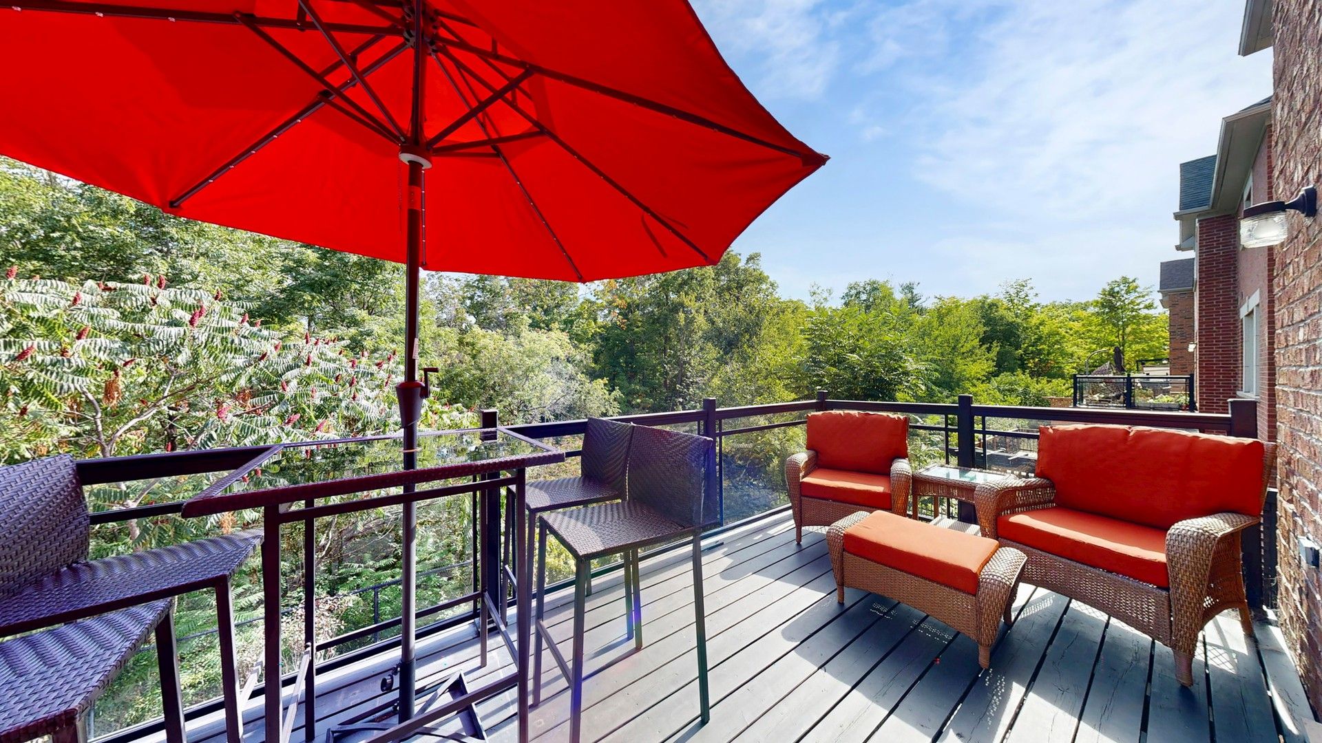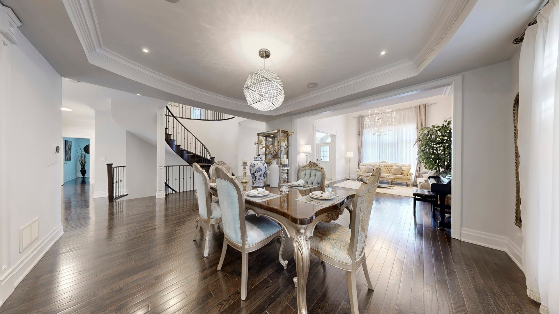 Experience luxury living in this remarkable ravine-lot home located in the prestigious Upper Thornhill Estates community. Designed with both elegance and functionality in mind, the main floor showcases formal living and dining rooms, a secluded home office, and a gourmet kitchen enhanced by granite countertops and high-end appliances. The dining area is elevated by an elegant coffered ceiling and opens seamlessly to the grand living room, where soaring ceilings, oversized windows, and plentiful natural light create an impressive sense of space. Bathed in natural light, the family room is anchored by an impressive custom built-in feature wall with open display shelving and a gas fireplace framed by a classic mantle. From the expansive elevated deck, take in sweeping panoramic views of the picturesque ravine, framed by mature trees and lush greenery. A custom glass railing ensures clear, unobstructed views, while the generous layout easily accommodates both dining and lounging areas, offering a perfect setting to unwind with nature all around. On the second level, the primary bedroom is exceptionally large, featuring a cozy sitting area and two walk-in closets for added comfort and convenience. The additional bedrooms are also generously sized and well designed ideal for family members or guests. The backyard oasis extends to the lower level with direct walkout access from the basement, creating a seamless connection between elegant indoor living and peaceful outdoor surroundings. This level also features a designer bar with custom cabinetry, a wine fridge, beverage coolers, stone countertops, and built-in shelving, making it perfect for entertaining. The spacious recreation area offers a sleek contemporary fireplace, a large TV feature wall, stylish lighting, and a dedicated lounge and entertainment space. Brand-new Carrville Community Centre, Library and District Park, top-rated schools, a golf club, GO station, Vaughan Mills, hospital. Surrounded by parks, trails.
