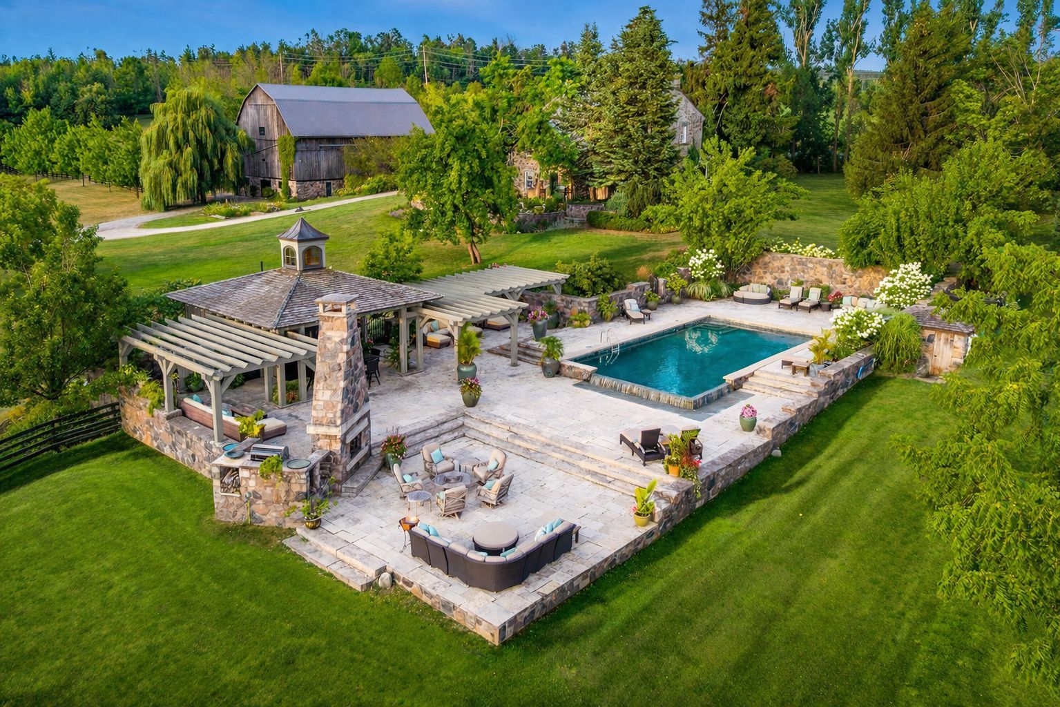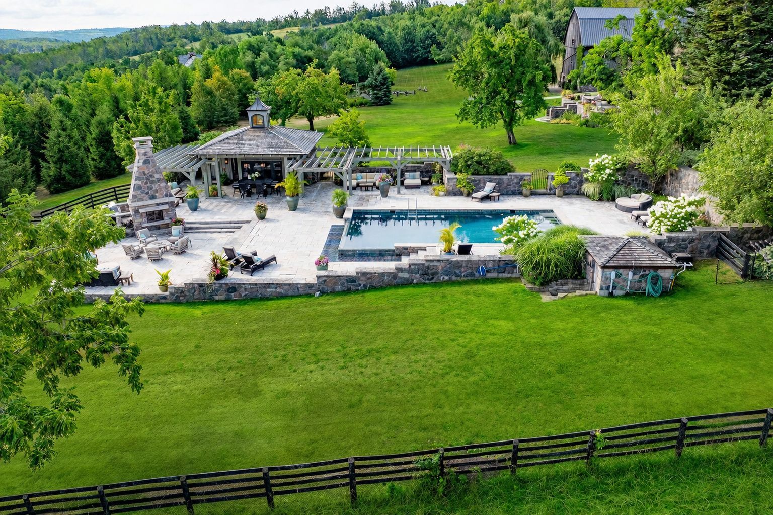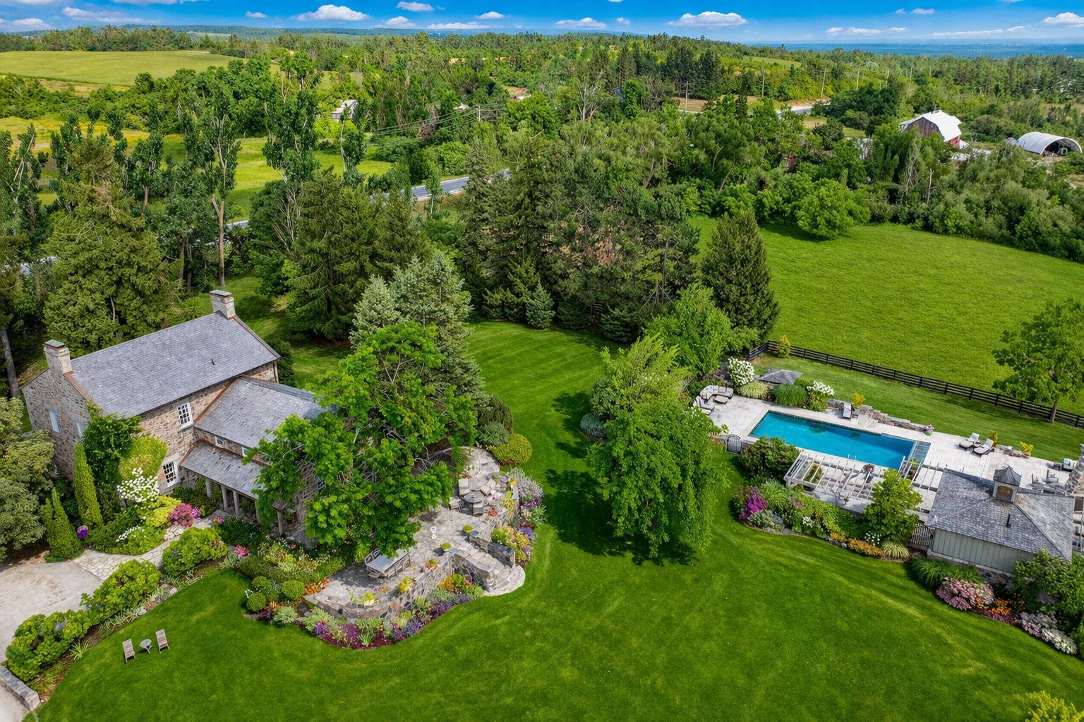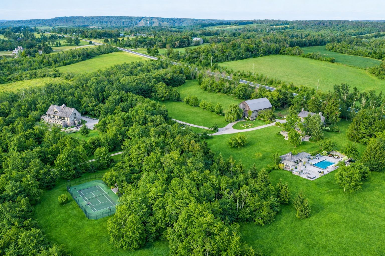 TALLY HO! A LANDMARK ESTATE RICH IN HISTORY - Once a bustling stagecoach stop in the 1850s, Tally Ho has evolved over the past 30 years into one of the most Breathtaking Estates in the Georgian Triangle. As one of the oldest homes in the region, it blends rich history with modern elegance often leaving visitors saying, 'This is my favourite home!' An Outdoor Oasis: Set on 106 rolling acres -the stunning resort-style pool with sweeping panoramic views evokes the glamour of the South of France. A remarkable 9-car garage with a kitchenette, bedroom/office and powder room has already been approved to accommodate 4 additional bedrooms and 2 bathrooms. This versatile space offers endless opportunities for hosting guests or accommodating extended family. Equestrian enthusiasts will be impressed by the State-of-the-Art Stables designed with the highest standards of care and functionality. The 7 stalls feature a Tack Room, Horse Shower, Automatic Water Feeders, premium 'Stable Comfort' flooring system and a beautiful Paddock.The expansive barn, painstakingly reinforced by Mennonite Craftsmen, provides ample space for equipment and storage, blending heritage craftsmanship with modern utility. Recreational amenities abound, including sweeping gardens and trails, a tennis and basketball court, and professionally designed greenhouse for year-round gardening and seasonal plant storage. Just minutes away from Devils Glen Ski Club, Georgian Bay and the Mad River Golf Club. Whether you are seeking a luxurious rural retreat, a working equestrian facility or a rare piece of Ontario's living history - Tally Ho offers it all.