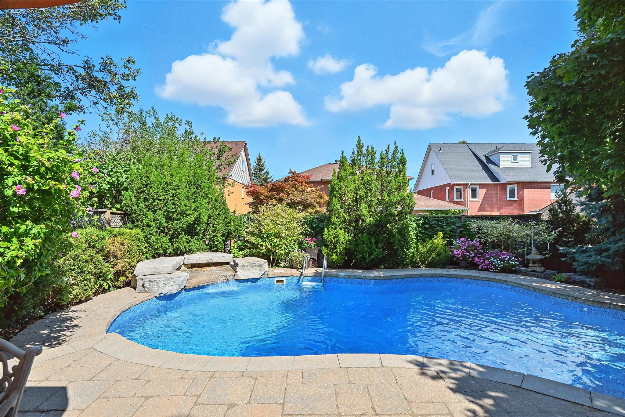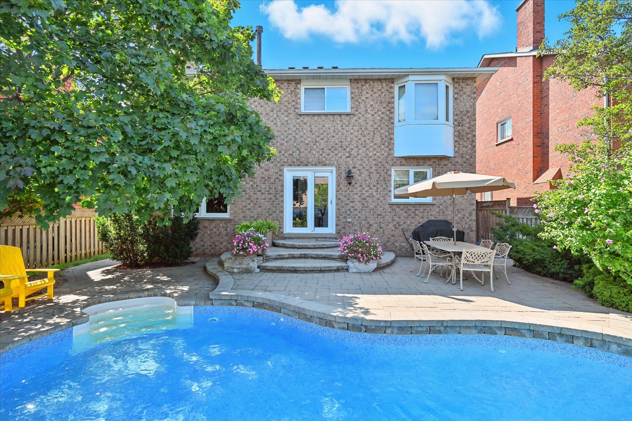 SOUGHT-AFTER RIVER OAKS! QUIET, FAMILY-FRIENDLY STREET! Welcome to 44 Inverhuron Trail - an exceptionally well-maintained Greenpark-built five-bedroom executive residence thoughtfully designed for comfortable, modern family living. The main level offers elegant open-concept living and dining areas, an inviting family room with a classic brick woodburning fireplace, powder room, and convenient laundry room with direct garage access. The renovated kitchen features granite countertops and flows seamlessly into the bright breakfast area with a large pantry and walkout to the patio. Upstairs, the oversized primary retreat boasts maple hardwood flooring, a walk-in closet plus secondary closet, and a spa-inspired five-piece ensuite complete with double sinks and a relaxing soaker tub. Four additional bedrooms and a well-appointed four-piece bathroom complete the upper level, offering ample space for growing families. The partially finished basement further expands your living space with a versatile recreation area featuring a cozy gas fireplace, three-piece bathroom, and plenty of storage. Additional highlights include extensive maple hardwood flooring, crown moldings throughout the main level, beautifully updated kitchen and bathrooms, two fireplaces, and a two-car attached garage with newer doors and convenient backyard access. Step outside to an incredibly private, low-maintenance backyard oasis, showcasing a 22' x 29' inground heated Pioneer saltwater pool with waterfall, stunning natural stone patios, and beautifully landscaped gardens - an exceptional setting for summer entertaining and family enjoyment. Ideally located just steps to Holy Trinity Catholic Secondary School and River Oaks Community Centre, and close to parks, extensive trail network, top-ranked schools, shopping, dining, hospital, and everyday amenities. A rare opportunity to own a truly turnkey family home in one of River Oaks most desirable locations. This is the lifestyle you've been waiting for!