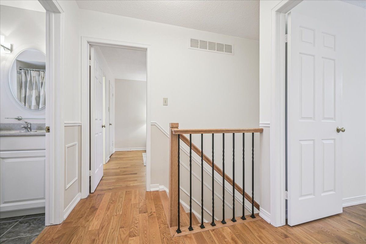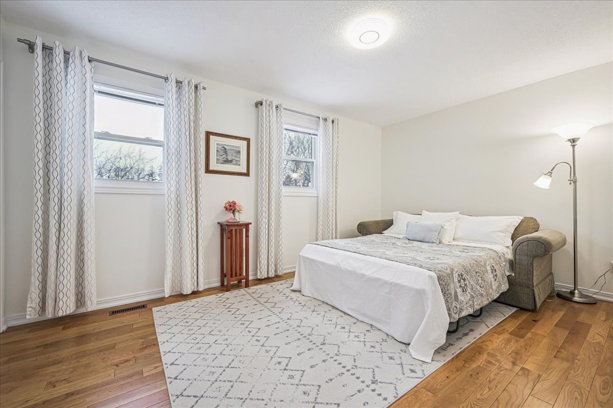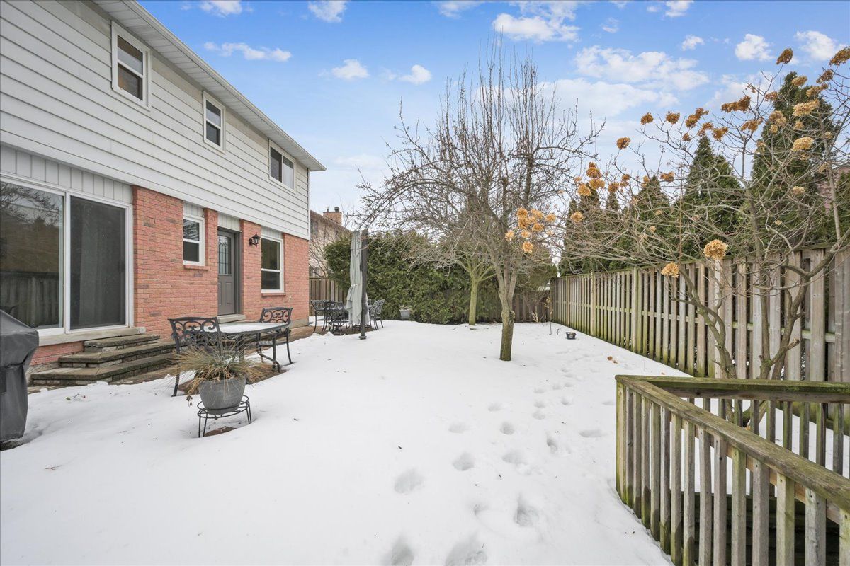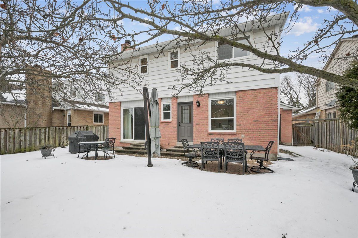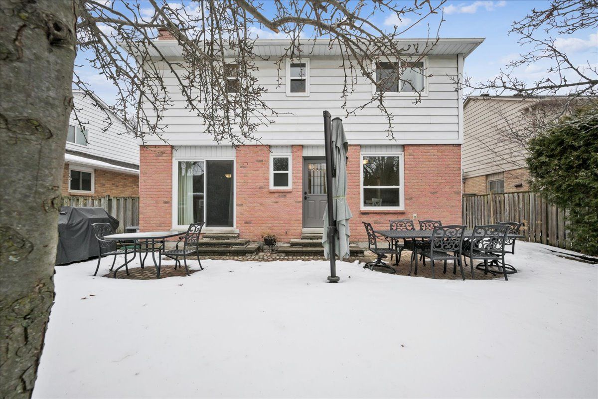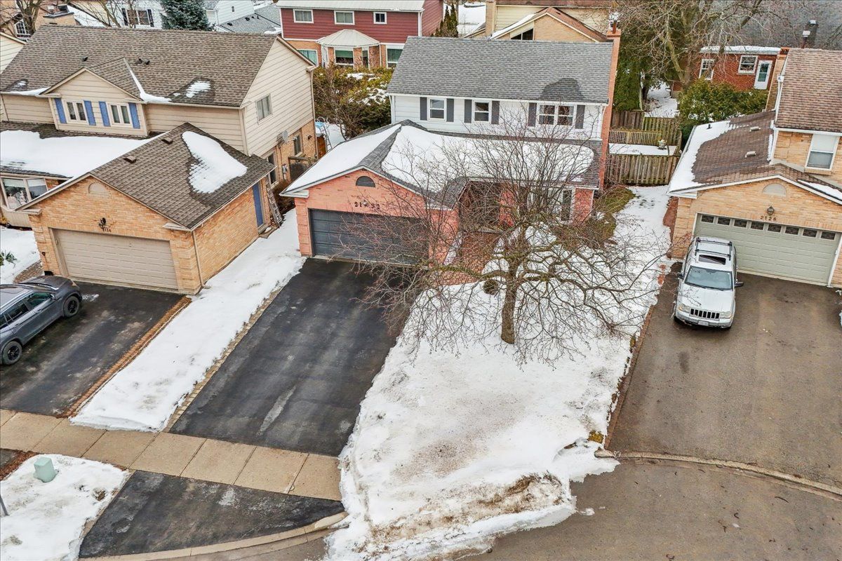 Nestled at the top of a quiet court in central Burlington, this beautifully maintained Monarch-built family home offers 3+1 bedrooms, 3.5 bathrooms and approx. 2,432 sq. ft. of finished living space including the basement. An ideal location for families and commuters alike, just an 8-minute walk to Tom Thomson Public School and minutes to downtown Burlington's shops, restaurants, waterfront, Spencer Smith Park, Brant Street Pier, Art Gallery of Burlington and Joseph Brant Hospital. Quick access to Burlington GO Station and Hwy 403, with Costco and Walmart close by.Curb appeal is exceptional with a double driveway, parking for four vehicles, attached double garage, interlocking stone curbing, manicured gardens and a welcoming stone walkway. The private backyard is a tranquil retreat featuring a spacious interlocking patio, mature trees, lush perennial gardens and a fruit-bearing pear tree-perfect for entertaining or enjoying quiet summer evenings.Inside, a striking oak staircase with black metal spindles anchors the foyer. The formal living room with parquet flooring flows through French doors into the warm family room with gas fireplace and walkout to the patio. The bright eat-in kitchen offers ample white cabinetry, stainless steel appliances (except fridge), updated laminate flooring and a generous breakfast area with treetop views. A separate dining room and convenient 2-piece bath complete the main level.Upstairs, hardwood flooring (2021) extends throughout the hallway, bedrooms and closets. The primary suite features a walk-in closet and private 3-piece ensuite, while two additional bedrooms share the main 4-piece bath. The finished lower level offers a versatile rec/media room with wide-plank laminate flooring (2022), a fourth bedroom or home office, and a full 3-piece bath. Numerous updates including roof shingles, windows (except patio door), front and rear doors, furnace and A/C complete this move-in ready home in a premium court location.
