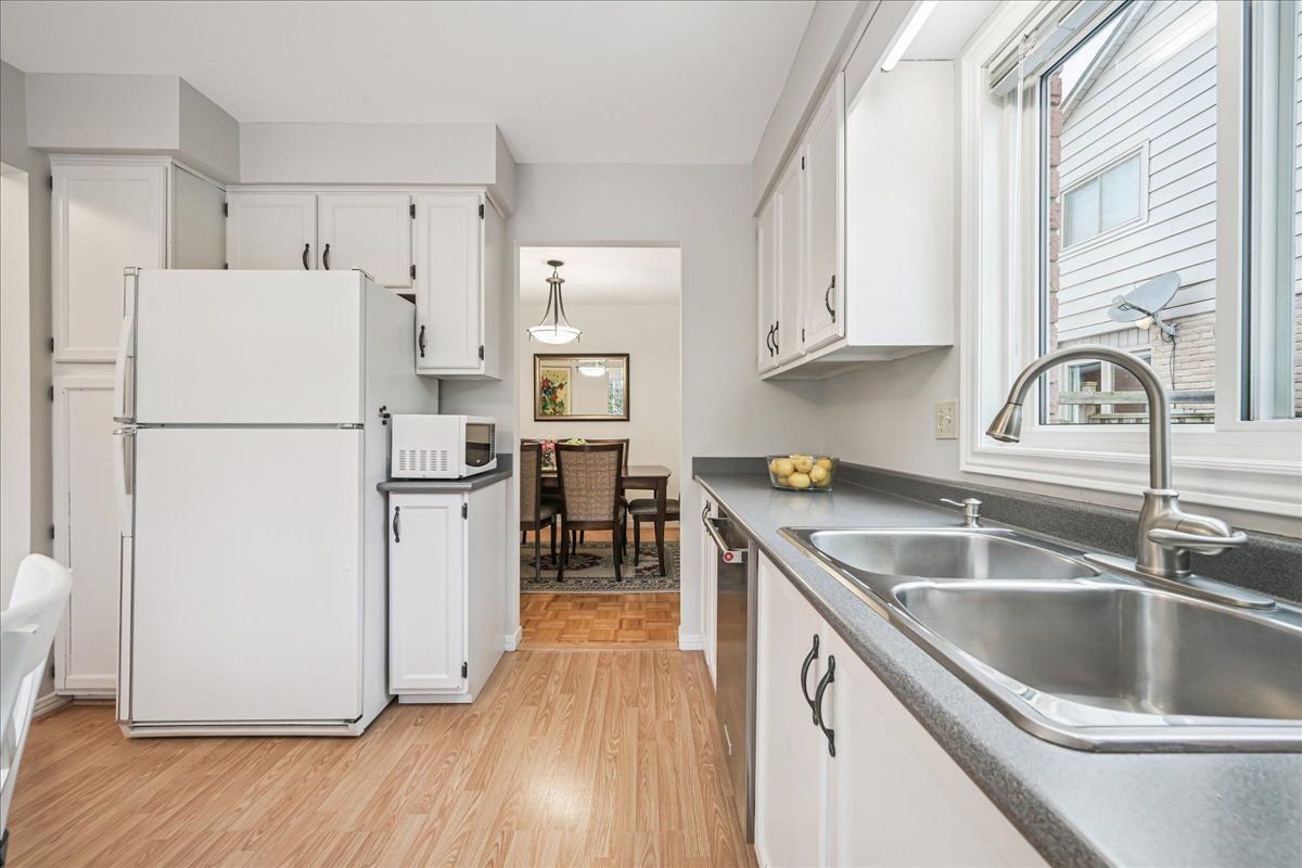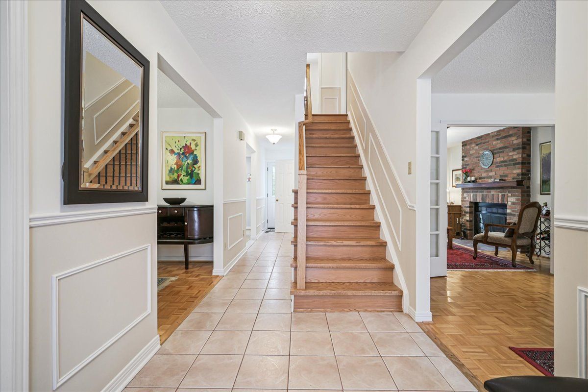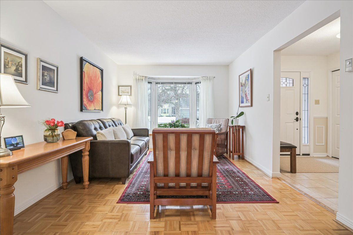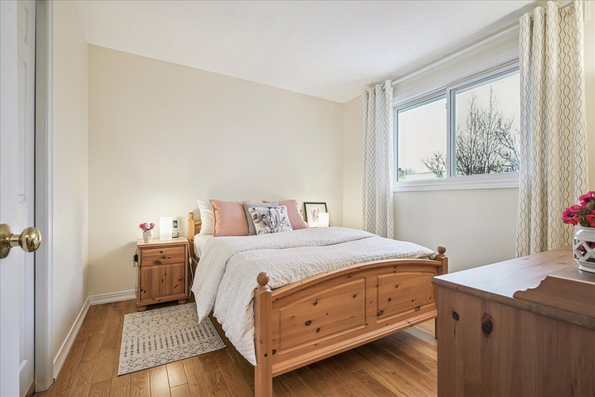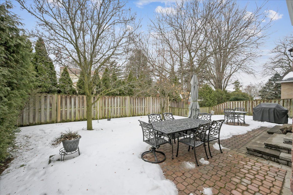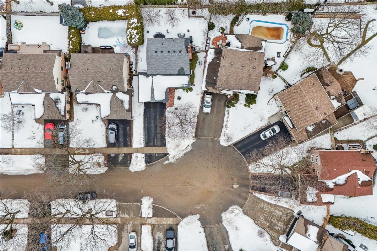 Nestled at the top of a quiet court in central Burlington, this beautifully maintained Monarch-built family home offers 3+1 bedrooms, 3.5 bathrooms and approx. 2,432 sq. ft. of finished living space including the basement. An ideal location for families and commuters alike, just an 8-minute walk to Tom Thomson Public School and minutes to downtown Burlington's shops, restaurants, waterfront, Spencer Smith Park, Brant Street Pier, Art Gallery of Burlington and Joseph Brant Hospital. Quick access to Burlington GO Station and Hwy 403, with Costco and Walmart close by.Curb appeal is exceptional with a double driveway, parking for four vehicles, attached double garage, interlocking stone curbing, manicured gardens and a welcoming stone walkway. The private backyard is a tranquil retreat featuring a spacious interlocking patio, mature trees, lush perennial gardens and a fruit-bearing pear tree-perfect for entertaining or enjoying quiet summer evenings.Inside, a striking oak staircase with black metal spindles anchors the foyer. The formal living room with parquet flooring flows through French doors into the warm family room with gas fireplace and walkout to the patio. The bright eat-in kitchen offers ample white cabinetry, stainless steel appliances (except fridge), updated laminate flooring and a generous breakfast area with treetop views. A separate dining room and convenient 2-piece bath complete the main level.Upstairs, hardwood flooring (2021) extends throughout the hallway, bedrooms and closets. The primary suite features a walk-in closet and private 3-piece ensuite, while two additional bedrooms share the main 4-piece bath. The finished lower level offers a versatile rec/media room with wide-plank laminate flooring (2022), a fourth bedroom or home office, and a full 3-piece bath. Numerous updates including roof shingles, windows (except patio door), front and rear doors, furnace and A/C complete this move-in ready home in a premium court location.