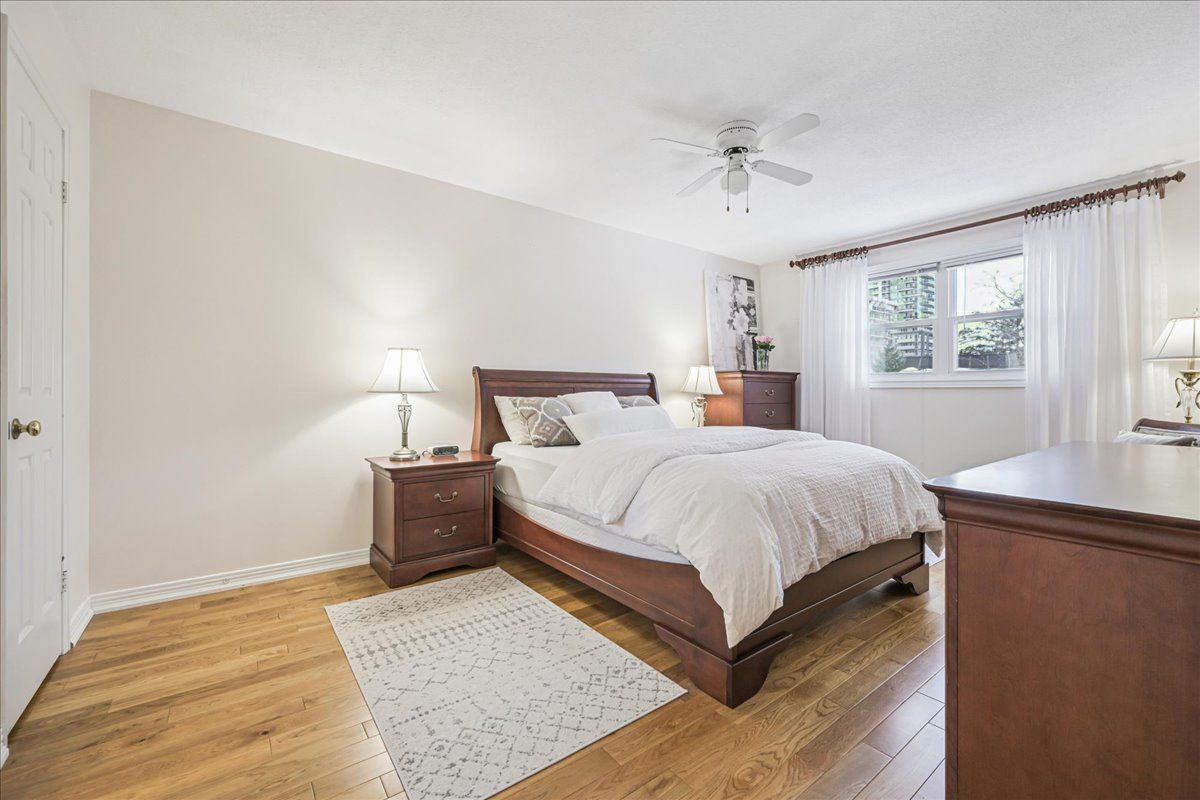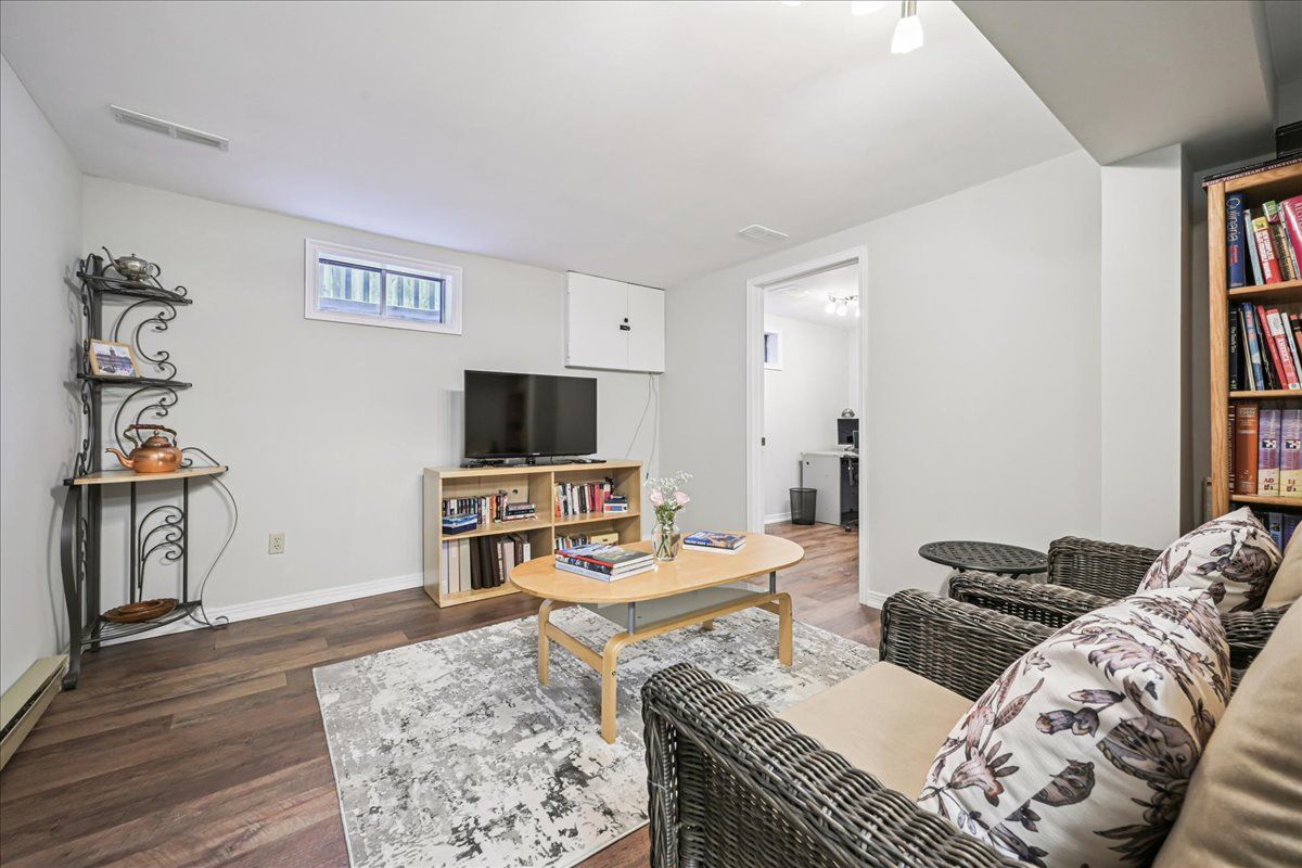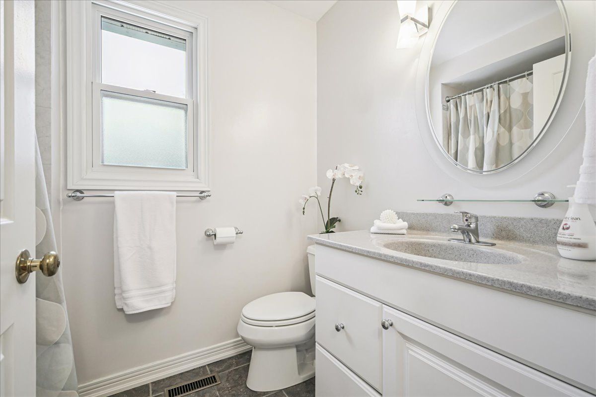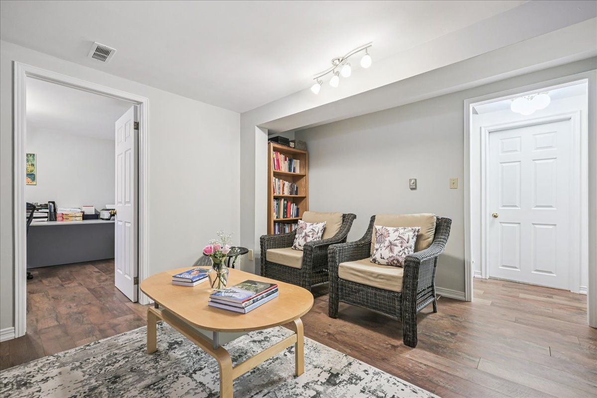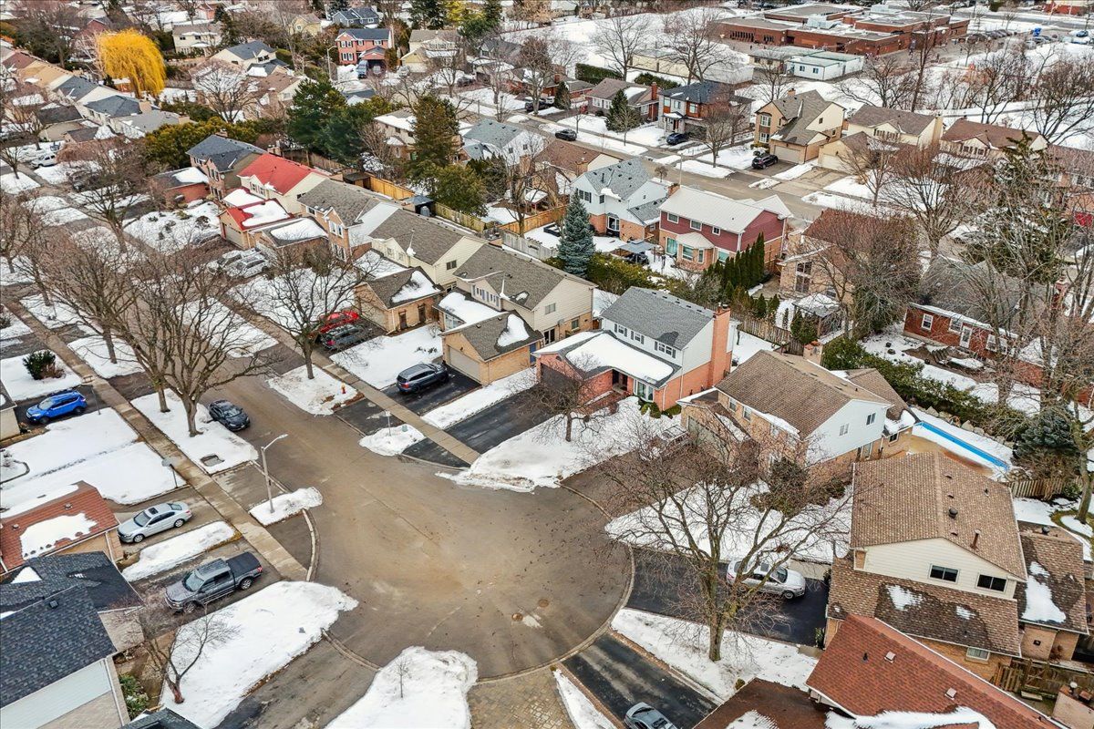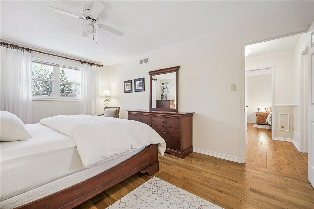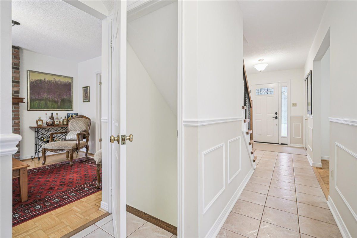 Nestled at the top of a quiet court in central Burlington, this beautifully maintained Monarch-built family home offers 3+1 bedrooms, 3.5 bathrooms and approx. 2,432 sq. ft. of finished living space including the basement. An ideal location for families and commuters alike, just an 8-minute walk to Tom Thomson Public School and minutes to downtown Burlington's shops, restaurants, waterfront, Spencer Smith Park, Brant Street Pier, Art Gallery of Burlington and Joseph Brant Hospital. Quick access to Burlington GO Station and Hwy 403, with Costco and Walmart close by.Curb appeal is exceptional with a double driveway, parking for four vehicles, attached double garage, interlocking stone curbing, manicured gardens and a welcoming stone walkway. The private backyard is a tranquil retreat featuring a spacious interlocking patio, mature trees, lush perennial gardens and a fruit-bearing pear tree-perfect for entertaining or enjoying quiet summer evenings.Inside, a striking oak staircase with black metal spindles anchors the foyer. The formal living room with parquet flooring flows through French doors into the warm family room with gas fireplace and walkout to the patio. The bright eat-in kitchen offers ample white cabinetry, stainless steel appliances (except fridge), updated laminate flooring and a generous breakfast area with treetop views. A separate dining room and convenient 2-piece bath complete the main level.Upstairs, hardwood flooring (2021) extends throughout the hallway, bedrooms and closets. The primary suite features a walk-in closet and private 3-piece ensuite, while two additional bedrooms share the main 4-piece bath. The finished lower level offers a versatile rec/media room with wide-plank laminate flooring (2022), a fourth bedroom or home office, and a full 3-piece bath. Numerous updates including roof shingles, windows (except patio door), front and rear doors, furnace and A/C complete this move-in ready home in a premium court location.