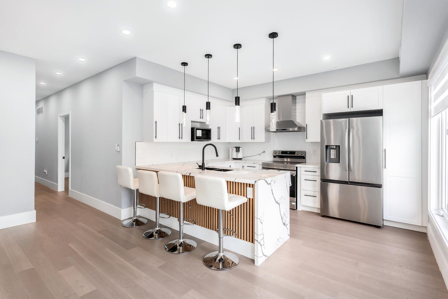 Rare opportunity to own an exceptionally large, brand new fully detached legal triplex with additional laneway access and a city-approved laneway house opportunity-drawings included and major infrastructure already completed (electrical, plumbing, drainage, water line and concrete foundation), offering the next owner the potential to significantly increase long-term income and value. This purpose-built property is ideal for investors, multi-generational families, or buyers looking to live in one unit while generating substantial rental income from the others. Thoughtfully designed and built with quality craftsmanship throughout, the property features three self-contained units with 3 kitchens, 7 bedrooms and 6 bathrooms, along with three separate hydro and gas meters. Each unit includes tankless hot water heaters, independent furnaces and air conditioners, private in-suite laundry, engineered hardwood flooring, pot lights throughout, and brand new stainless steel appliances. Security cameras are installed around the property for added peace of mind. Public transit is at the doorstep with a direct bus to the subway, making this a rare turn-key investment in a convenient location. The main floor unit offers 9-ft ceilings, a bright open layout with office space, two bedrooms and one bathroom, plus a spacious living room and modern kitchen with quartz countertops and stainless steel appliances leading to a private deck. The upper unit spans two levels with two bedrooms each featuring their own ensuite bathrooms, a large sun-filled living room and kitchen overlooking the backyard, while the upper level offers a private primary retreat with two balconies and a spa-inspired ensuite with quartz counters, double sinks, light-up mirror and tunnel skylight. The basement suite features 8-ft ceilings, two bedrooms each with its own ensuite bathroom, a spacious living and dining area, and a bright kitchen with walk-up access to the backyard.