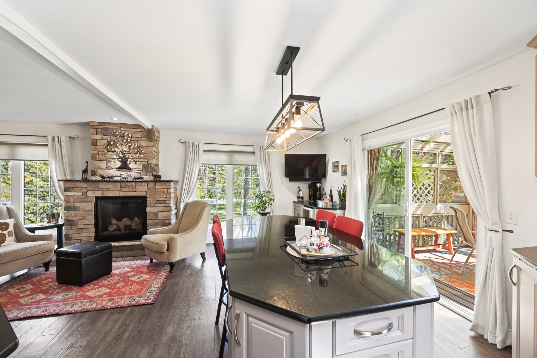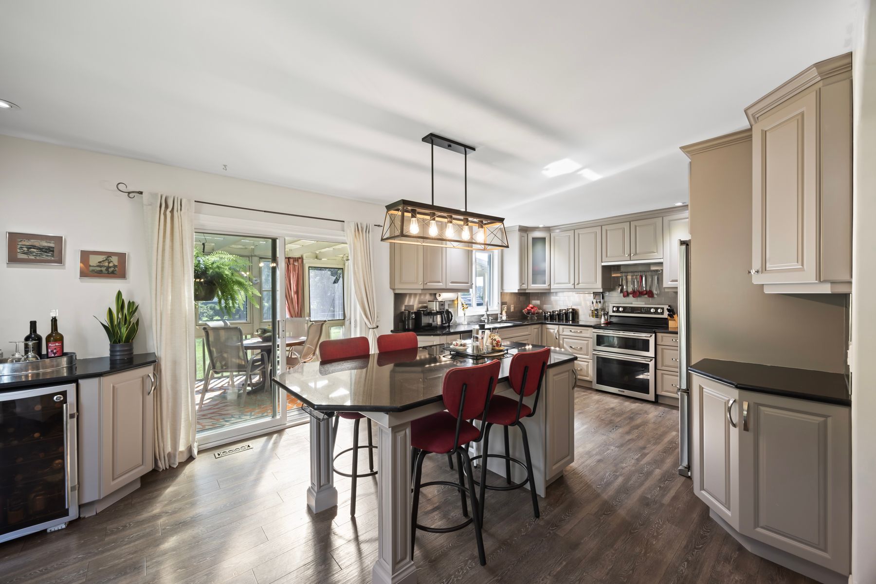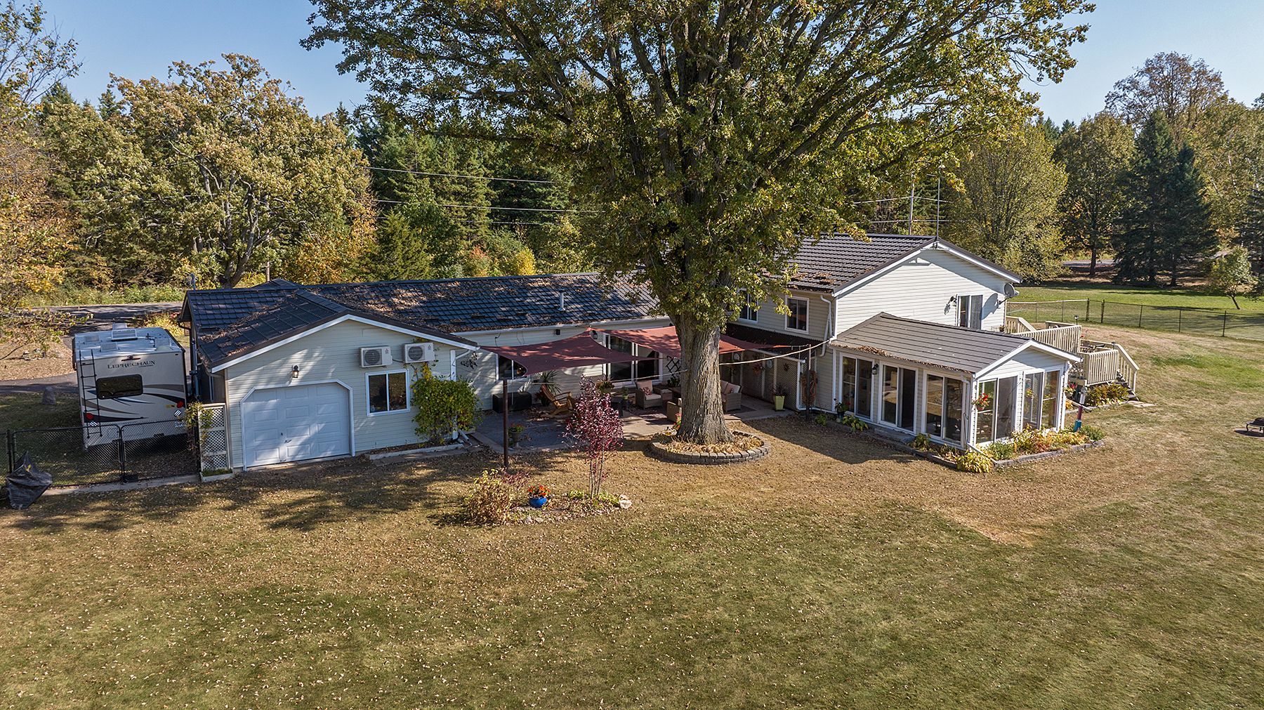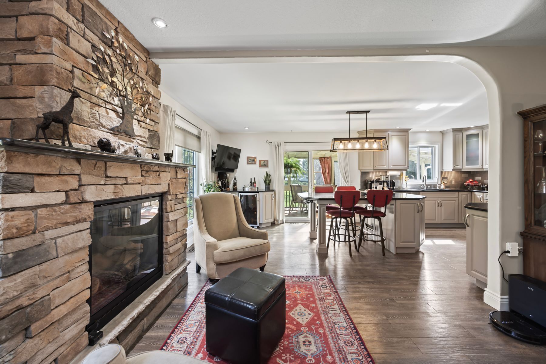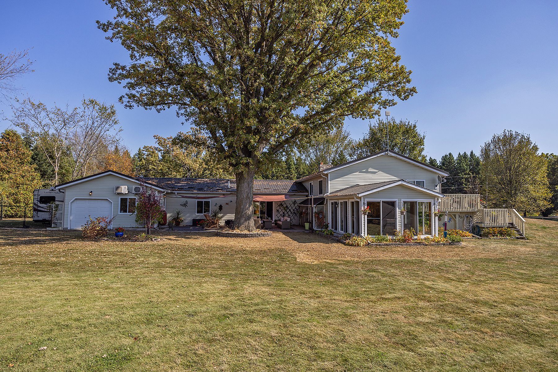 Welcome to 4841 Wolfe Swamp Road - a beautifully appointed 4-bedroom, 3-bathroom bungalow nestled on a picturesque 1.56-acre double lot just north of Kingston. This exceptional property perfectly blends modern luxury with peaceful country living, offering an impressive 3+ car garage with drive-through access, a climate-controlled workshop, and the versatility for an in-law suite or multi-generational living. Step inside to discover a bright, open layout that radiates warmth and meticulous care. The custom kitchen is a true centerpiece, featuring a large centre island, built-in beverage bar, and direct access to a sun-soaked, south-facing enclosed deck-ideal for outdoor dining or your morning coffee. Two spacious living areas provide exceptional flexibility for family life: a formal living room for gatherings and a cozy family room with pellet stove and walkout to a sail-covered patio, perfect for summer evenings. The finished lower level is perfectly designed for guests or extended family, offering a generous bedroom, full bath, and a large rec room with a Murphy bed for additional sleeping space. An enclosed sunroom houses a year-round hot tub for ultimate relaxation. Outside, enjoy manicured gardens, a planting shed, a playground area, a fenced section for pets, and a concrete pad ready for your RV or boat. Additional highlights include a fully automatic 13kW Cummins generator, central air, and majestic mature trees-anchored by a magnificent oak that truly defines the property. Experience the best of space, sophistication, and serenity-all just minutes from town.