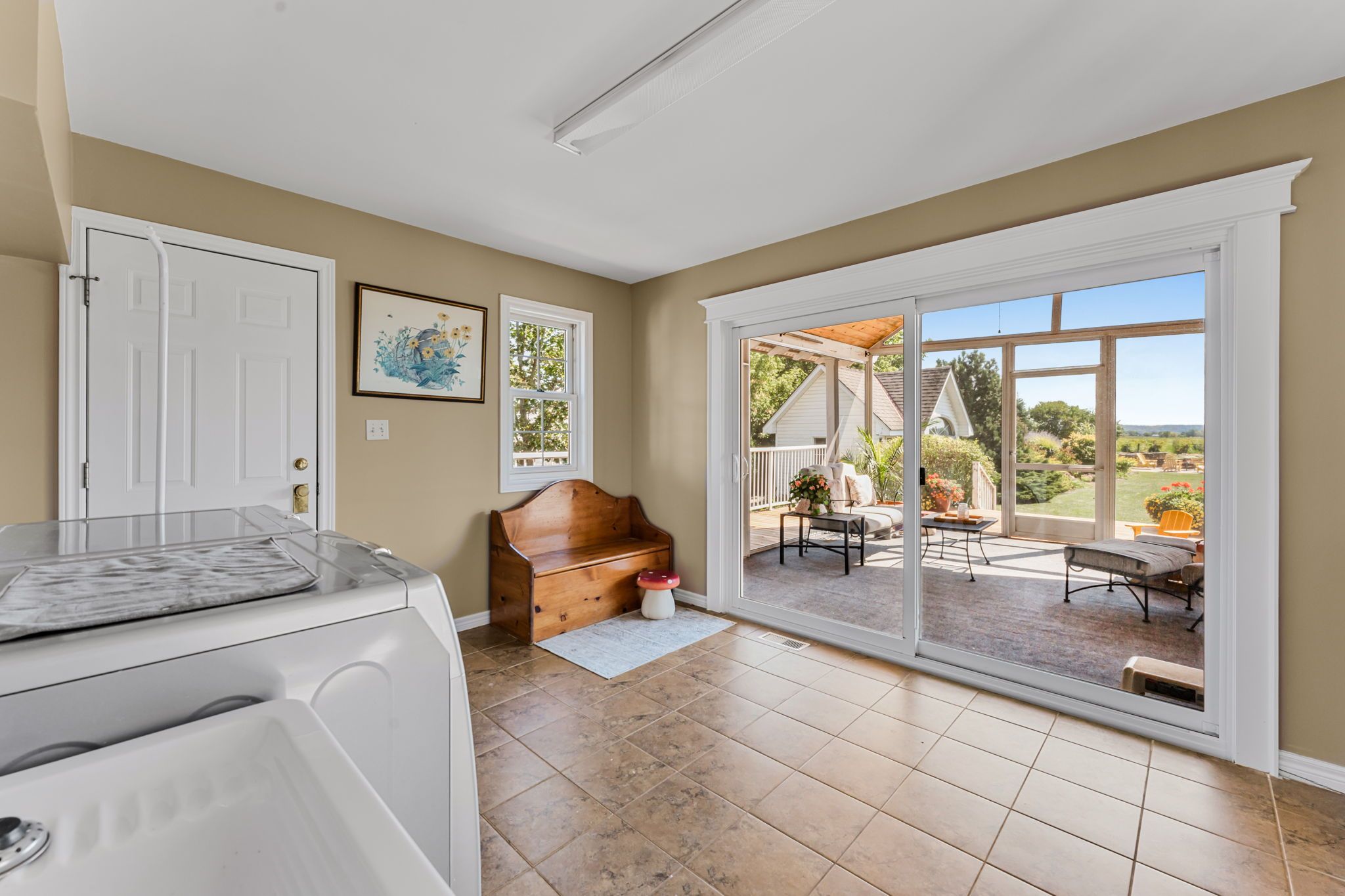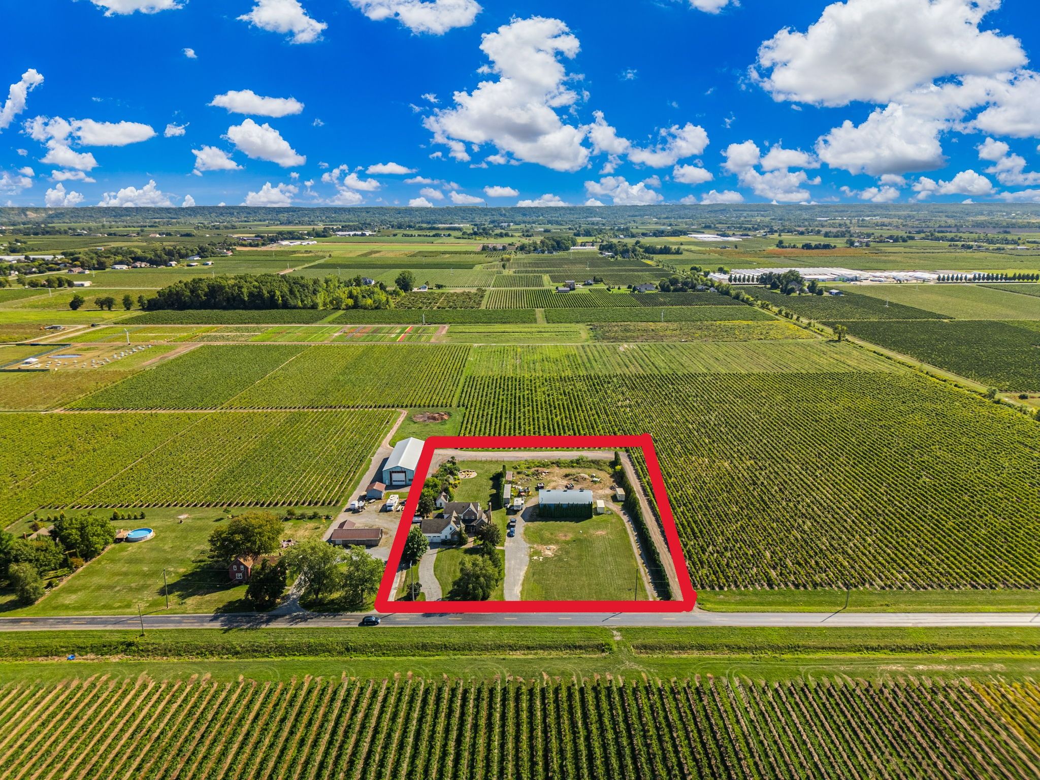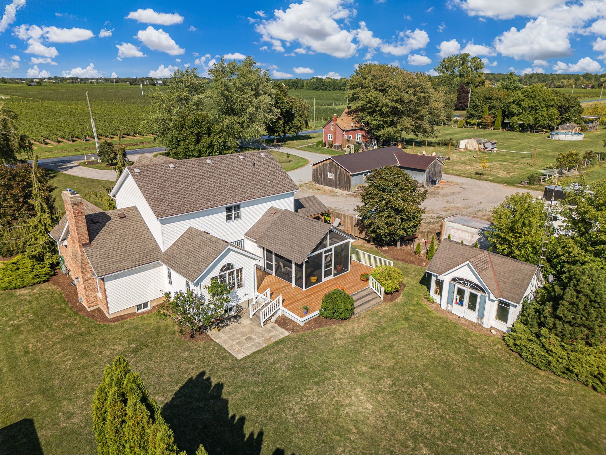 Beautifully maintained custom 2-storey home situated on 2 picturesque acres, surrounded by vineyards! This 3368sqft home showcases several living spaces, ideal for multi-generational & growing families. Welcoming front porch leads into a spacious foyer. French doors open into a lovely den/music room with a cathedral ceiling and a large window overlooking the landscaped front yard. The living room has a focal fireplace, flanked by beautiful windows. This house is designed for entertaining. The kitchen is the centre of the home. Sit down and sample a glass of local wine at the oversized centre island and enjoy an amazing meal with family and friends in the formal dining room. Generous main floor laundry room opens opens to screened-in15x14 porch and to a separate covered deck, ideal for barbecuing in any weather. The main floor also includes a two piece guest bathroom, and the primary bedroom suite with double entry doors, walk-in closet and updated 3-piece ensuite bath. Stand-alone glass shower with rain shower head for the perfect spa experience. Spacious mud room off of the 2 car garage has large double closets and leads into a very spacious office with separate entry. Primary bedroom/ensuite/office have California shutters. On the second floor, two bedrooms share a generous jack and jill bath, each with their own vanity. The second bedroom has a gorgeous window seat overlooking the backyard and the lush surrounding vineyards. The third bedroom, upper hall and stairs showcase brand new carpeting. The second floor also includes a huge bonus room, as well as a large dressing room custom furnished by Closets By Design. The basement is the perfect in-law suite with over 1300 sqft of living space, private entrance, and brand new flooring, gas fireplace and all new kitchen appliances! New furnace and hot water heater as well. 40x60 machine shed has 2 large bays perfect for large vehicles and equipment. One side also serves as a workshop with heated floors!