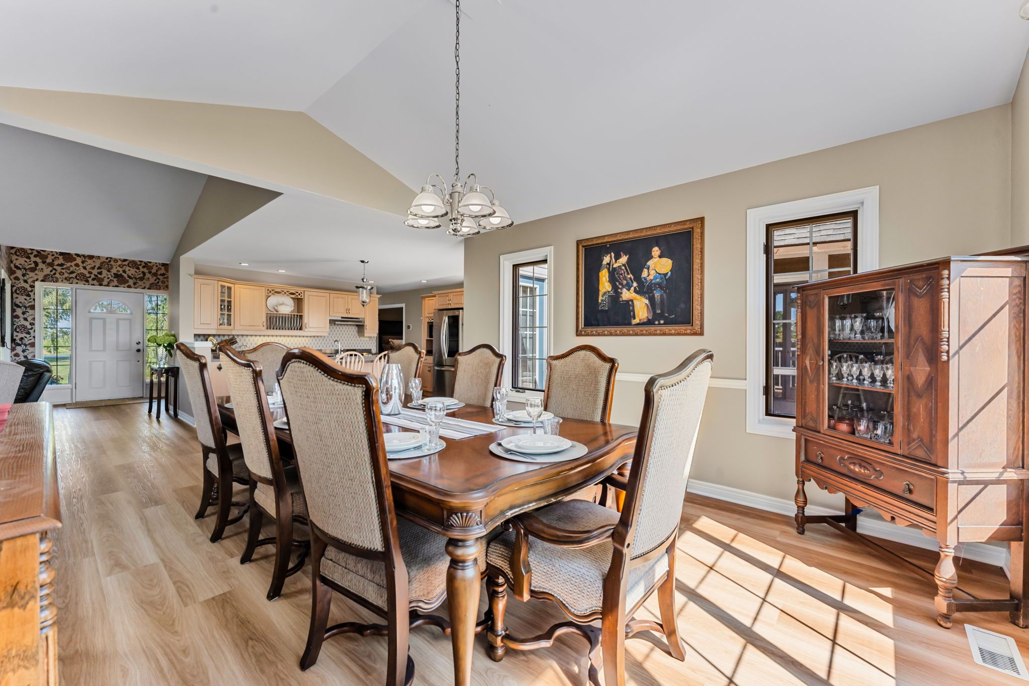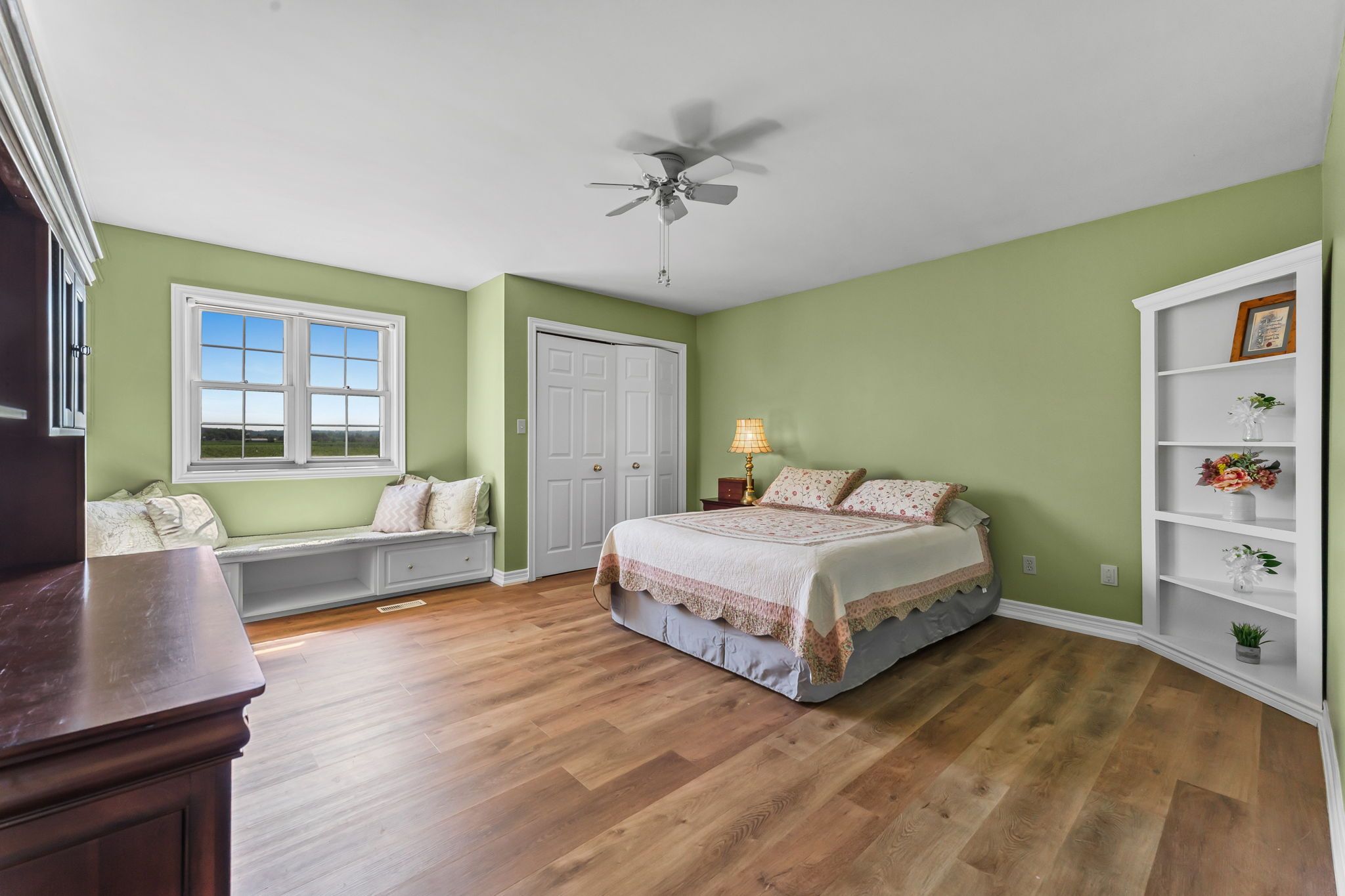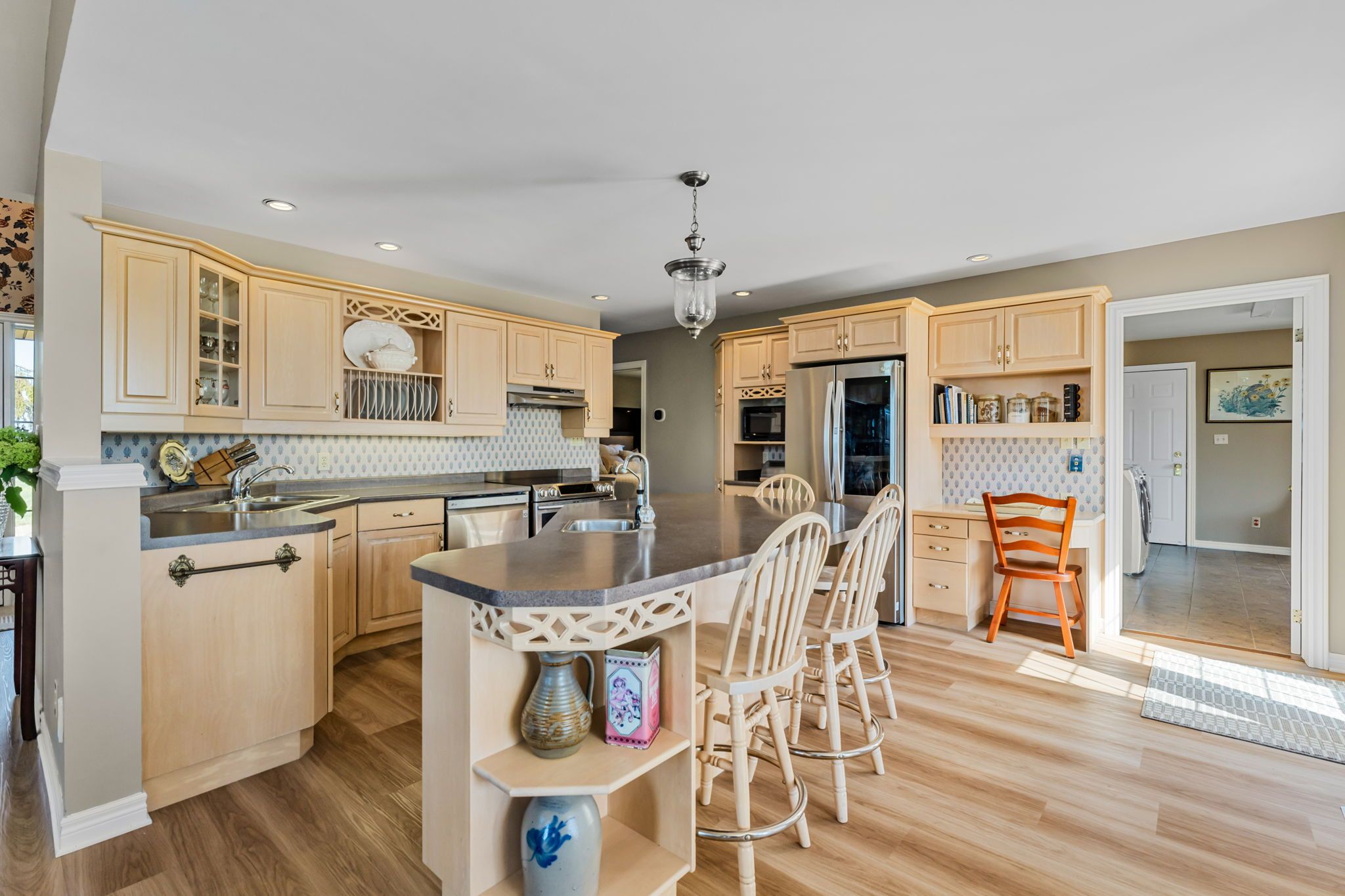 Beautifully maintained custom 2-storey home situated on 2 picturesque acres, surrounded by vineyards! This 3368sqft home showcases several living spaces, ideal for multi-generational & growing families. Welcoming front porch leads into a spacious foyer. French doors open into a lovely den/music room with a cathedral ceiling and a large window overlooking the landscaped front yard. The living room has a focal fireplace, flanked by beautiful windows. This house is designed for entertaining. The kitchen is the centre of the home. Sit down and sample a glass of local wine at the oversized centre island and enjoy an amazing meal with family and friends in the formal dining room. Generous main floor laundry room opens opens to screened-in15x14 porch and to a separate covered deck, ideal for barbecuing in any weather. The main floor also includes a two piece guest bathroom, and the primary bedroom suite with double entry doors, walk-in closet and updated 3-piece ensuite bath. Stand-alone glass shower with rain shower head for the perfect spa experience. Spacious mud room off of the 2 car garage has large double closets and leads into a very spacious office with separate entry. Primary bedroom/ensuite/office have California shutters. On the second floor, two bedrooms share a generous jack and jill bath, each with their own vanity. The second bedroom has a gorgeous window seat overlooking the backyard and the lush surrounding vineyards. The third bedroom, upper hall and stairs showcase brand new carpeting. The second floor also includes a huge bonus room, as well as a large dressing room custom furnished by Closets By Design. The basement is the perfect in-law suite with over 1300 sqft of living space, private entrance, and brand new flooring, gas fireplace and all new kitchen appliances! New furnace and hot water heater as well. 40x60 machine shed has 2 large bays perfect for large vehicles and equipment. One side also serves as a workshop with heated floors!
