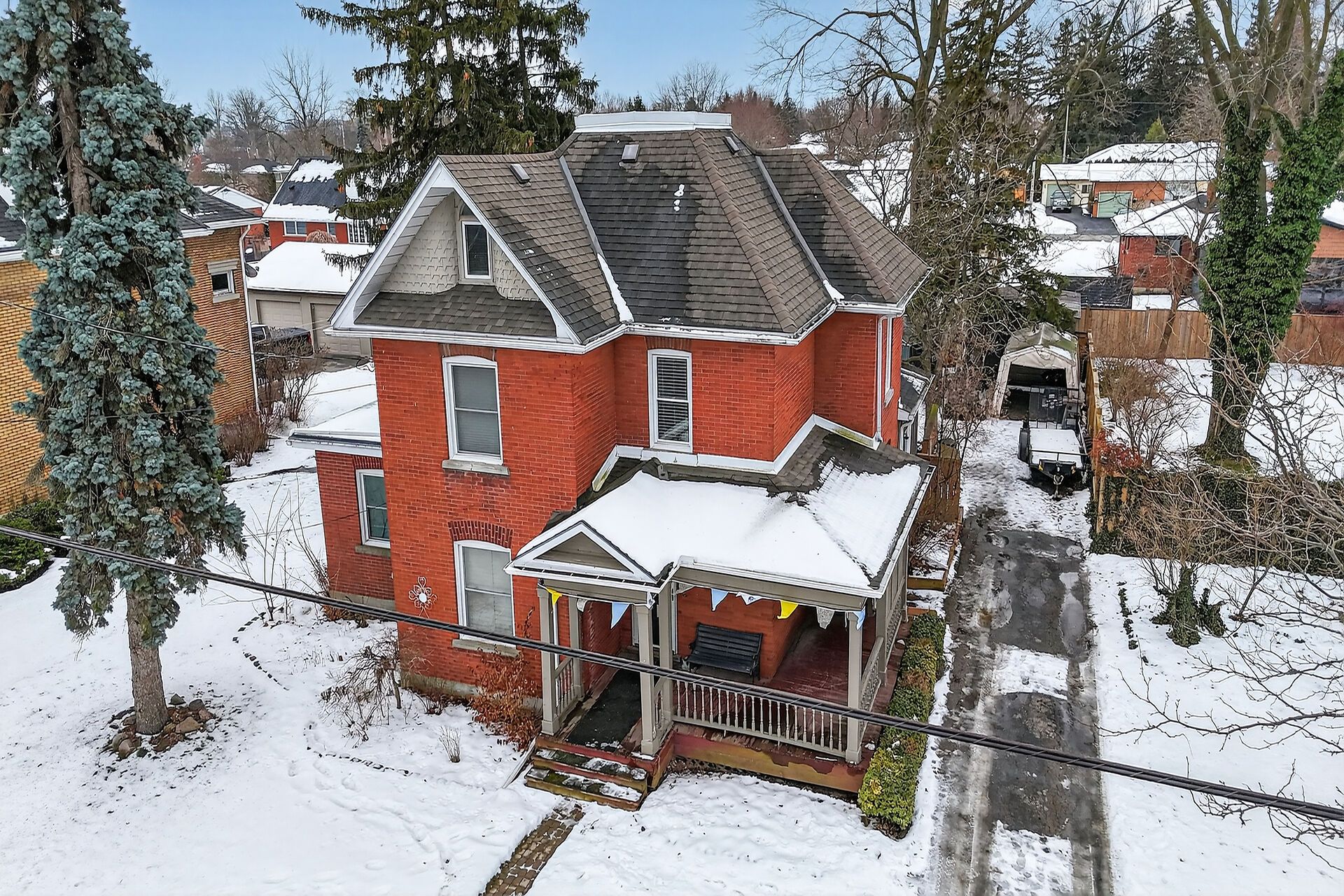 Beautifully presented, Tastefully updated Circa 1908 all brick 2.5 storey home situated on desired 66' x 132' lot. Offering Stately curb appeal with wrap around front covered porch, inviting walkway, ample parking, brick exterior, lush landscaping, & sought after detached garage. The flowing interior layout features charm & character throughout highlighted by period specific trim, doors, & railings, eat in kitchen, formal dining area, main floor primary bedroom, large living room, welcoming foyer, 2 pc bathroom, & sought after MF laundry. The 2nd level includes 2 spacious bedrooms & primary 4 pc bathroom. The upper level offers 4th bedroom loft area with numerous potential uses. Conveniently located close to amenities, shopping, schools, parks, splash pad, pool, & downtown shops. Relaxing commute to Hamilton, Ancaster, 403, & QEW. Ideal home for first time Buyers, family, Investment, or those looking for the perfect inlaw suite. Experience and Enjoy Hagersville Living!