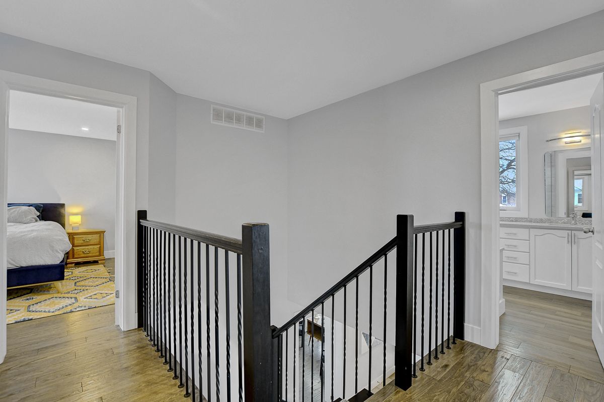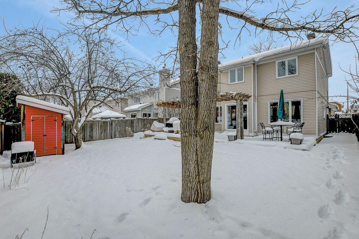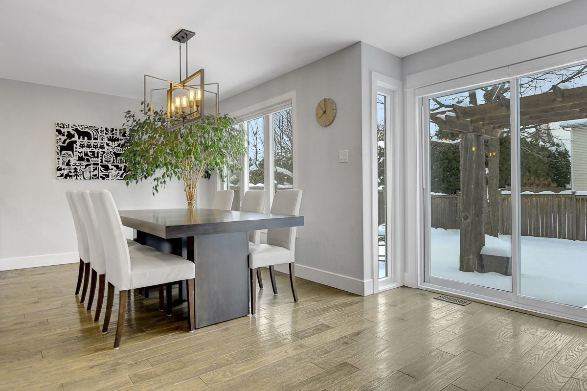 Beautifully finished modern detached home offering exceptional space & style on a quiet street. Clean lines, a cohesive neutral palette and quality finishes create a home that feels polished and inviting from top to bottom. Covered front porch leads to a spacious foyer with coat closet & beautiful sightlines through the home. Mid-tone hardwood floors flow across all three levels, complemented by neutral walls, crisp white trim, striking black accents, and recessed lighting. Just off foyer, a large room provides versatility - ideal as a bedroom with a full bathroom directly across the hall, a secondary living space, or a home office. Rear of the home boasts an open-concept layout, expansive windows span nearly the full width of the back wall and fill the space with natural light. Sleek white kitchen showcases glossy flat-front cabinetry, quartz countertops, stainless steel appliances, centre island with seating & abundant storage. Dining area is positioned along the windows and is well sized for casual meals and formal entertaining. Living room is centered around a wood-burning fireplace, creating a warm and comfortable gathering space. Practical mudroom with custom built-in shelving & bench seating + direct access to double-car garage. Upstairs, 4 well-proportioned bedrooms and two full bathrooms, including a serene primary suite with walk-in closet & a luxurious hotel-inspired ensuite bathroom. Fully finished basement feels bright and flexible, easily accommodating multiple uses such as a recreation room, fitness area, or hobby space. Fenced backyard is framed by mature trees and offers plenty of open green space, a two-tier deck partially covered by a custom pergola, plus a garden shed. Peaceful Chapel Hill South neighbourhood offers a family-friendly atmosphere. Nearby schools, parks, and walking paths are complemented by shops, restaurants, entertainment, and services along Innes Road. Easy access to transit and quick connections to Hwys 174 & 417.