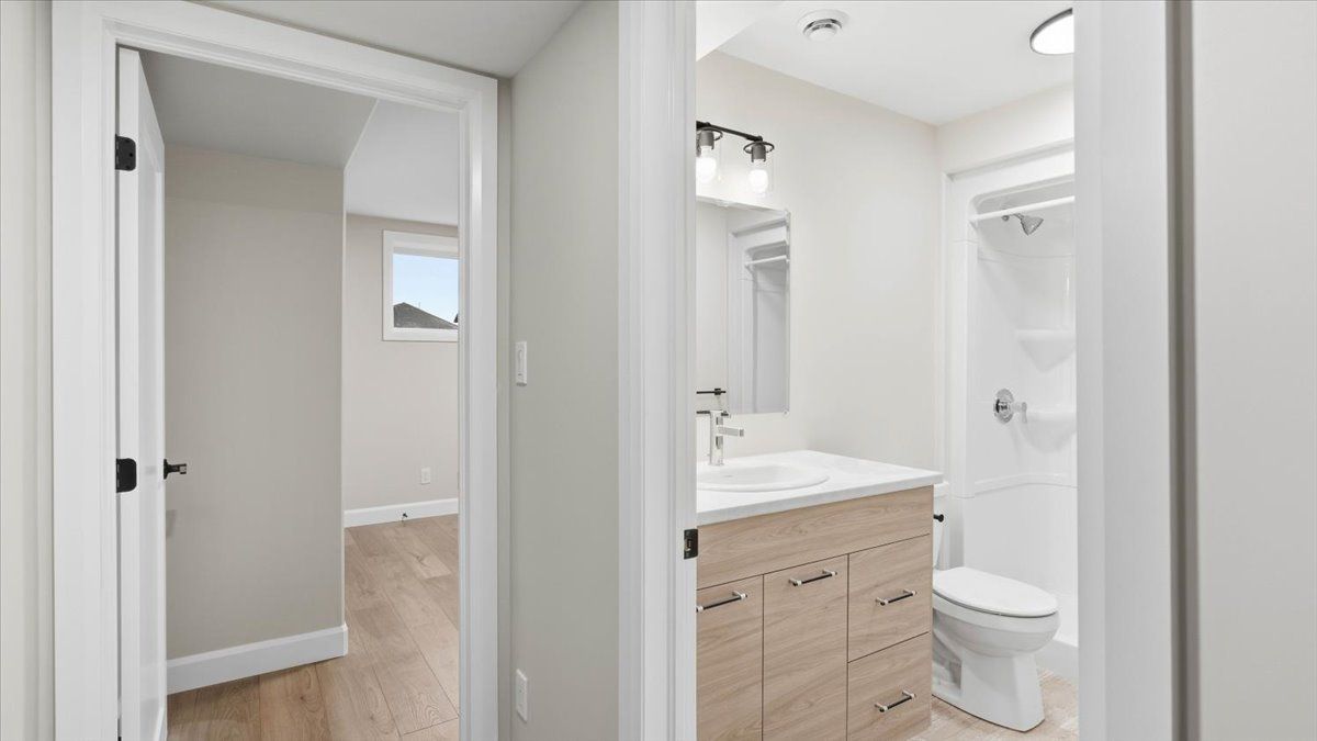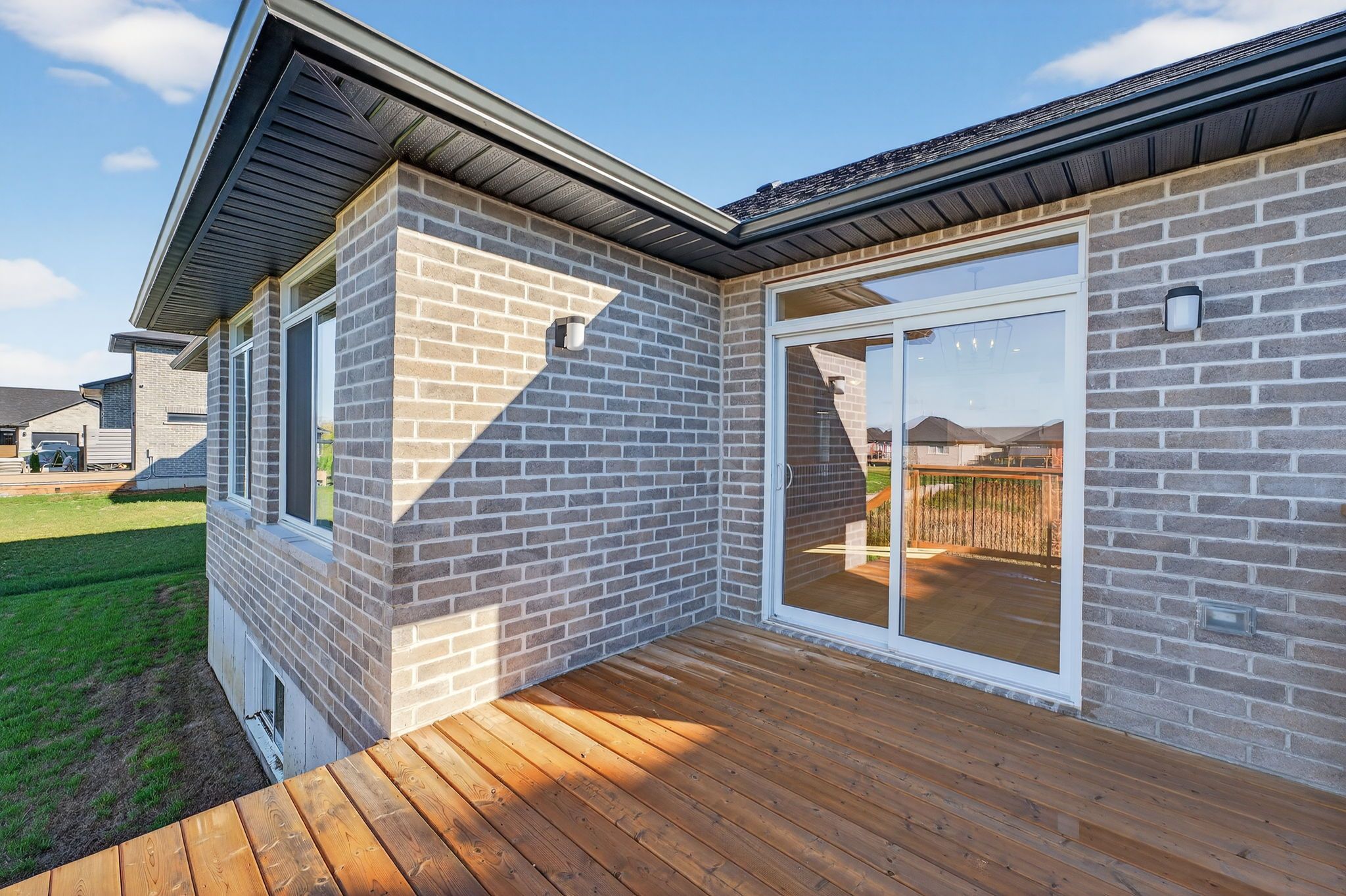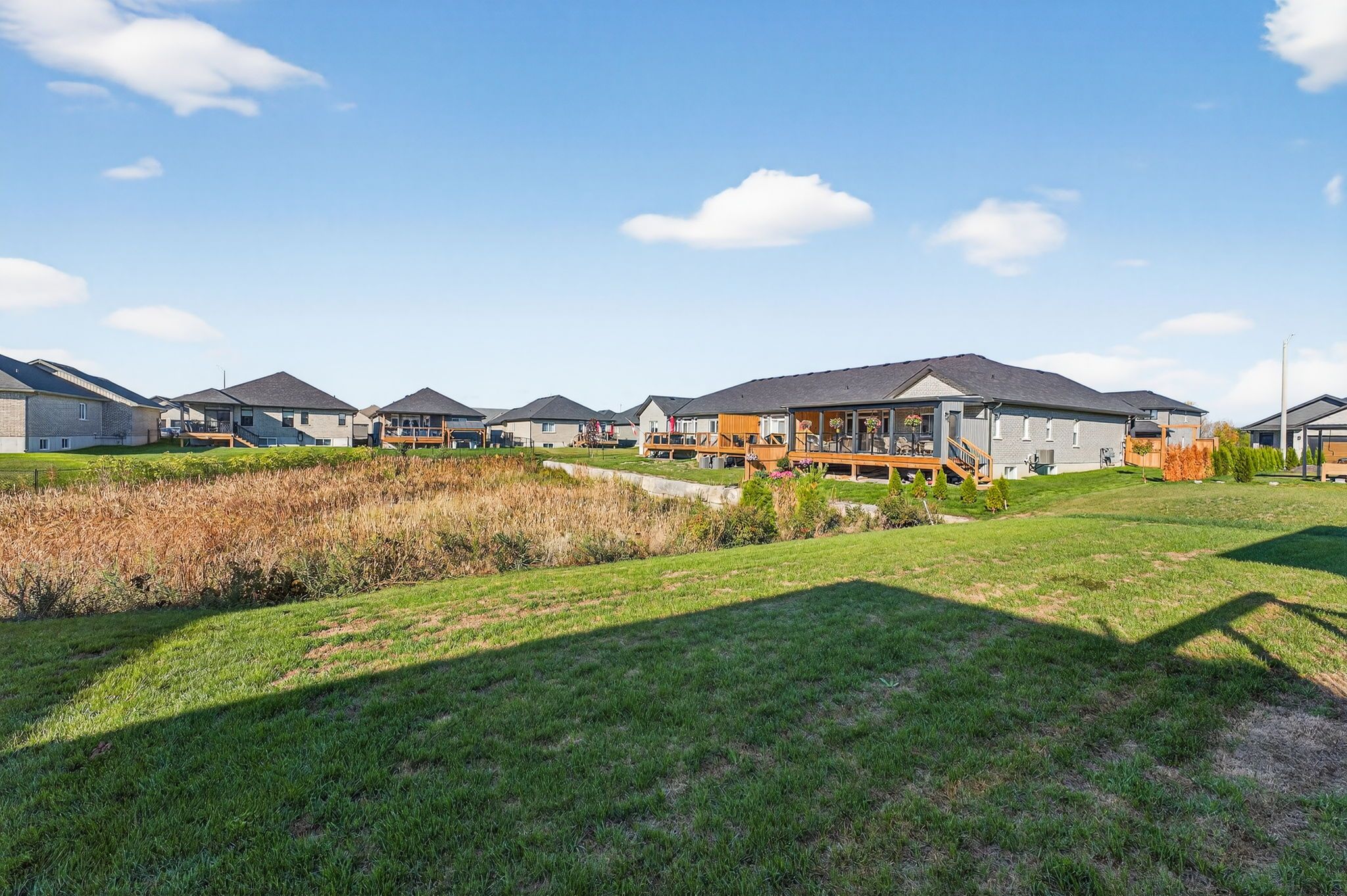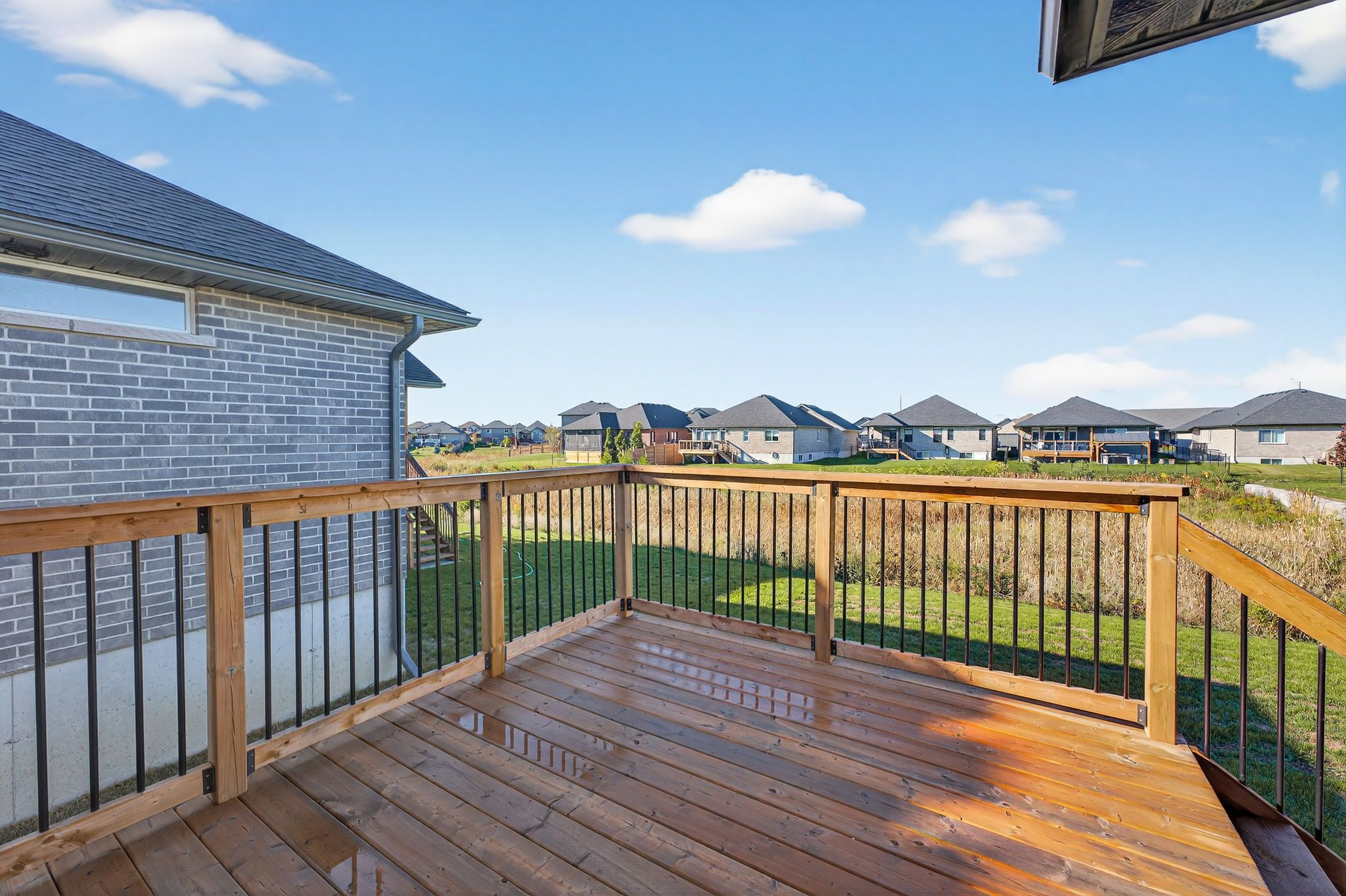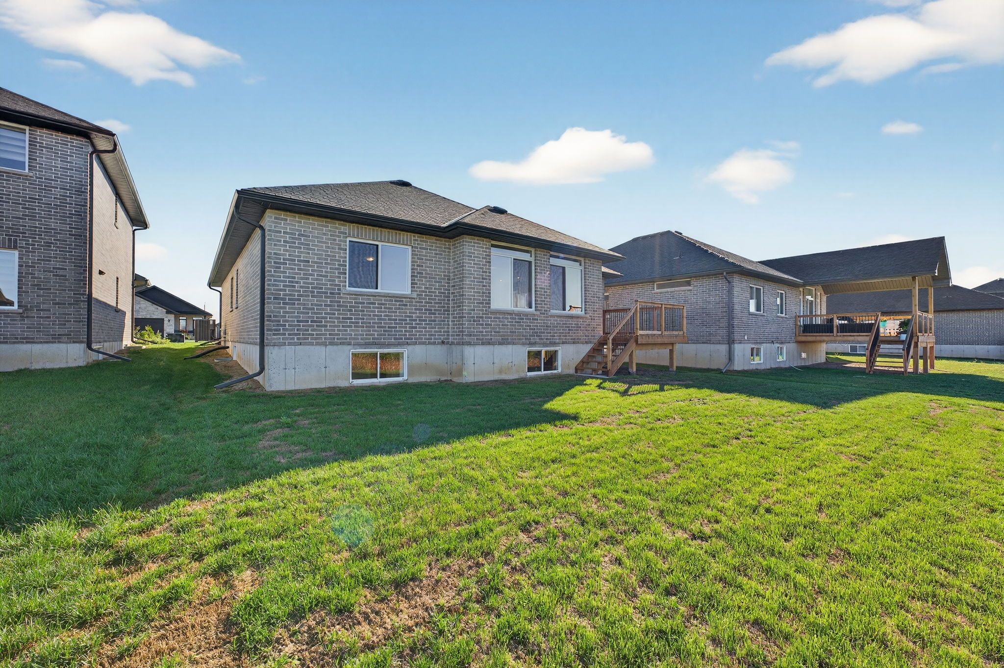 Move-in ready and FULLY FINISHED! This 5 bedroom, 3 bathroom Quinte model all brick bungalow by Duvanco Homes sits on a PREMIUM lot on cul-de-sac backing onto green space, offering privacy and peaceful views. Designed with modern living in mind, the open-concept layout features a custom quality kitchen with oversized island, coffered ceiling in the living room and distressed wide plank hardwood throughout the main floor. Modern light fixtures and finishes throughout. The primary suite includes a walk-in closet and luxurious ensuite with double vanity and glass-surround porcelain tile shower. Main floor laundry with access to the attached garage. Lower level finished with 2 bedrooms, 4pc bathroom and recreation room. Exterior landscaping complete with paved driveway, fully sodded yard, garden package and stone walkway. Completed pressure treated deck with black ballisters. This Quinte model home is Holmes Approved. Settlers Ridge Subdivision offers trails, park, asphalt paved sidewalks, green space and is just minutes to all amenities.