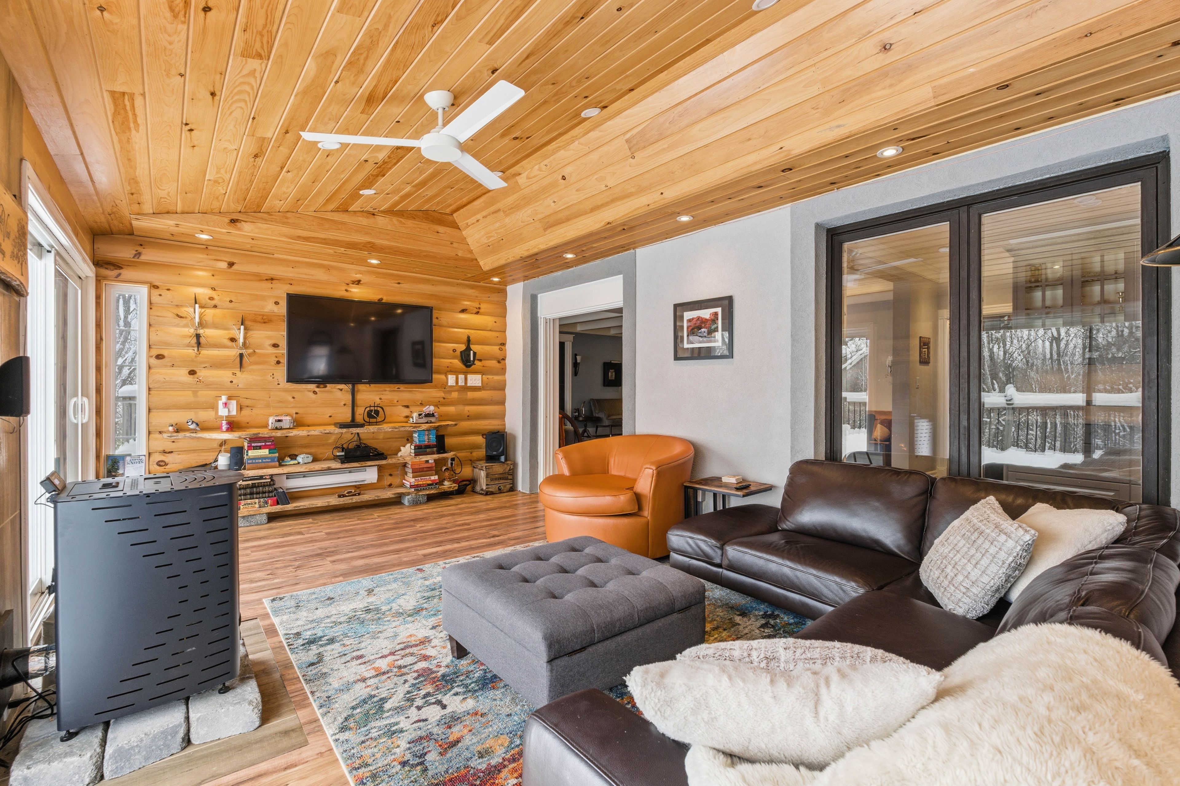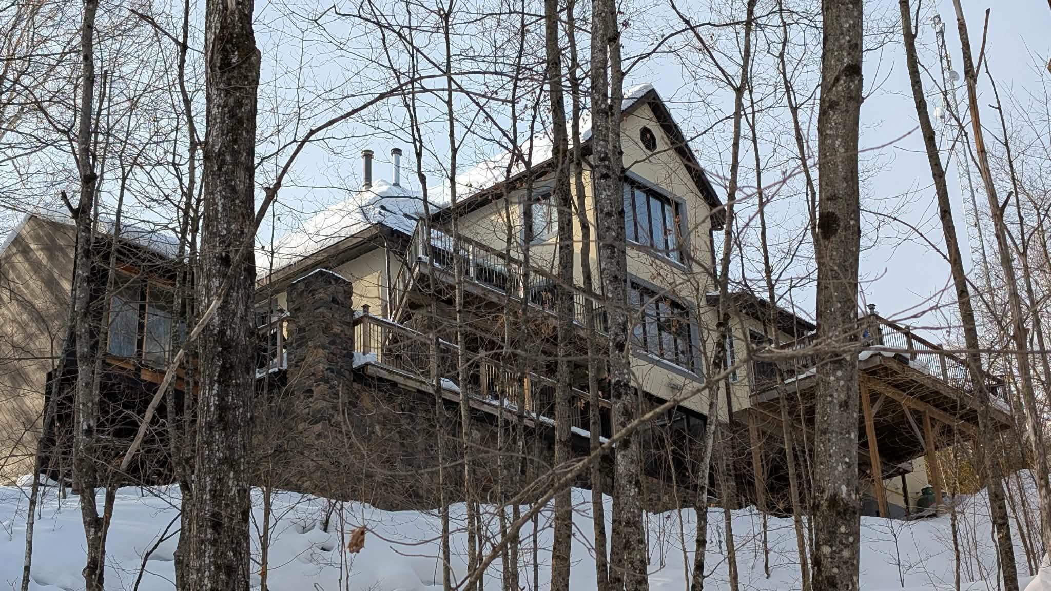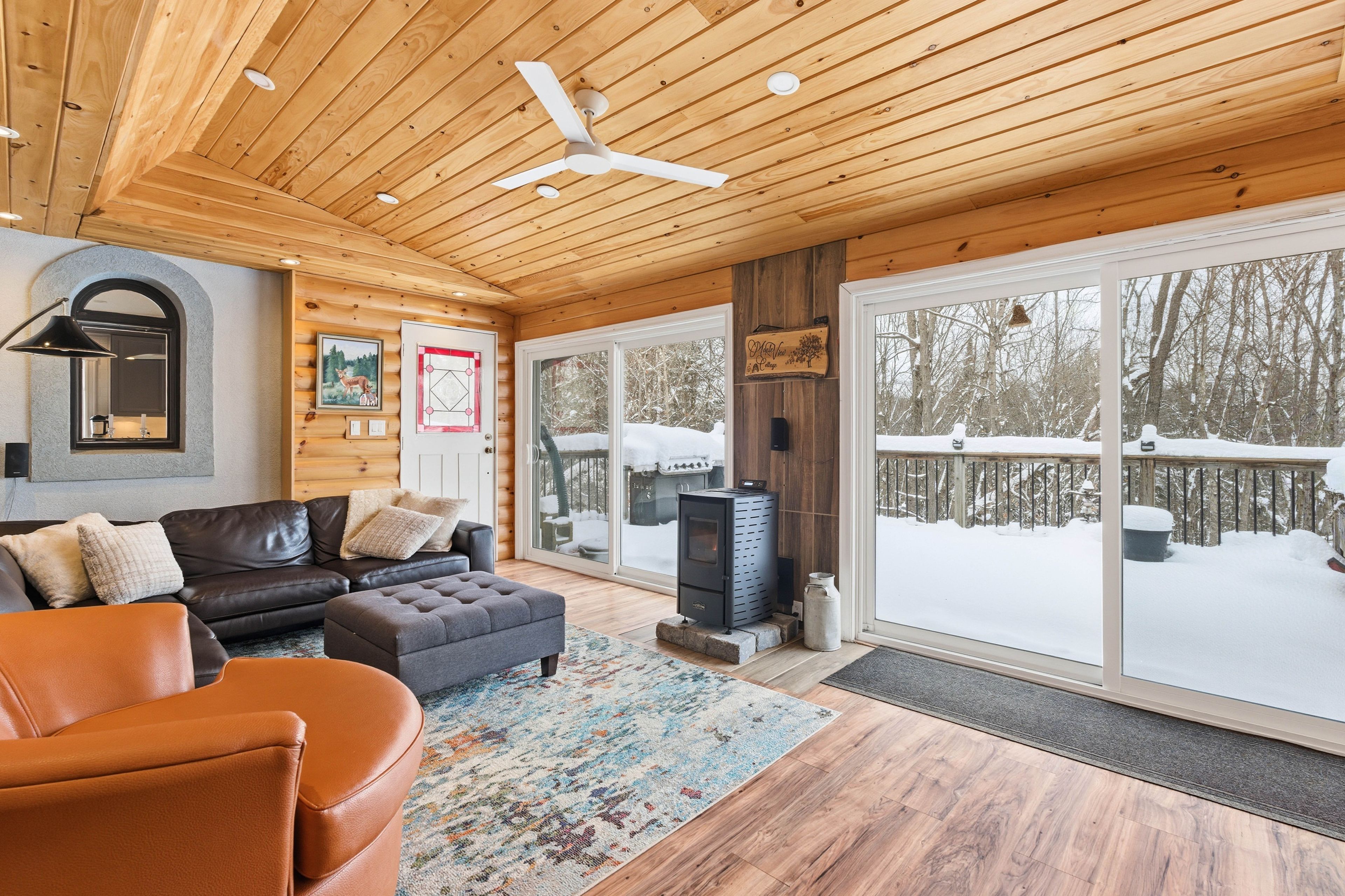 The property sits on 1.2 acres of land and is situated just minutes from the Heritage Trails for Snowmobiling, ATV riders and Hiking. Bancroft is surrounded by literally hundreds of lakes and Algonquin Park. What was previously a very successful Bed & Breakfast, this custom-Built Home is over 4,000 sq. ft. featuring a fully treed backyard and open side yard with shed, fire pit, and 8-person hot tub (2022).The home is thoughtfully designed, central vacuum, propane furnace (2013), and main-floor laundry. The main level showcases hardwood flooring, pot lights, crown moulding, and coffered ceilings. A large living room features a wood-burning fireplace, while the spacious foyer includes a 2-piece powder room. Two bedrooms with ensuites on the main floor, with one bedroom offering access to a private deck. A bright 4-season sunroom provides year-round enjoyment and includes a(2024) high-efficiency, WiFi-enabled pellet stove.The custom chef's kitchen is exceptionally well equipped with quartz countertops, three sinks, built-in double ovens, 5-burner electric cooktop with pot filler, coffee station, side-by-side fridge and freezer, two dishwashers, wine cooler, kick sweep, and over- and under-cabinet lighting.The primary offers walk-in closet, and workout room. The luxurious 6-piece ensuite features a spa-style tub area with faux fireplace, heated towel racks, walk-in shower with rain head and bidet.The walkout basement is impressively spacious with room for a bar, games area, kitchenette, wine cellar, 2-piece powder room, additional full bathroom, ample storage, two walkouts, a propane fireplace installed in 2023, and a 2nd laundry hookup. Outdoor living is enhanced by a 3-season gazebo/bunkie with full electrical service, accessible from the lower deck or side yard.The garage features an electric lift to attic storage and stairs leading to the upper home entry.A truly distinctive property combining craftsmanship, luxury, and space in a private natural settings.