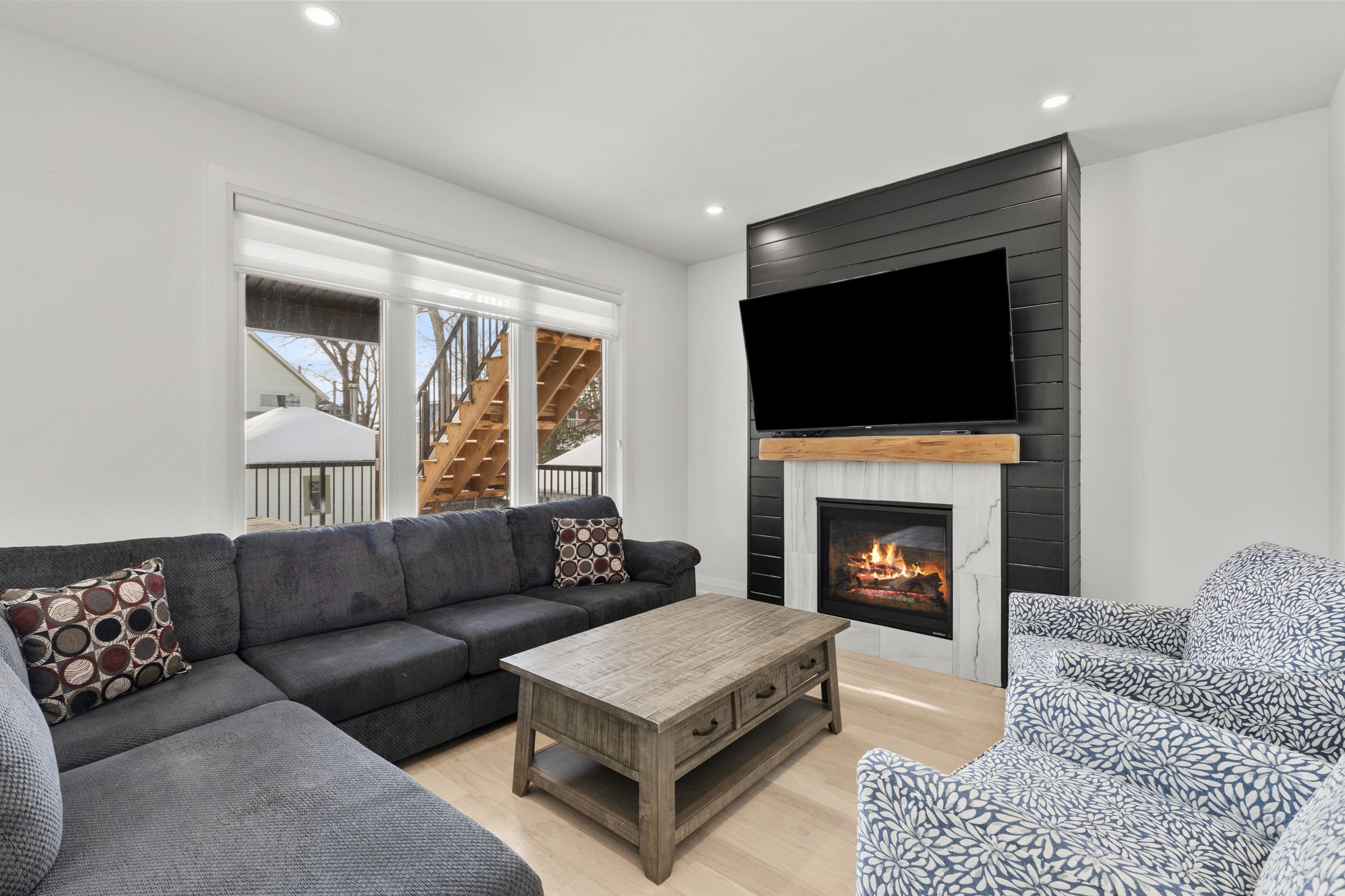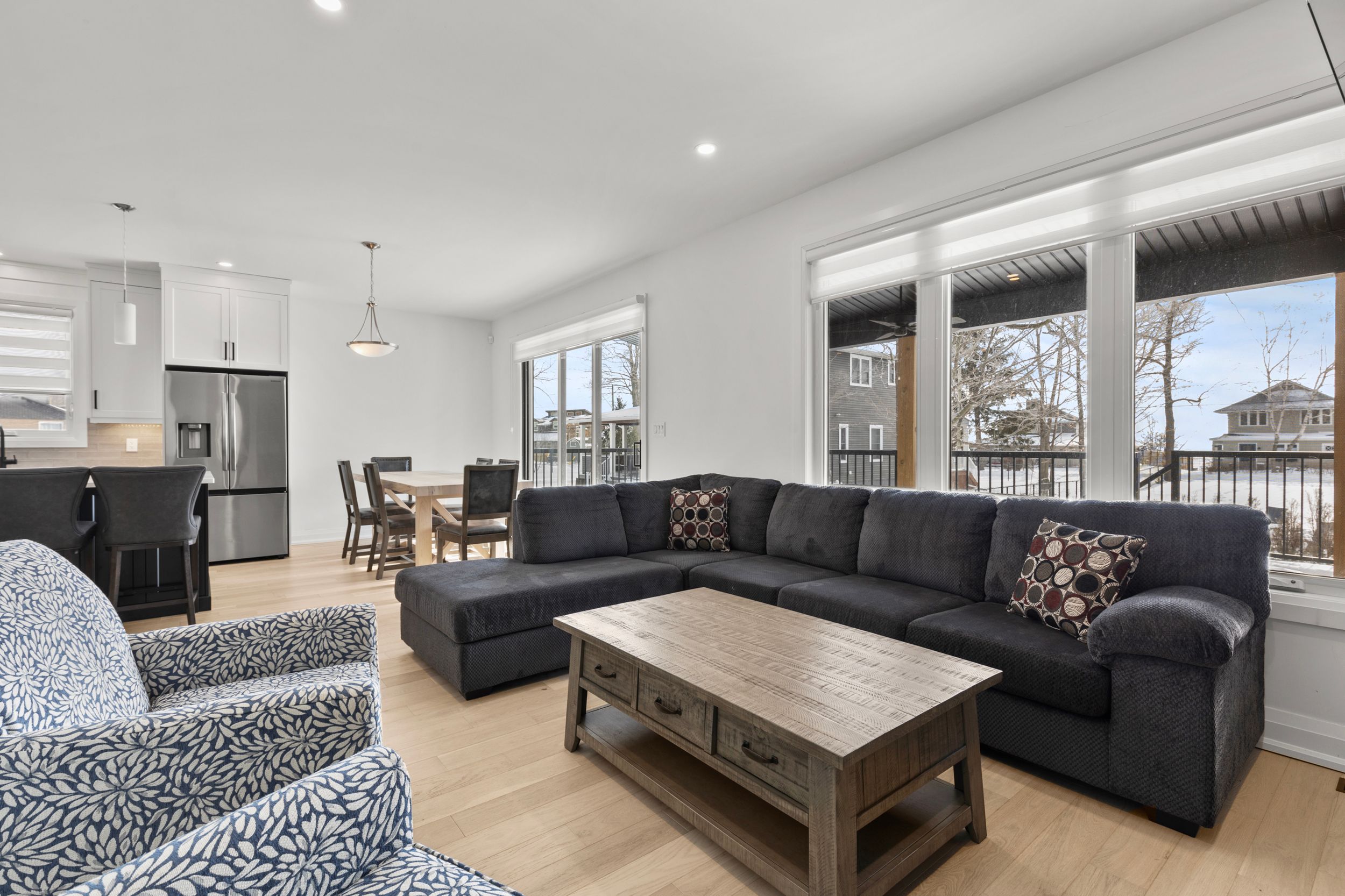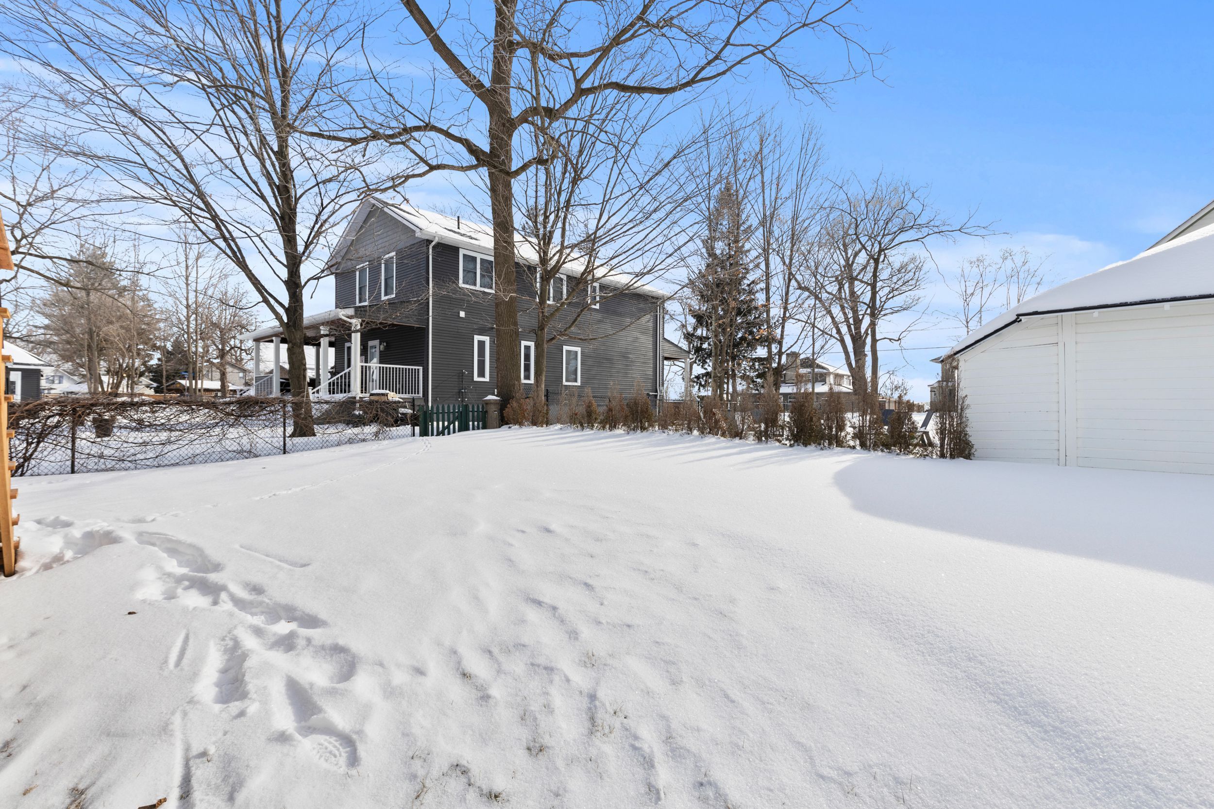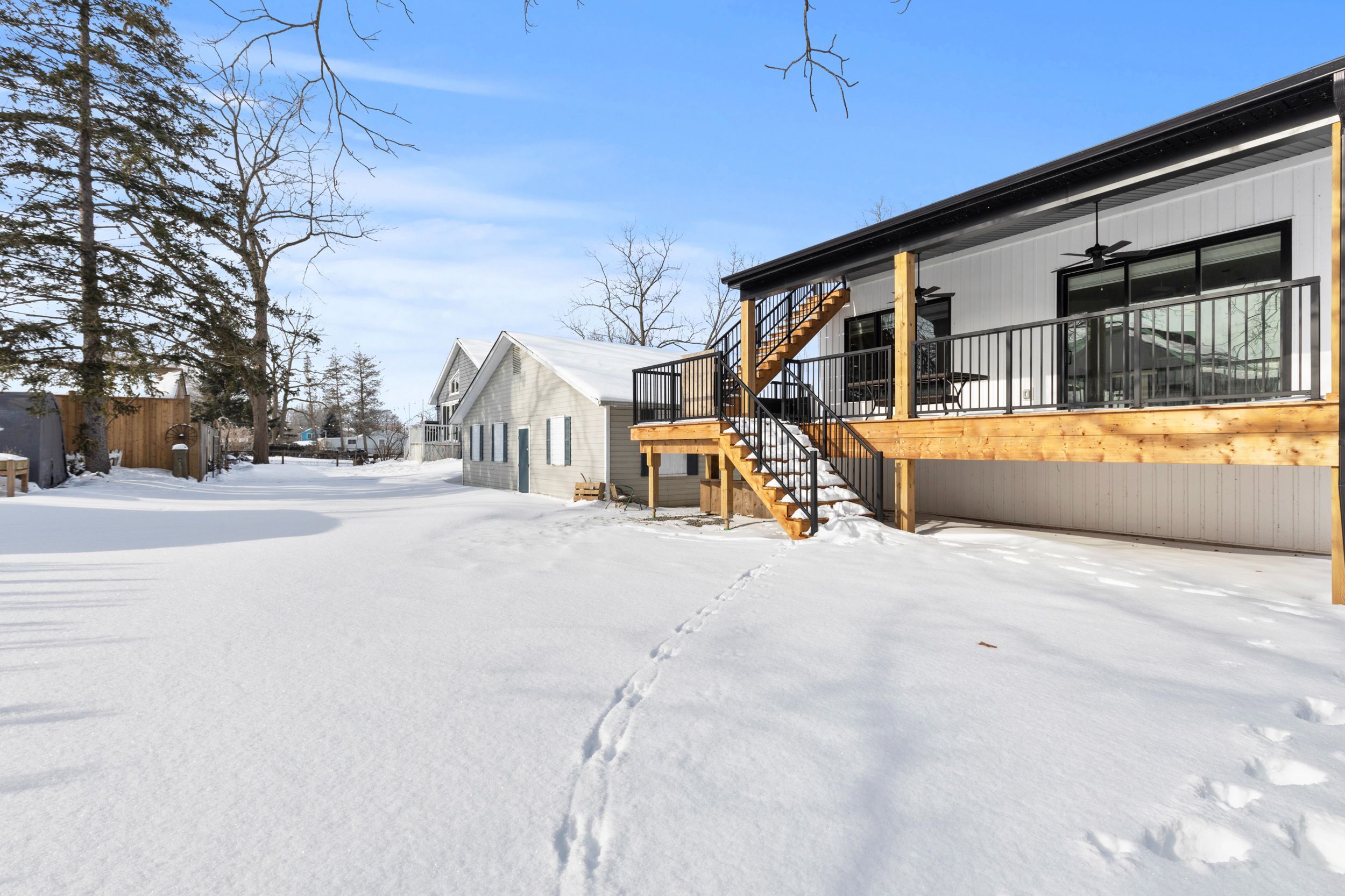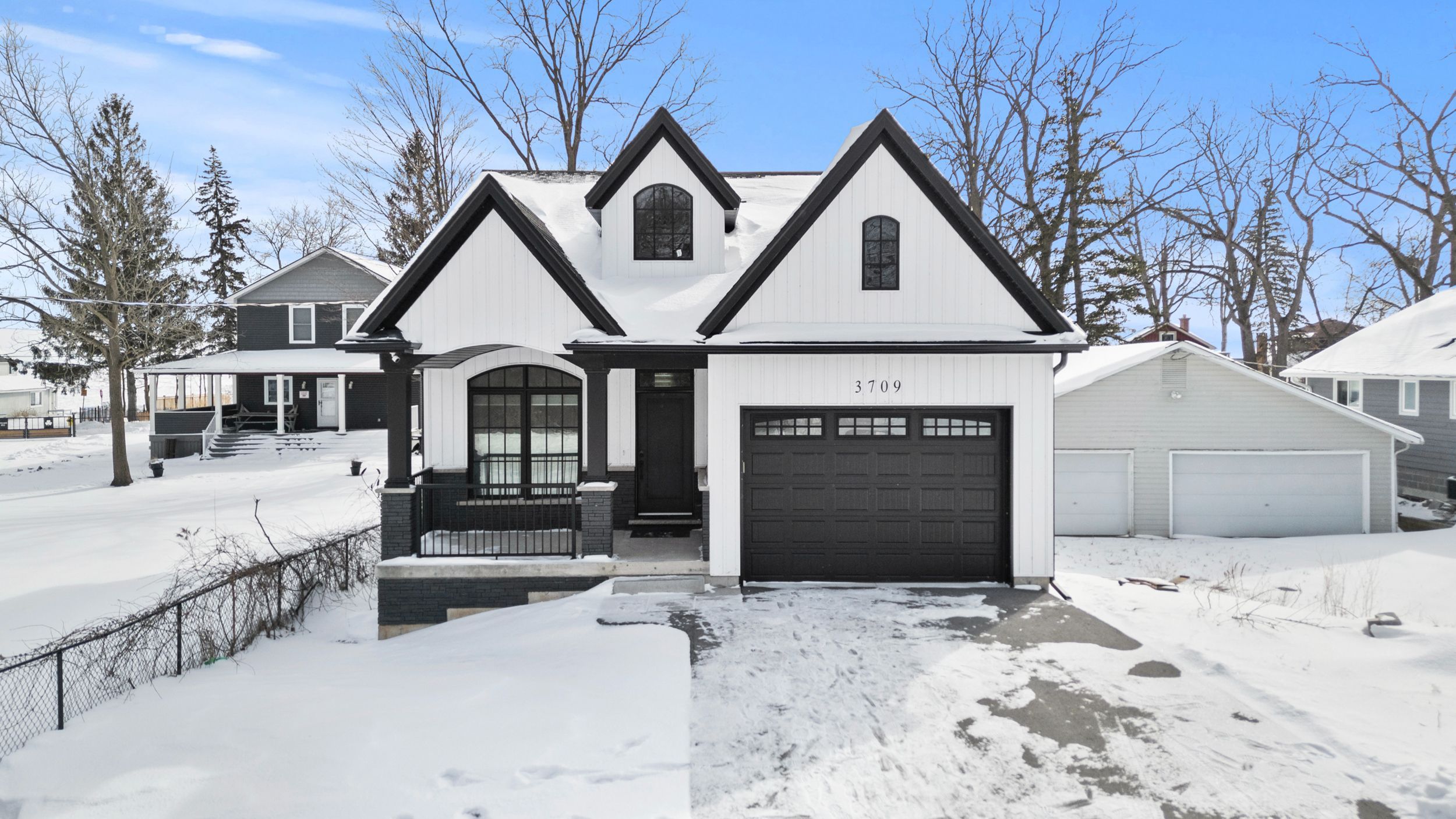 Experience effortless lakeside living in this beautifully designed bungaloft, where modern style meets relaxed comfort just steps from the Lake Erie waterfront. The classic black-and-white exterior with board-and-batten detailing makes a striking first impression, enhanced by an attached garage and inviting covered front porch. Inside, white oak hardwood floors and abundant natural light create a warm, airy feel throughout the open-concept living space. The designer kitchen is a true showpiece, featuring floor-to-ceiling cabinetry, quartz countertops, and a statement wine wrack. Expansive patio doors lead directly to the back deck, with stairs connecting to the upper balcony-ideal for seamless indoor-outdoor entertaining. Unwind in the inviting living room with a cozy gas fireplace, or take the gathering outside. The thoughtfully designed layout offers four bedrooms and 2.5 bathrooms, including a serene primary suite with a sleek ensuite. The loft level is a standout, offering two additional bedrooms, a full bathroom, and access to an expansive terrace-perfect for hosting under the stars, enjoying lake breezes, or taking in peaceful evening views. With multiple outdoor living spaces, lake views from the rear, and an unfinished basement ready for your vision, this home delivers a refined yet relaxed lifestyle just moments from the water.