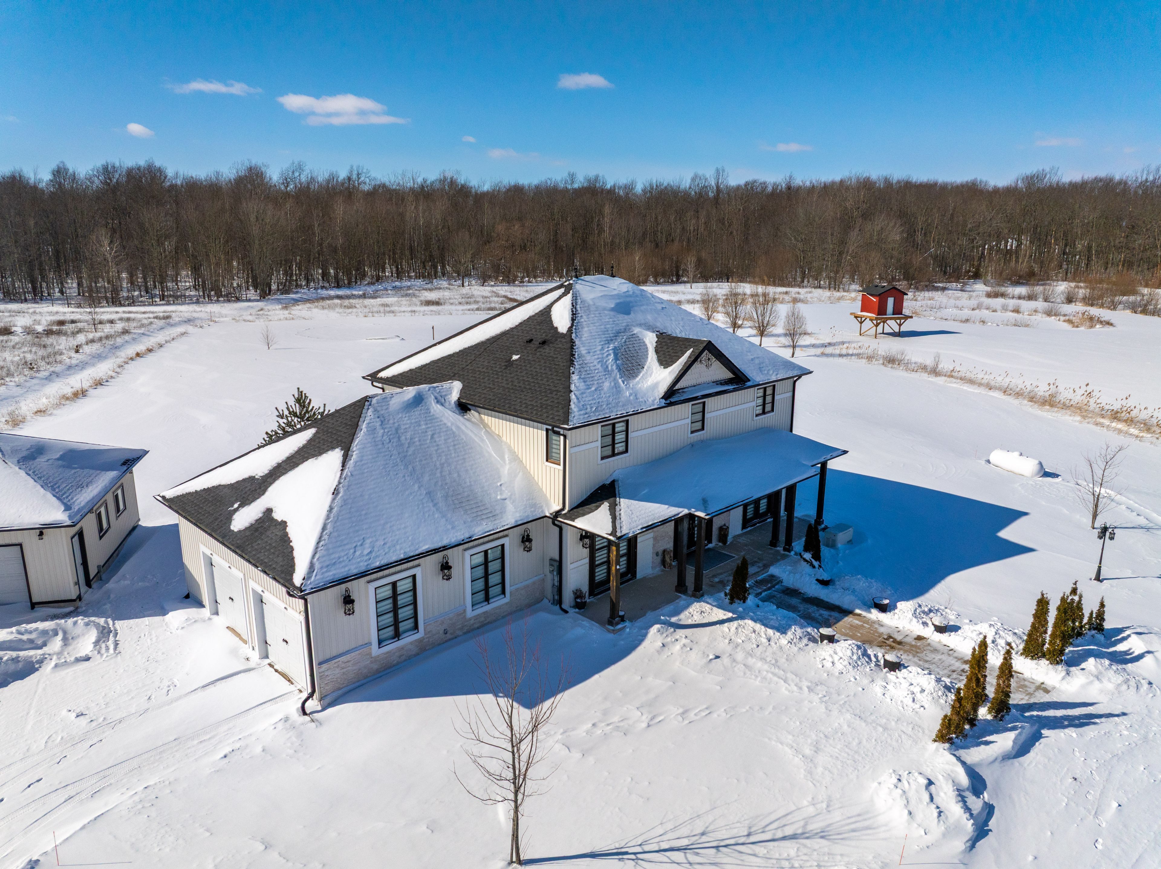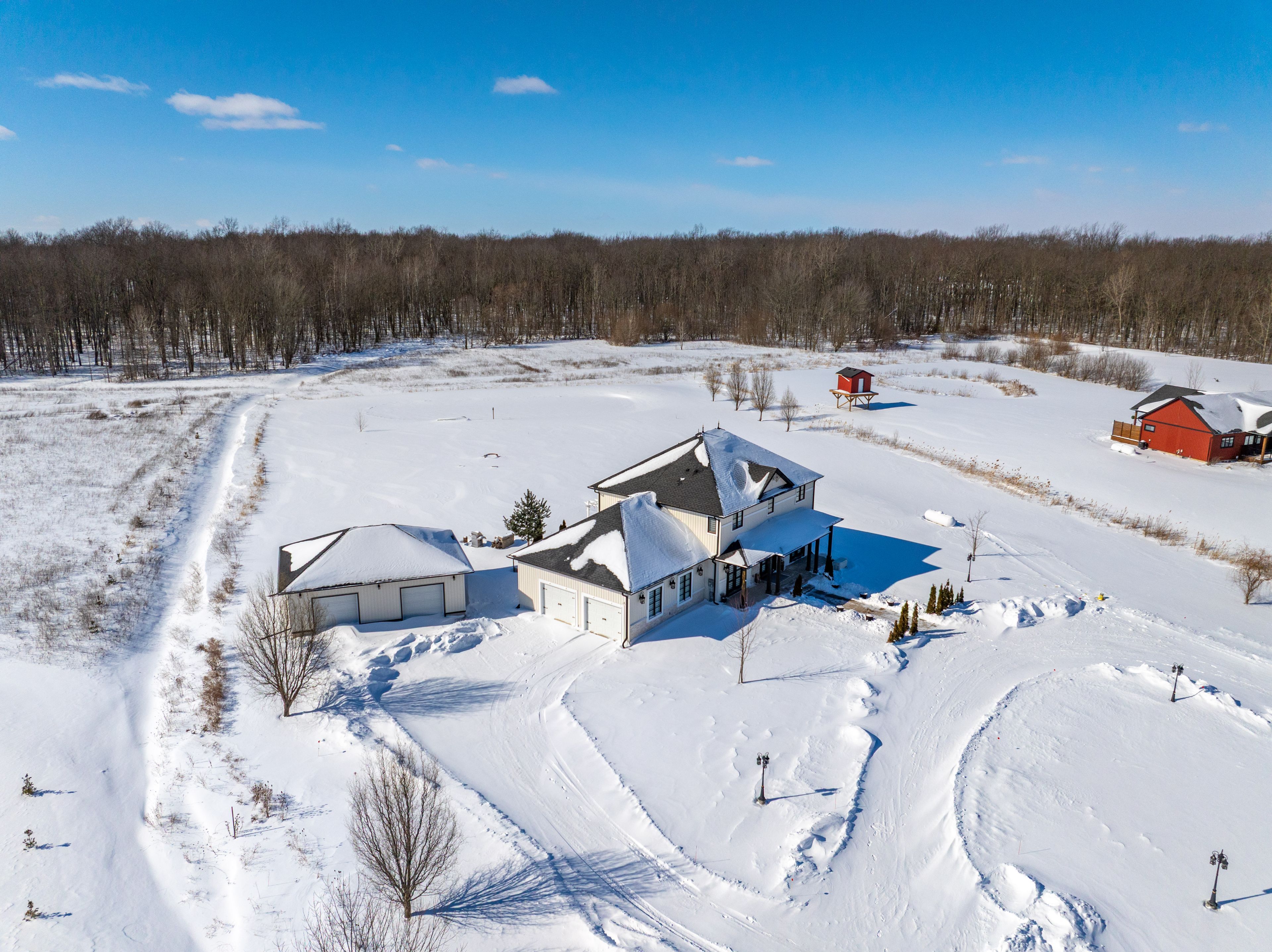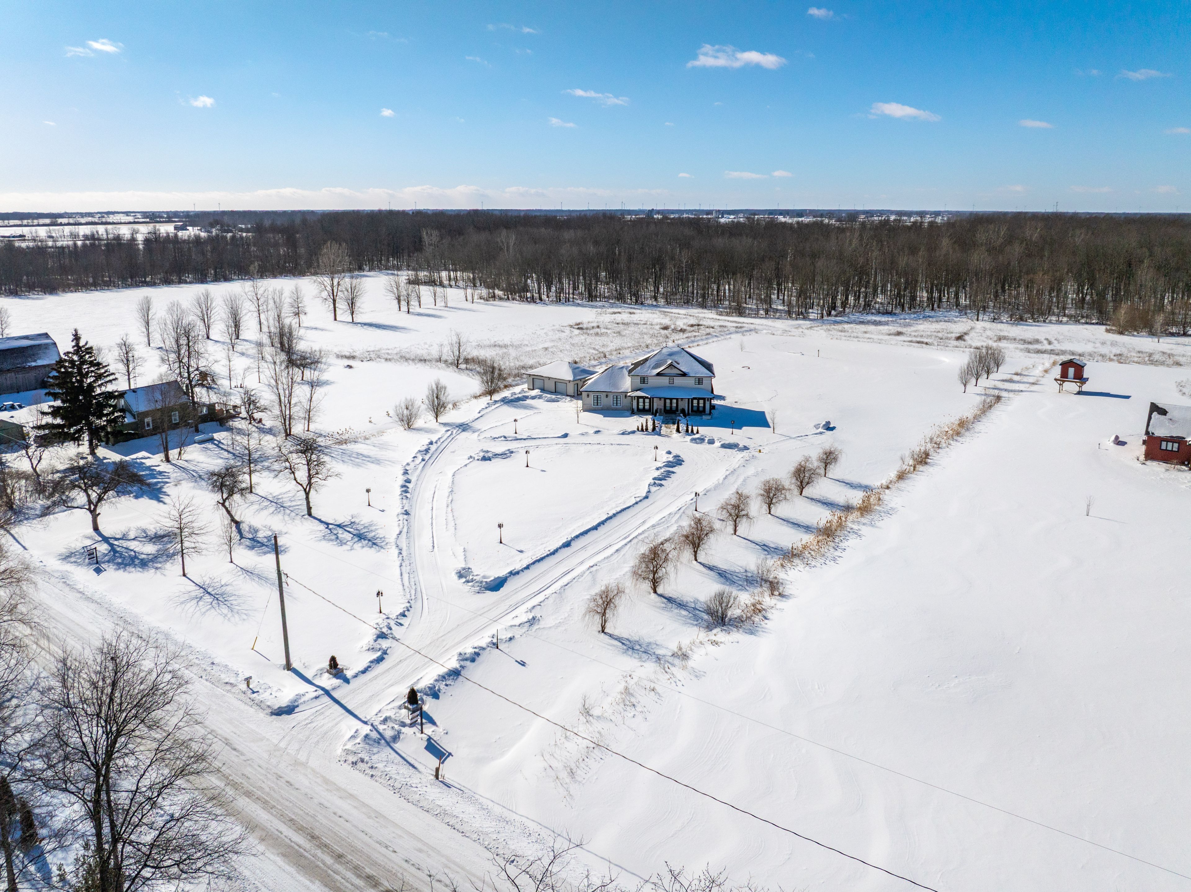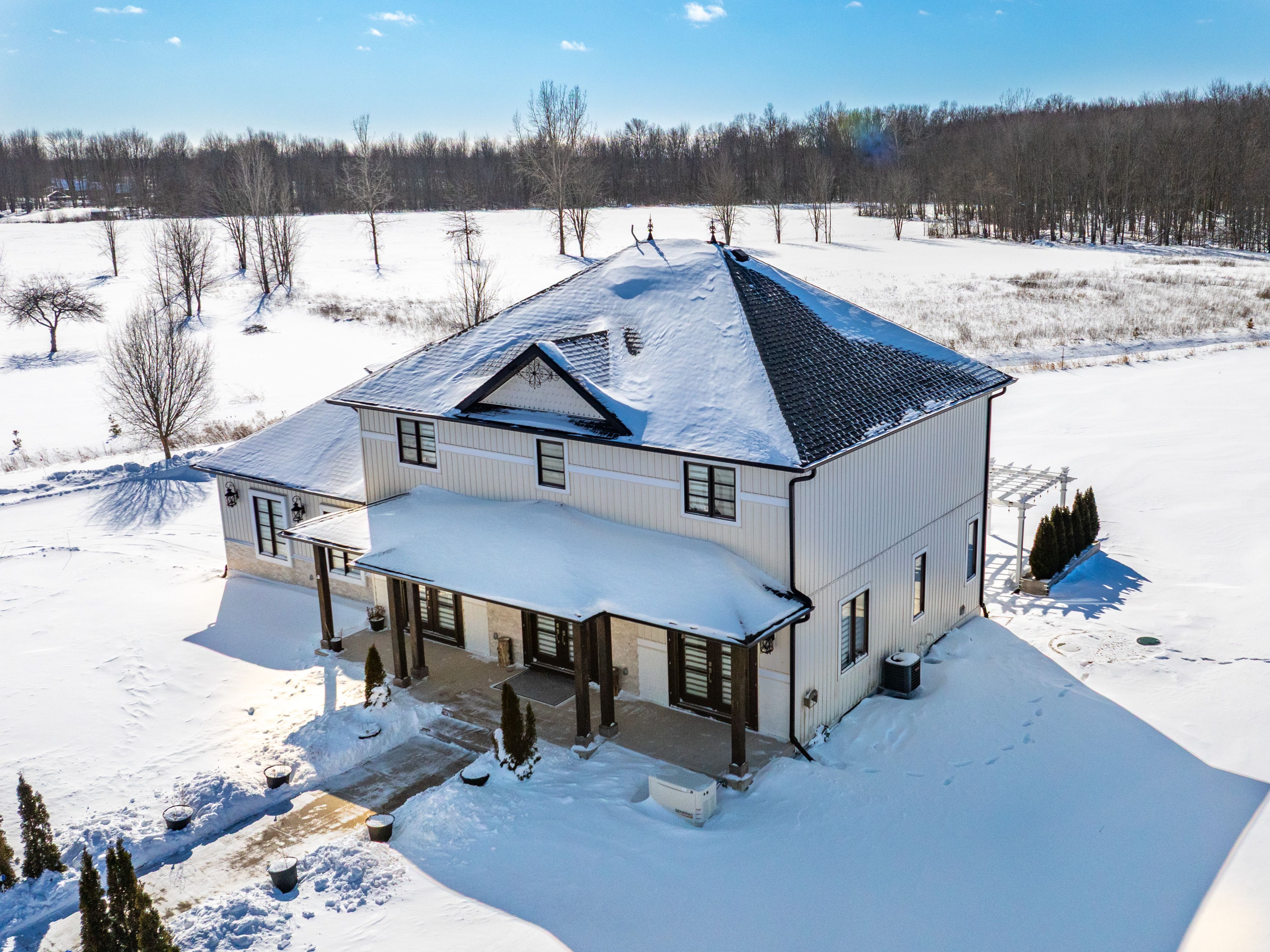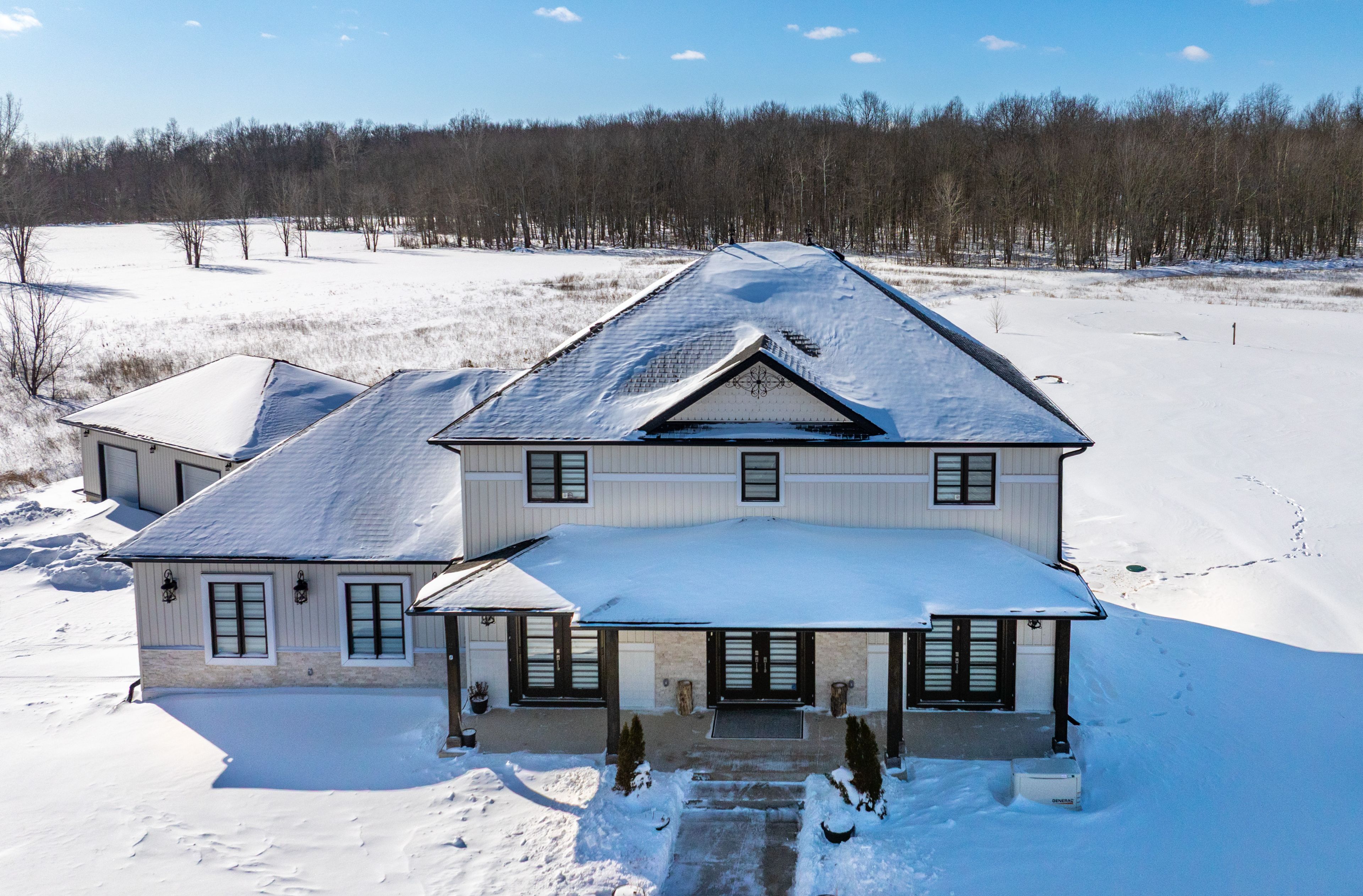 Exquisite custom-built home on 2.8 acres with pond, offering the perfect balance of country serenity and modern luxury.Bathed in natural light with 9' ceilings throughout, the heart of this home is a chef's kitchen featuring an oversized island, built-in appliances, and a butler's pantry, ideal for effortless entertaining. The rear of the home opens to tranquil landscaped views, seamlessly blending indoor and outdoor living.Hosting is effortless with a full-sized formal dining room, while upstairs boasts three generously proportioned bedrooms, including a primary suite with walk-in closet and luxurious ensuite. The fully finished basement provides two additional bedrooms, a full bath, and a media-style recreation room, with a walk-up to the oversized two-car garage.Step outside to a spacious patio overlooking the expansive grounds, perfect for entertaining or enjoying the peace and privacy of this stunning property. A detached, fully serviced and insulated oversized garage adds remarkable versatility for hobbies, a home business, or vehicle storage. Generac generator ensures uninterrupted comfort and peace of mind.Enjoy the tranquility of a rural setting without compromise: high-speed internet, reliable cellular service, mail delivery, and well-maintained winter roads ensure convenience and ease. On the school bus route. Ample parking, a circular driveway, and quick access to Welland and Port Colborne make this property the ultimate combination of luxury, privacy, and accessibility.