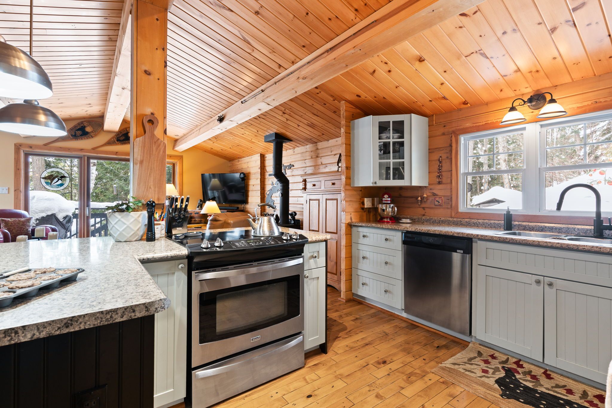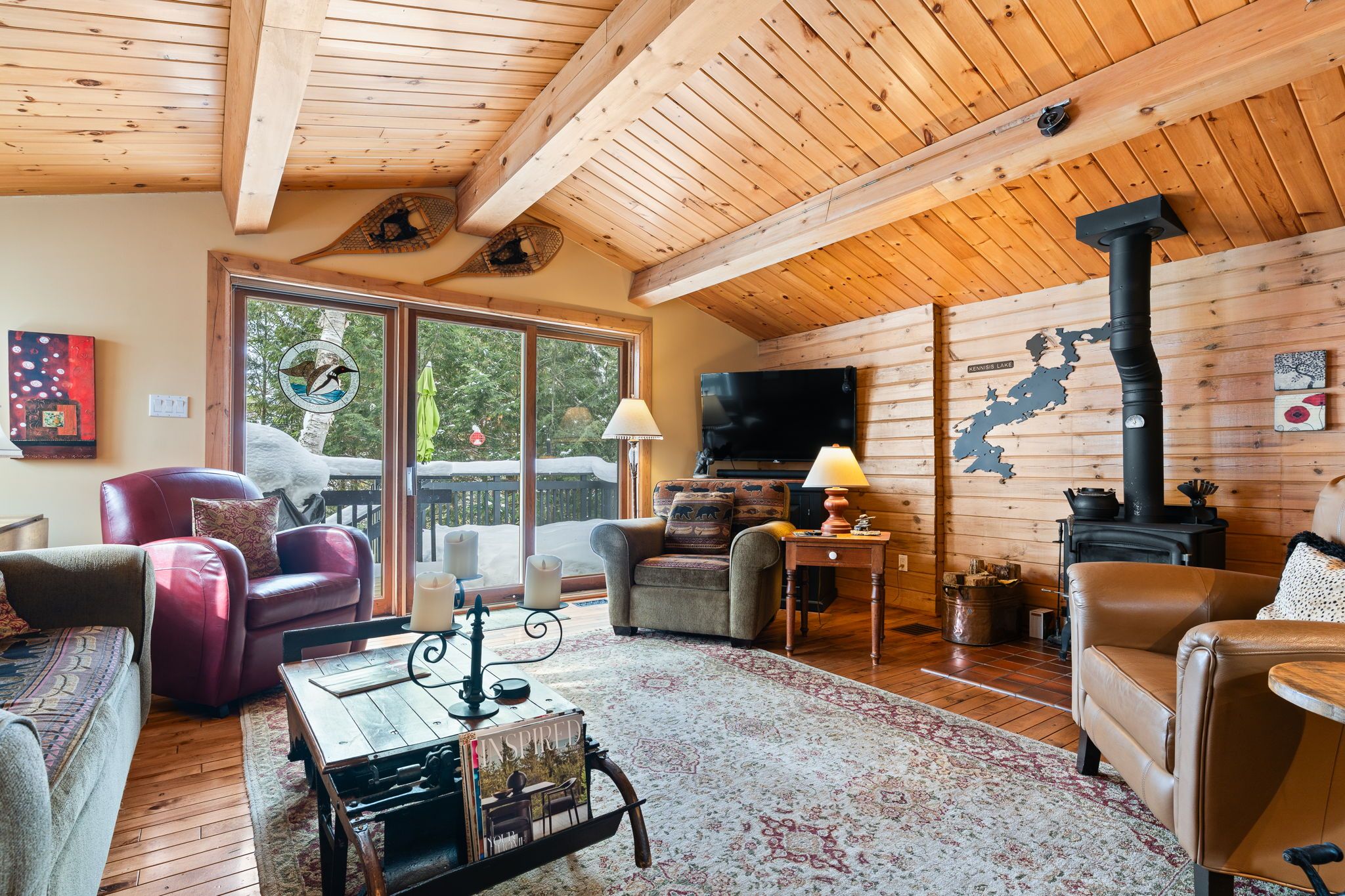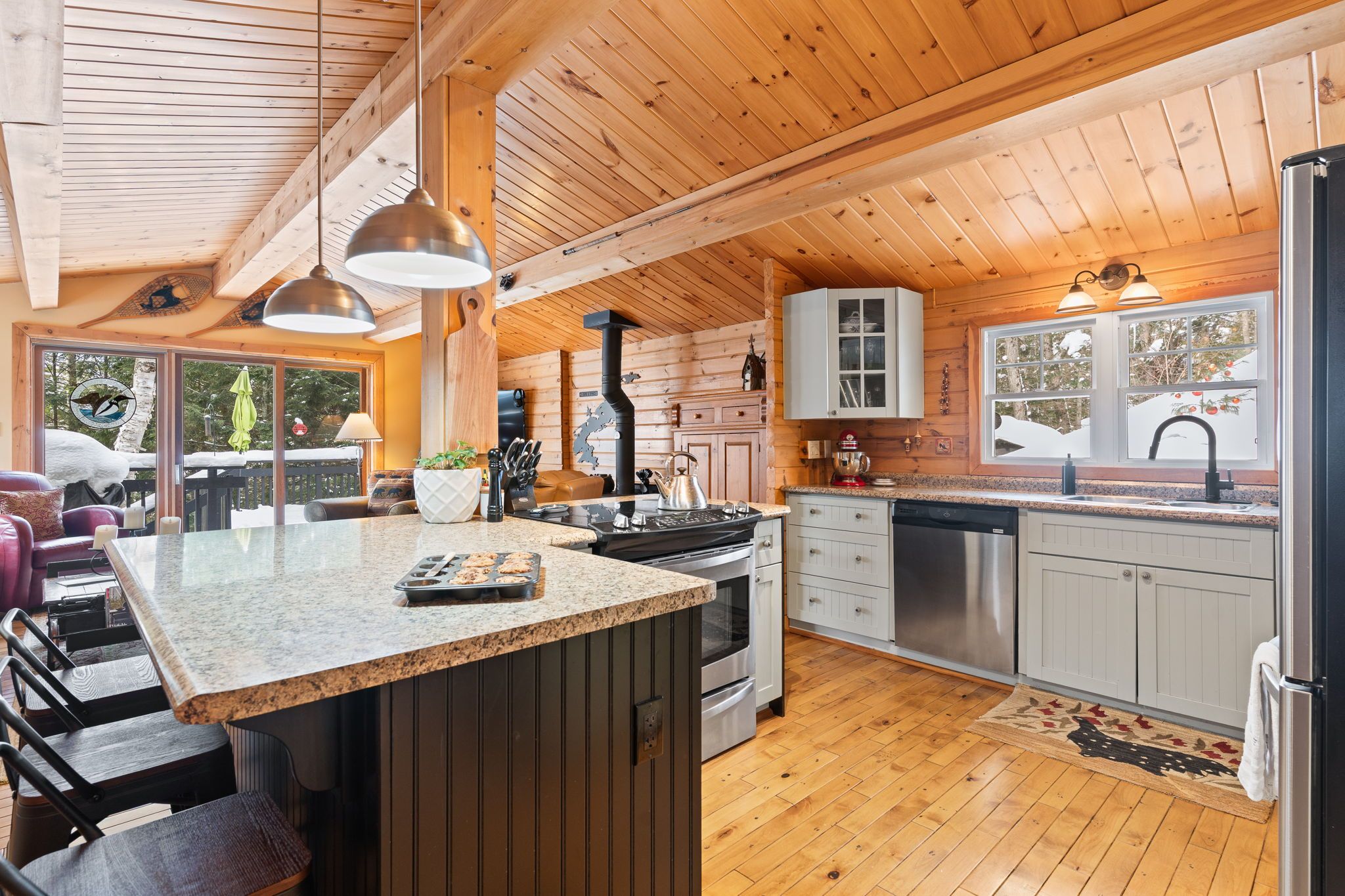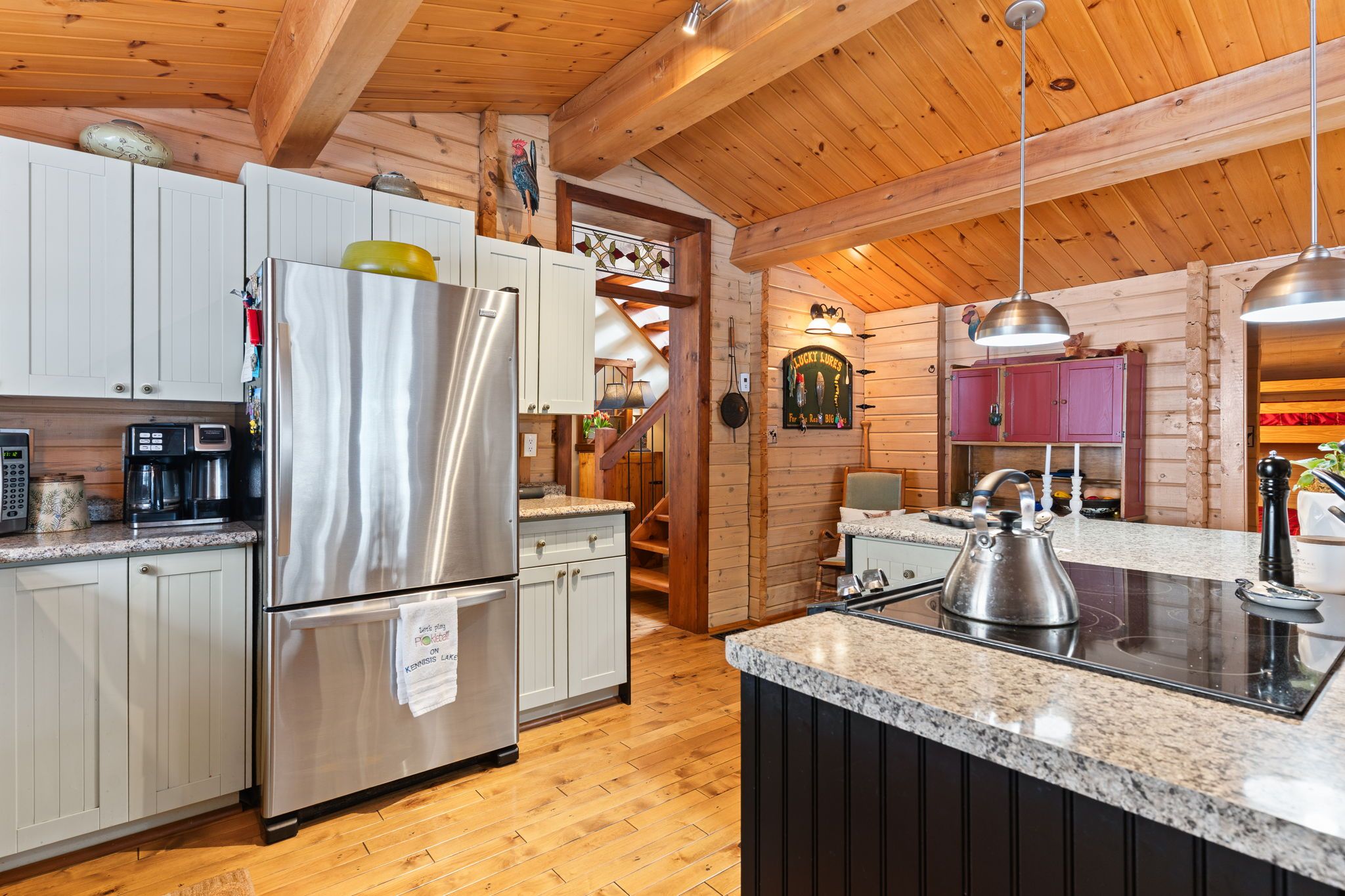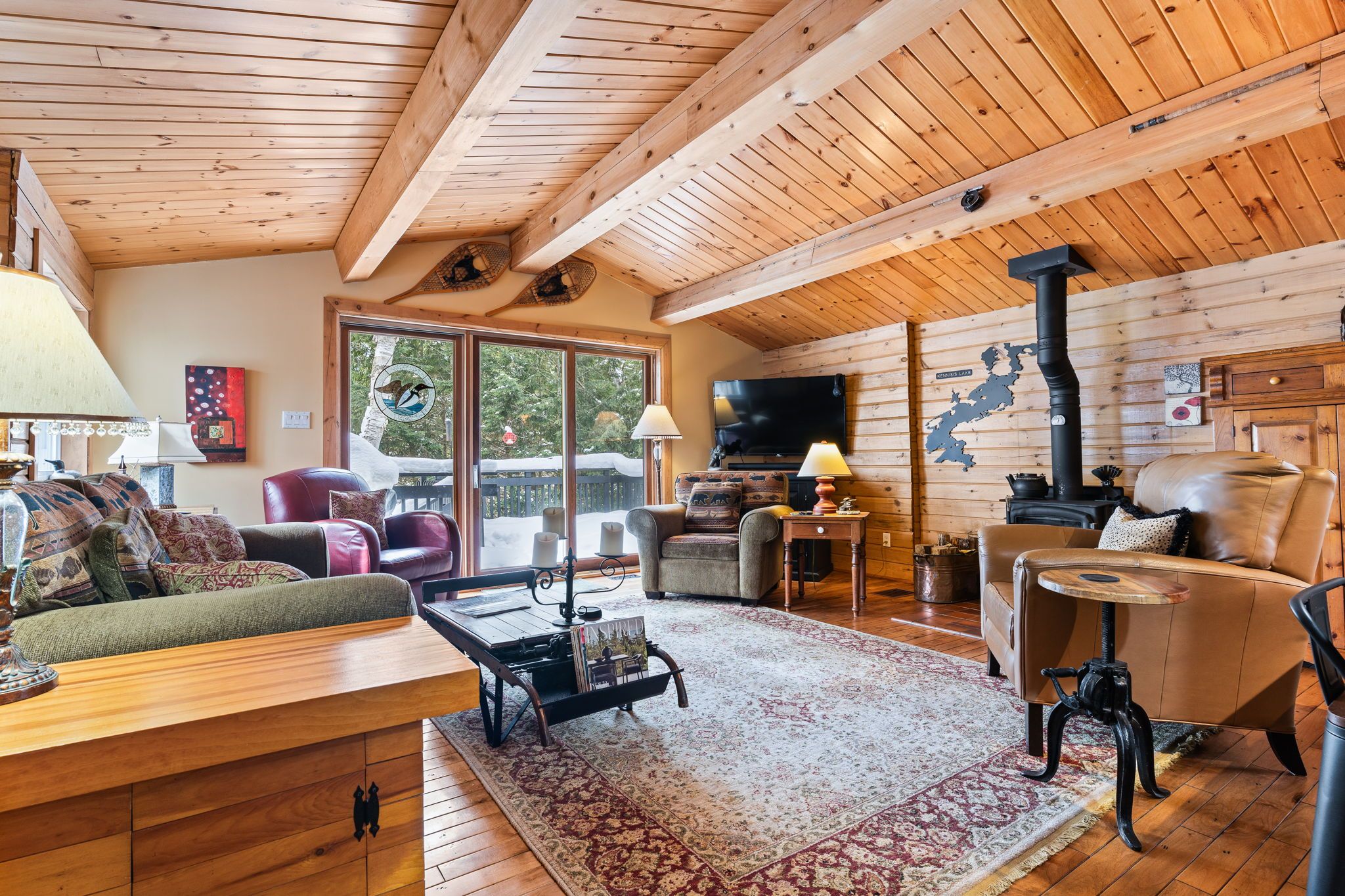 Welcome to a hidden gem on one of Haliburton's most sought-after lakes Little Kennisis part of a desirable two-lake chain known for its pristine water and natural beauty. This four-season waterfront retreat offers coveted south-western exposure, filling the home with warm natural light and breathtaking views. Inside, the open-concept living and kitchen area showcases soaring pine ceilings, beautiful BC distressed Alderwood flooring, and a cozy woodstove creating the perfect cottage-meets-home atmosphere. The kitchen features a large island, stainless steel appliances, and excellent entertaining space, while the separate dining room is bright and inviting with lots of windows. The main floor offers two spacious bedrooms and a full 4-piece bathroom. Upstairs, escape to your private primary suite complete with a spa-inspired ensuite featuring heated floors, a soaker tub, and a walk-in glass shower. Convenient second-floor laundry adds to the thoughtful layout. Recent window upgrades improve energy efficiency and year-round comfort. After a day on the lake, unwind in the separate electric sauna for the ultimate relaxation experience. Outside, the sloping lot leads to a large lakeside deck and 144 feet of sand-and-stone shoreline with deep, crystal-clear water ideal for swimming, boating, and waterfront entertaining. Located beside Haliburton Forest & Wildlife Reserve, enjoy endless year-round outdoor activities. The active Kennisis Lake Association and vibrant marina offer pickleball courts, dining, live entertainment, and a true sense of lake community. Experience the best of Haliburton lake living - privacy, recreation, and natural beauty all in one exceptional property.