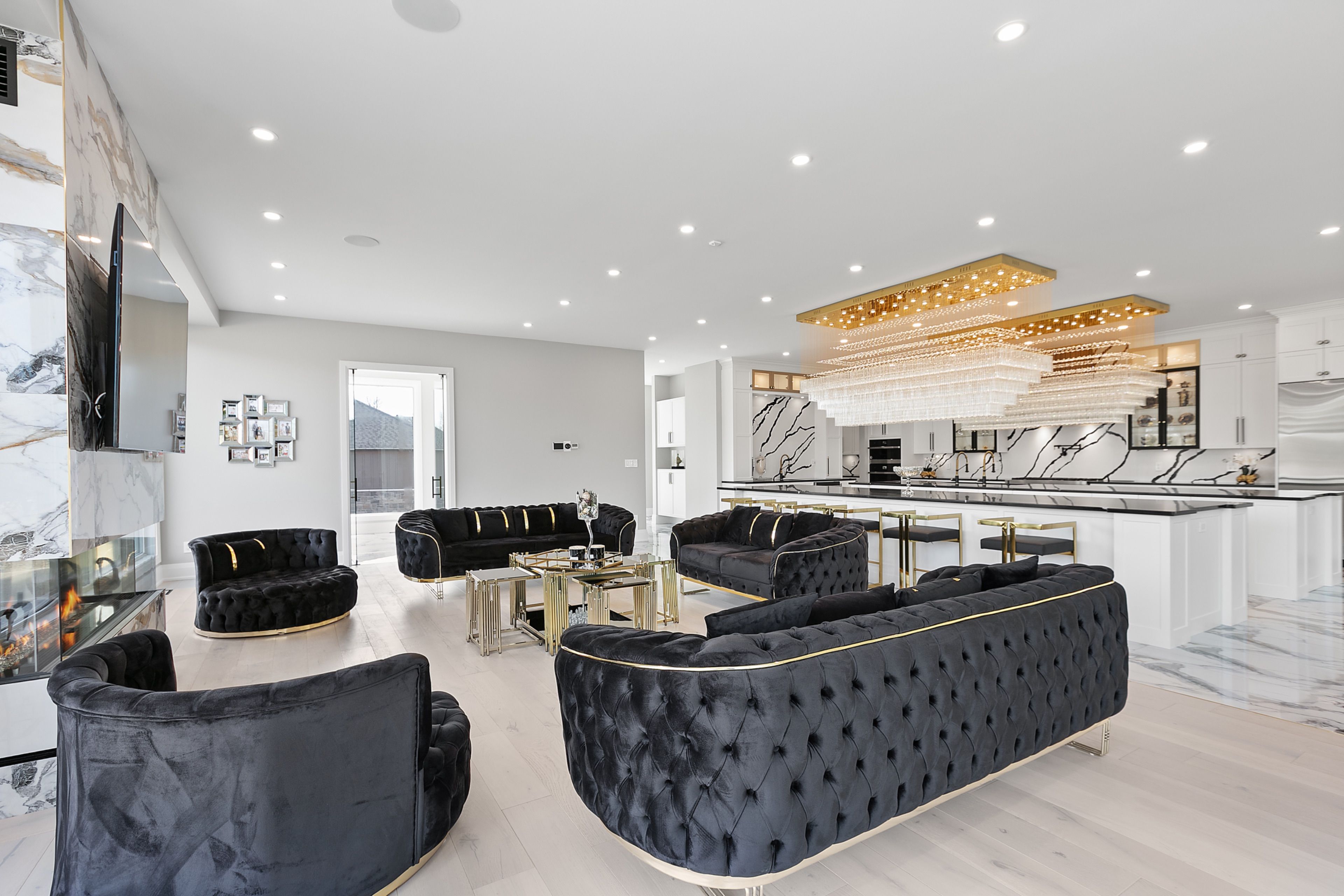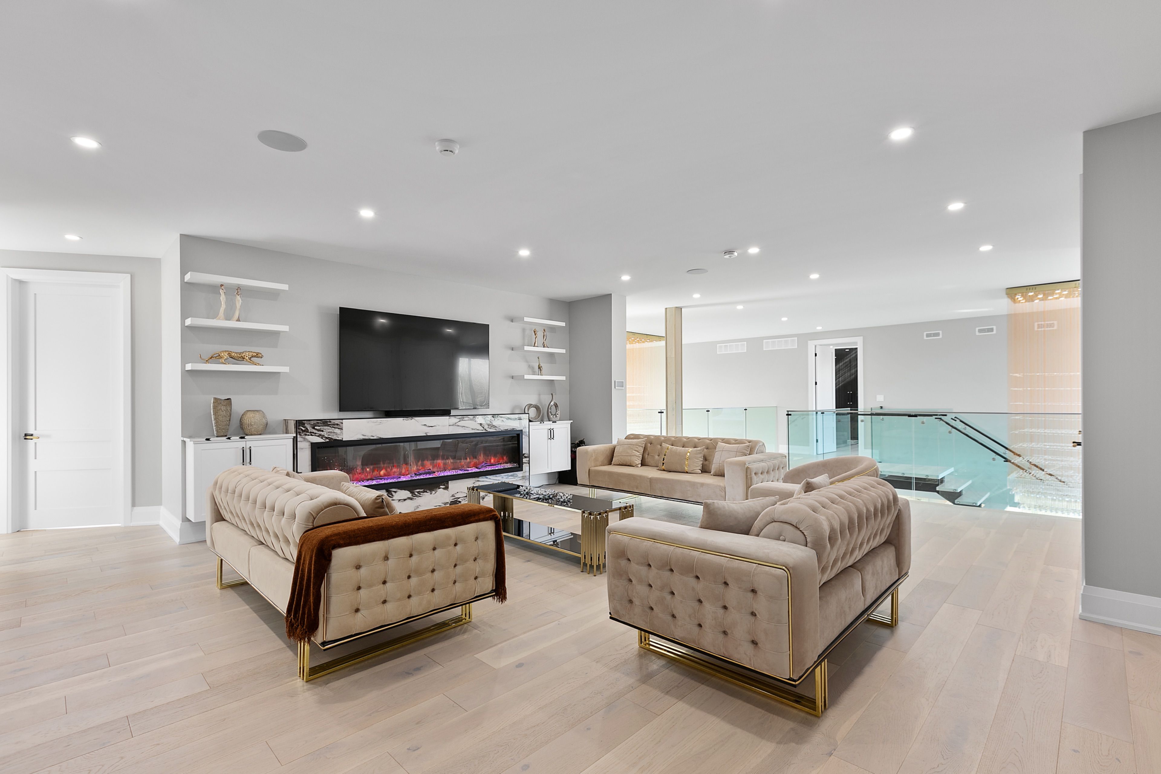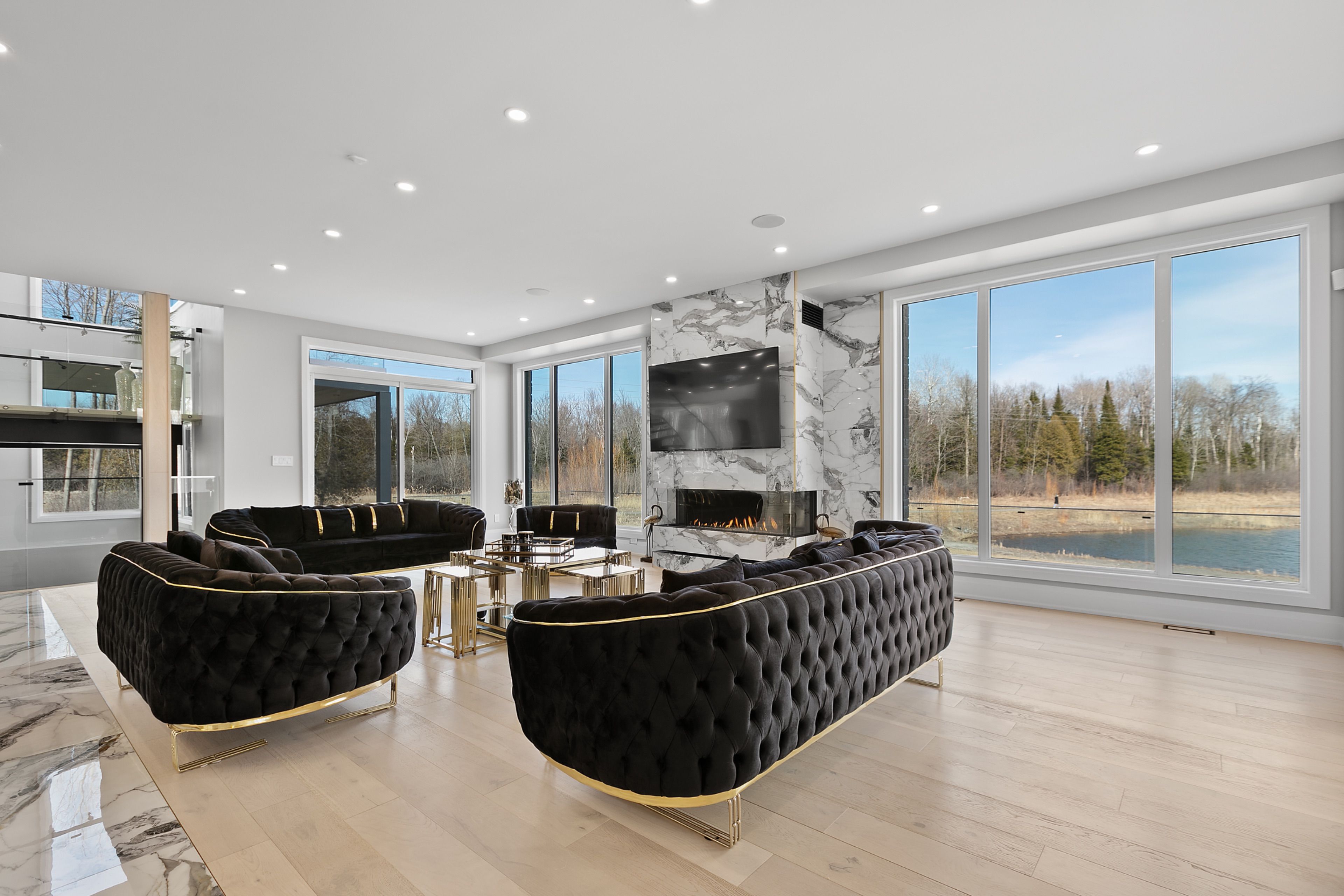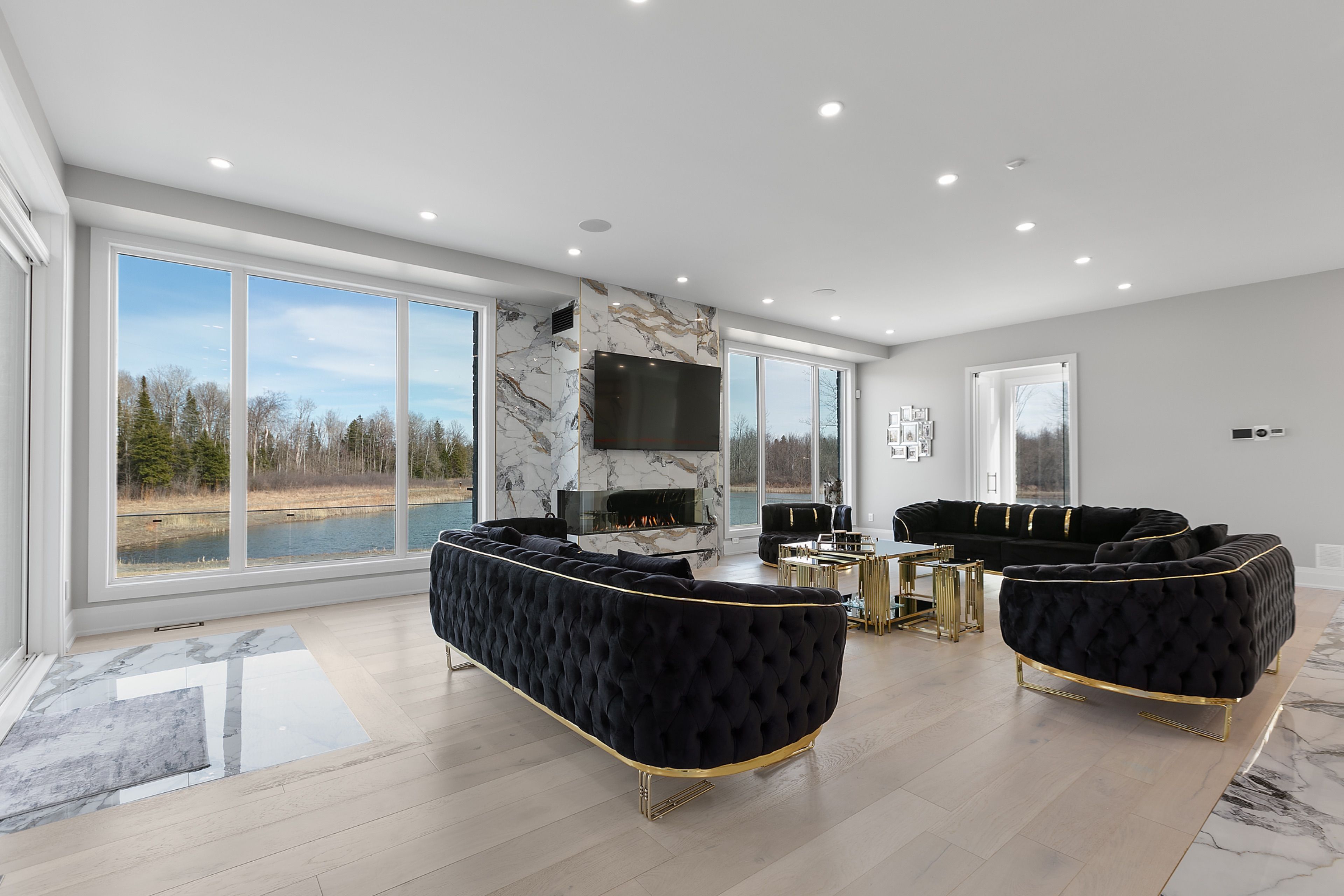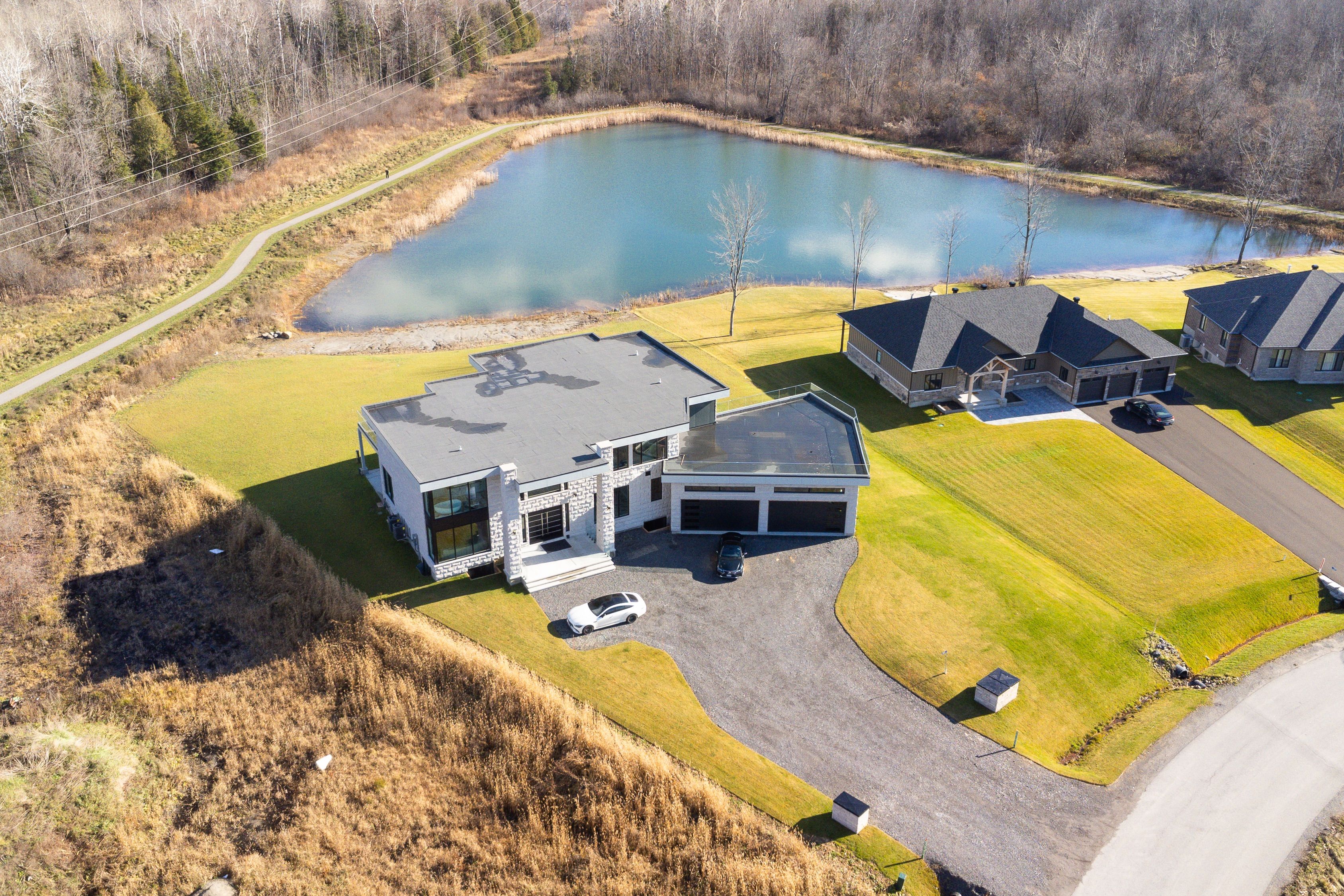 WATERFRONT LUXURY MASTER PIECE ON SUNSET LAKE! Situated on an extraordinary 38,947-square-foot lot with a private sandy beach, this 2023-built waterfront estate offers over 7,400 square feet of refined living space and breathtaking sunset views. Designed for both multi-generational living and grand entertaining, the home can be offered fully furnished at an additional cost, providing a seamless turnkey opportunity. A dramatic 19-foot foyer welcomes you into an elegant main level featuring 10-foot ceilings and an open-concept layout. The chef's kitchen is a true showpiece with two impressive 18-foot islands, premium Jenn-Air appliances, a 6-burner gas range, double ovens, a 36" fridge, separate 30" freezer, coffee bar, private butler's pantry, and walk-in pantry. The kitchen flows seamlessly into the lake-facing great room with fireplace and stunning water views. A ventilated sunroom and glass-enclosed study provide exceptional spaces for relaxation and working from home.The main floor also includes a laundry room, mudroom, full bath with pet wash, and access to a 5-car garage with 15-foot ceilings-ideal for car lifts.Upstairs, a spacious landing opens to a family room. The primary suite features a fireplace, private balcony, and spa-inspired ensuite with a soaking tub and dual sinks. Five additional bedrooms, three full baths, a second laundry room, and an expansive terrace perfect for entertaining complete the level.Outdoor living is exceptional, with multiple balconies, a covered hot tub area with outdoor fireplace, and direct waterfront access from the private sandy beach. The semi-finished basement is pre-wired with plumbing rough-ins, offering endless potential for a gym, theatre, or custom retreat. A rare opportunity to own a true lakeside masterpiece combining luxury, scale, and spectacular natural beauty for creating family memories.