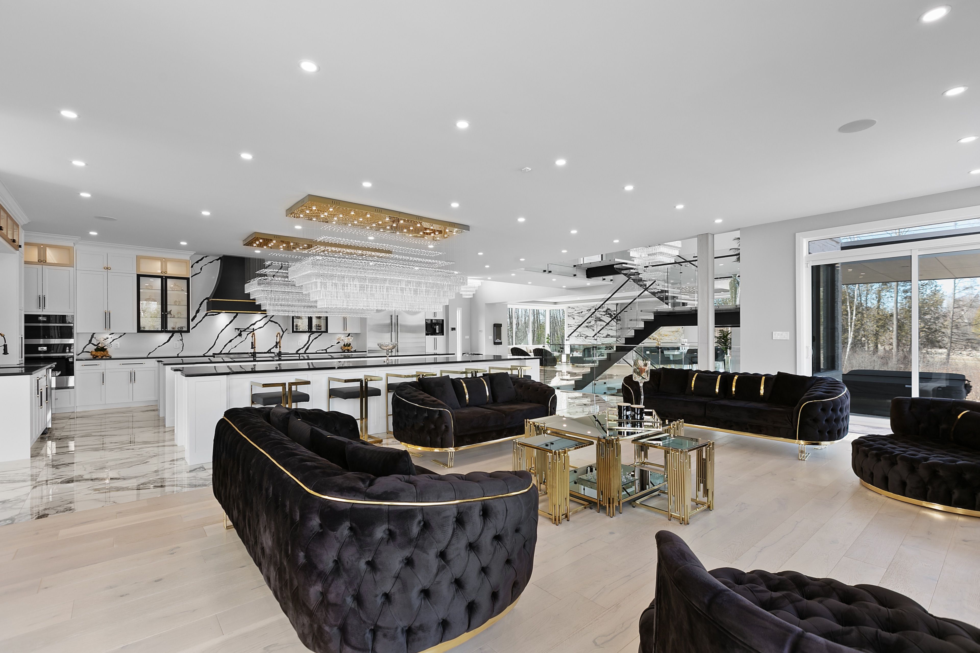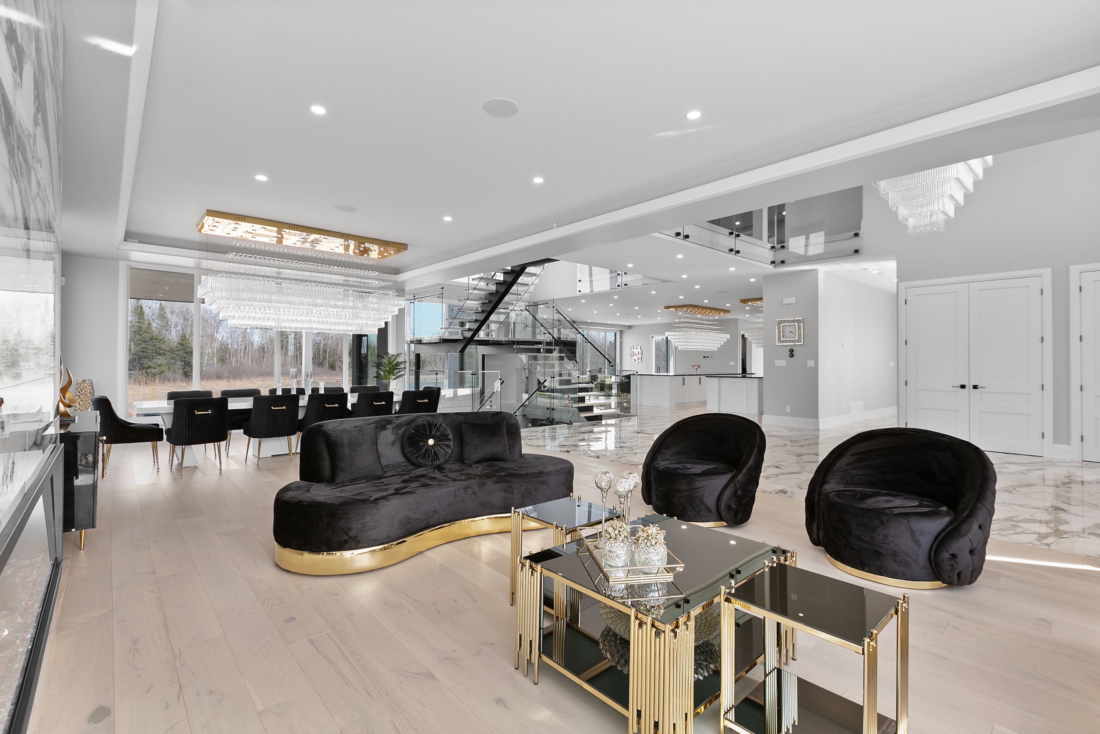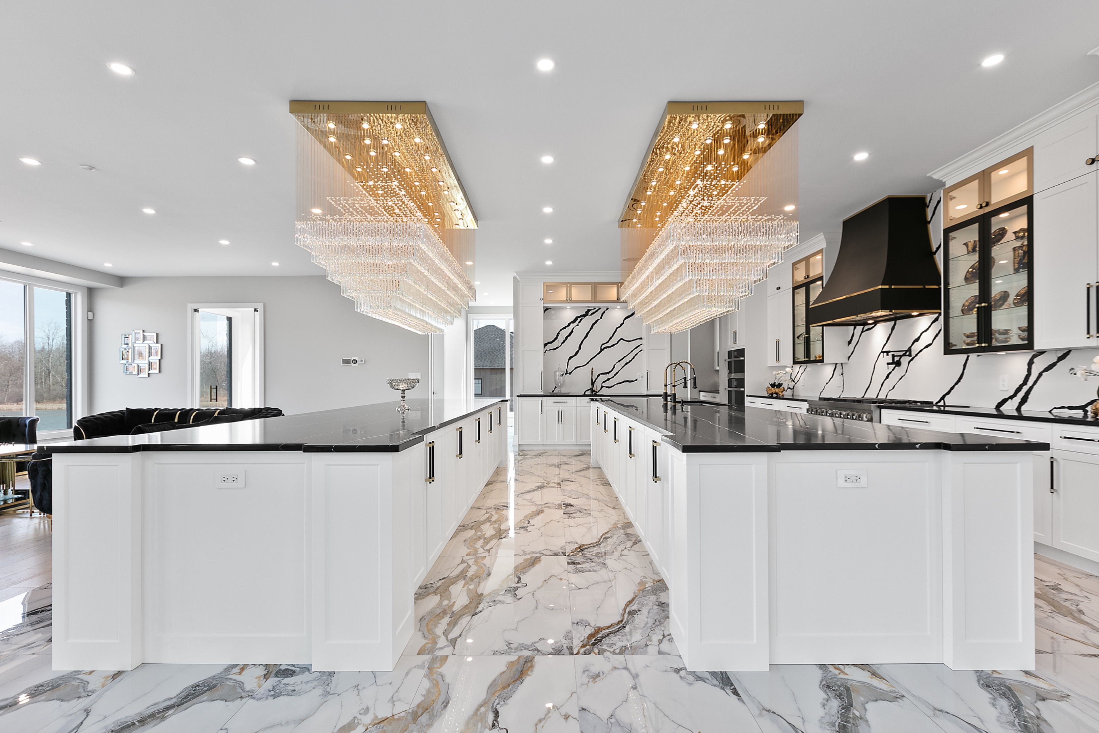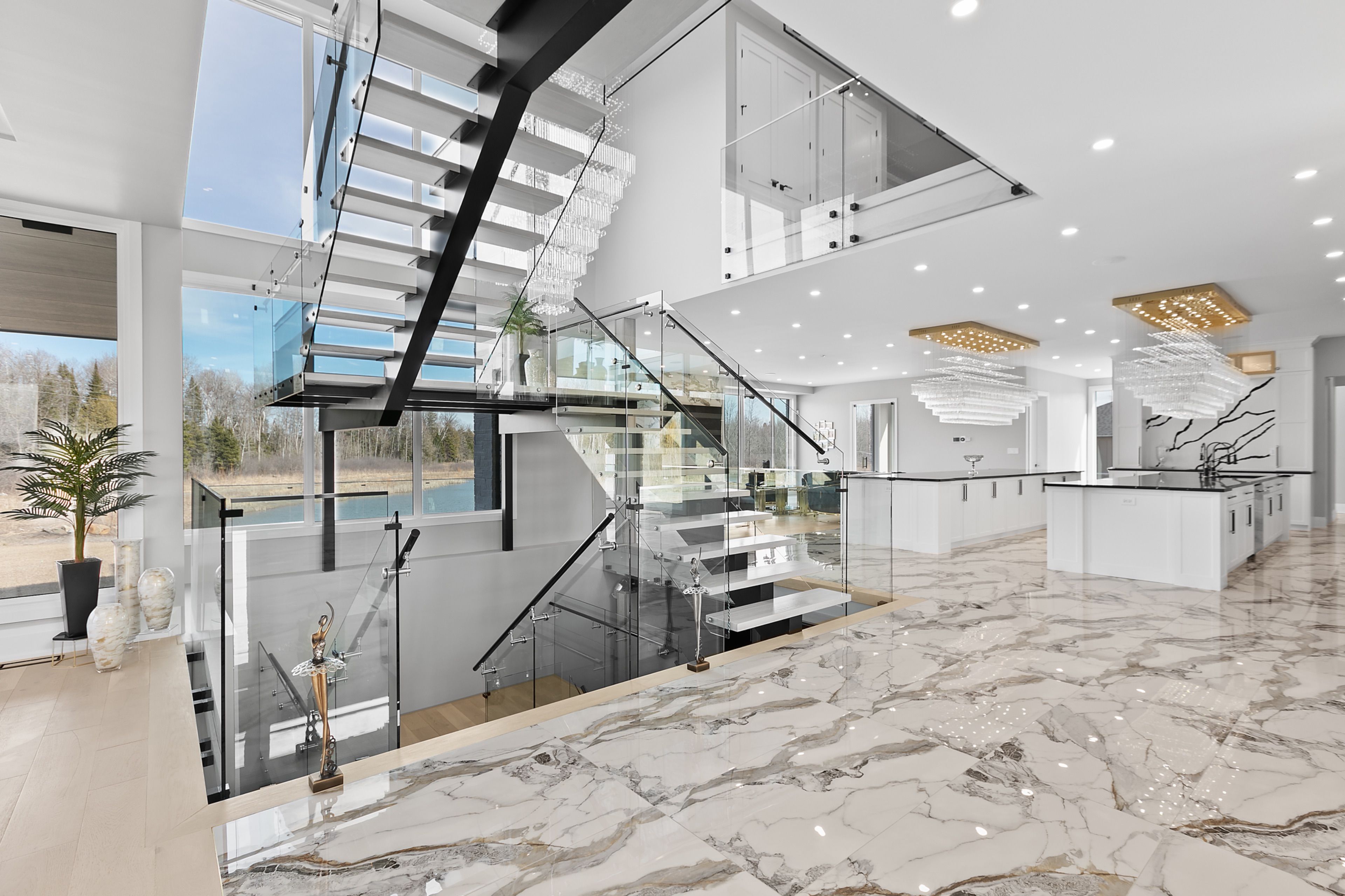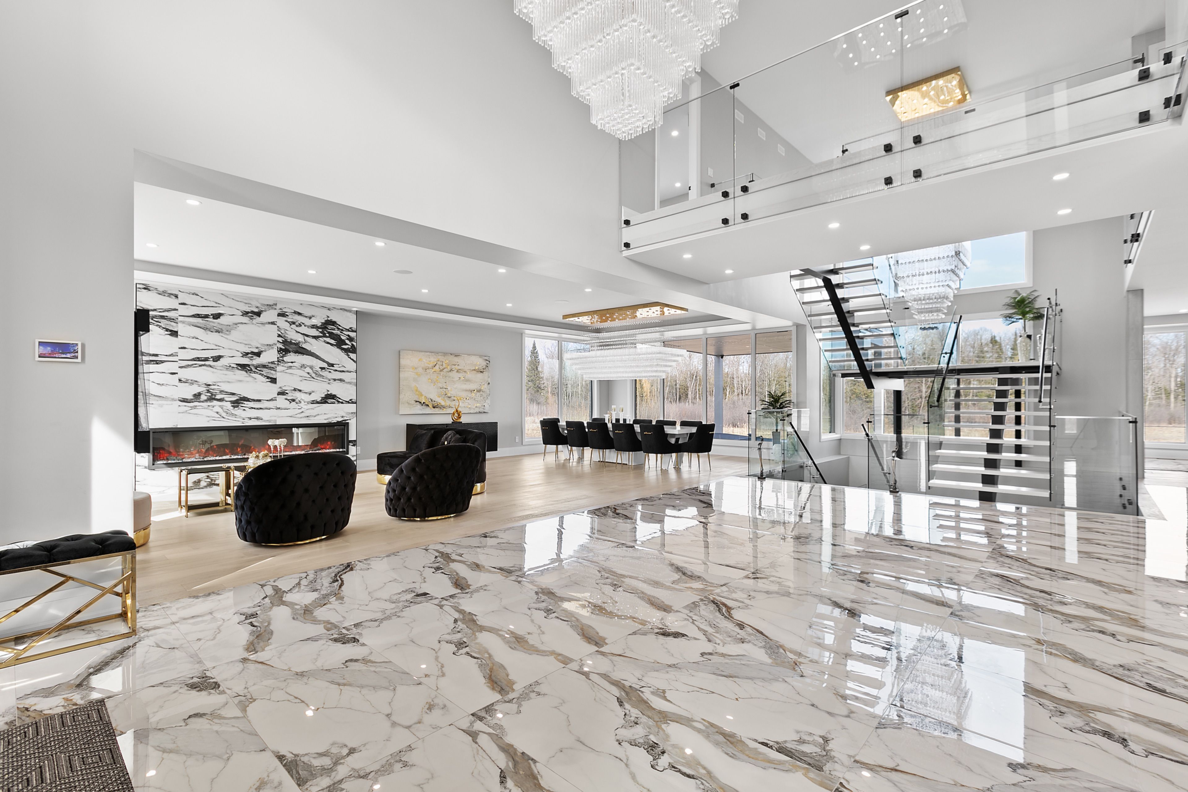 WATERFRONT LUXURY MASTER PIECE ON SUNSET LAKE! Situated on an extraordinary 38,947-square-foot lot with a private sandy beach, this 2023-built waterfront estate offers over 7,400 square feet of refined living space and breathtaking sunset views. Designed for both multi-generational living and grand entertaining, the home can be offered fully furnished at an additional cost, providing a seamless turnkey opportunity. A dramatic 19-foot foyer welcomes you into an elegant main level featuring 10-foot ceilings and an open-concept layout. The chef's kitchen is a true showpiece with two impressive 18-foot islands, premium Jenn-Air appliances, a 6-burner gas range, double ovens, a 36" fridge, separate 30" freezer, coffee bar, private butler's pantry, and walk-in pantry. The kitchen flows seamlessly into the lake-facing great room with fireplace and stunning water views. A ventilated sunroom and glass-enclosed study provide exceptional spaces for relaxation and working from home.The main floor also includes a laundry room, mudroom, full bath with pet wash, and access to a 5-car garage with 15-foot ceilings-ideal for car lifts.Upstairs, a spacious landing opens to a family room. The primary suite features a fireplace, private balcony, and spa-inspired ensuite with a soaking tub and dual sinks. Five additional bedrooms, three full baths, a second laundry room, and an expansive terrace perfect for entertaining complete the level.Outdoor living is exceptional, with multiple balconies, a covered hot tub area with outdoor fireplace, and direct waterfront access from the private sandy beach. The semi-finished basement is pre-wired with plumbing rough-ins, offering endless potential for a gym, theatre, or custom retreat. A rare opportunity to own a true lakeside masterpiece combining luxury, scale, and spectacular natural beauty for creating family memories.