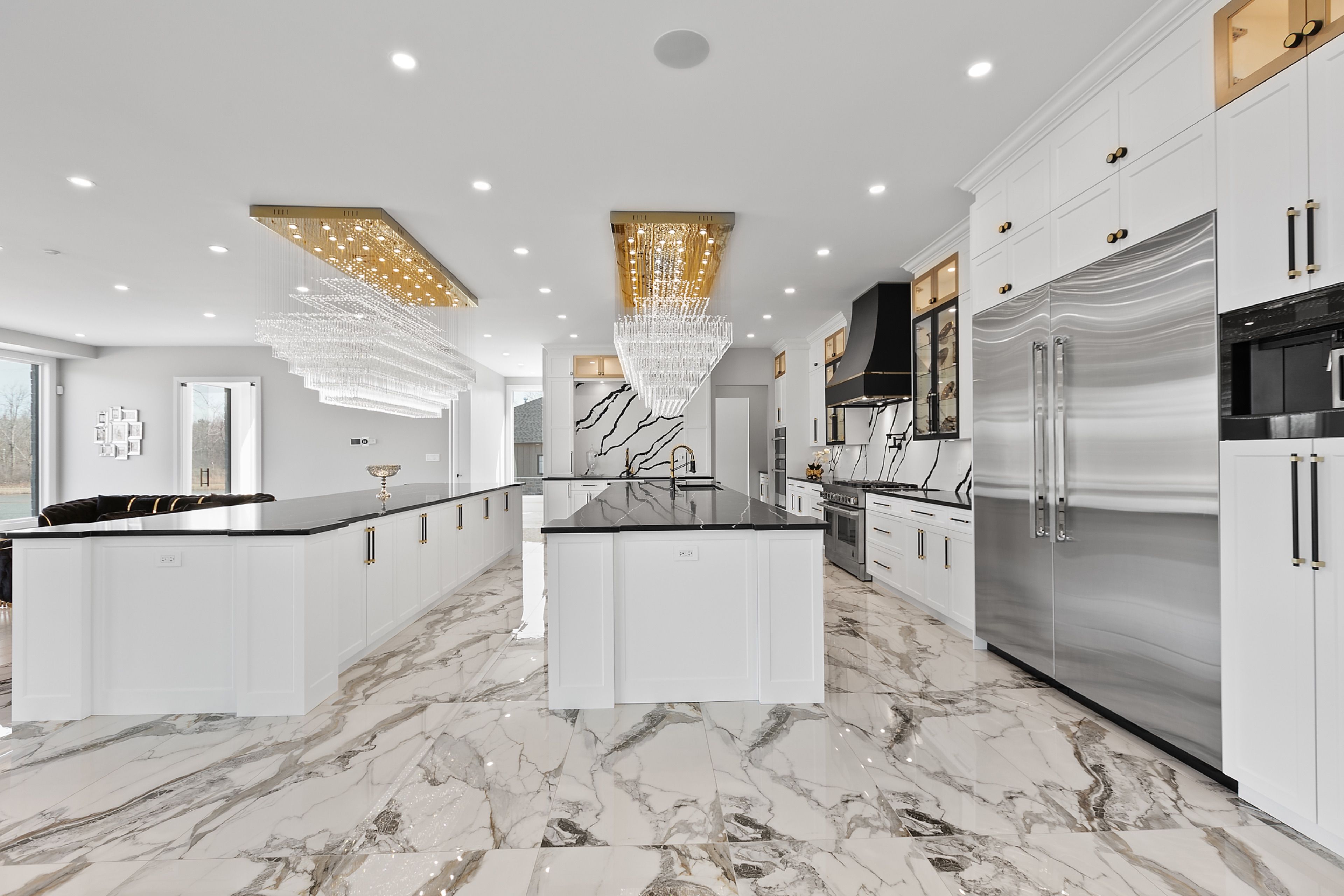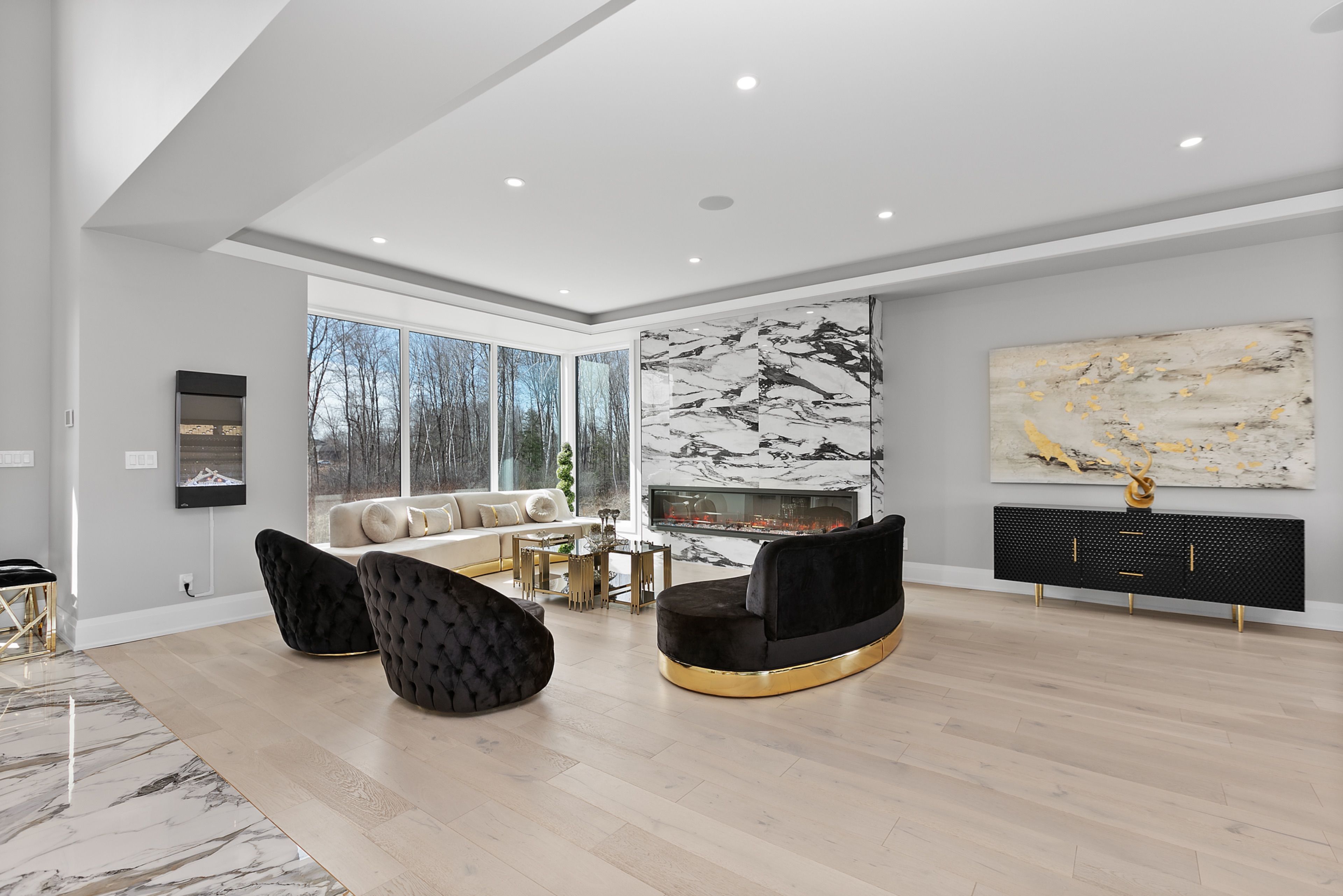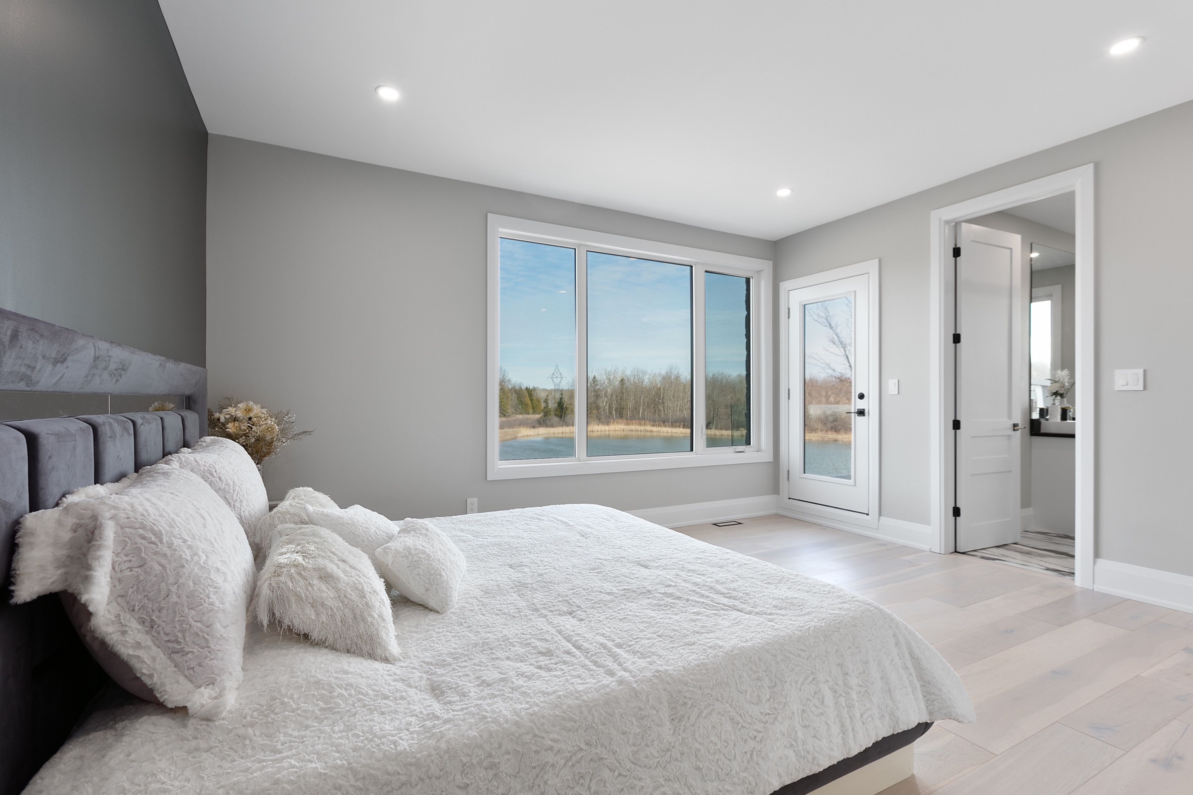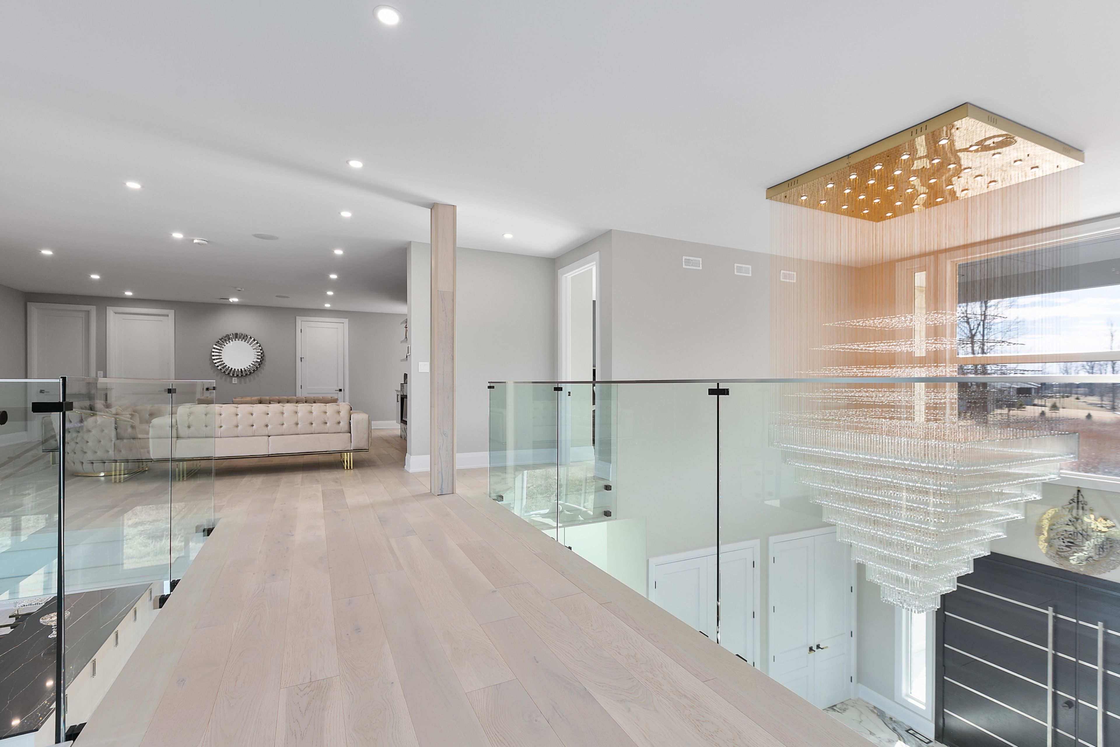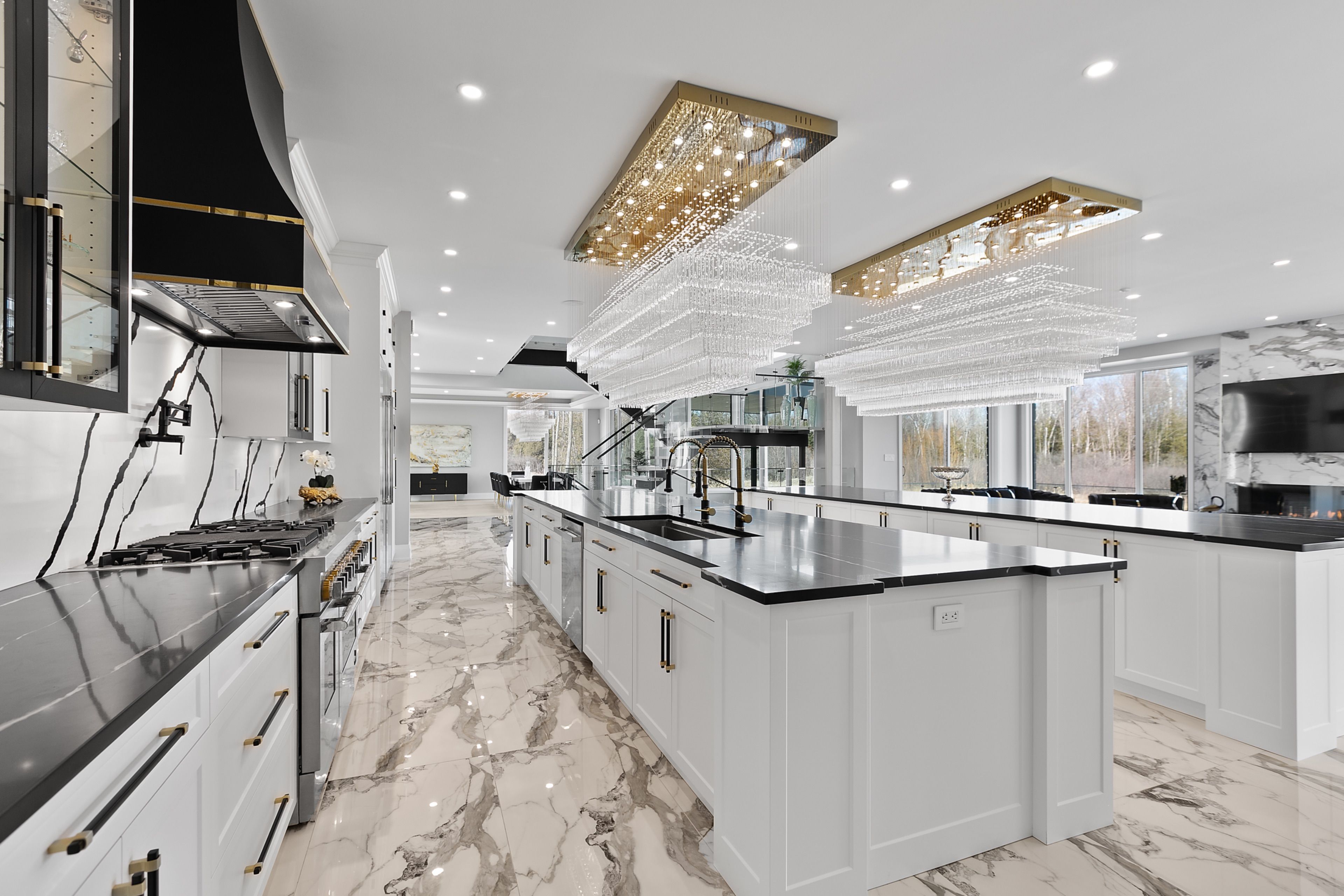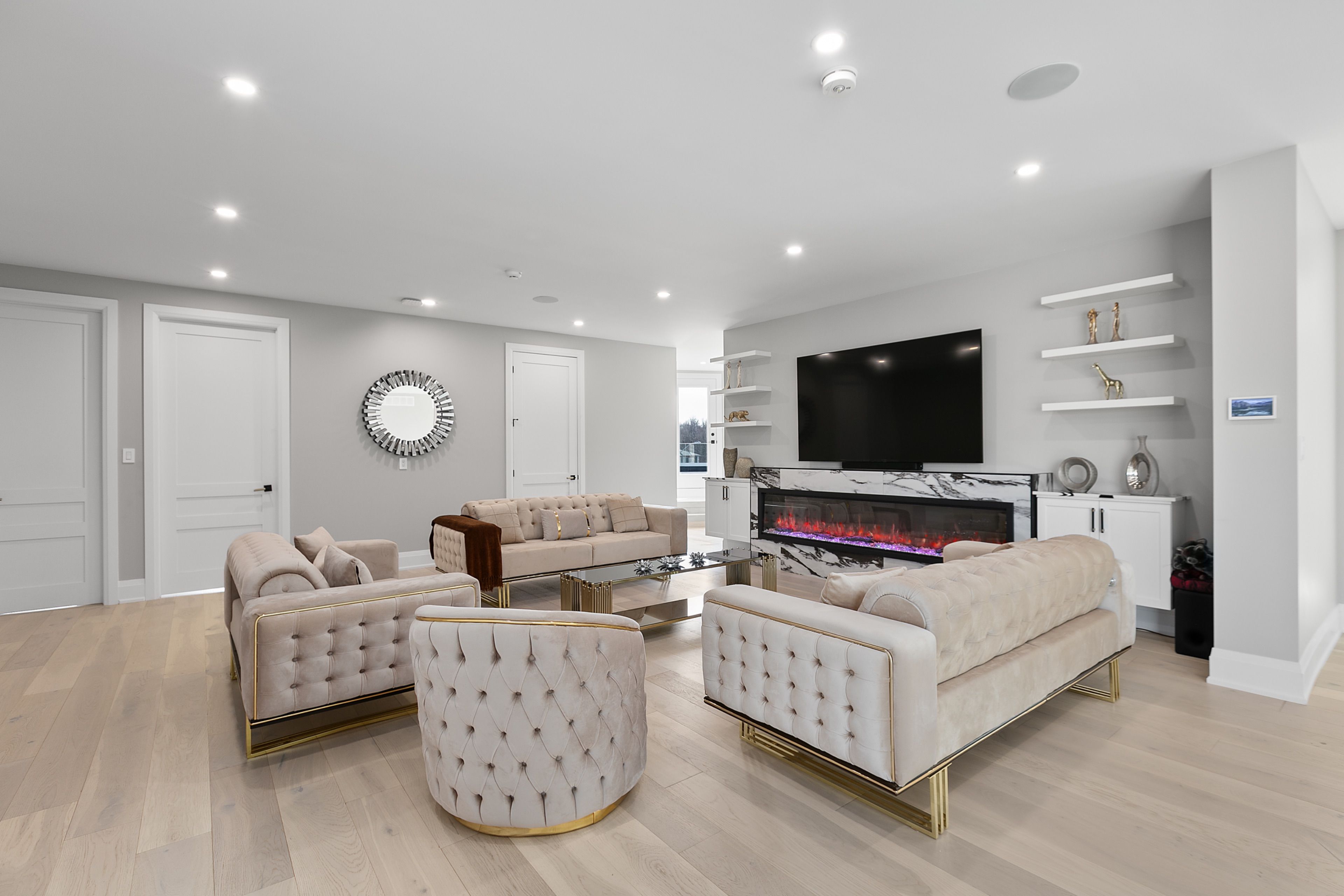 WATERFRONT LUXURY MASTER PIECE ON SUNSET LAKE! Situated on an extraordinary 38,947-square-foot lot with a private sandy beach, this 2023-built waterfront estate offers over 7,400 square feet of refined living space and breathtaking sunset views. Designed for both multi-generational living and grand entertaining, the home can be offered fully furnished at an additional cost, providing a seamless turnkey opportunity. A dramatic 19-foot foyer welcomes you into an elegant main level featuring 10-foot ceilings and an open-concept layout. The chef's kitchen is a true showpiece with two impressive 18-foot islands, premium Jenn-Air appliances, a 6-burner gas range, double ovens, a 36" fridge, separate 30" freezer, coffee bar, private butler's pantry, and walk-in pantry. The kitchen flows seamlessly into the lake-facing great room with fireplace and stunning water views. A ventilated sunroom and glass-enclosed study provide exceptional spaces for relaxation and working from home.The main floor also includes a laundry room, mudroom, full bath with pet wash, and access to a 5-car garage with 15-foot ceilings-ideal for car lifts.Upstairs, a spacious landing opens to a family room. The primary suite features a fireplace, private balcony, and spa-inspired ensuite with a soaking tub and dual sinks. Five additional bedrooms, three full baths, a second laundry room, and an expansive terrace perfect for entertaining complete the level.Outdoor living is exceptional, with multiple balconies, a covered hot tub area with outdoor fireplace, and direct waterfront access from the private sandy beach. The semi-finished basement is pre-wired with plumbing rough-ins, offering endless potential for a gym, theatre, or custom retreat. A rare opportunity to own a true lakeside masterpiece combining luxury, scale, and spectacular natural beauty for creating family memories.