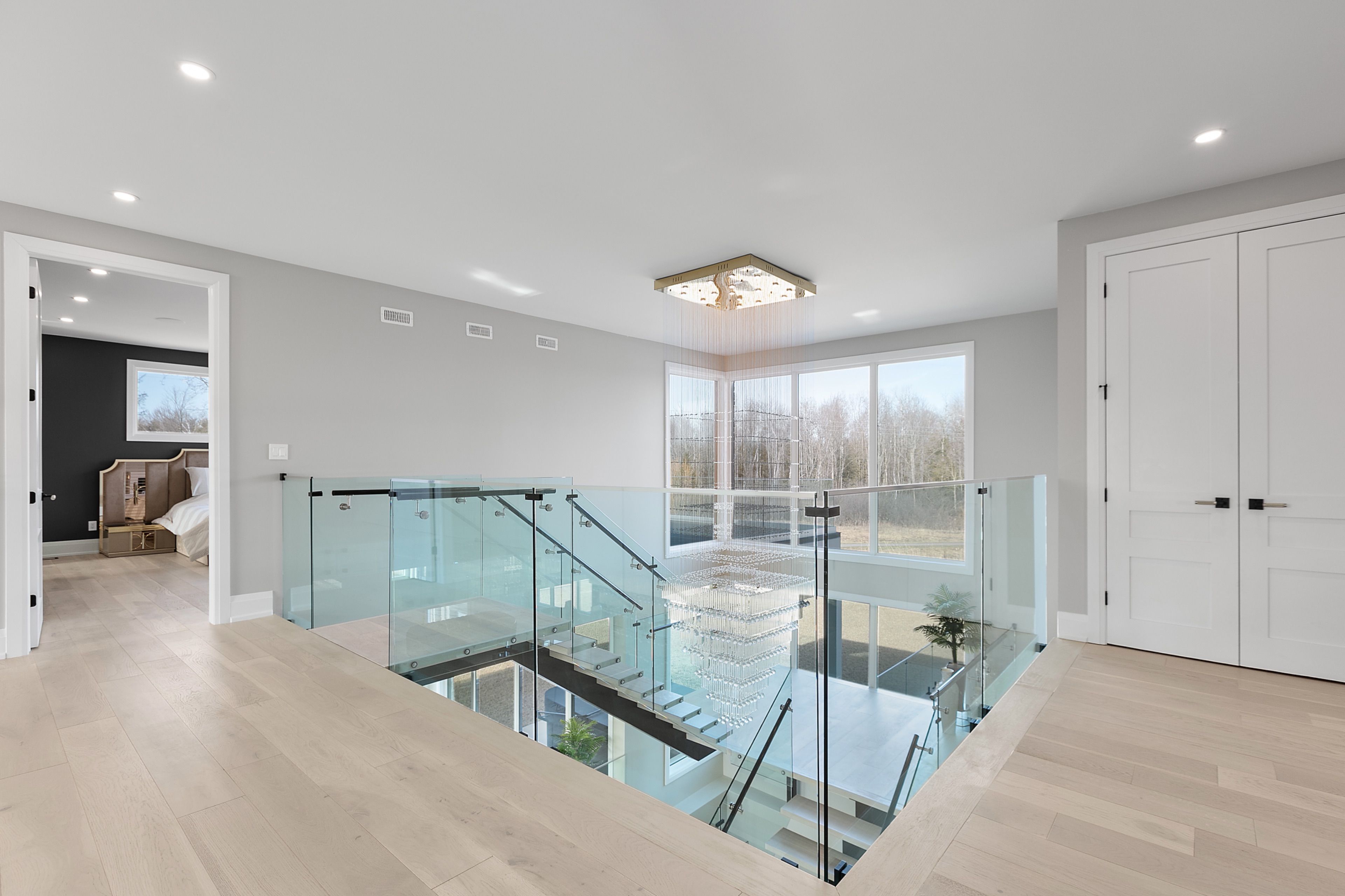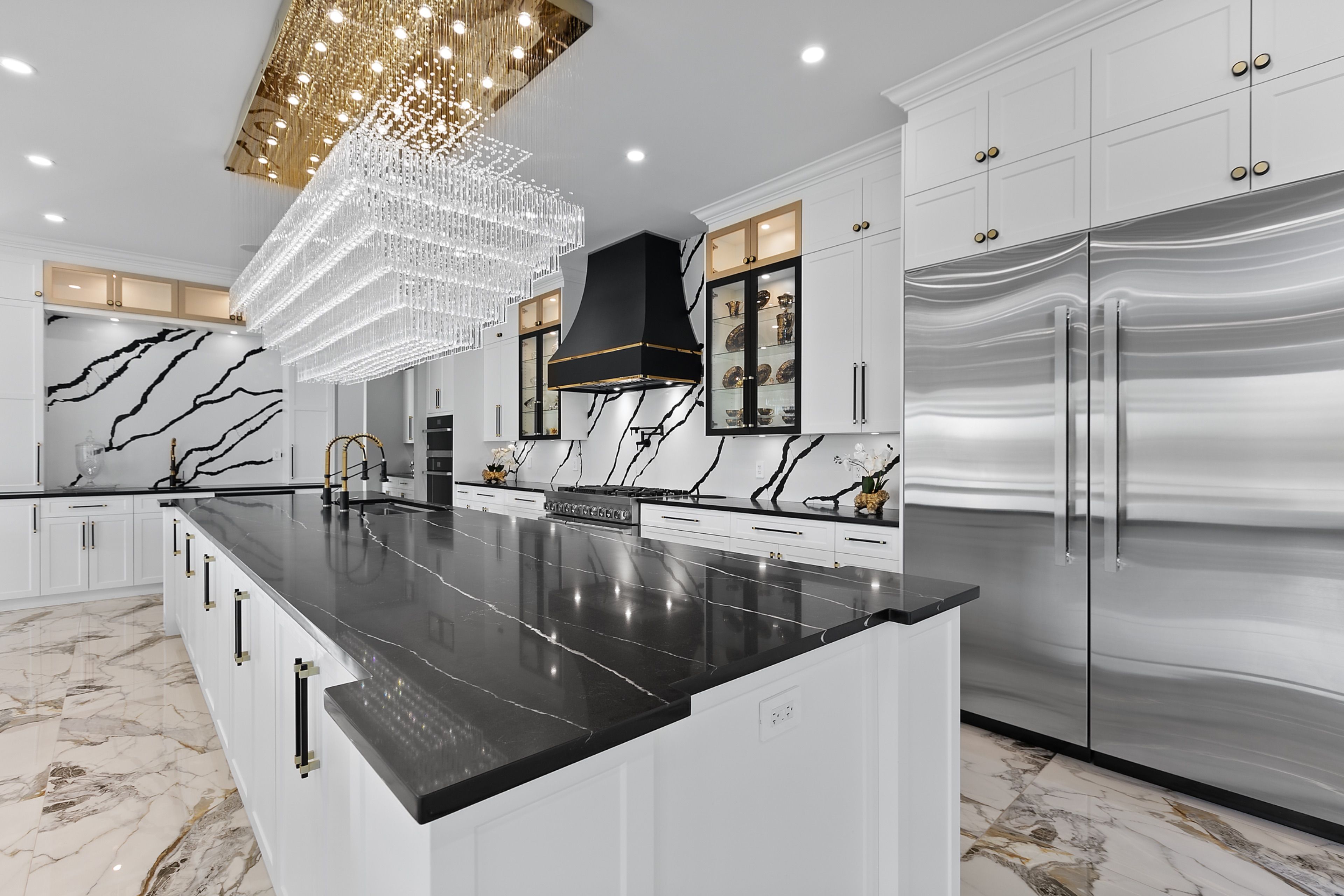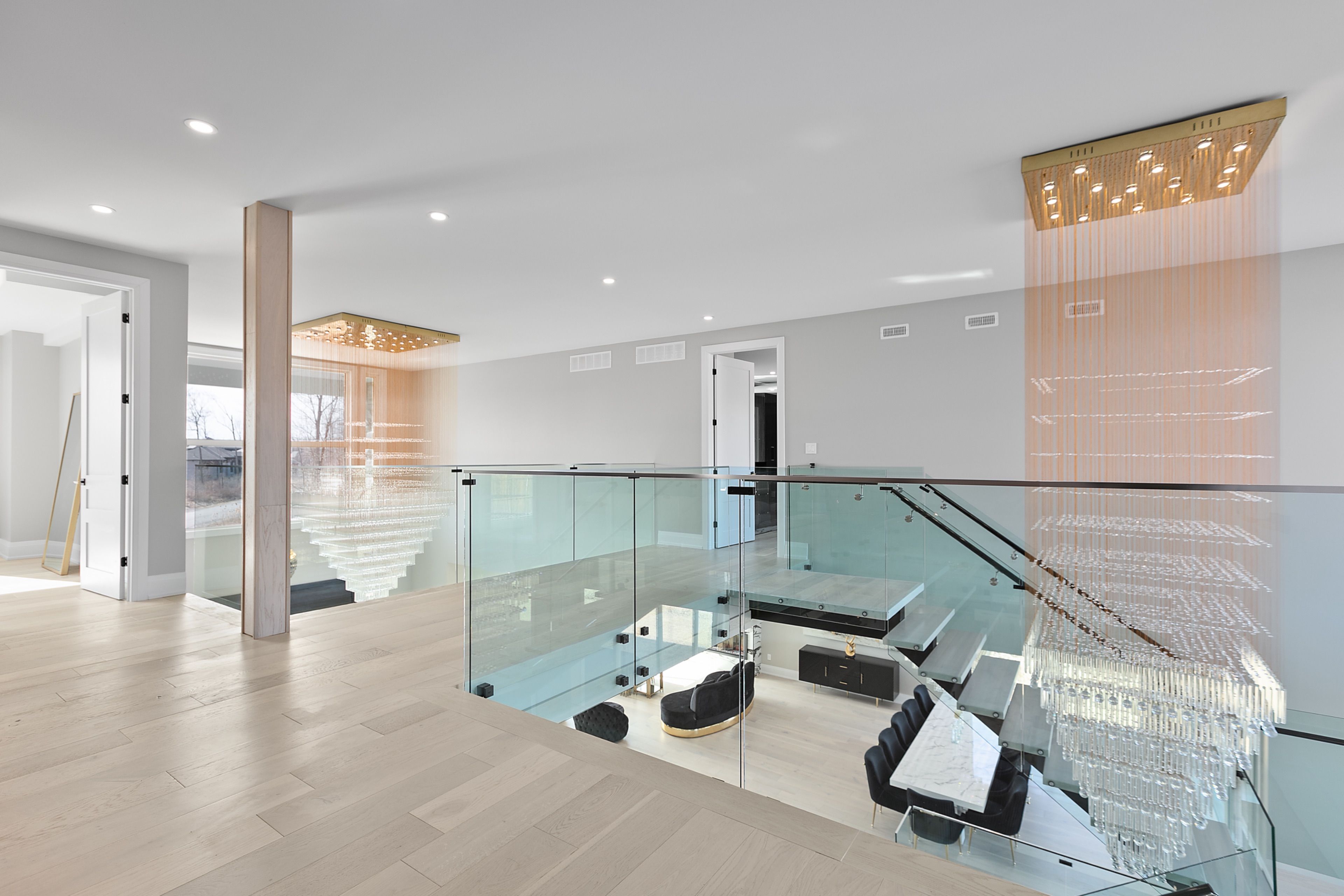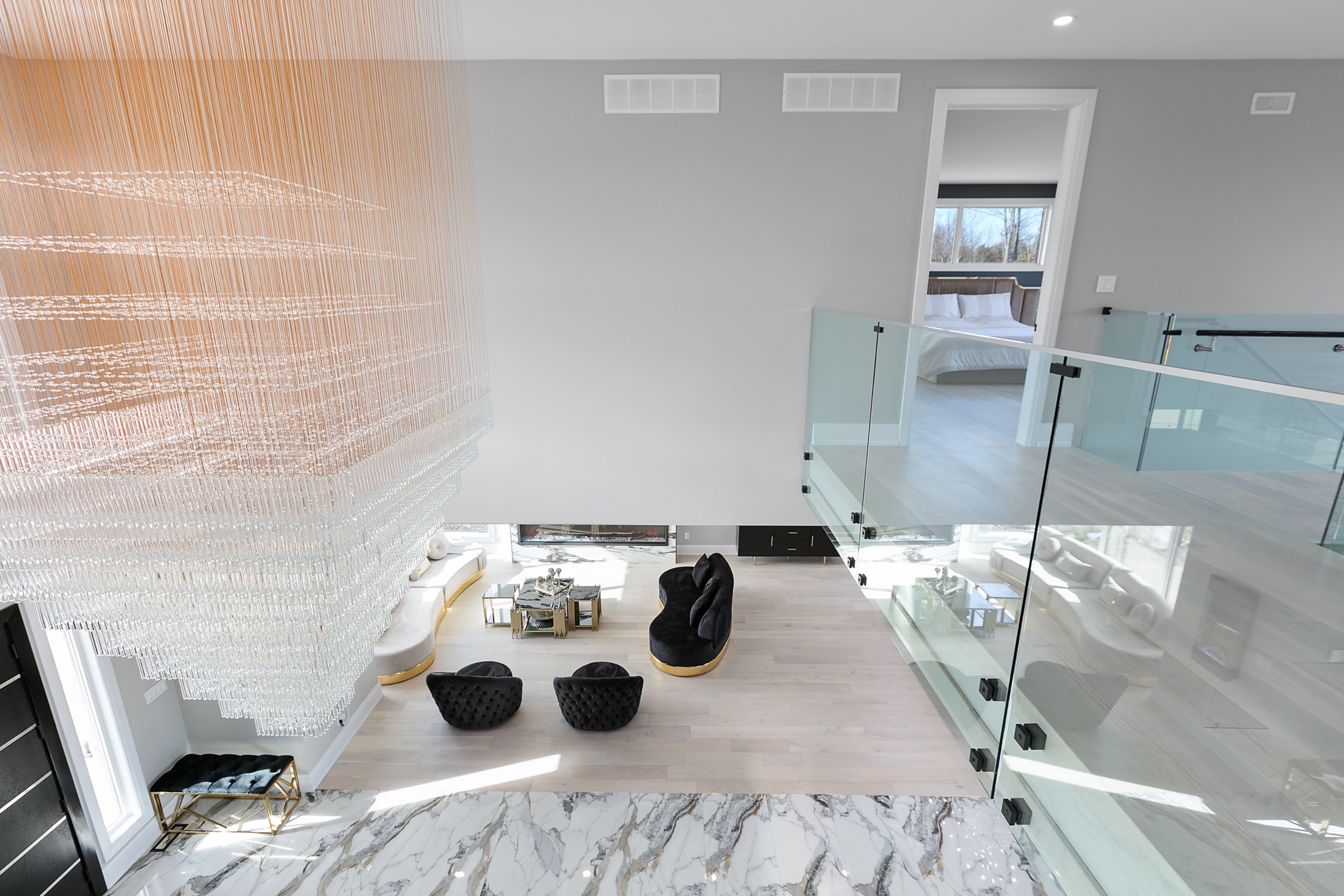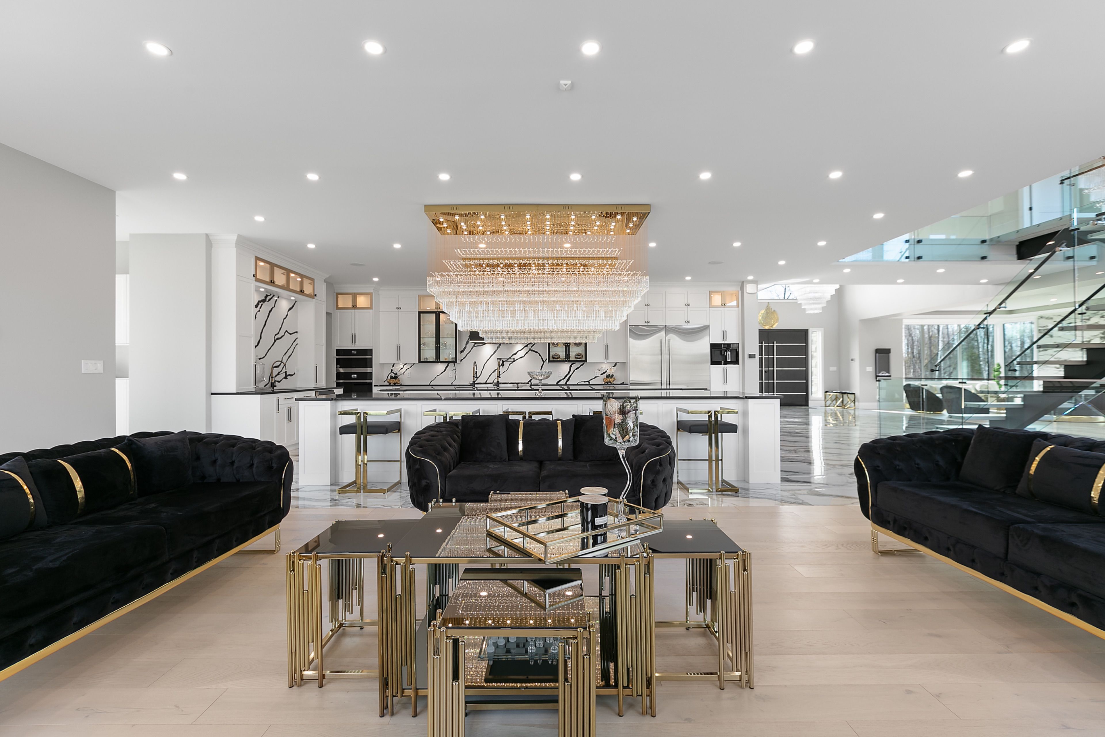 WATERFRONT LUXURY MASTER PIECE ON SUNSET LAKE! Situated on an extraordinary 38,947-square-foot lot with a private sandy beach, this 2023-built waterfront estate offers over 7,400 square feet of refined living space and breathtaking sunset views. Designed for both multi-generational living and grand entertaining, the home can be offered fully furnished at an additional cost, providing a seamless turnkey opportunity. A dramatic 19-foot foyer welcomes you into an elegant main level featuring 10-foot ceilings and an open-concept layout. The chef's kitchen is a true showpiece with two impressive 18-foot islands, premium Jenn-Air appliances, a 6-burner gas range, double ovens, a 36" fridge, separate 30" freezer, coffee bar, private butler's pantry, and walk-in pantry. The kitchen flows seamlessly into the lake-facing great room with fireplace and stunning water views. A ventilated sunroom and glass-enclosed study provide exceptional spaces for relaxation and working from home.The main floor also includes a laundry room, mudroom, full bath with pet wash, and access to a 5-car garage with 15-foot ceilings-ideal for car lifts.Upstairs, a spacious landing opens to a family room. The primary suite features a fireplace, private balcony, and spa-inspired ensuite with a soaking tub and dual sinks. Five additional bedrooms, three full baths, a second laundry room, and an expansive terrace perfect for entertaining complete the level.Outdoor living is exceptional, with multiple balconies, a covered hot tub area with outdoor fireplace, and direct waterfront access from the private sandy beach. The semi-finished basement is pre-wired with plumbing rough-ins, offering endless potential for a gym, theatre, or custom retreat. A rare opportunity to own a true lakeside masterpiece combining luxury, scale, and spectacular natural beauty for creating family memories.