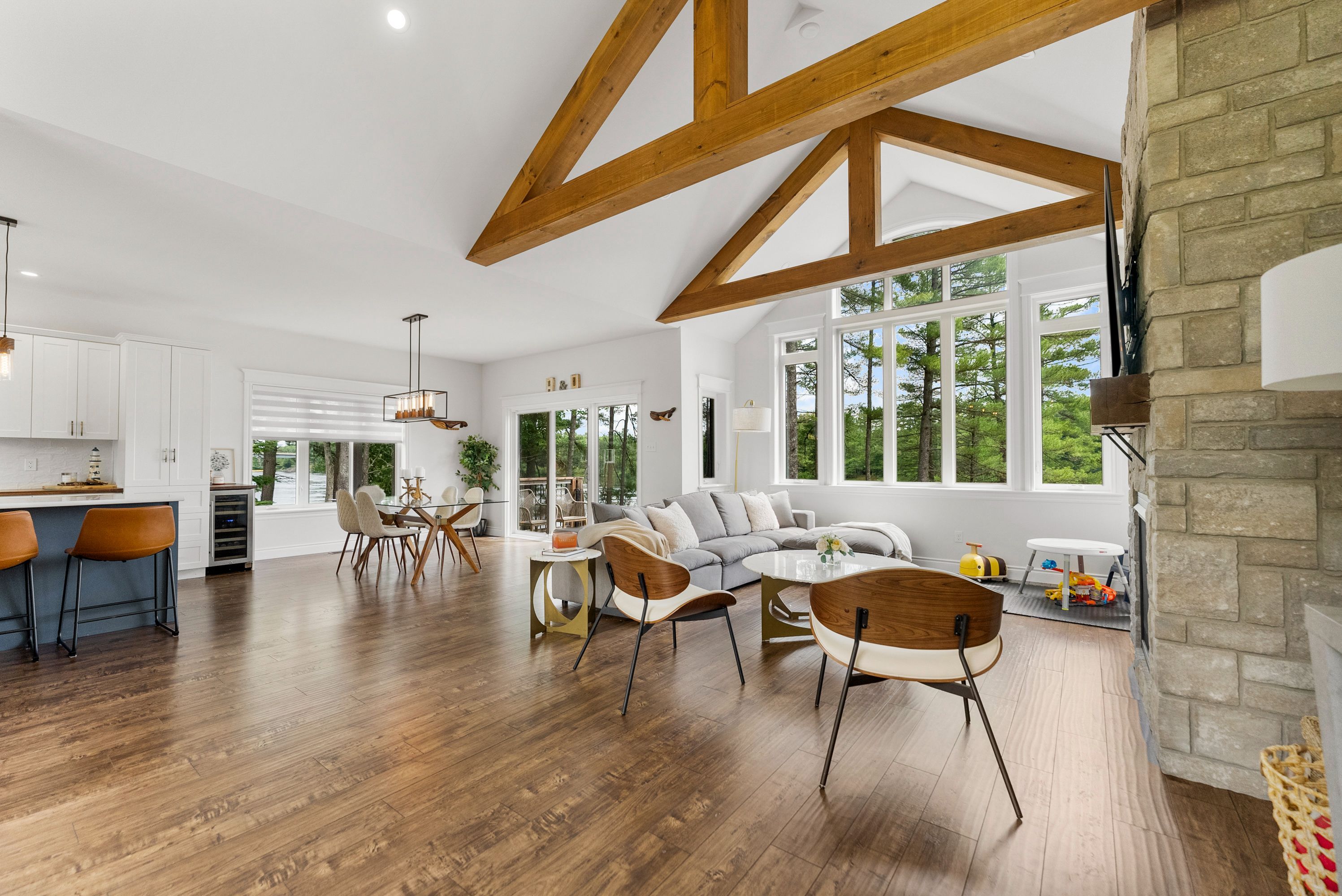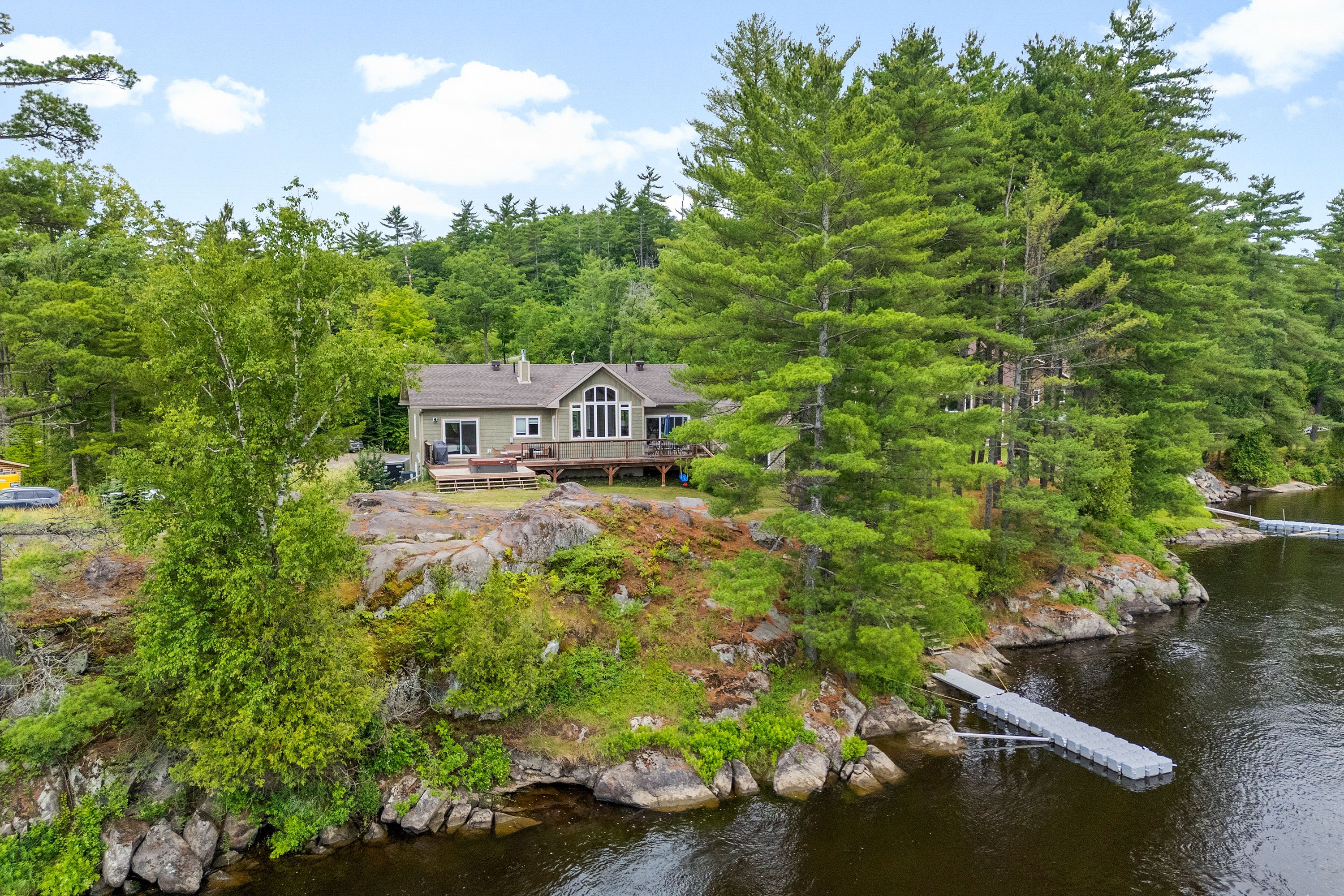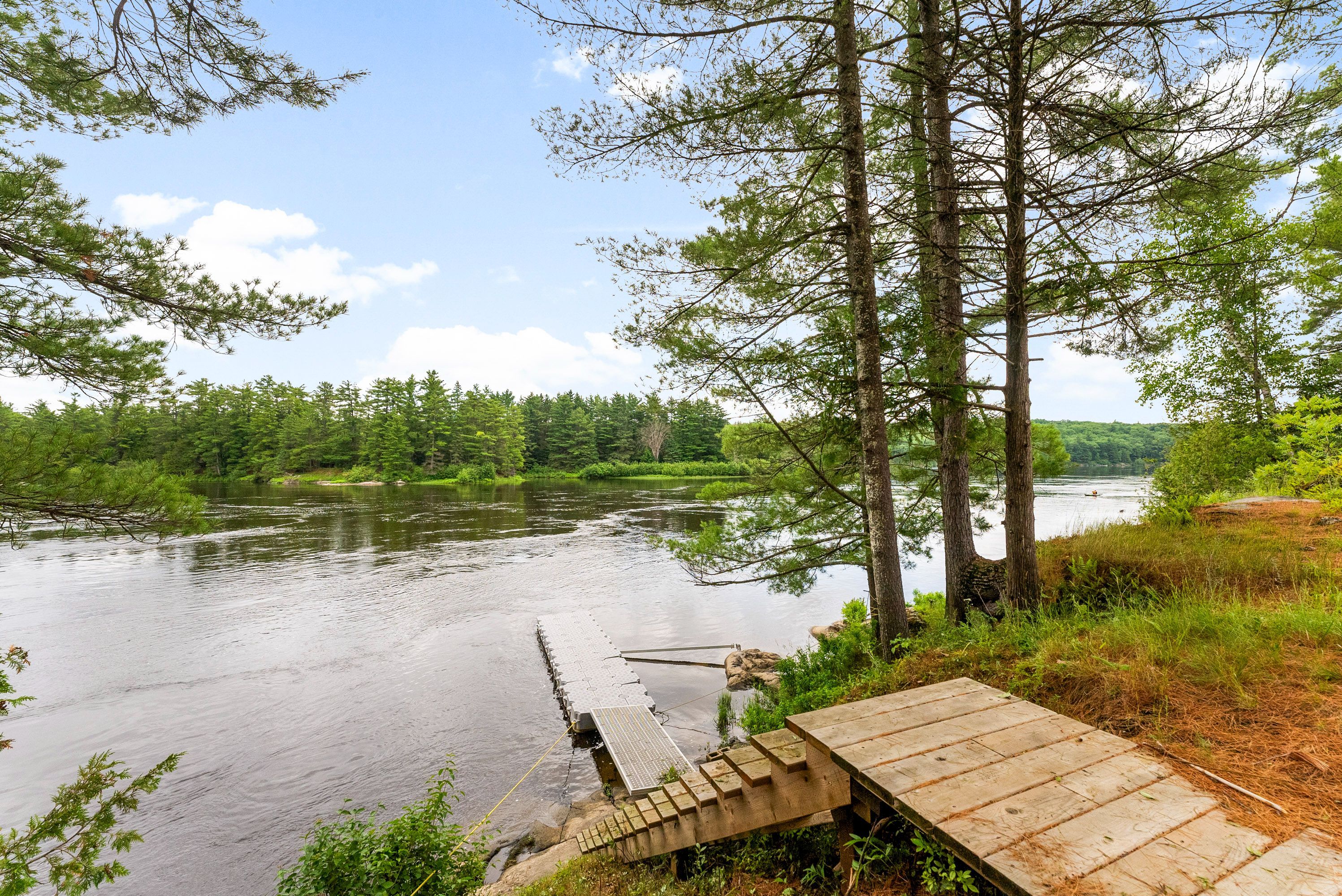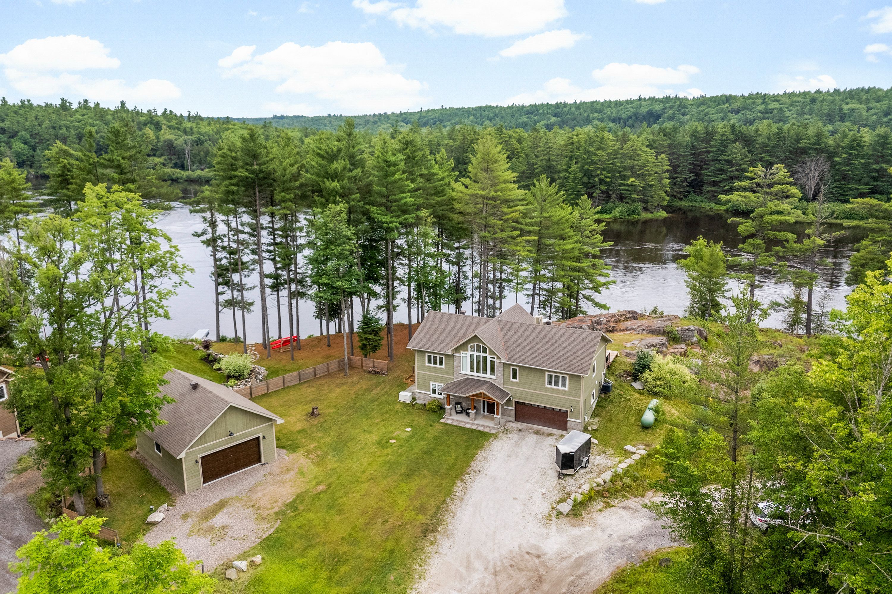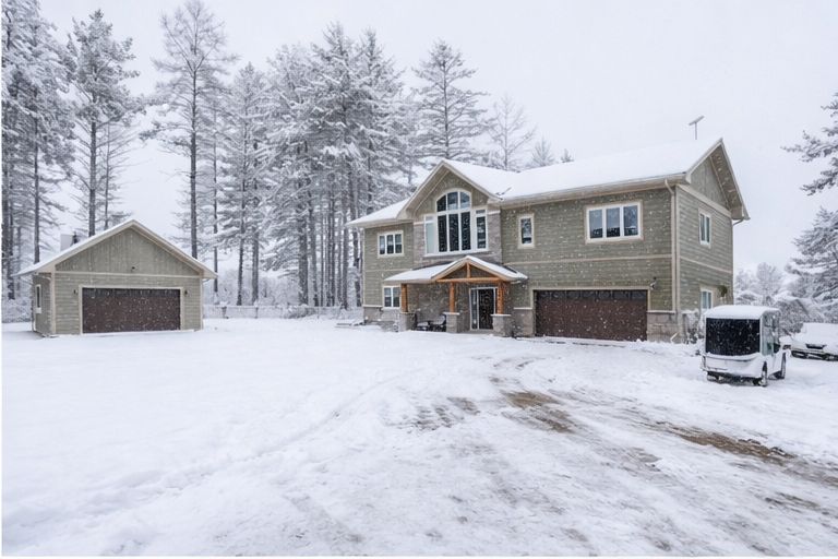 Waterfront living at its finest - welcome to 103 B Carriage Landing on the Ottawa River. Surrounded by mature trees and miles of navigable water to explore, this year-round retreat offers a peaceful, private setting with exceptional fishing, boating, and outdoor recreation right outside your door. Step inside to an impressive two-storey foyer with soaring 20' ceilings and an upper balcony overlooking the grand entrance. The main level features a bright, open-concept kitchen and living area highlighted by vaulted ceilings with exposed beams and expansive windows that fill the space with natural light and showcase the surrounding landscape. The primary suite offers patio doors leading directly to the deck and hot tub - your own private outdoor escape. A walkout basement at ground level enhances the seamless connection between indoor and outdoor living, while the main floor balcony provides the perfect vantage point to relax and take in the tranquil river views. Car enthusiasts and hobbyists will appreciate the attached double garage plus an additional detached double garage, offering exceptional storage and workspace flexibility. Ideally located just minutes from Renfrew and under an hour to Ottawa, this property delivers the perfect balance of waterfront serenity and everyday convenience. Whether you're seeking a weekend getaway or a full-time waterfront residence, this Ottawa River gem truly has it all.
